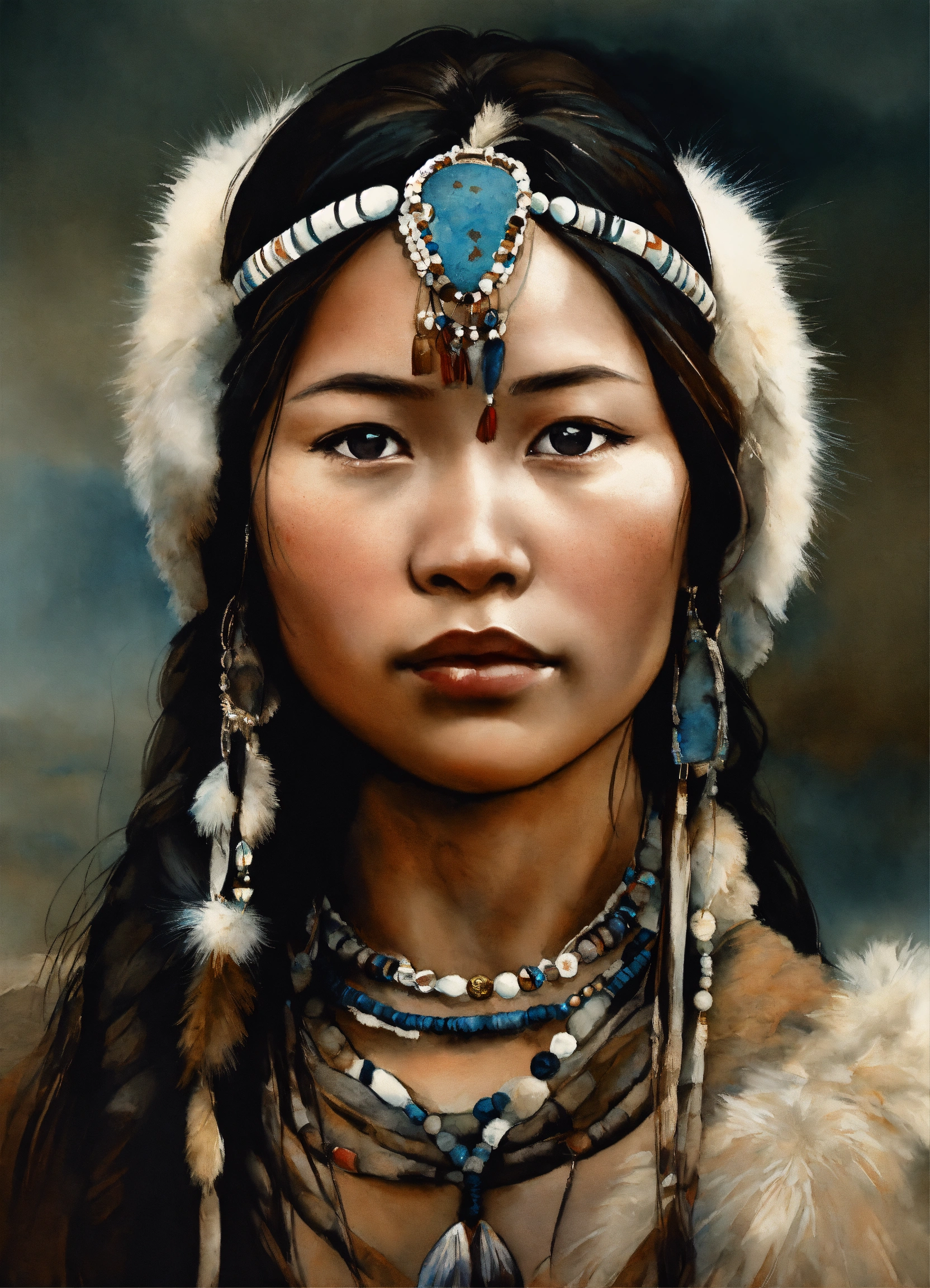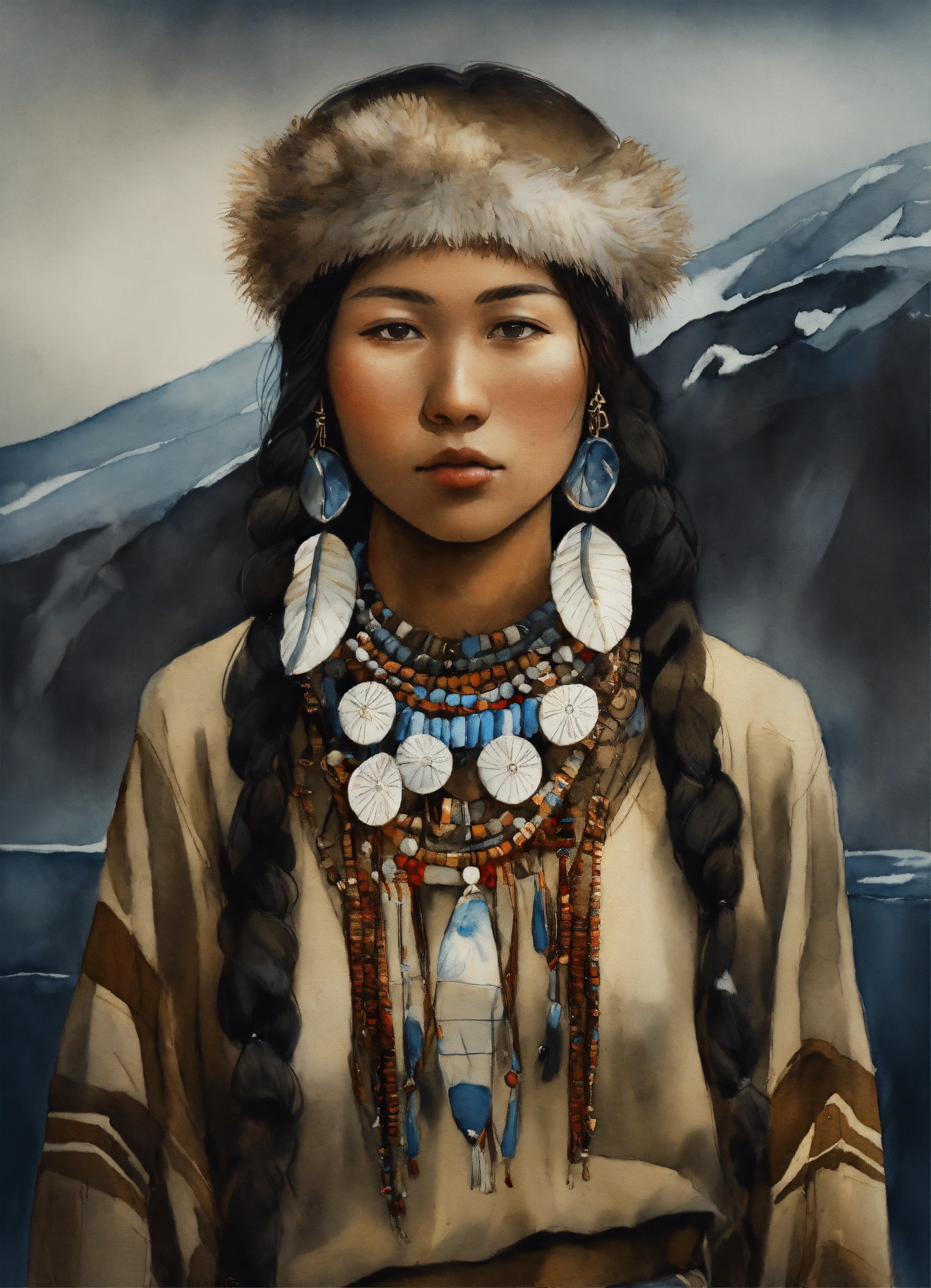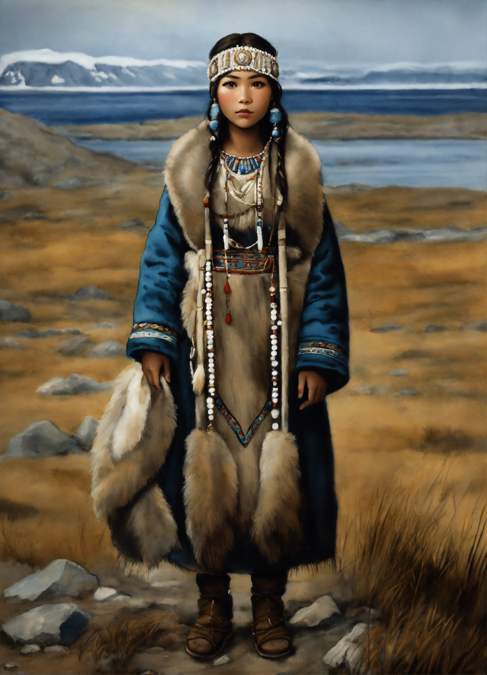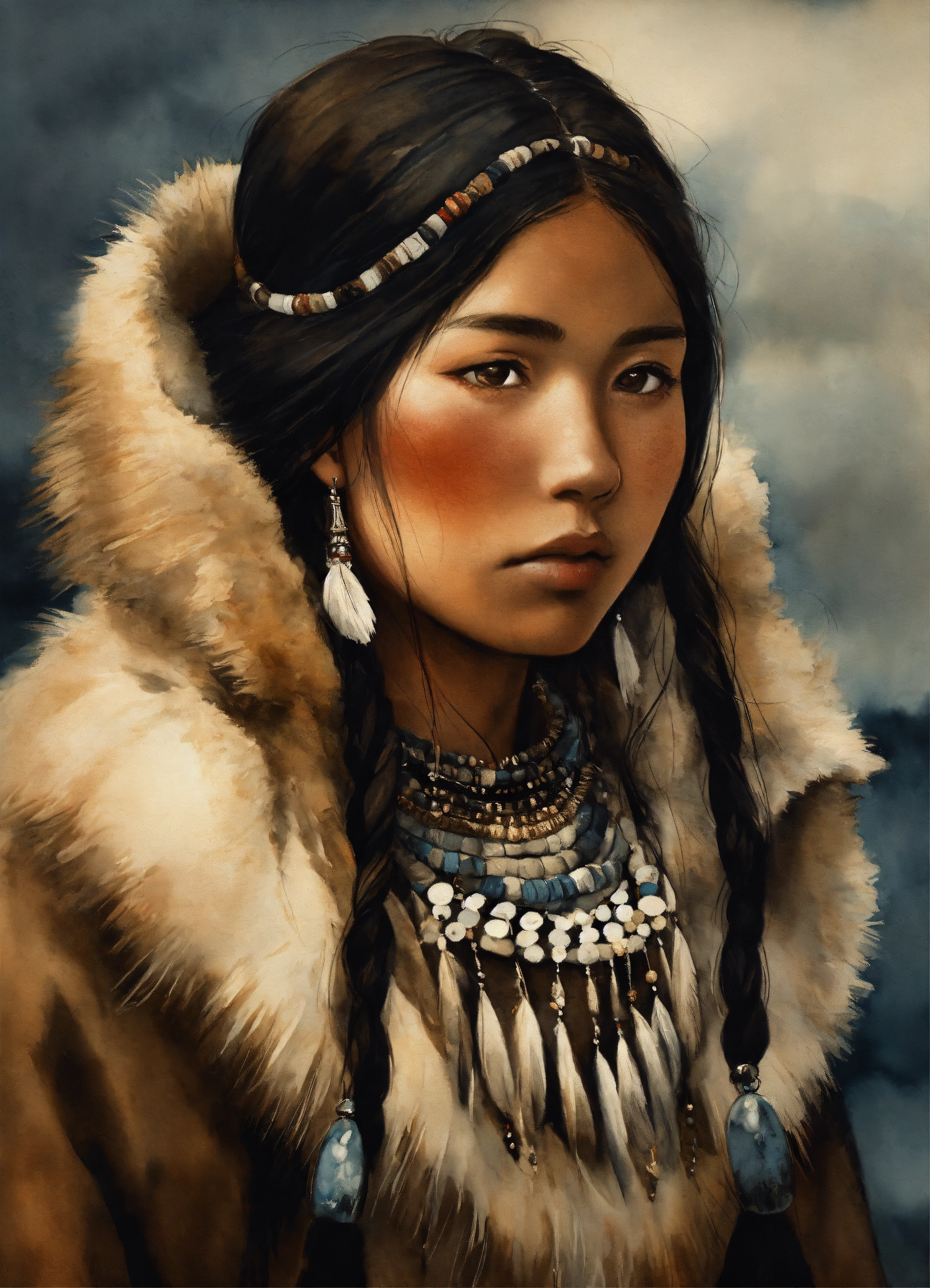 Chukchi woman, young, 18 years old, beautiful, wearing arctic paleolithic customes, adorned with beads and shells. full body illustration by tom björklund, watercolors, dark hues, gloomy and depressing.