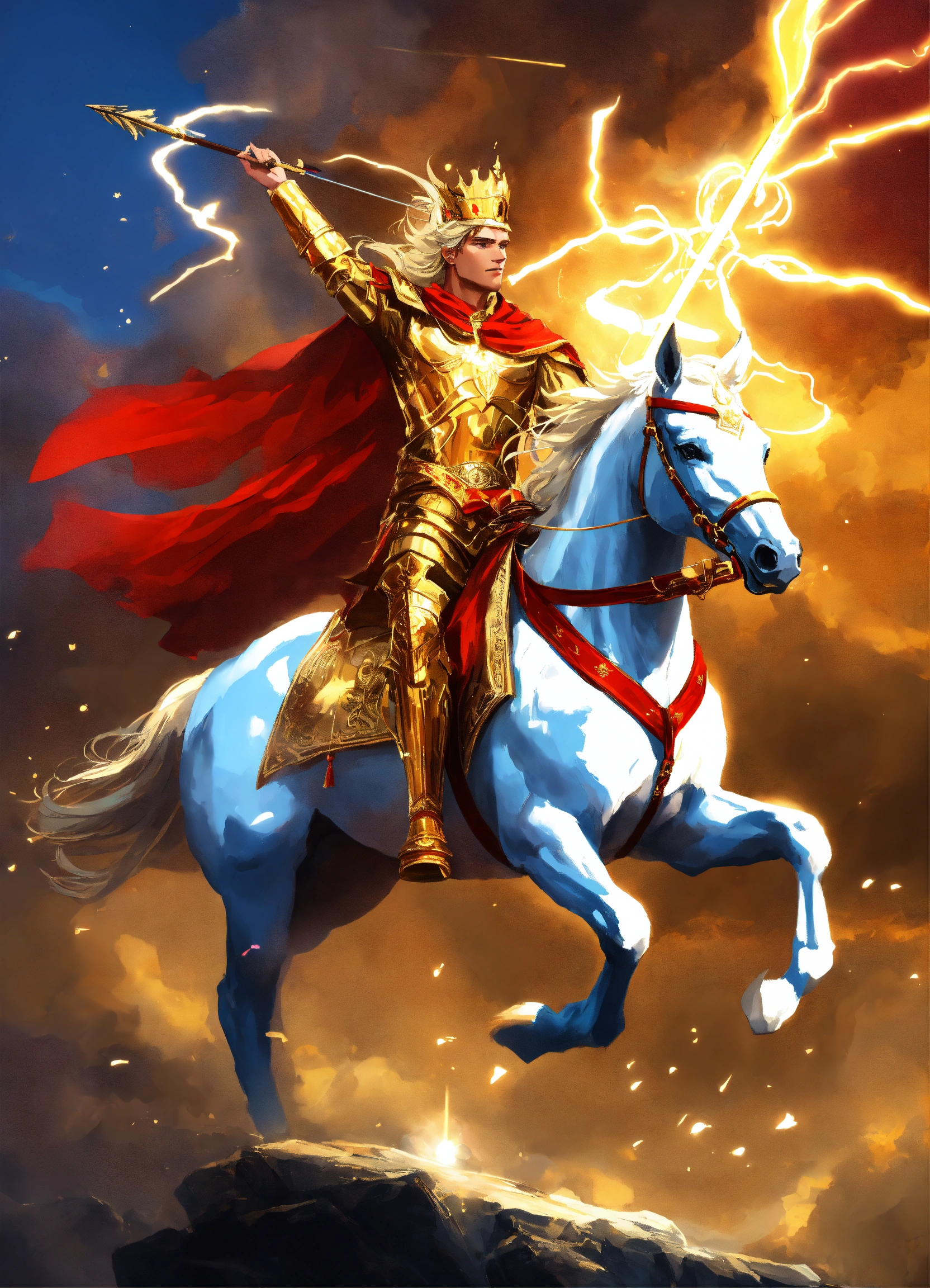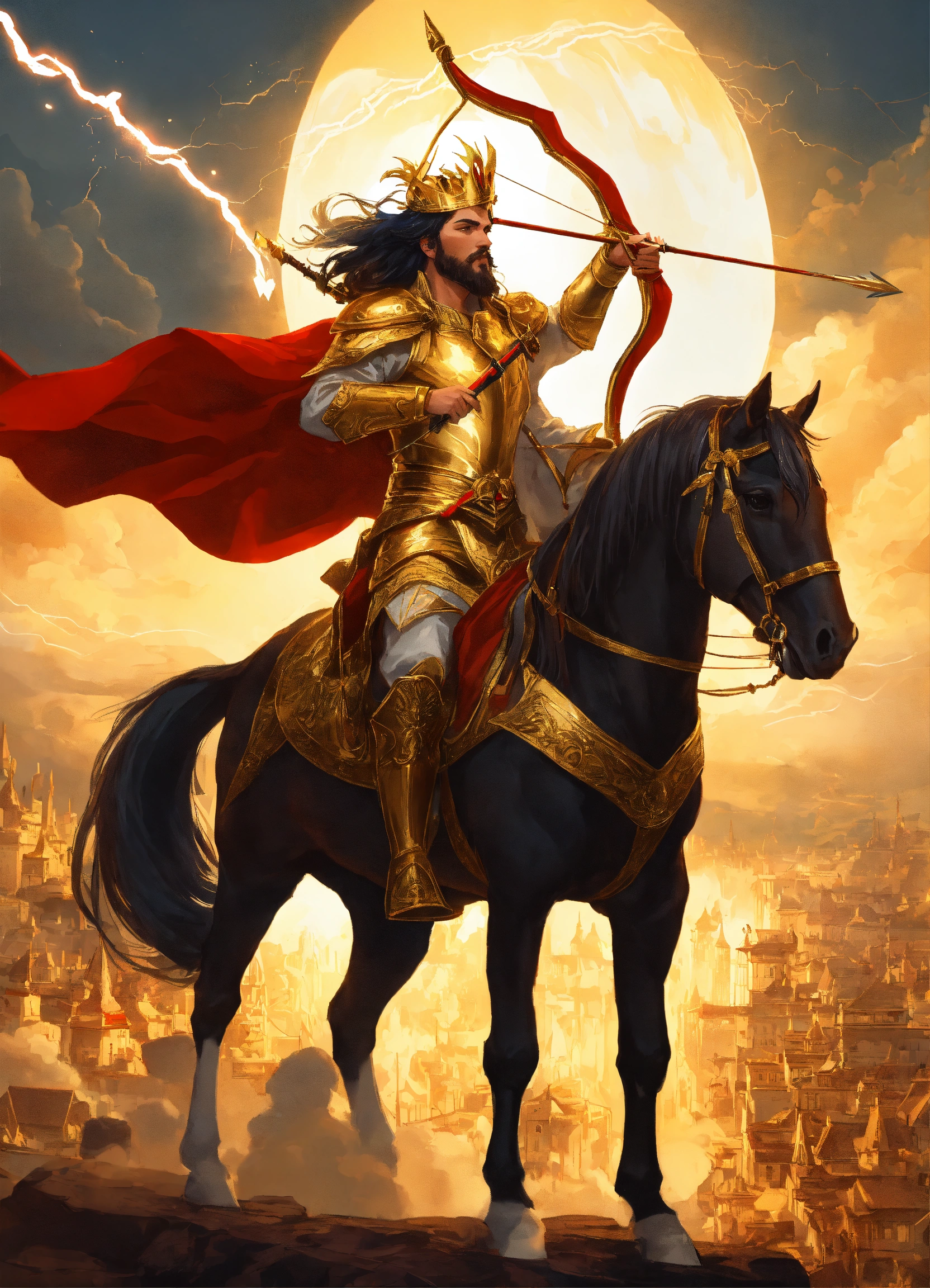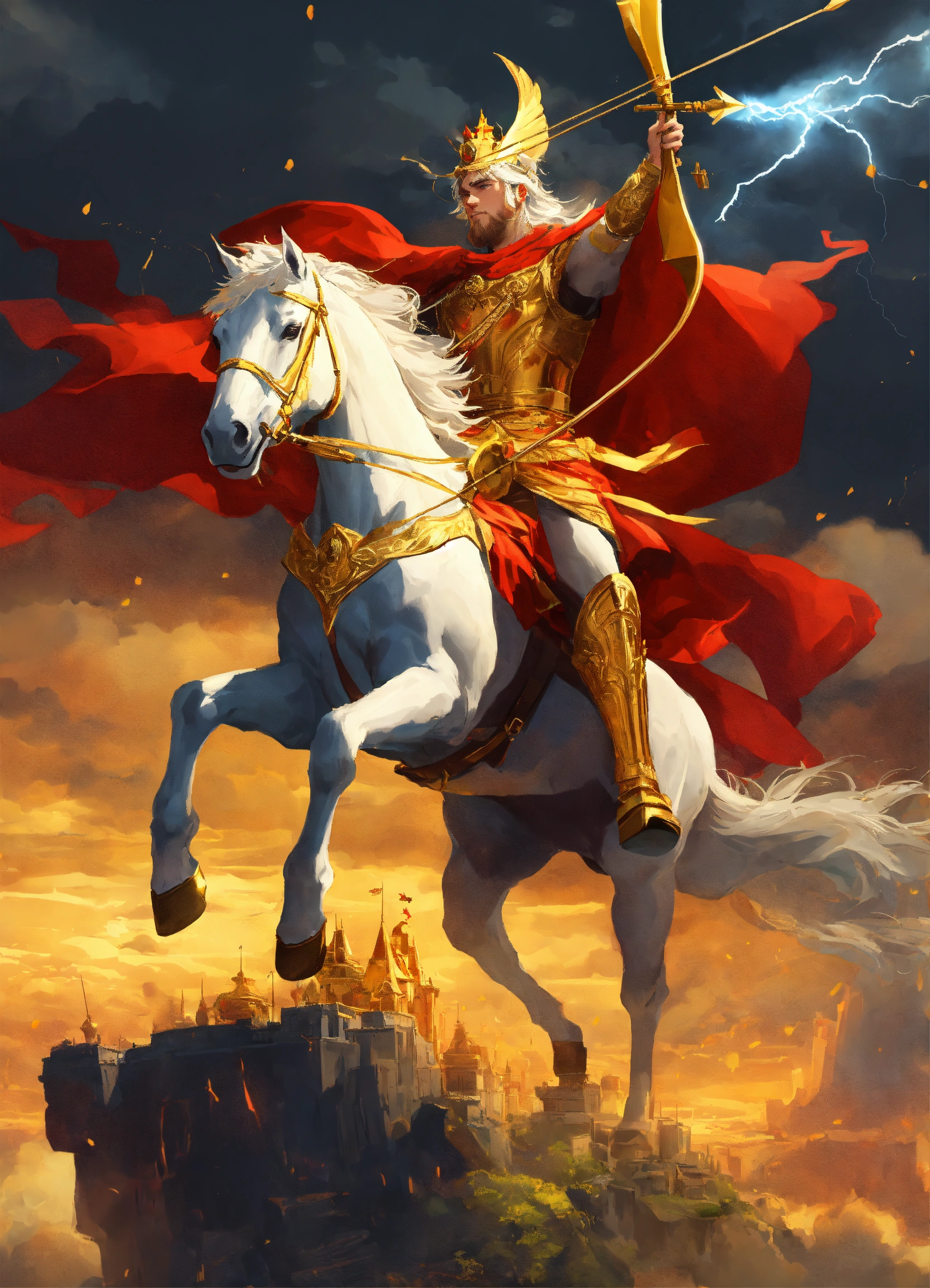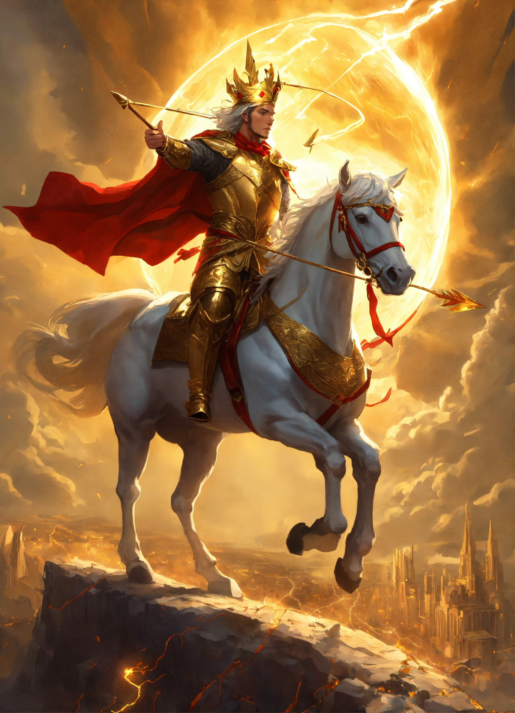 Gold bow with lightning shooting down from the floating city in the sky. and mighty man on a white horse holding a bow and arrow. and a gold crown on his head, and showing authority. with red face looking deceptive