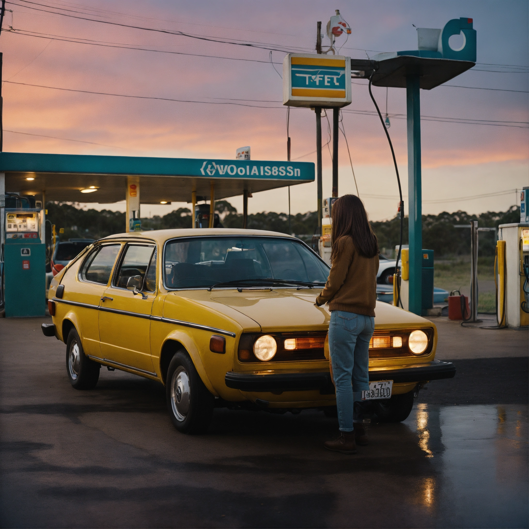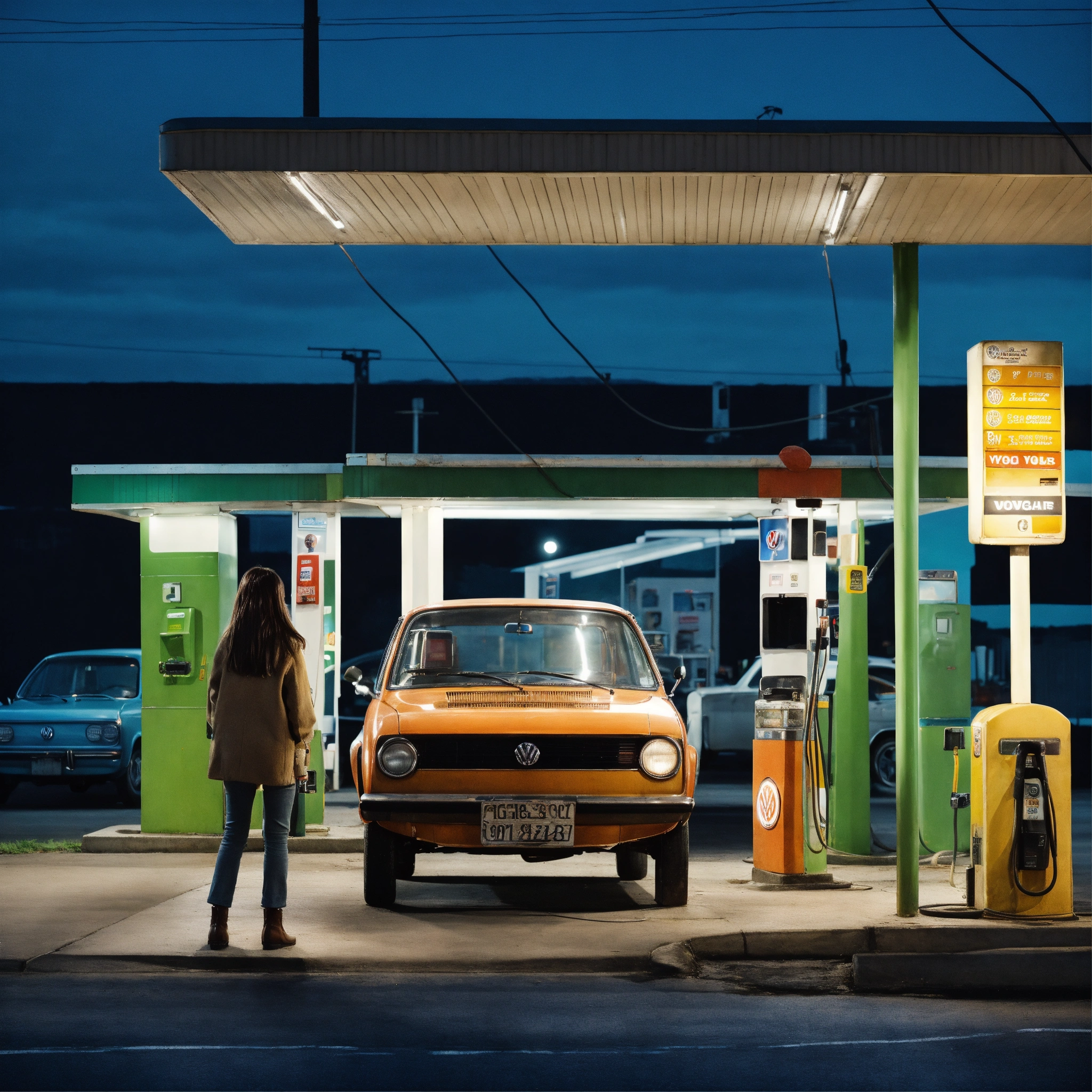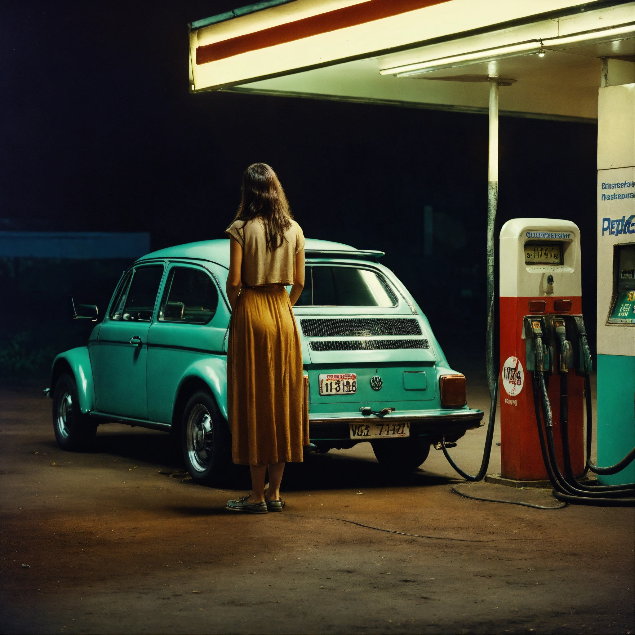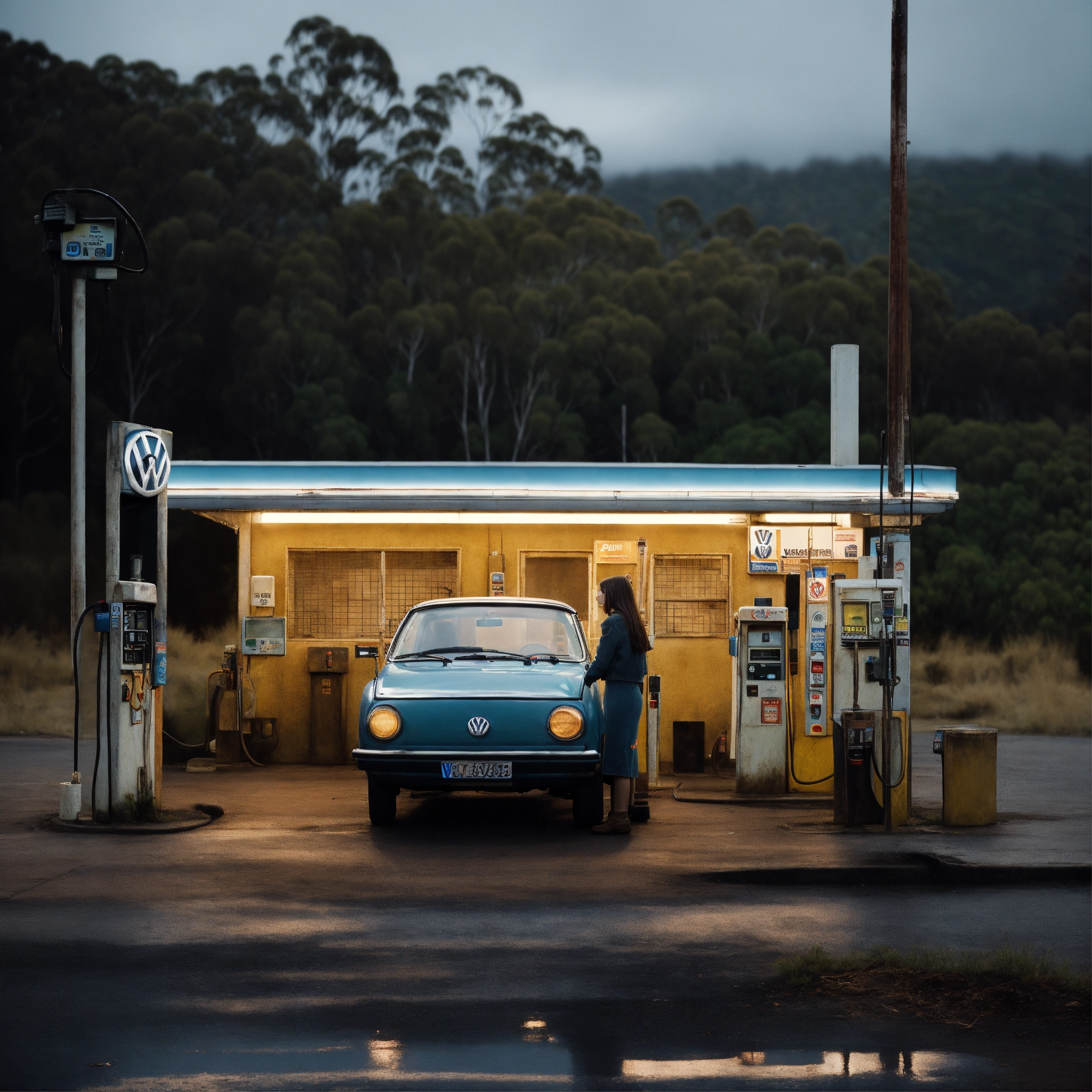 A photograph of a woman with long brown hair standing at a dystopian australian petrol station filling up her 1973 volkswagen, gregory crewdson cinematic stylerear view