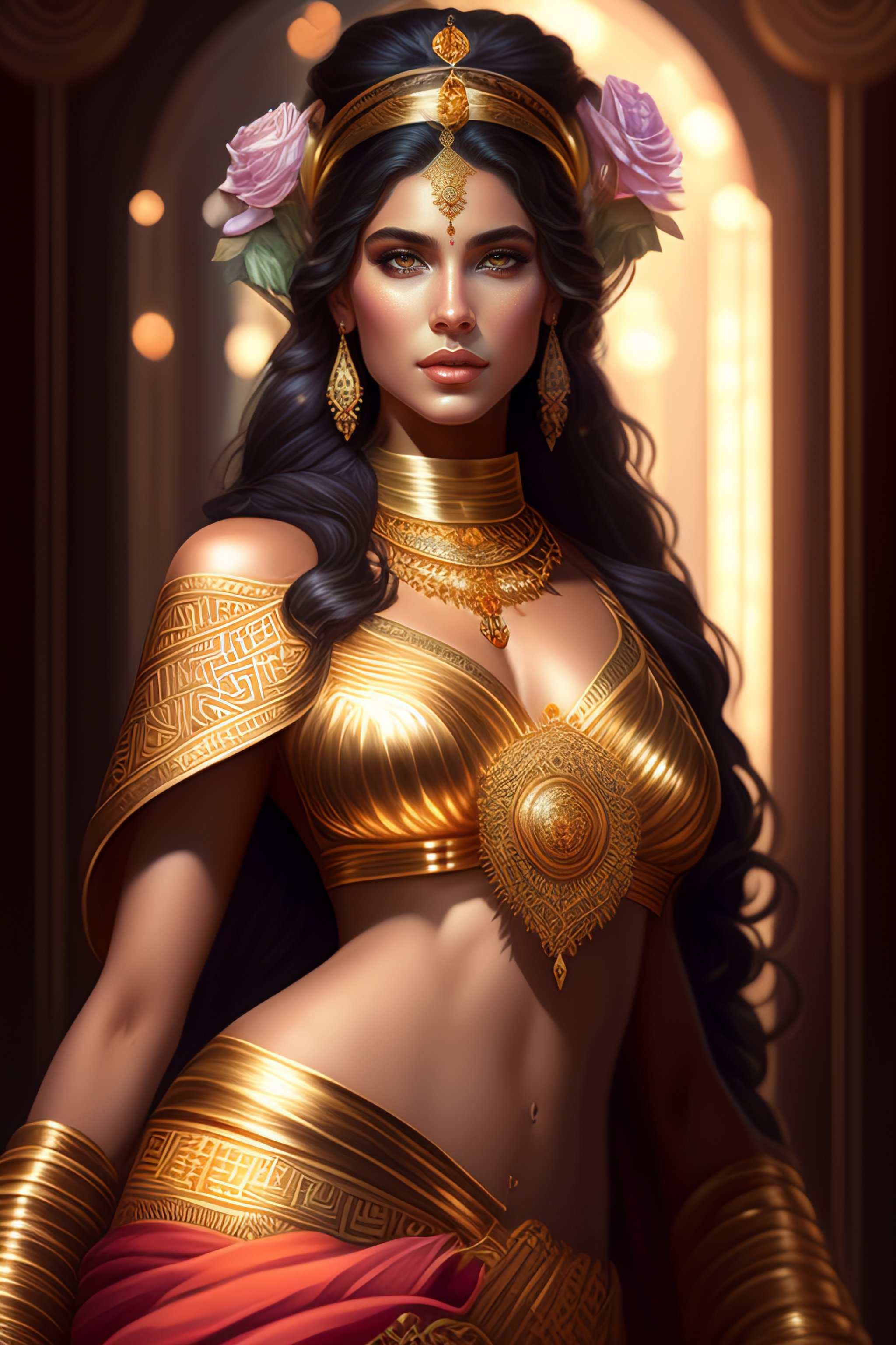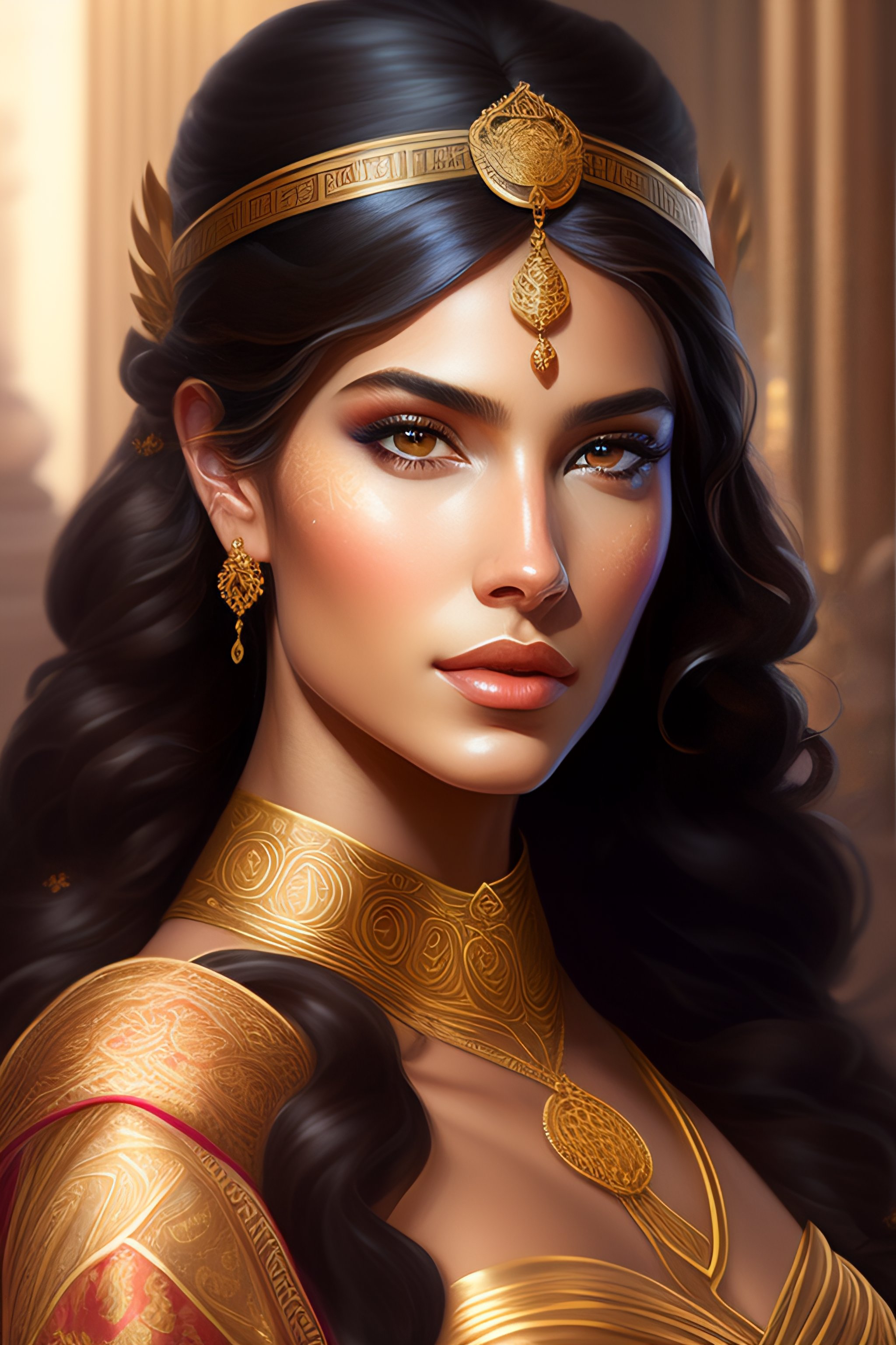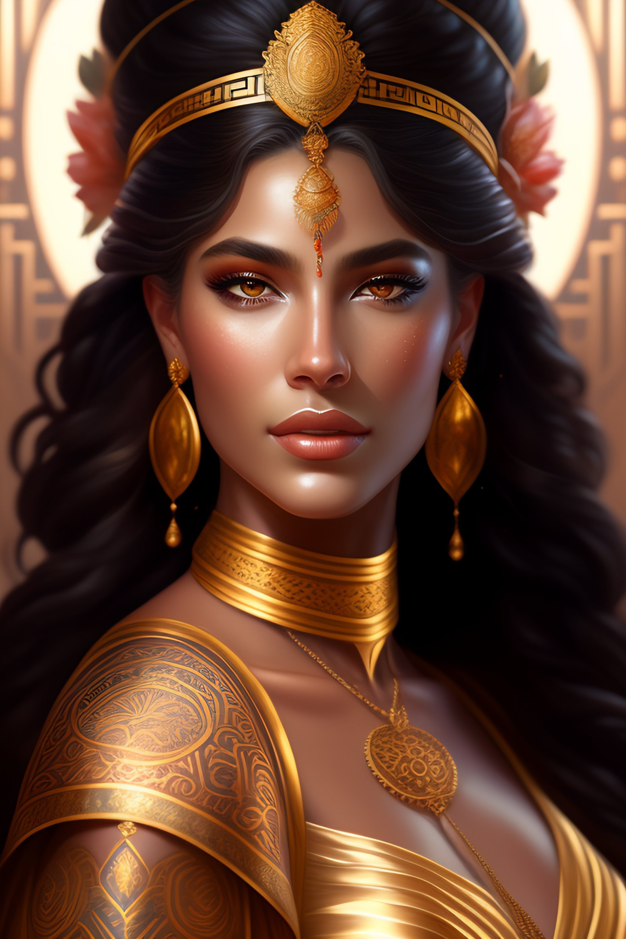 Portrait of beautiful greek goddess, wearing an ornate toga with intricate floral patterns, intricate, elegant, highly detailed, digital painting, glistening skin, artstation, concept art, smooth, sharp focus, bold lighting, illustration, art by artgerm and greg rutkowski and alphonse mucha, 8 k