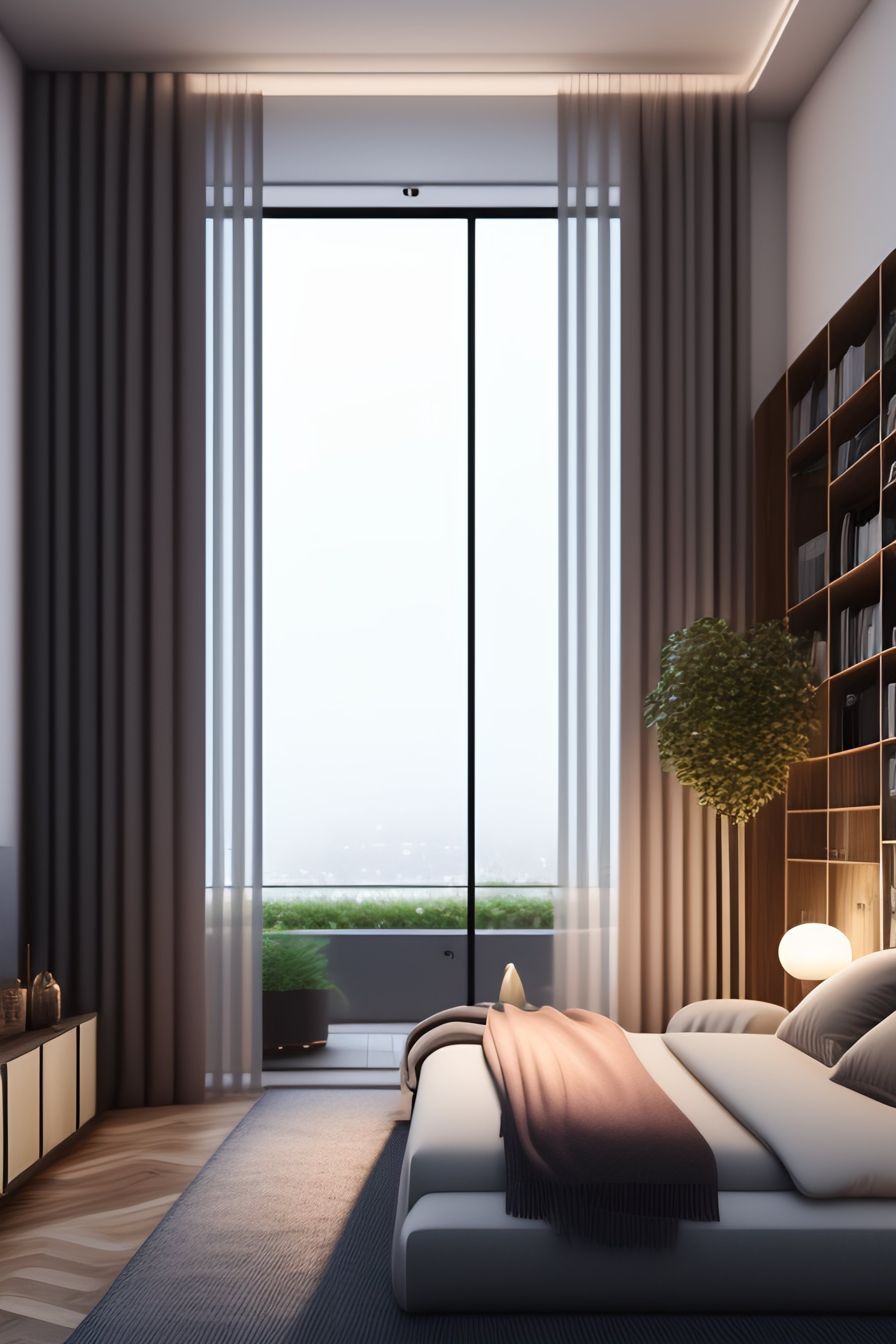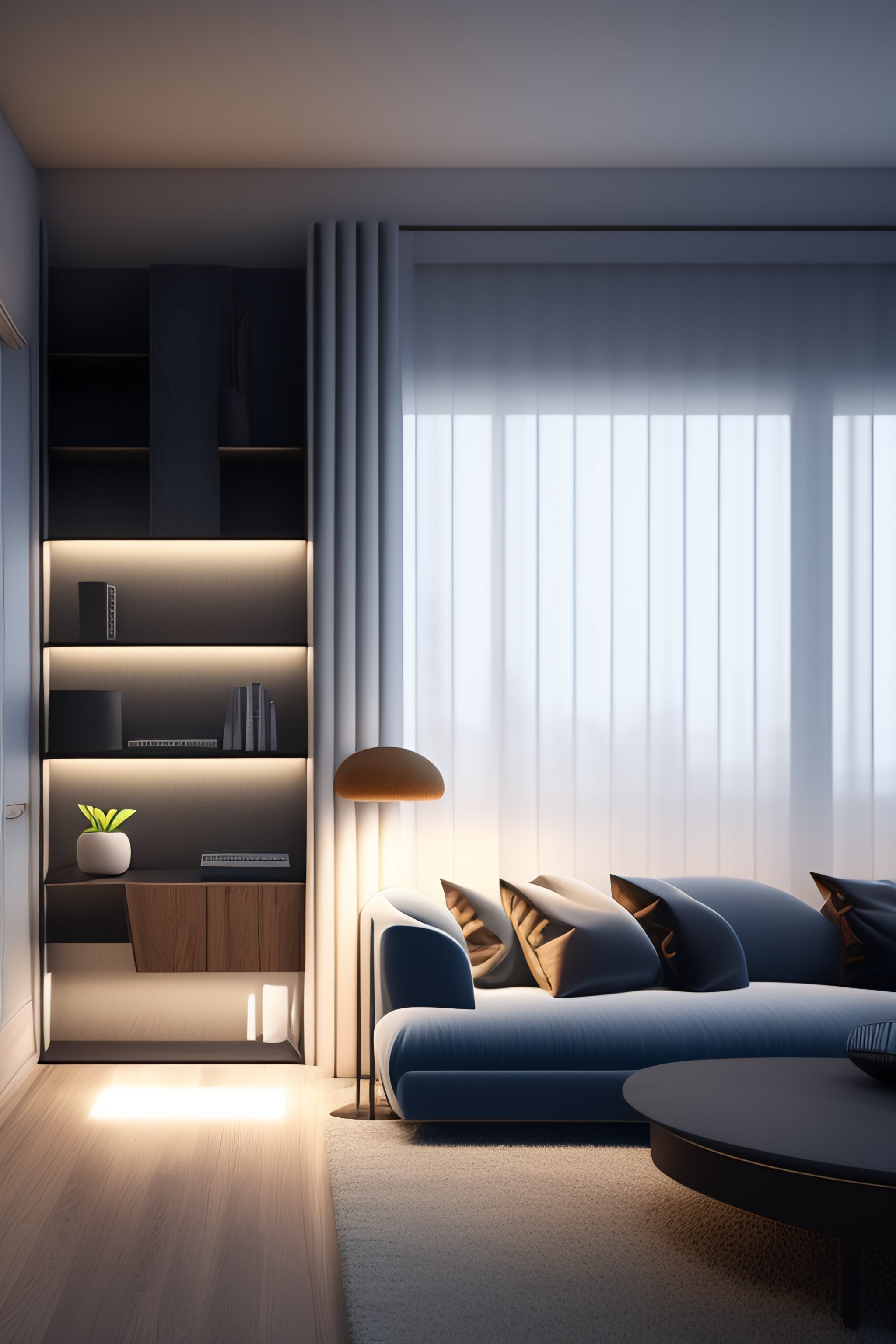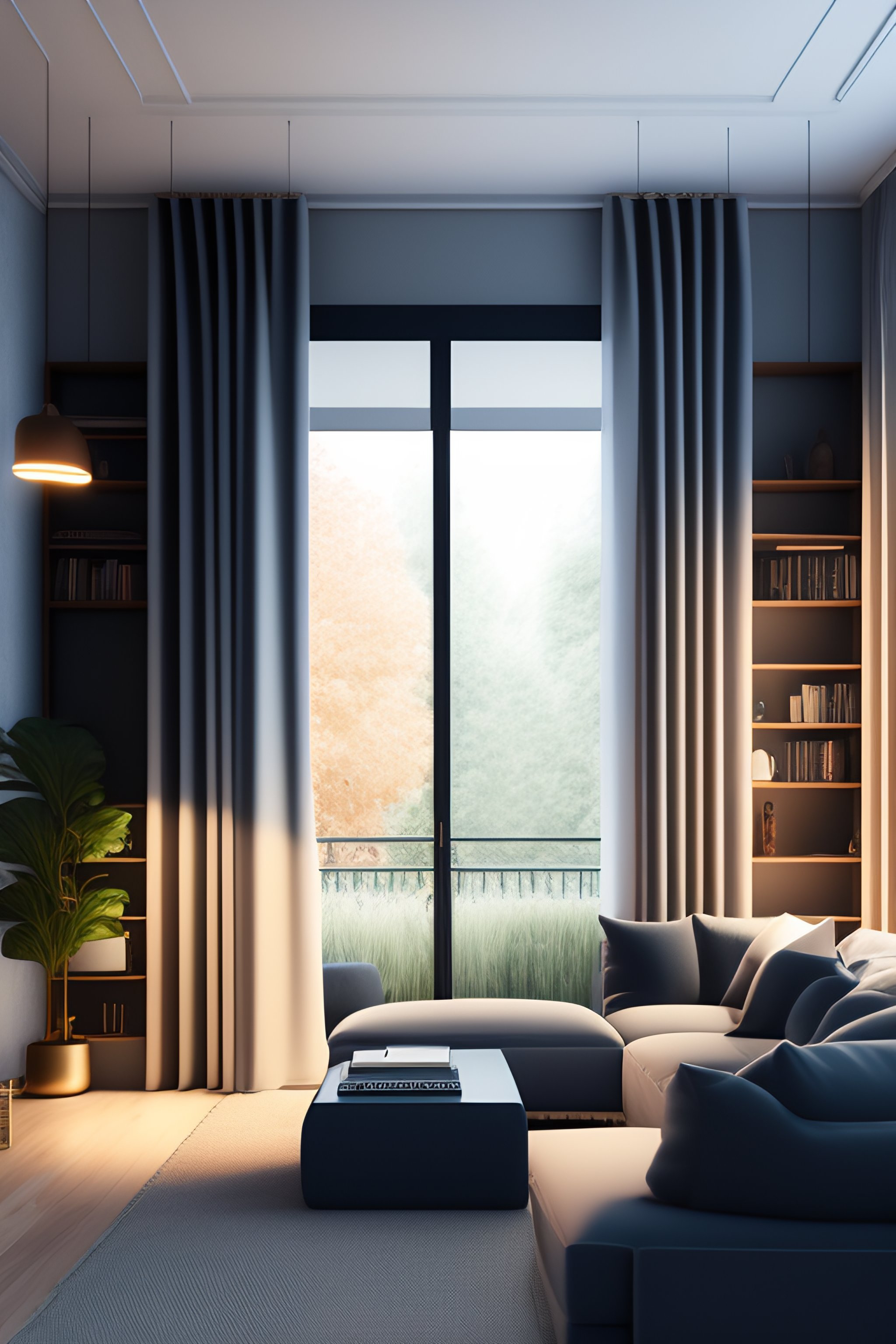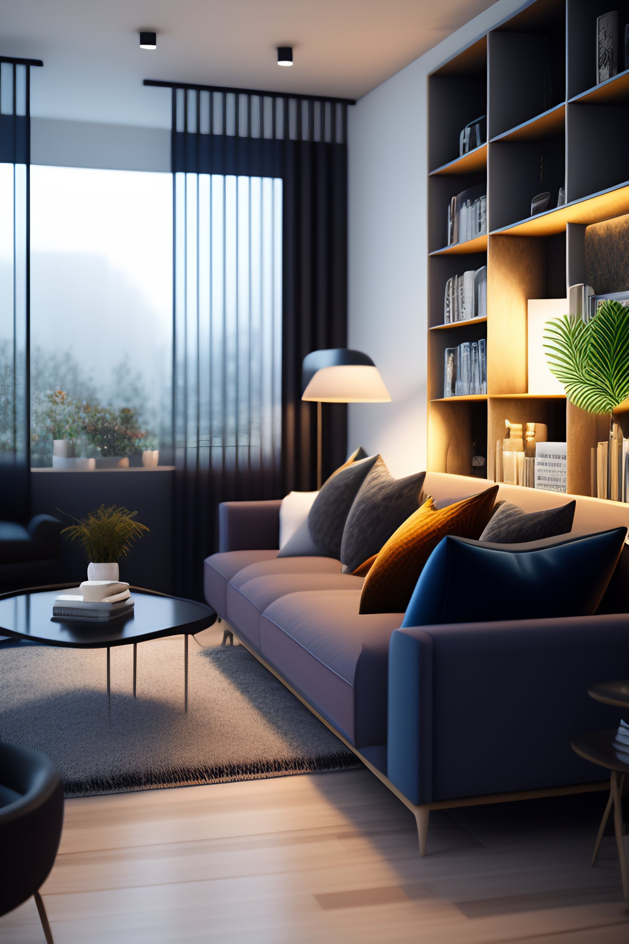 Nsanley detailed 3d render, fog, wide angle, athmosperic, large award winning interior design apartment, dusk, cozy and calm, fabrics and textiles, colorful accents, secluded, many light sources, lamps, hardwood floors, book shelf, couch, desk, balcony door, plants