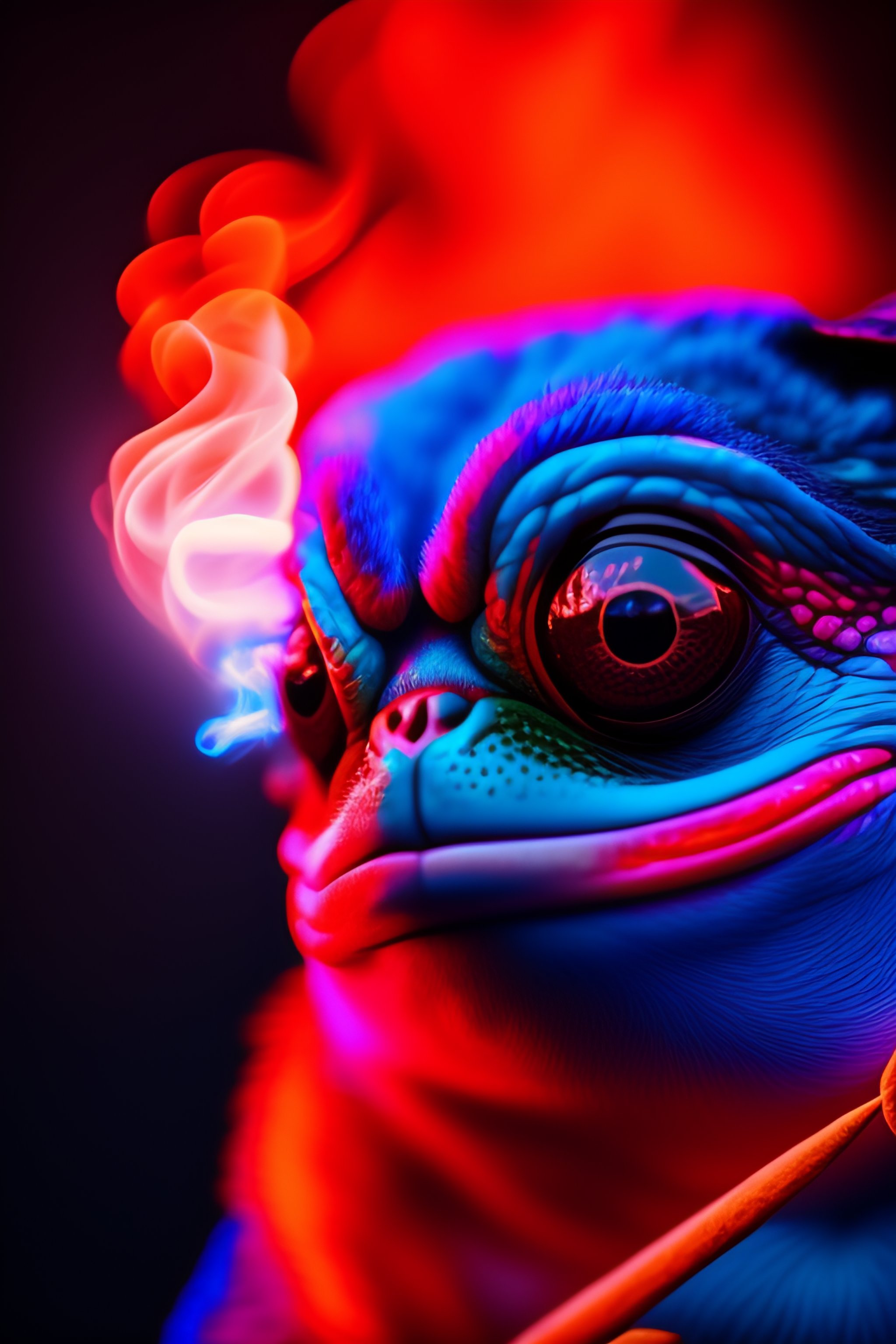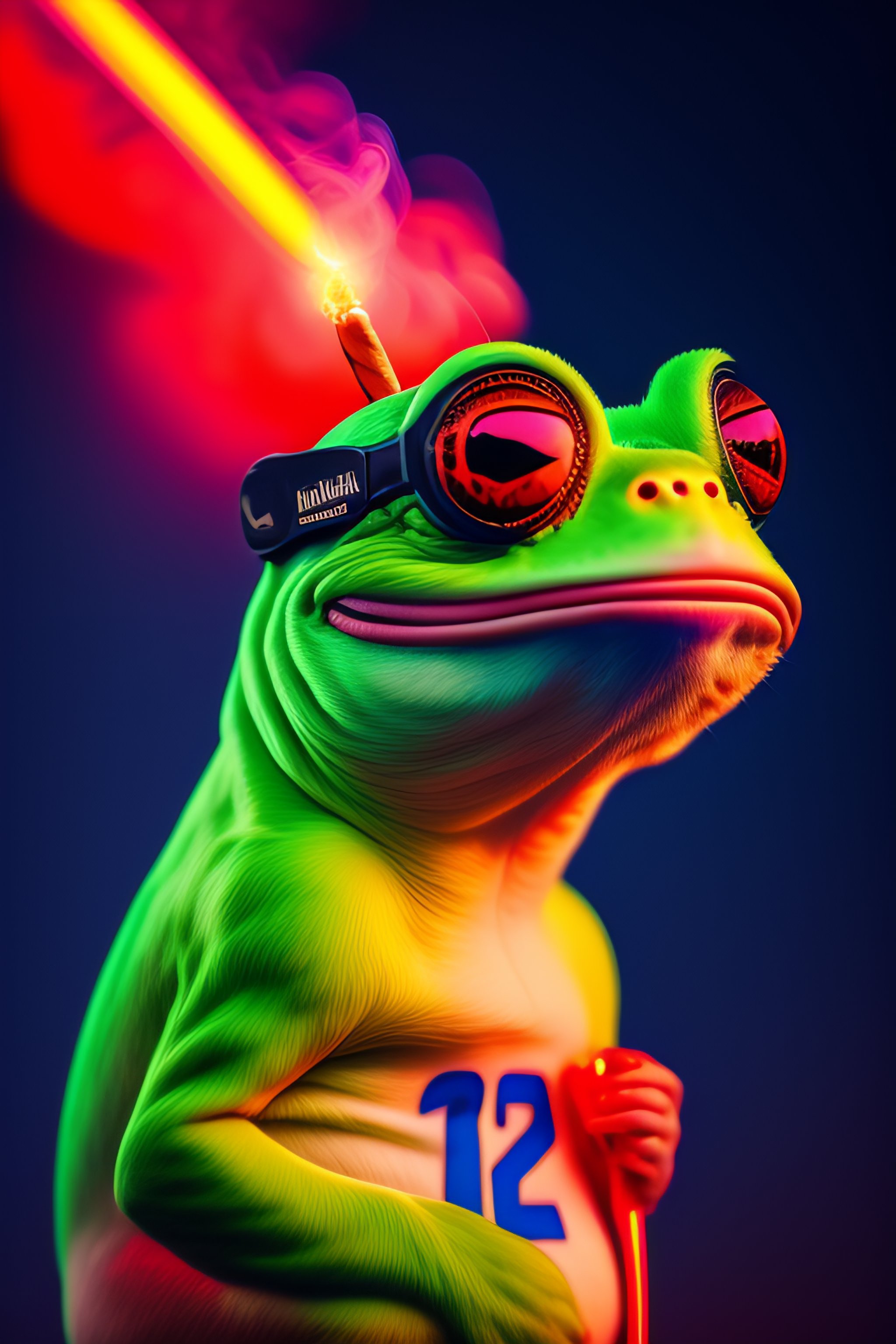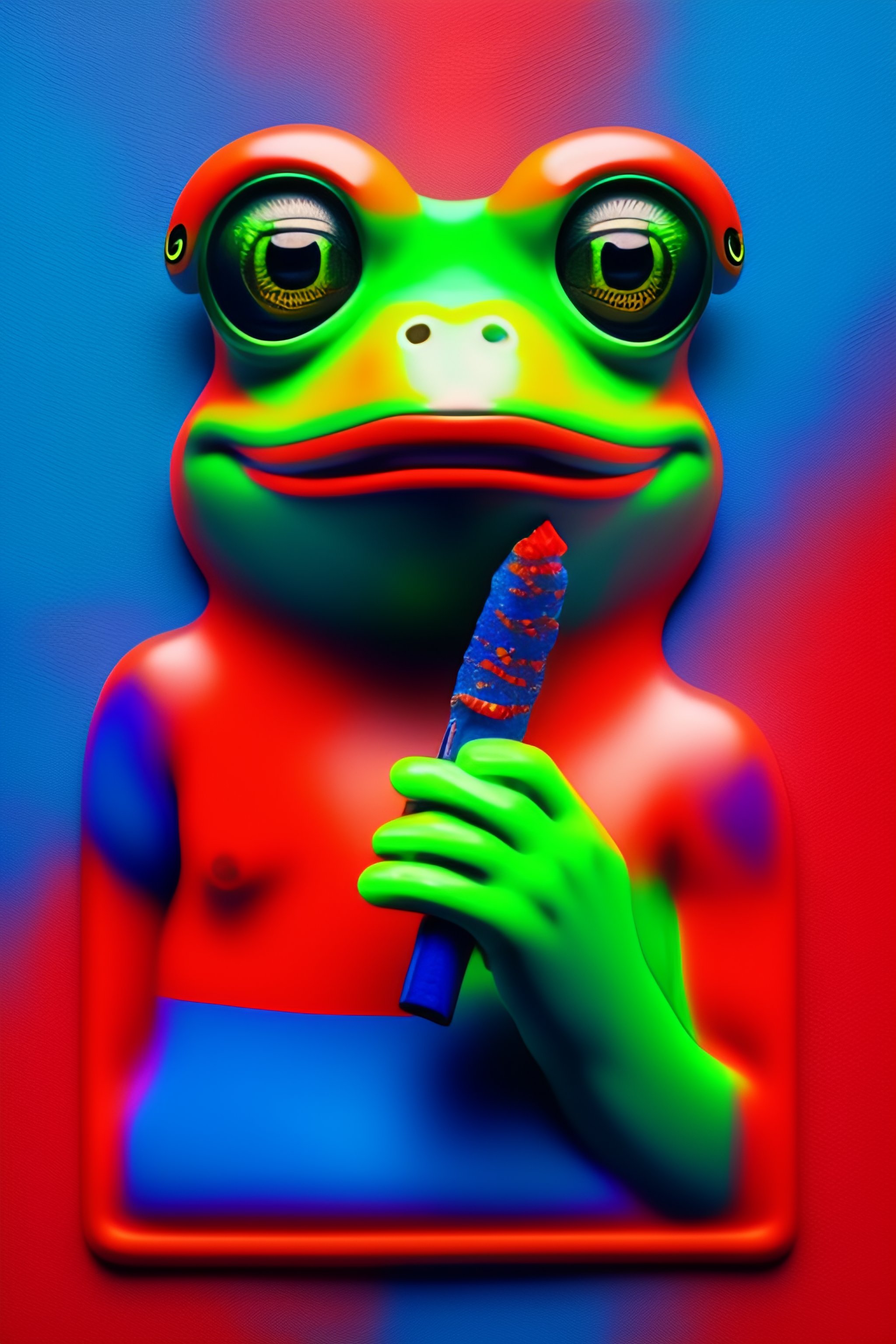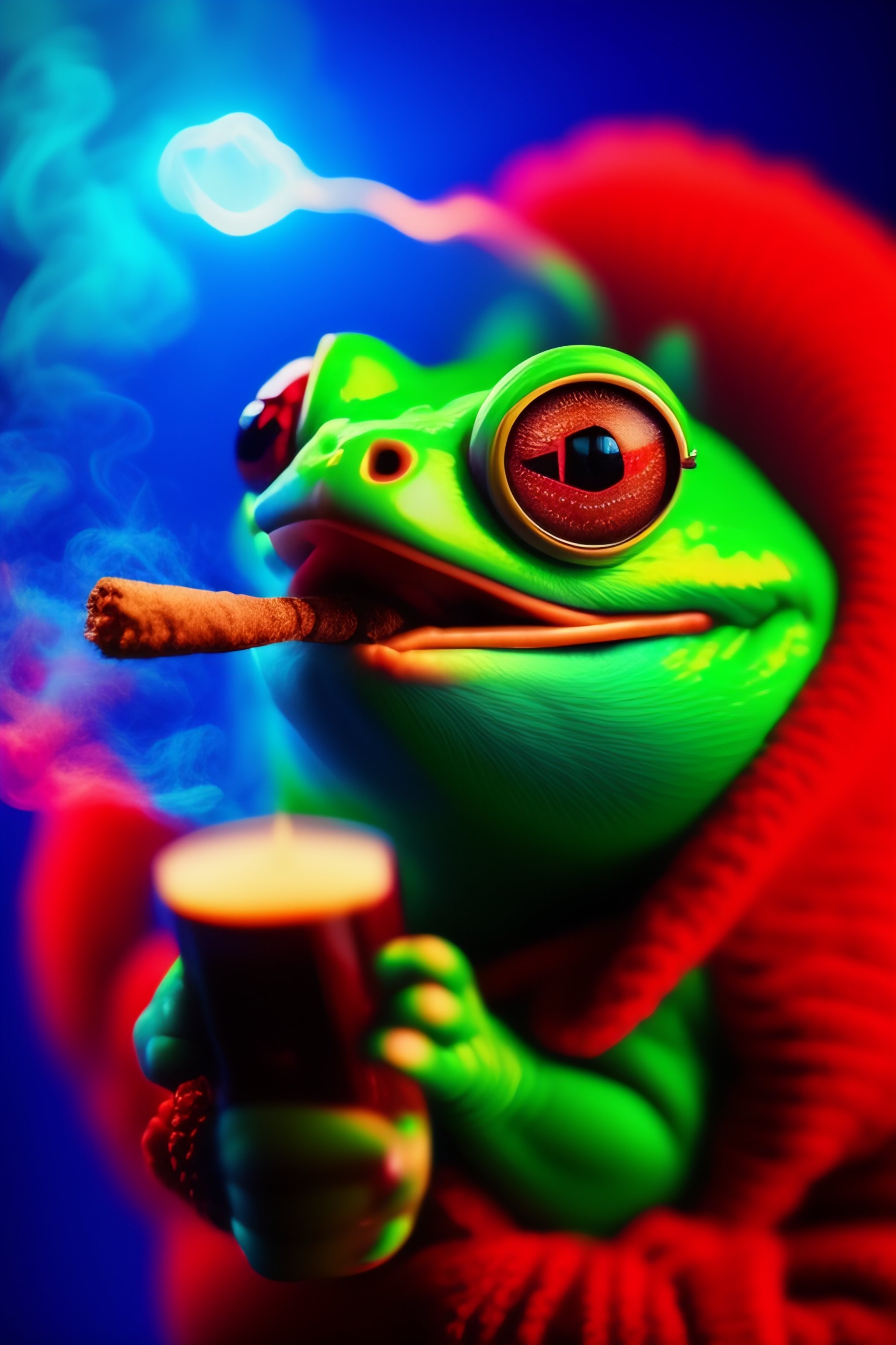 8k representation of pepe the frog smoking a cigar with t red glowing tip, blue background, pepe has wet skin.