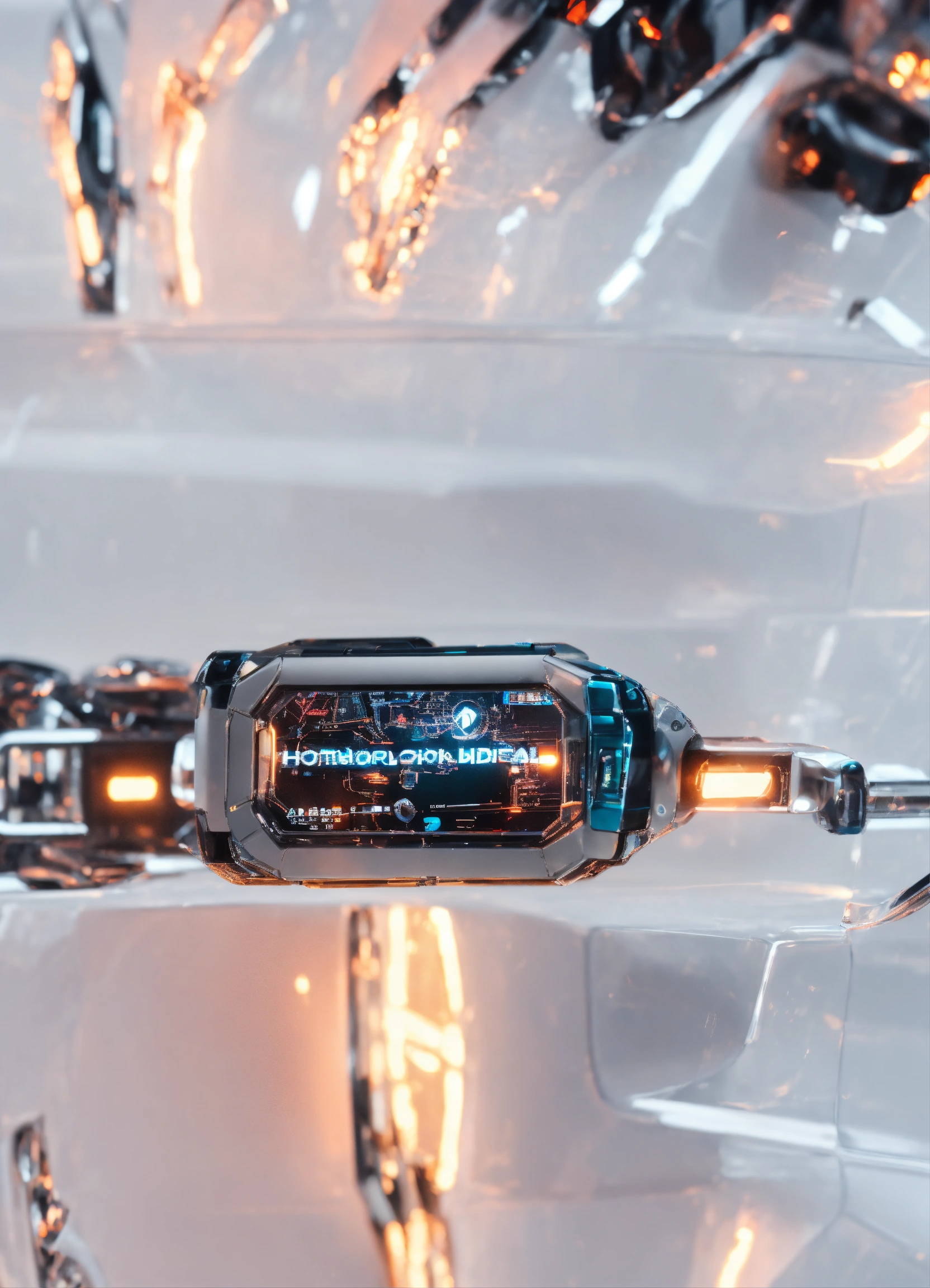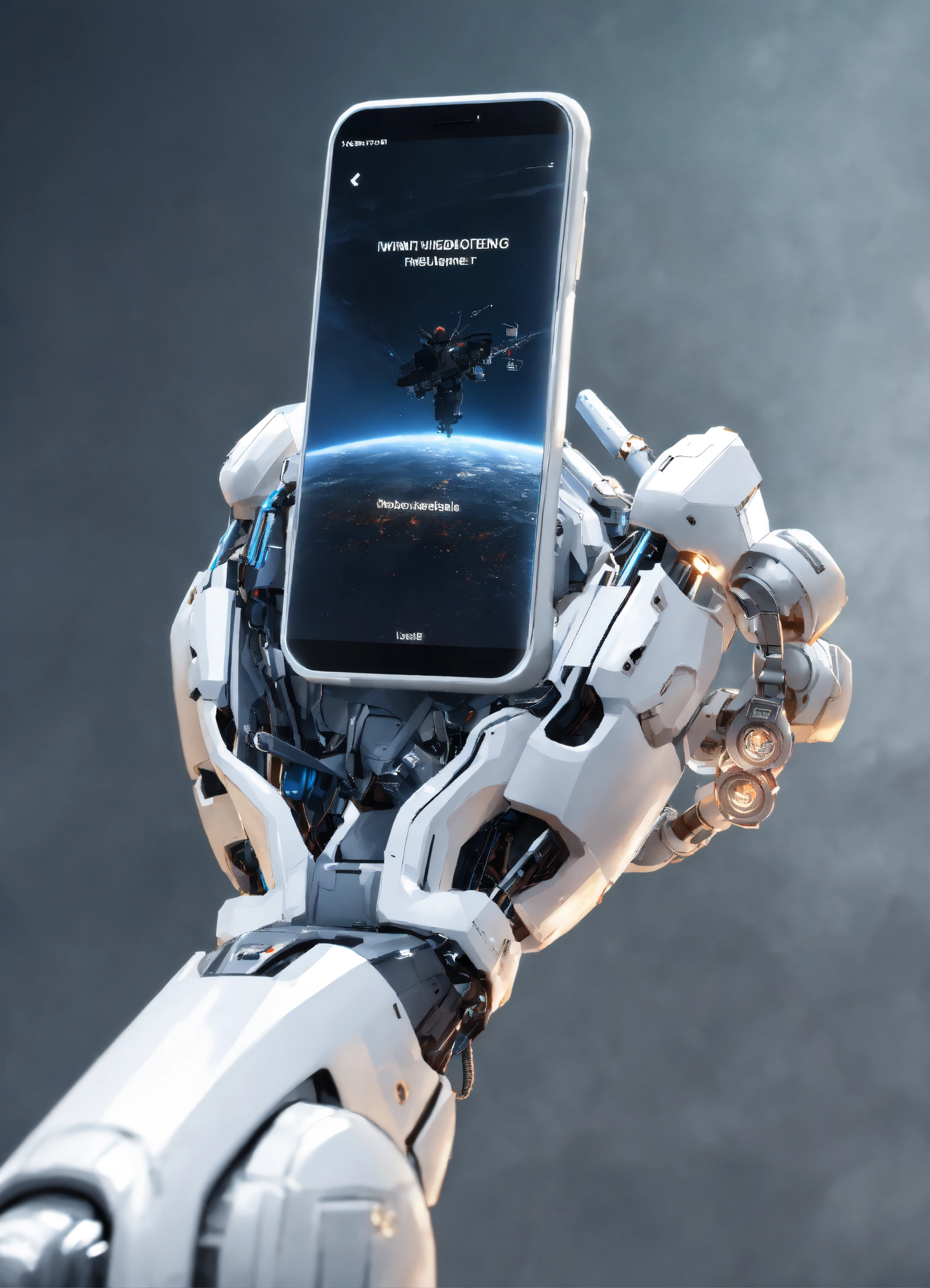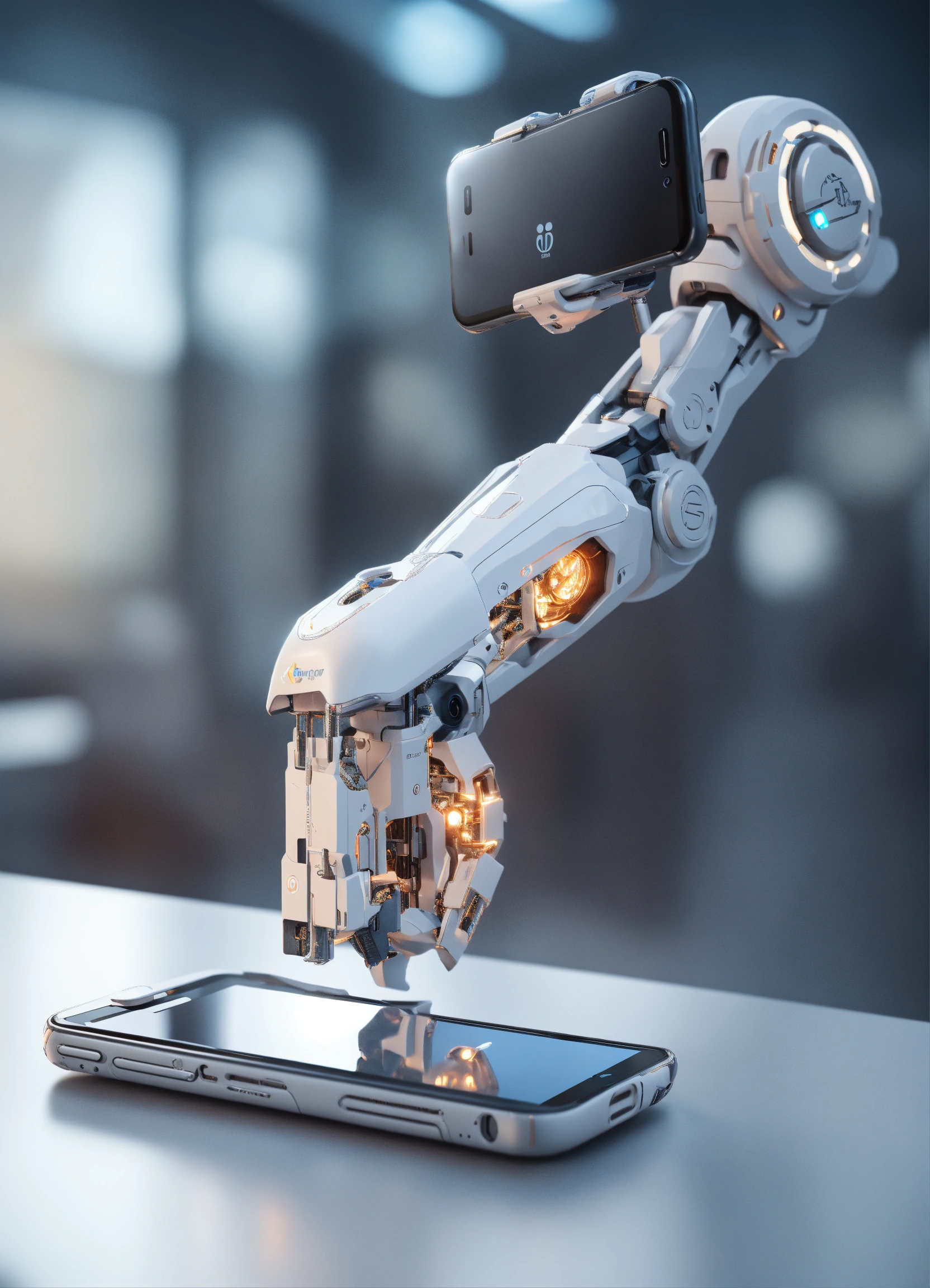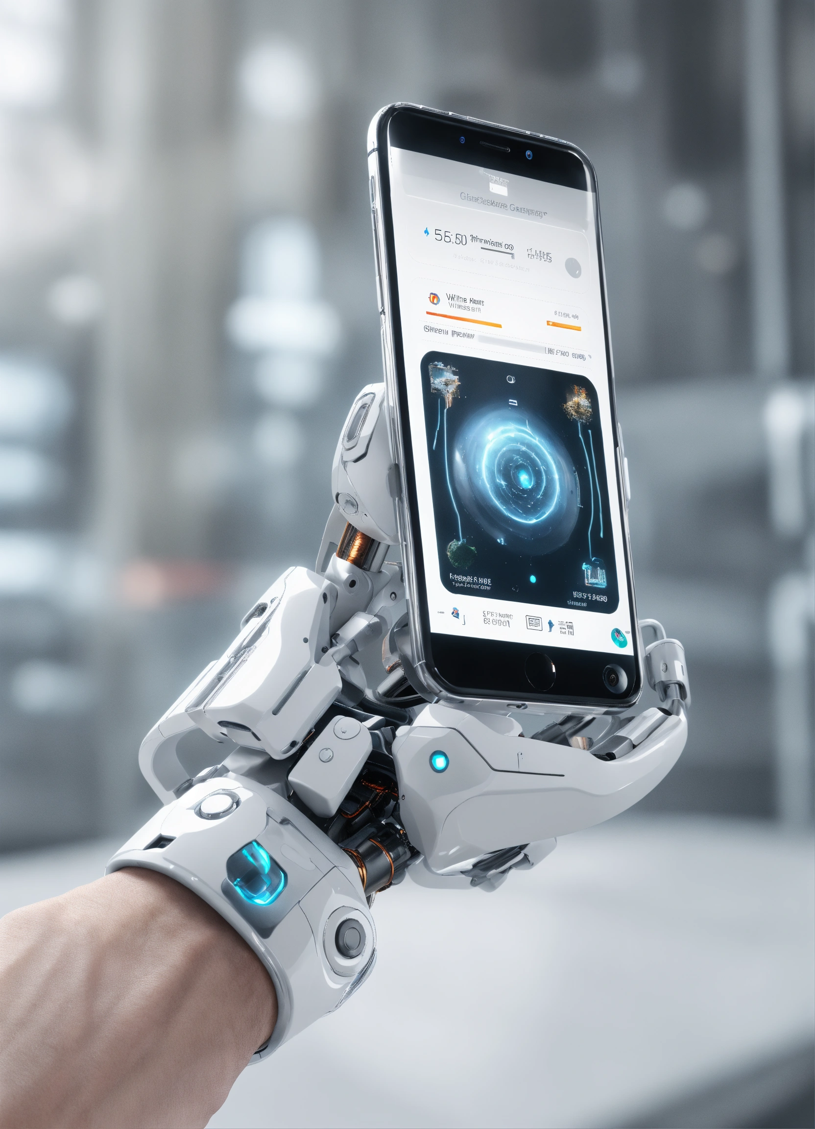 White cyborg arm vertically holding smartphone, hdr, rendered in unreal engine, realistic, white background