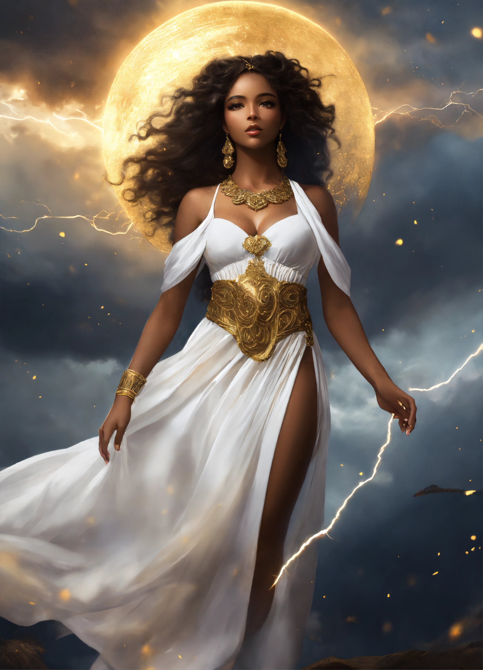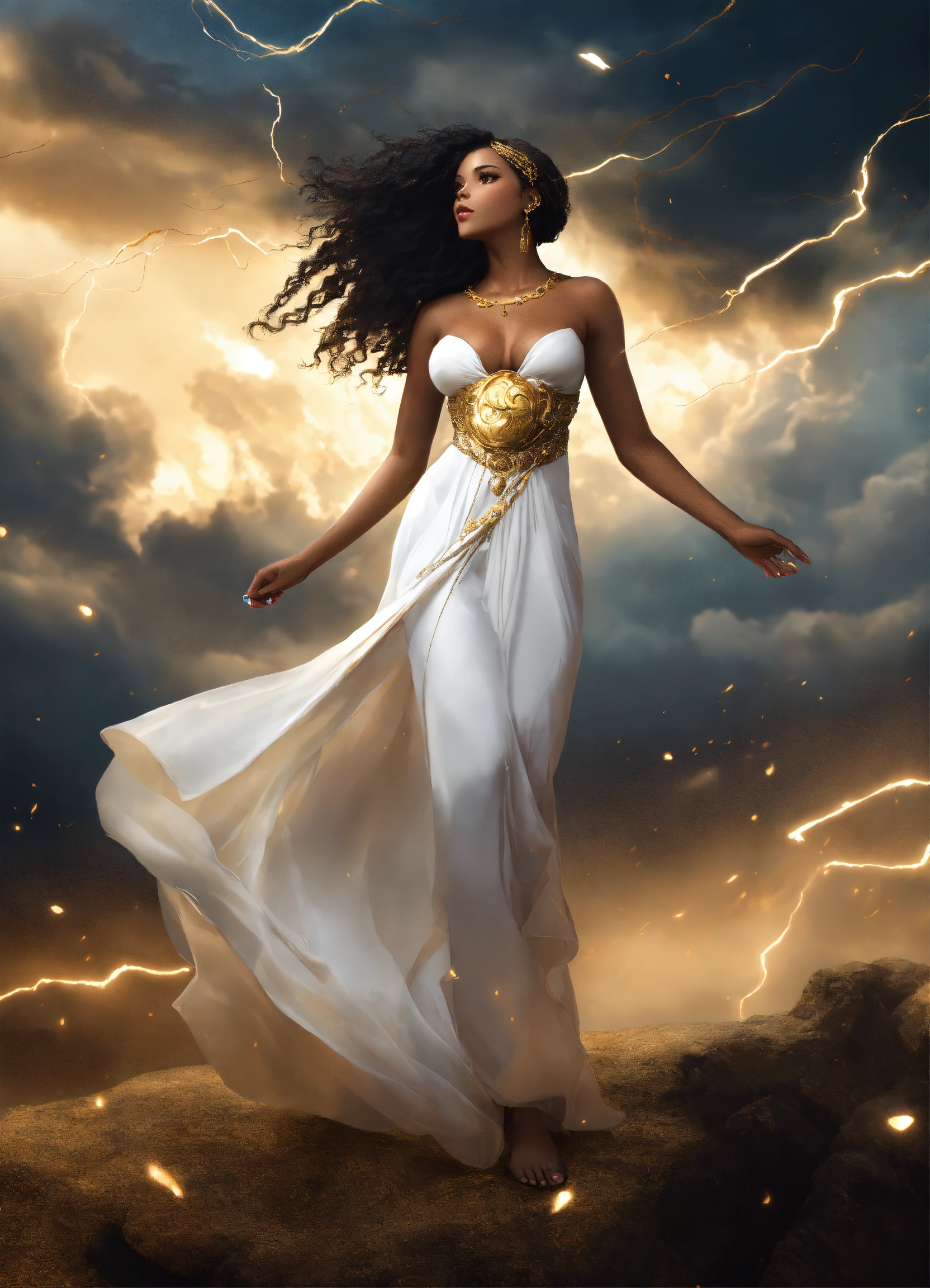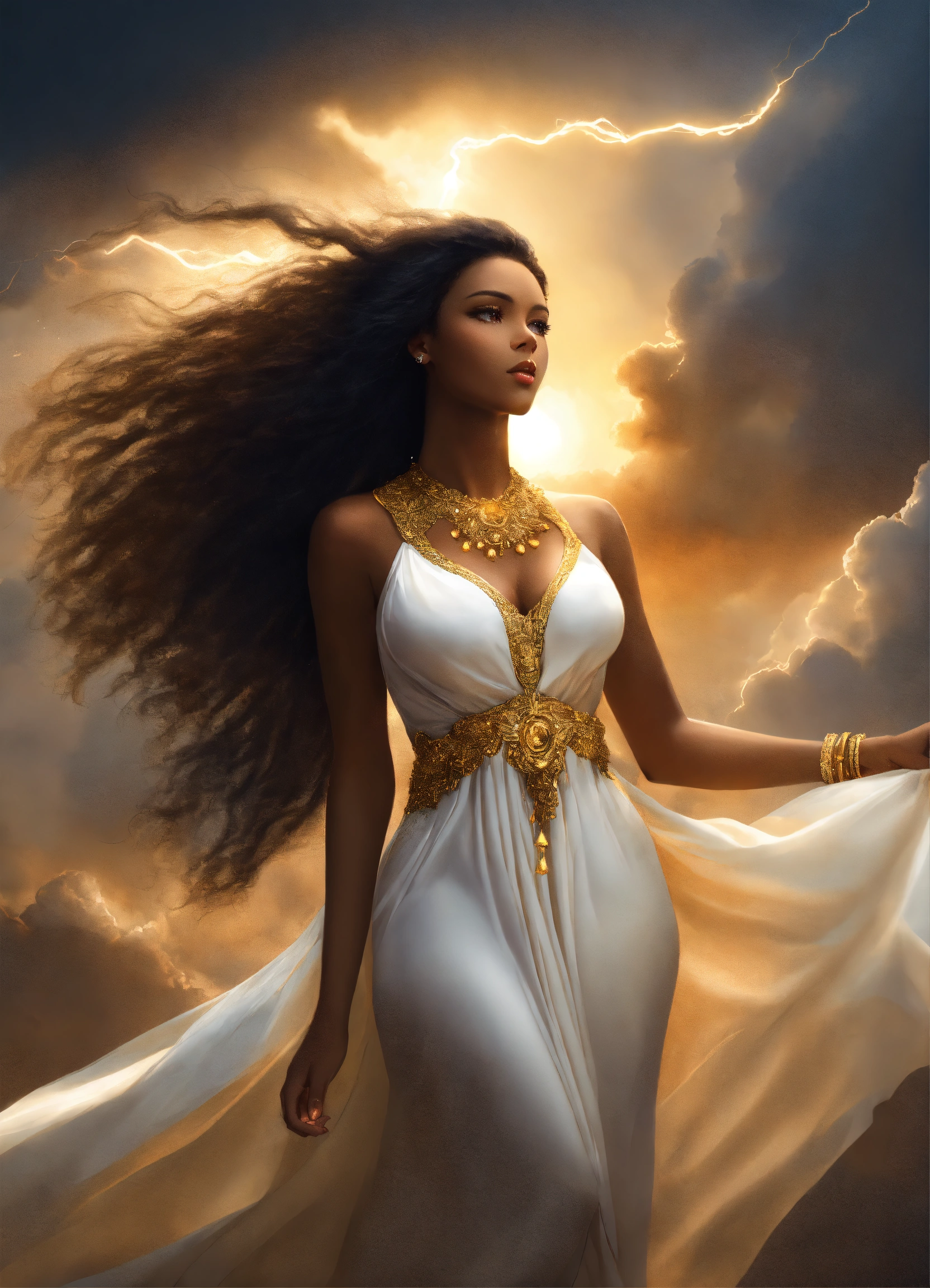 Full body beautiful black goddess woman beautiful gorgeous goddess with gorgeous dark brown skin. beautiful perfect face, shapely hour-glass figure long flowing hair, fully clothed in a flowing white dress and gold accessories, she's floating in the sky with gold lightning and dark clouds behind him, high detail, realistic photo, high detail, digital painting, cinematic, stunning, hyper-realistic, sharp focus, high resolution 8k, insanely detailed