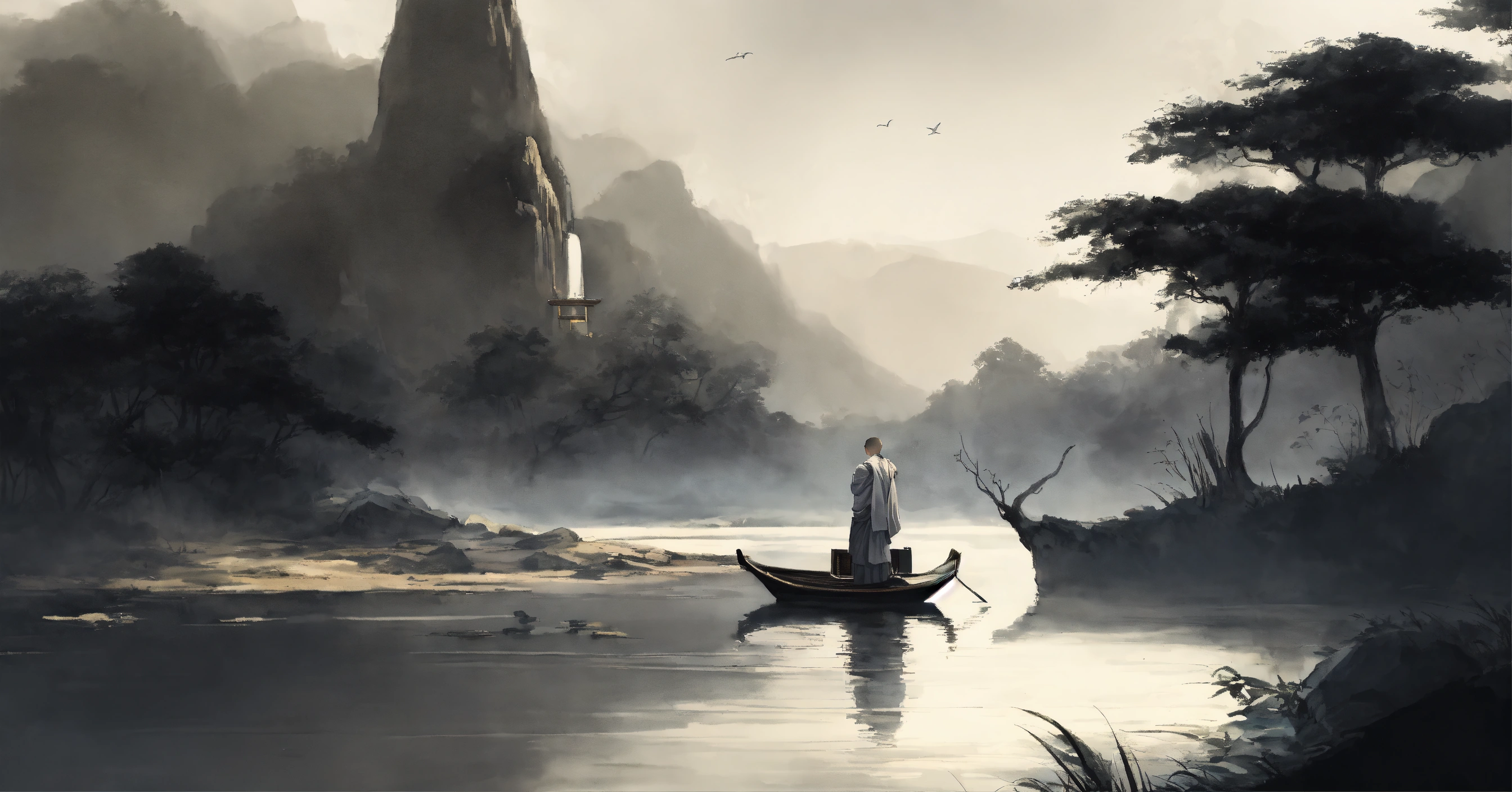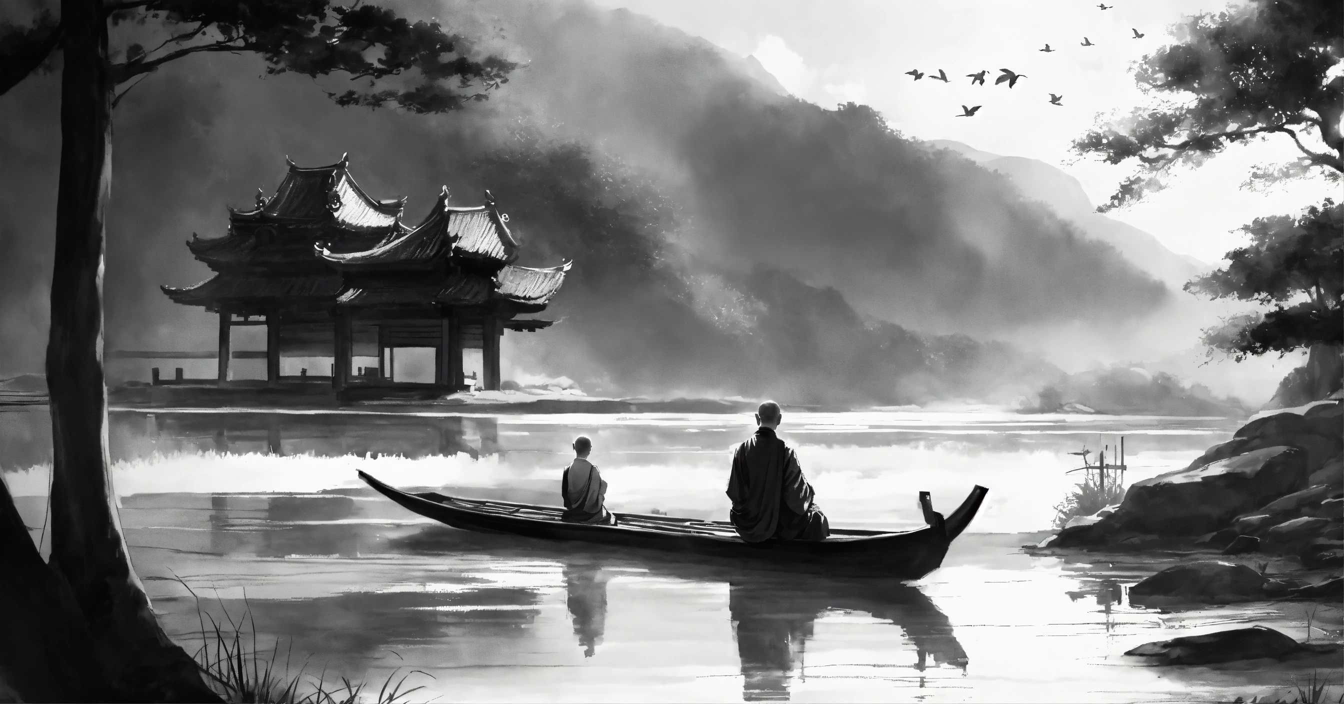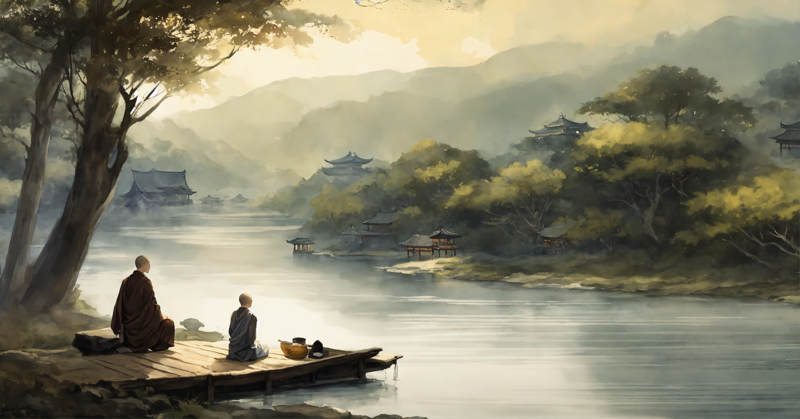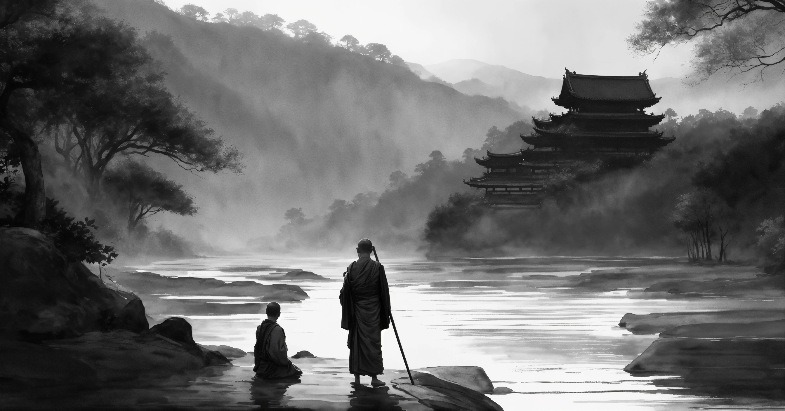 Create a black and white watercolor illustration that captures the essence of the traditional buddhist tale of the two monks and the river. the scene should depict an older monk carrying a young woman on his shoulders, with the river flowing beneath them. in the background, the younger monk should be watching intently, his expression a mix of surprise and contemplation. the setting should be serene, representing a timeless landscape with the river as the central element. the water's flow should symbolize the passage of time and the transient nature of moments. the older monk's calm demeanor should contrast with the younger monk's evident internal struggle, highlighting the story's theme of living in the present and letting go of attachments. the overall tone of the illustration should evoke introspection, serenity, and the profound lessons of the tale.