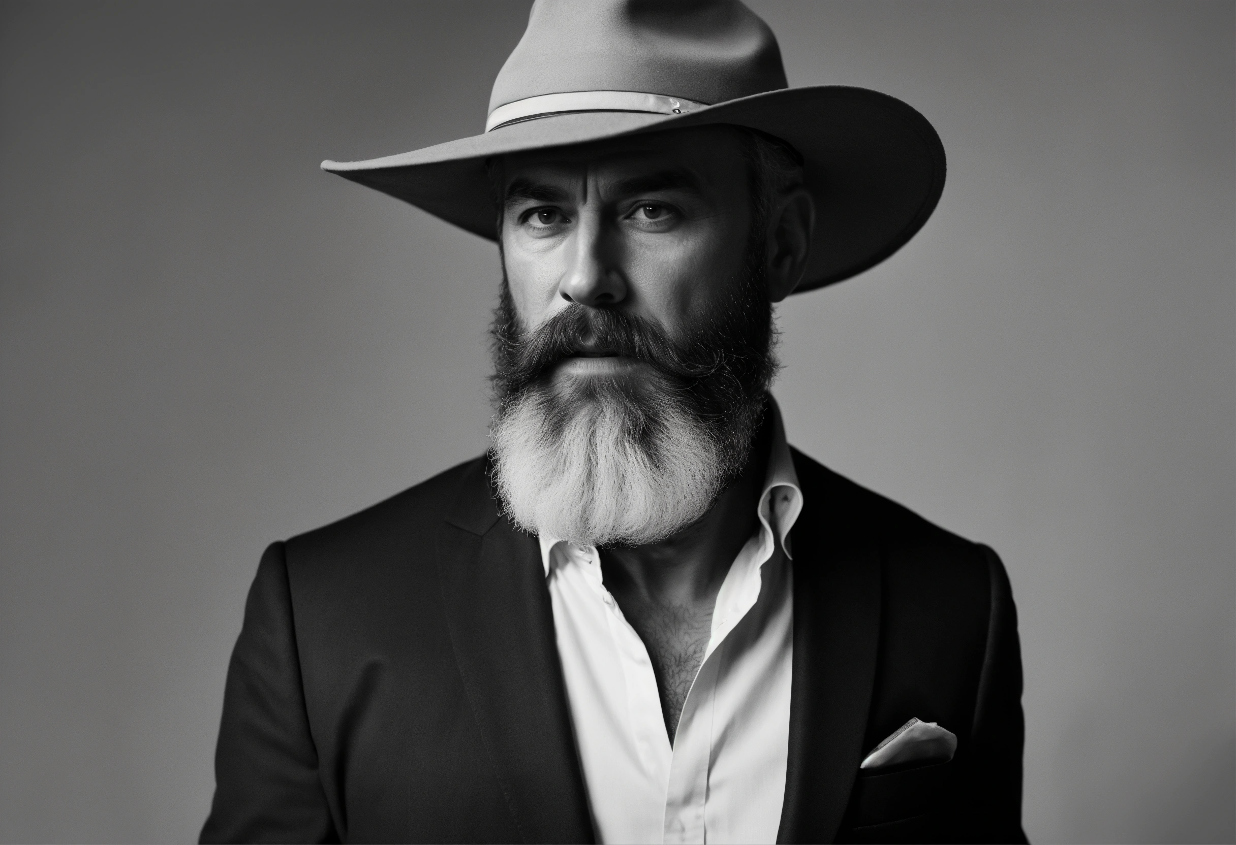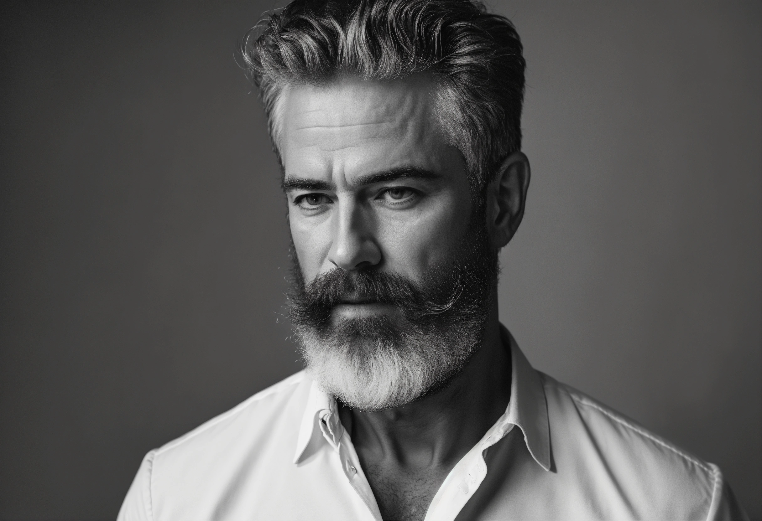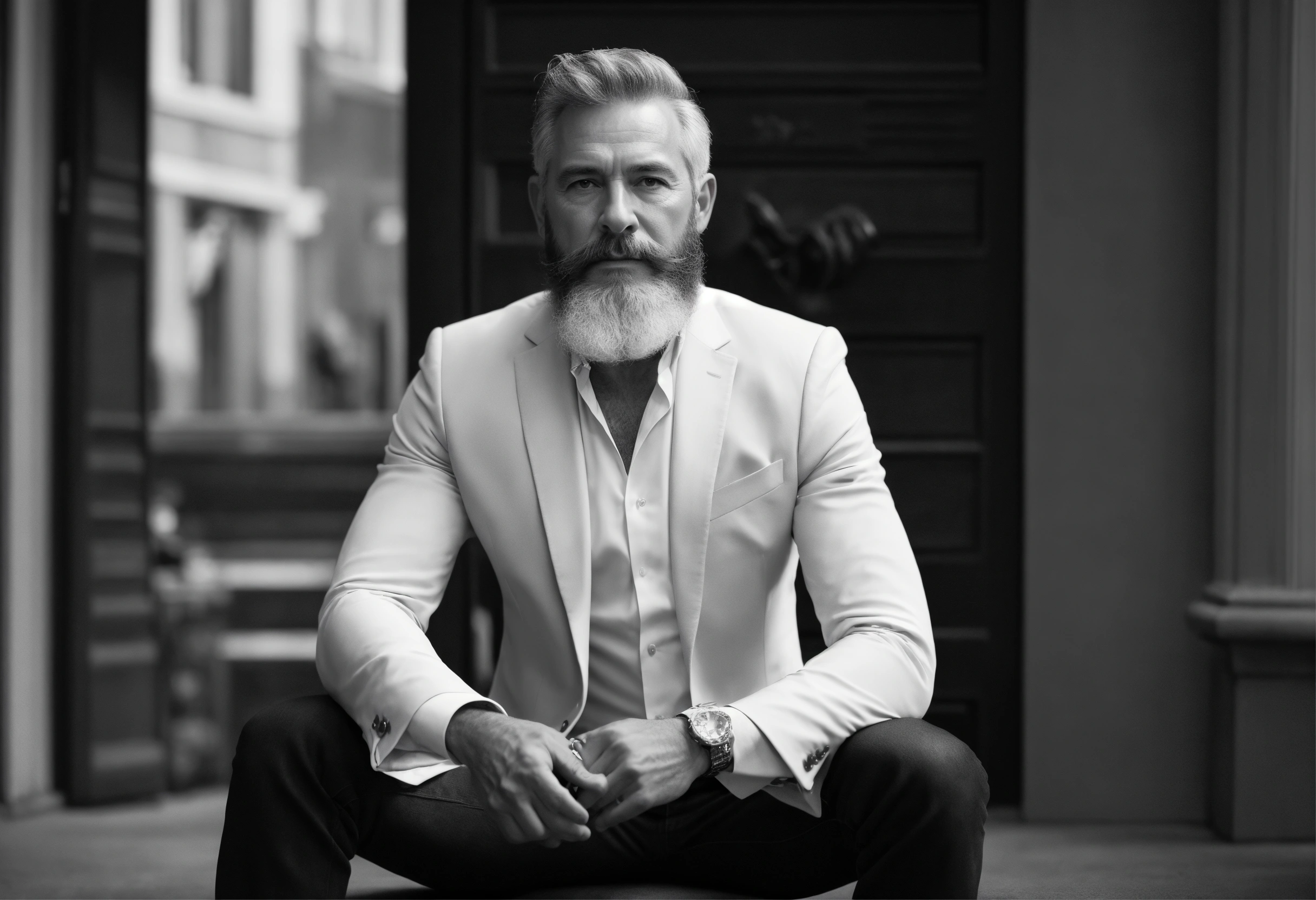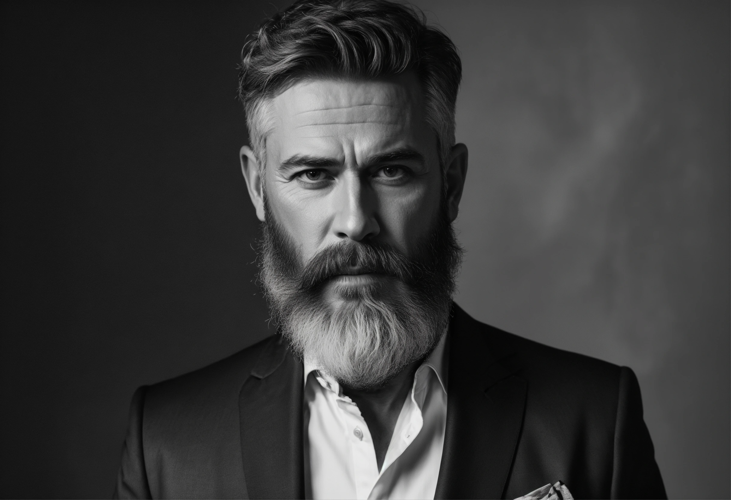 Website mockup, black and white online portfolio for classy 50 year old actor with beard, fashion model