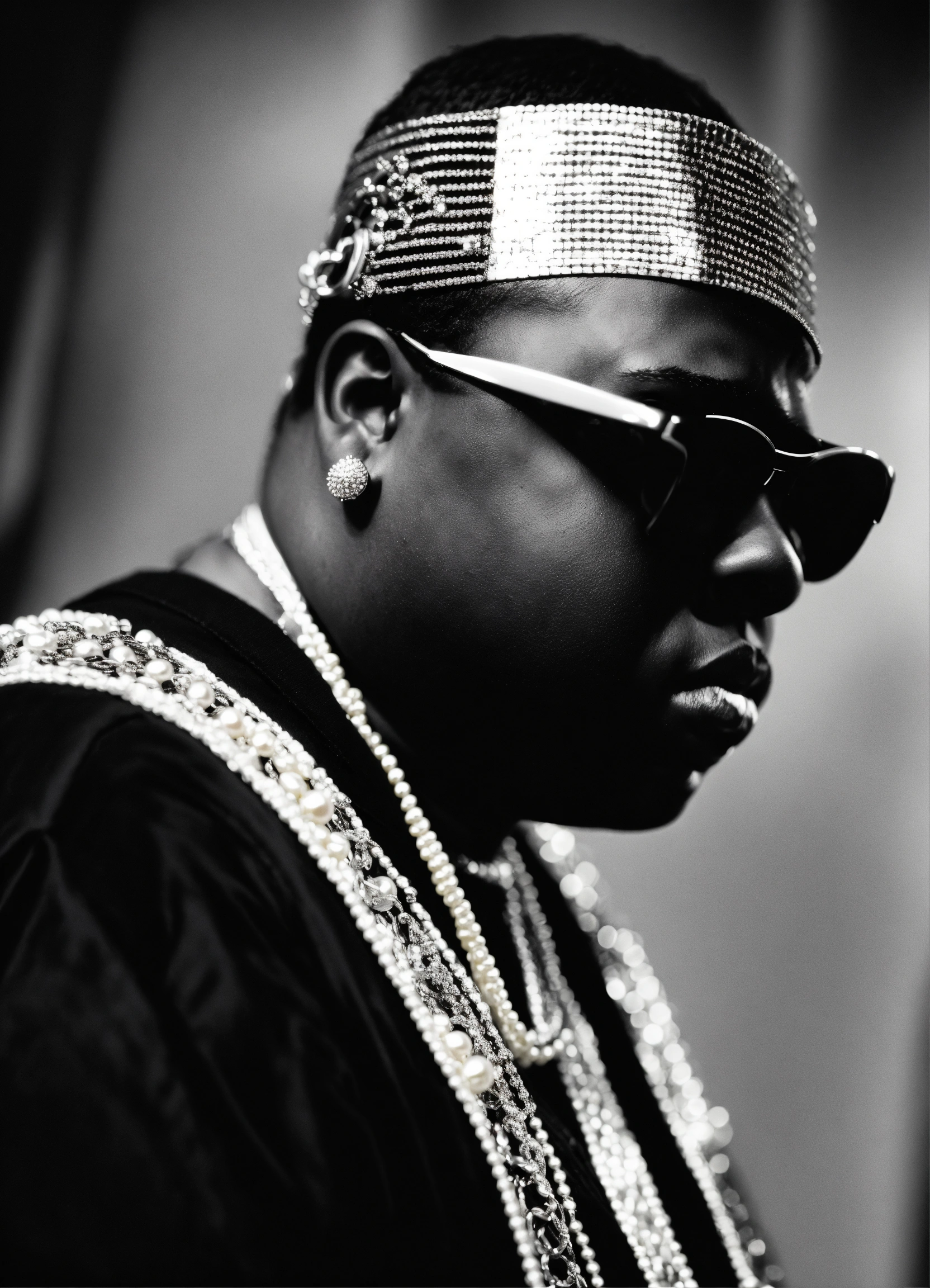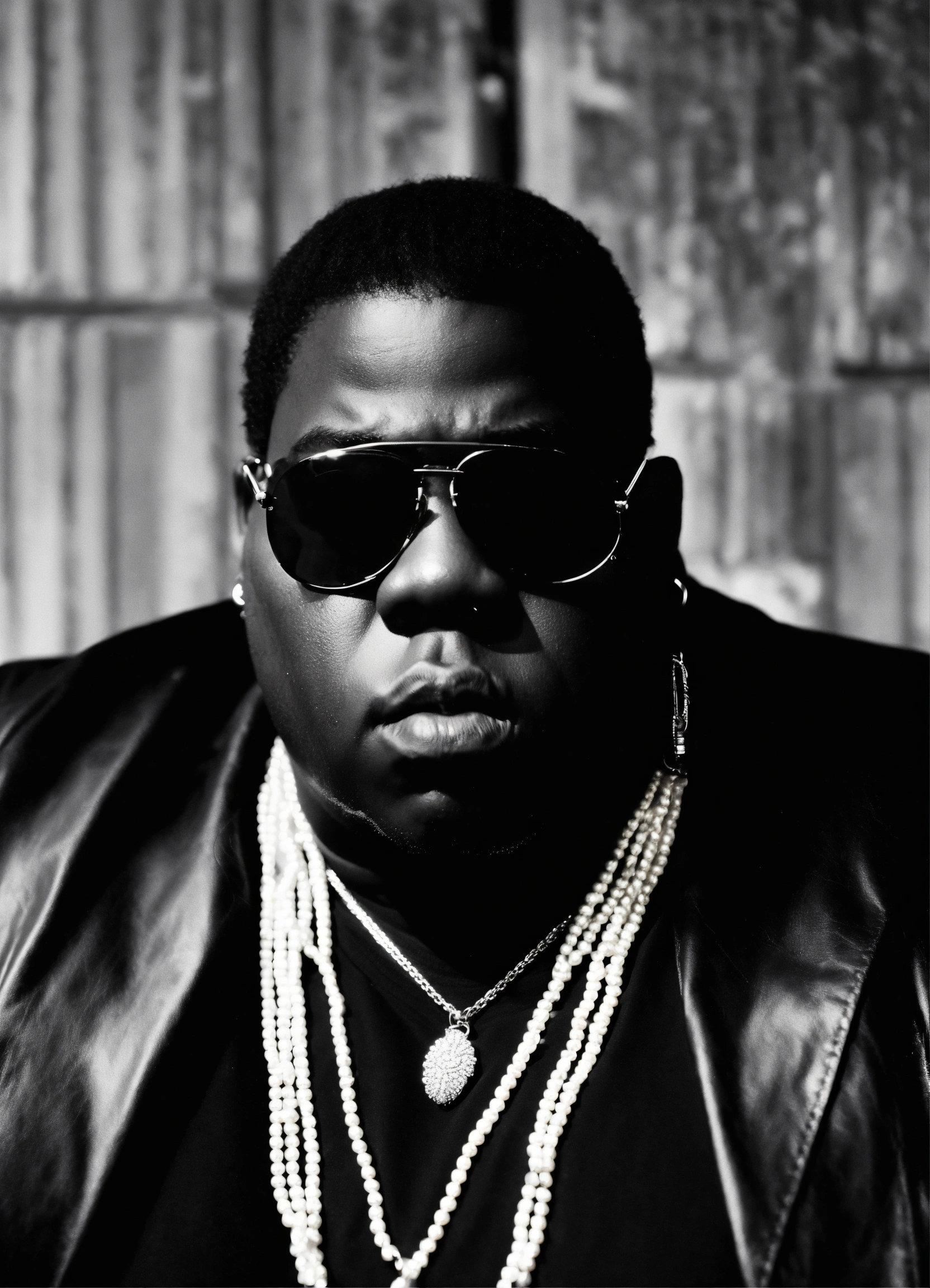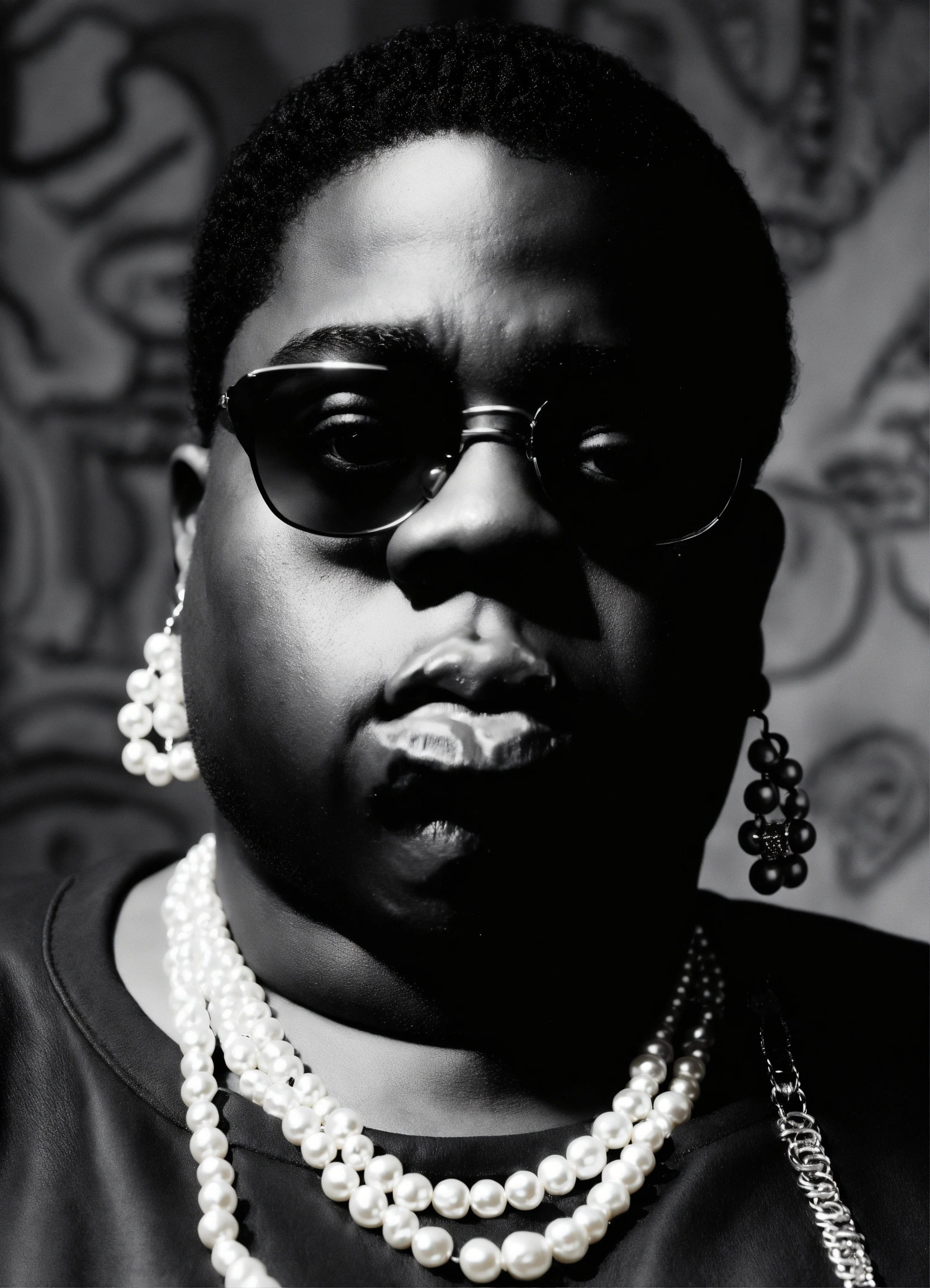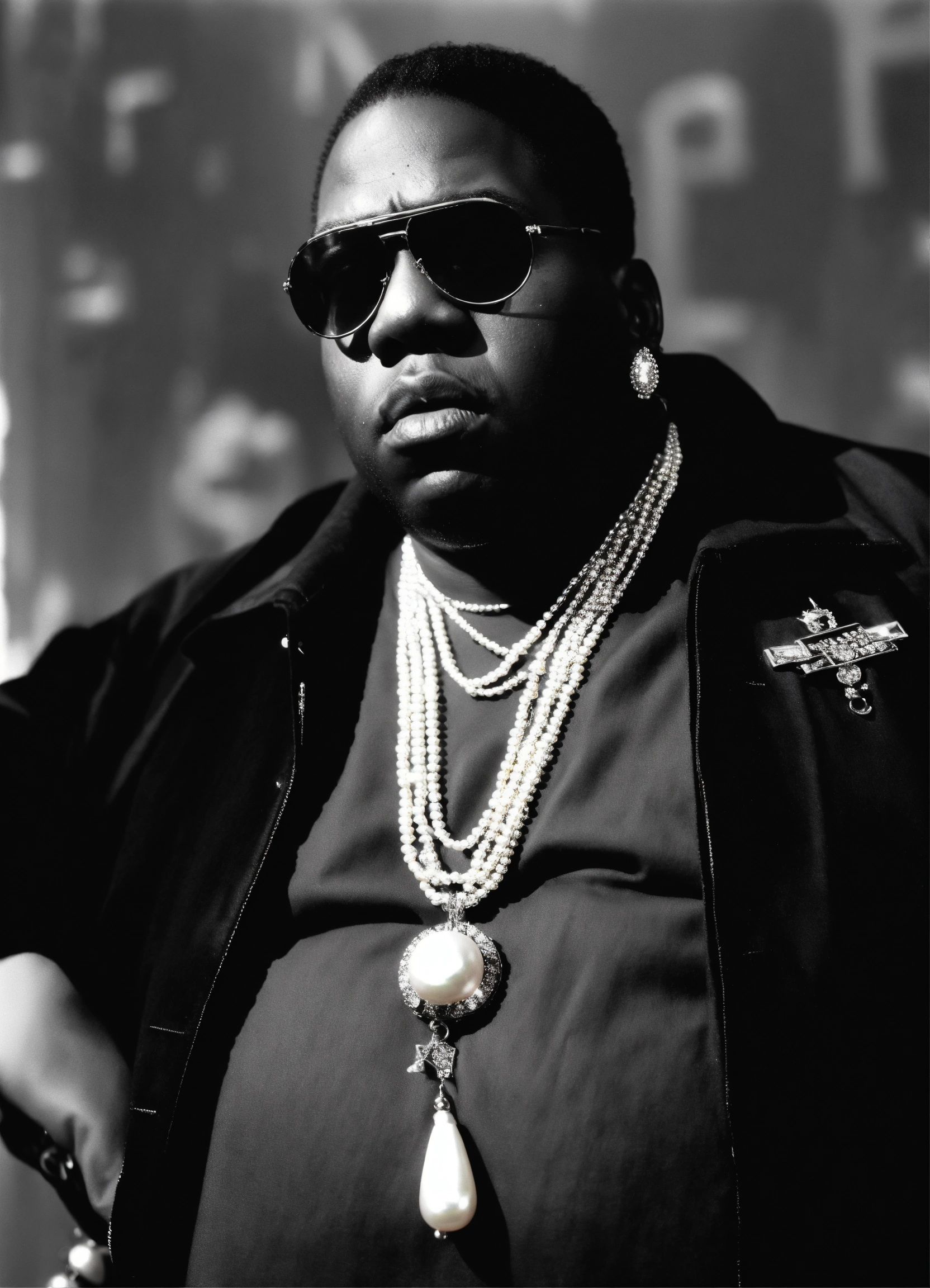 Notorious big, wearing pearl earrings, black and white background, city of new york, no chains, no sun glasses.