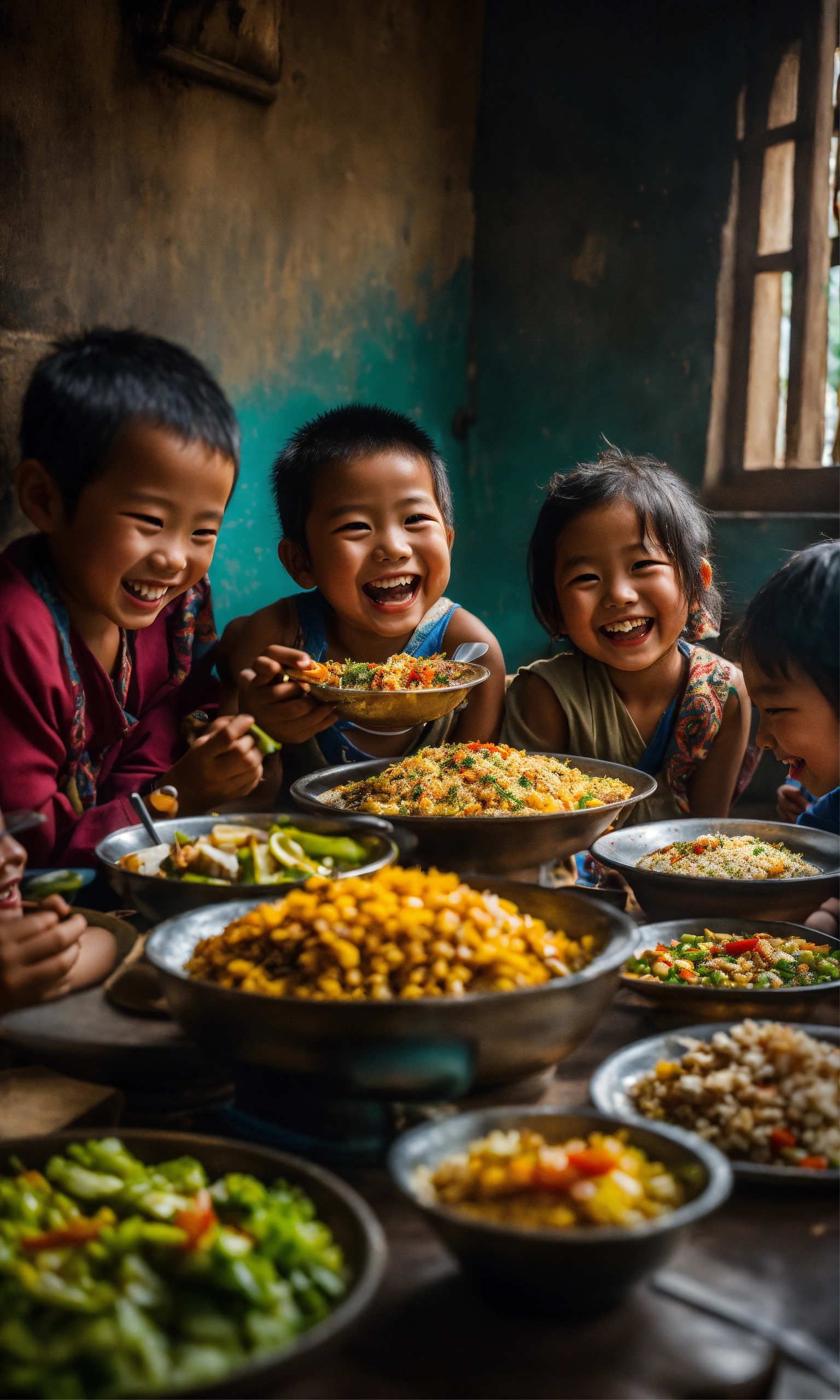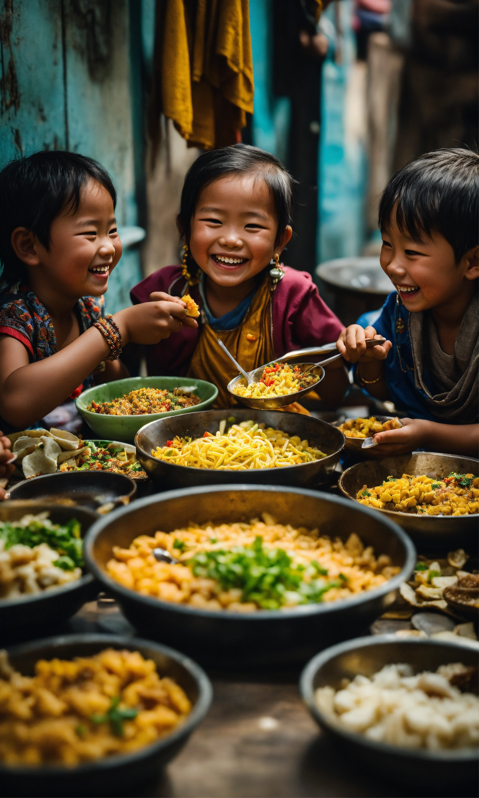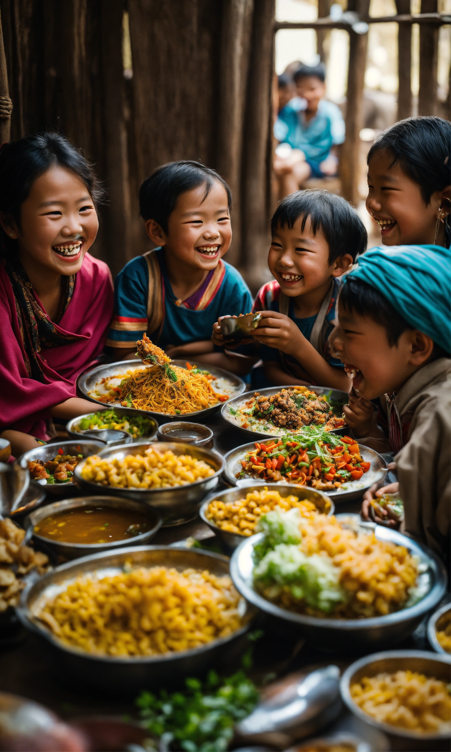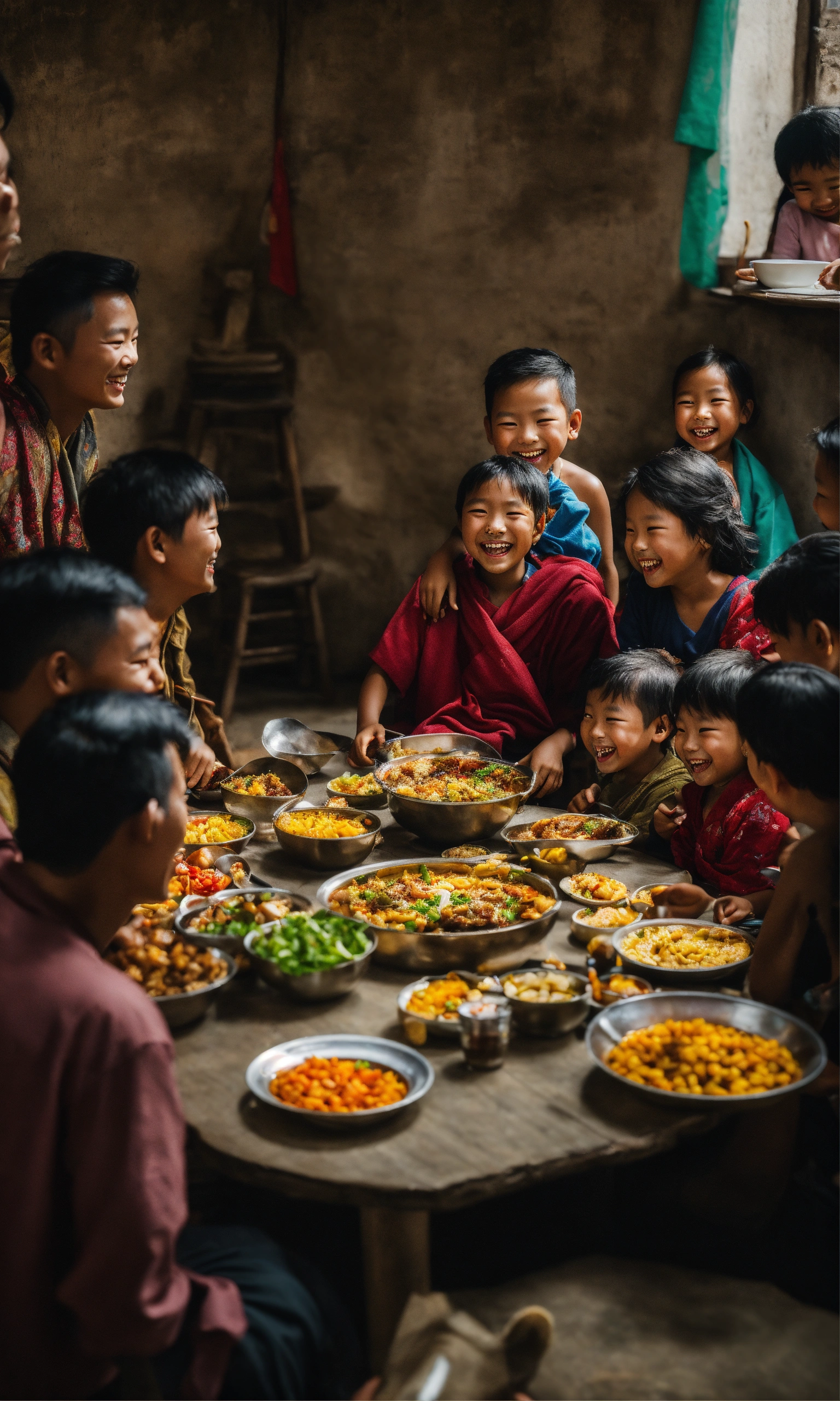 A group of people sitting around a table full of food, a picture, by yang borun, pexels contest winner, hyperrealism, smiling laughing, little kid, nepal, kerem beyit