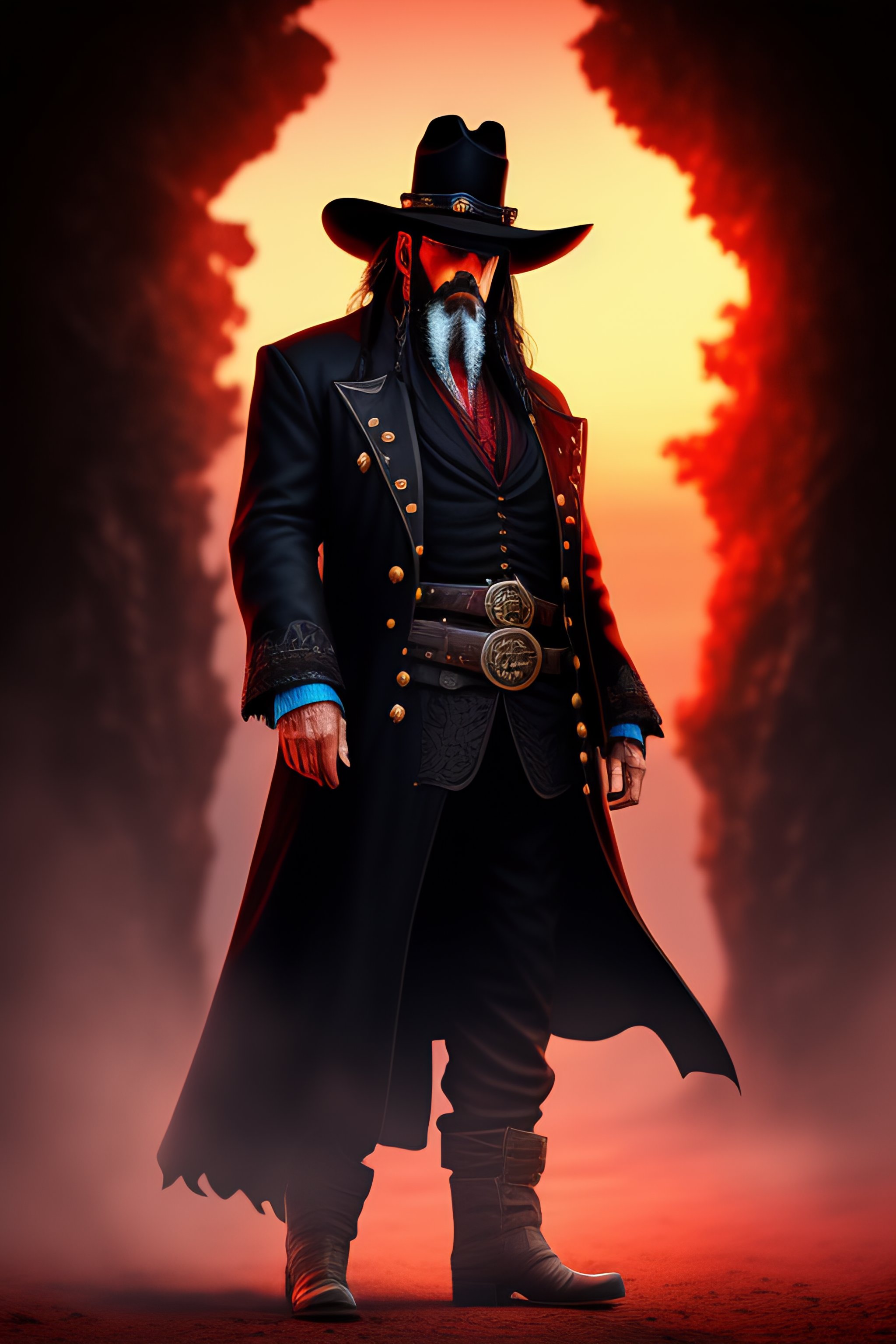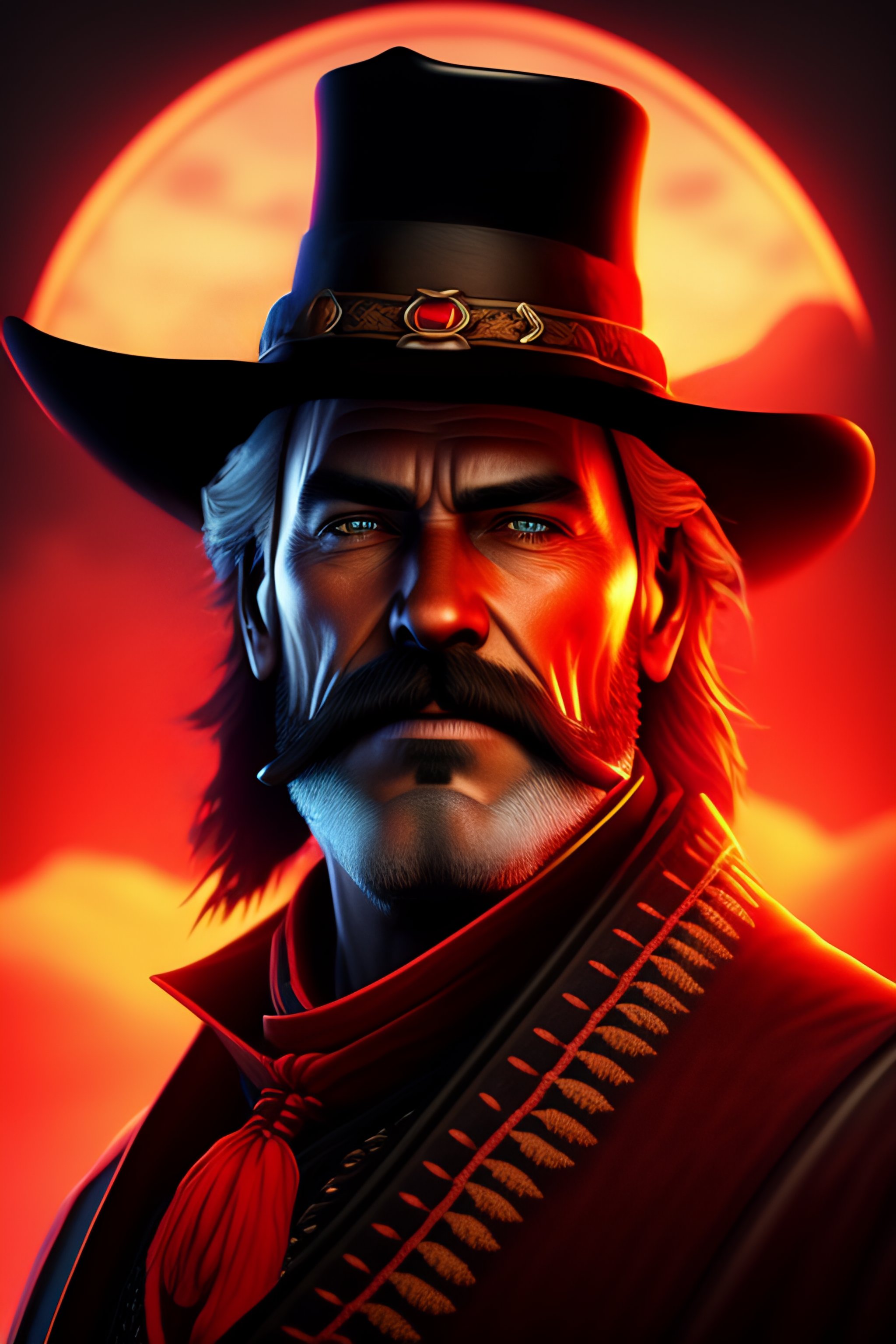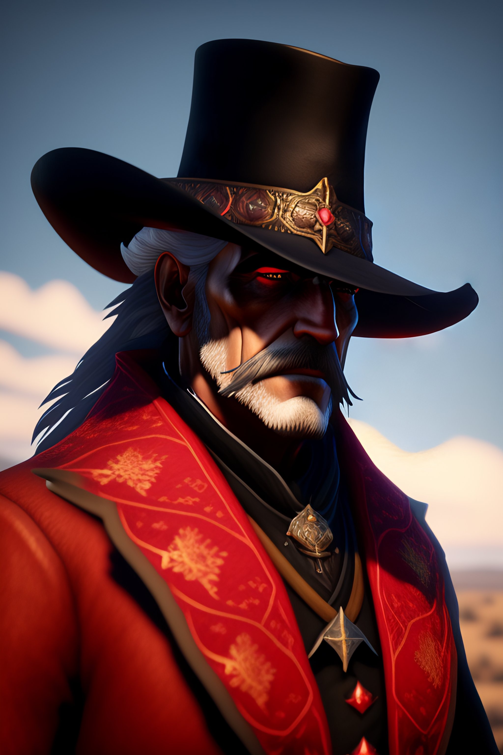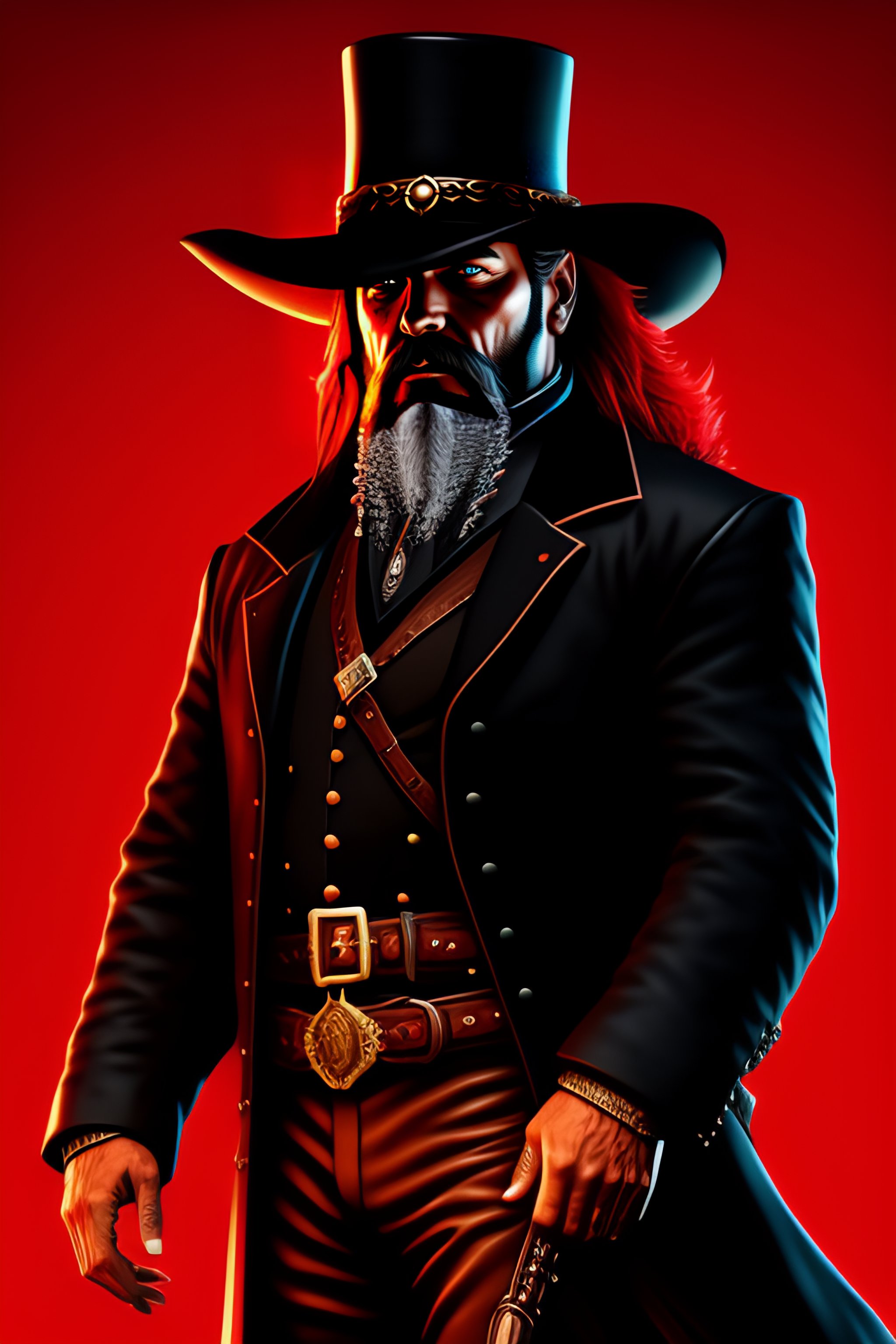 Wild west portrait of a undertaker old man in black duster with a goatee anime high quality, detailed, red colors palette, intricate, realistic cartoon, in style of red dead redemption 8k
