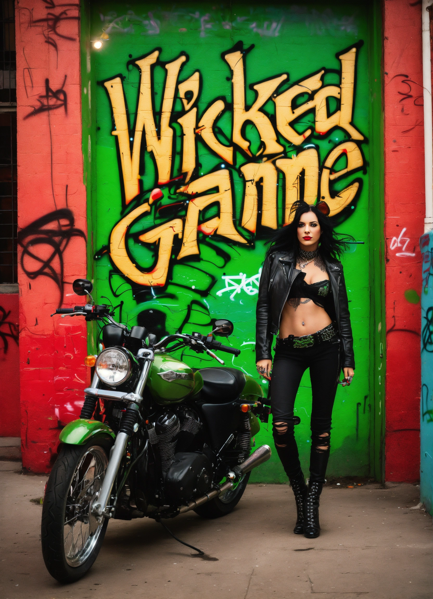 A graffiti saying wicked game in green with 2 girls on motorcycles like motley crue