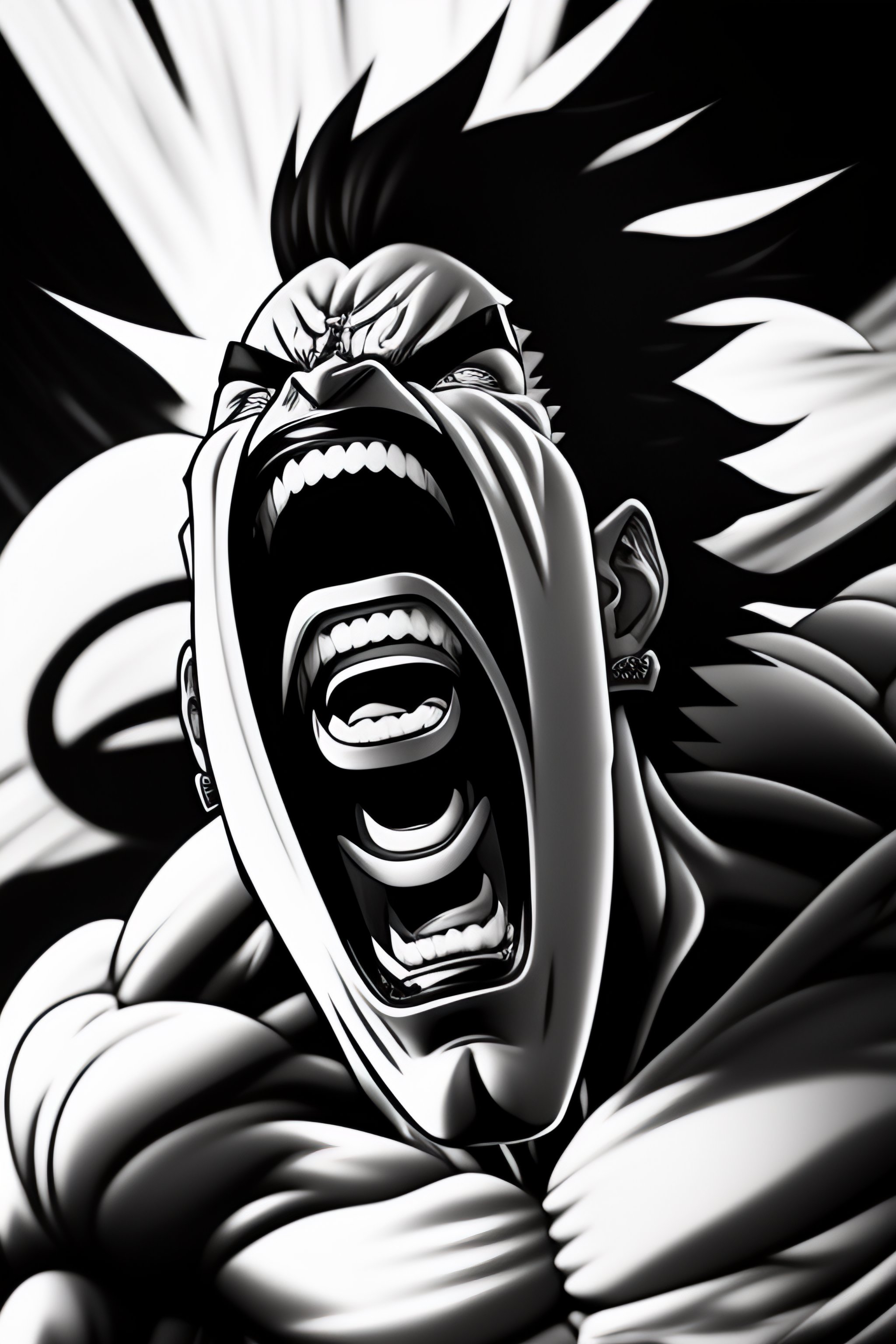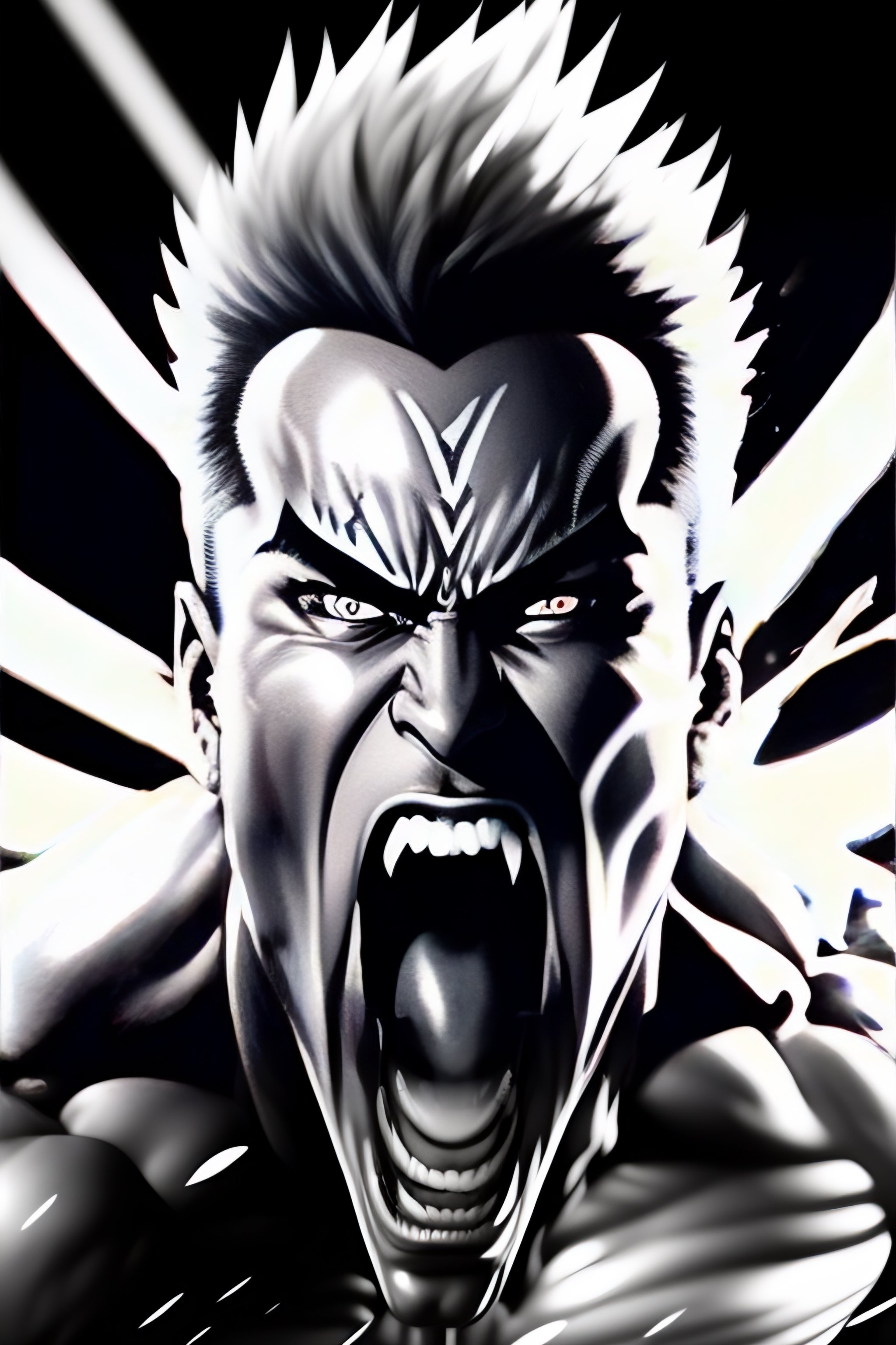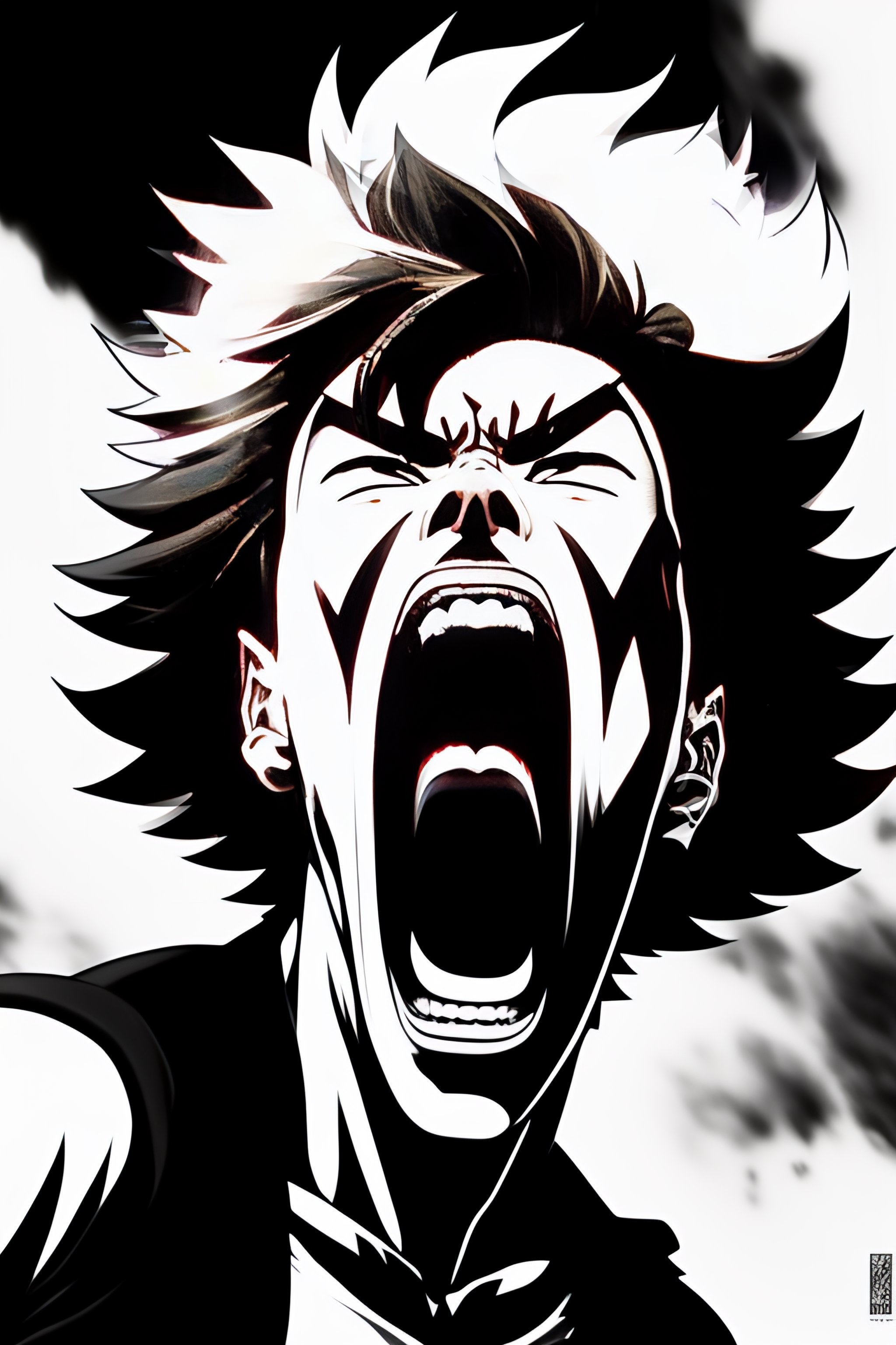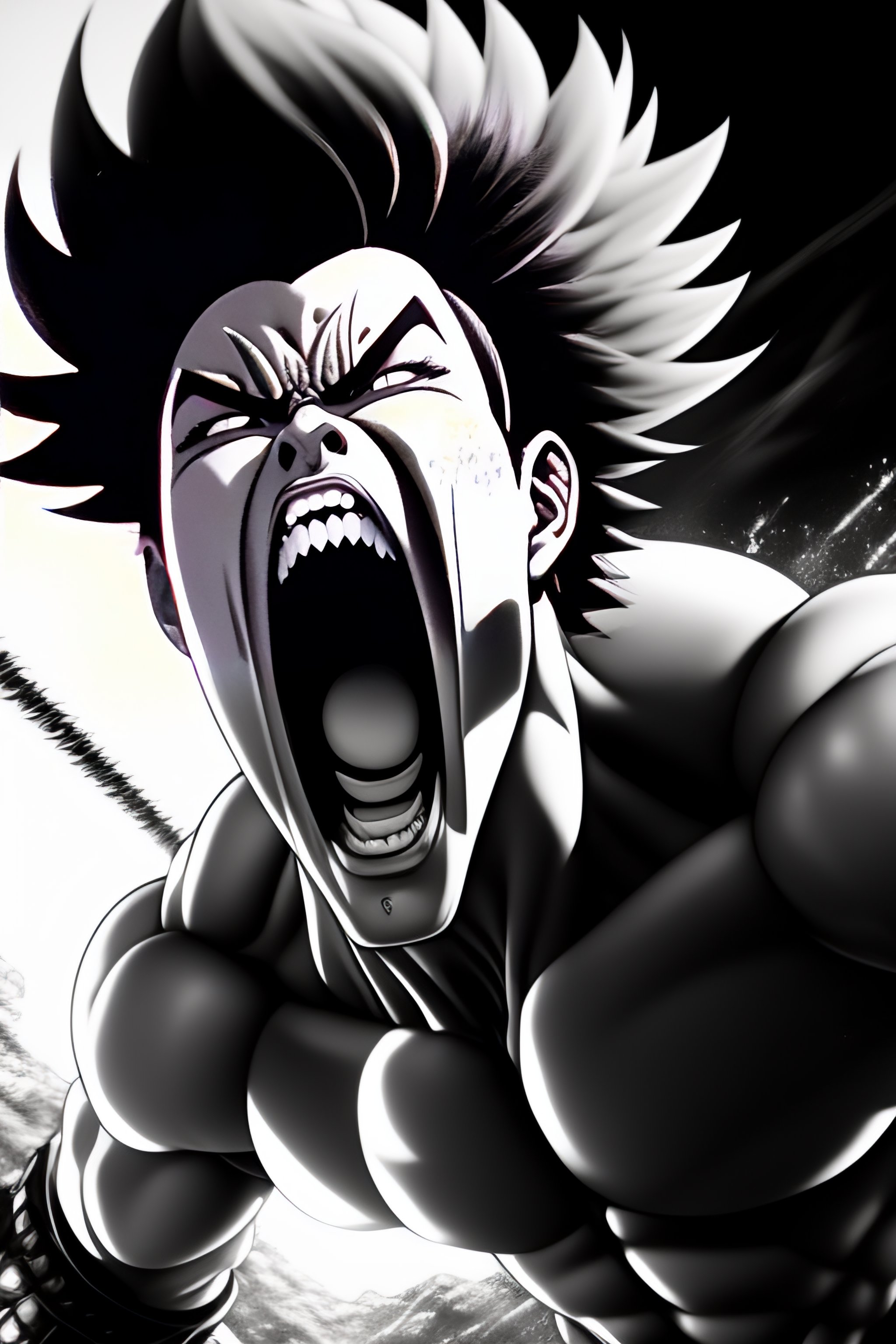 An insanely strong anime character going berserk and screaming black and white picture highly detailed