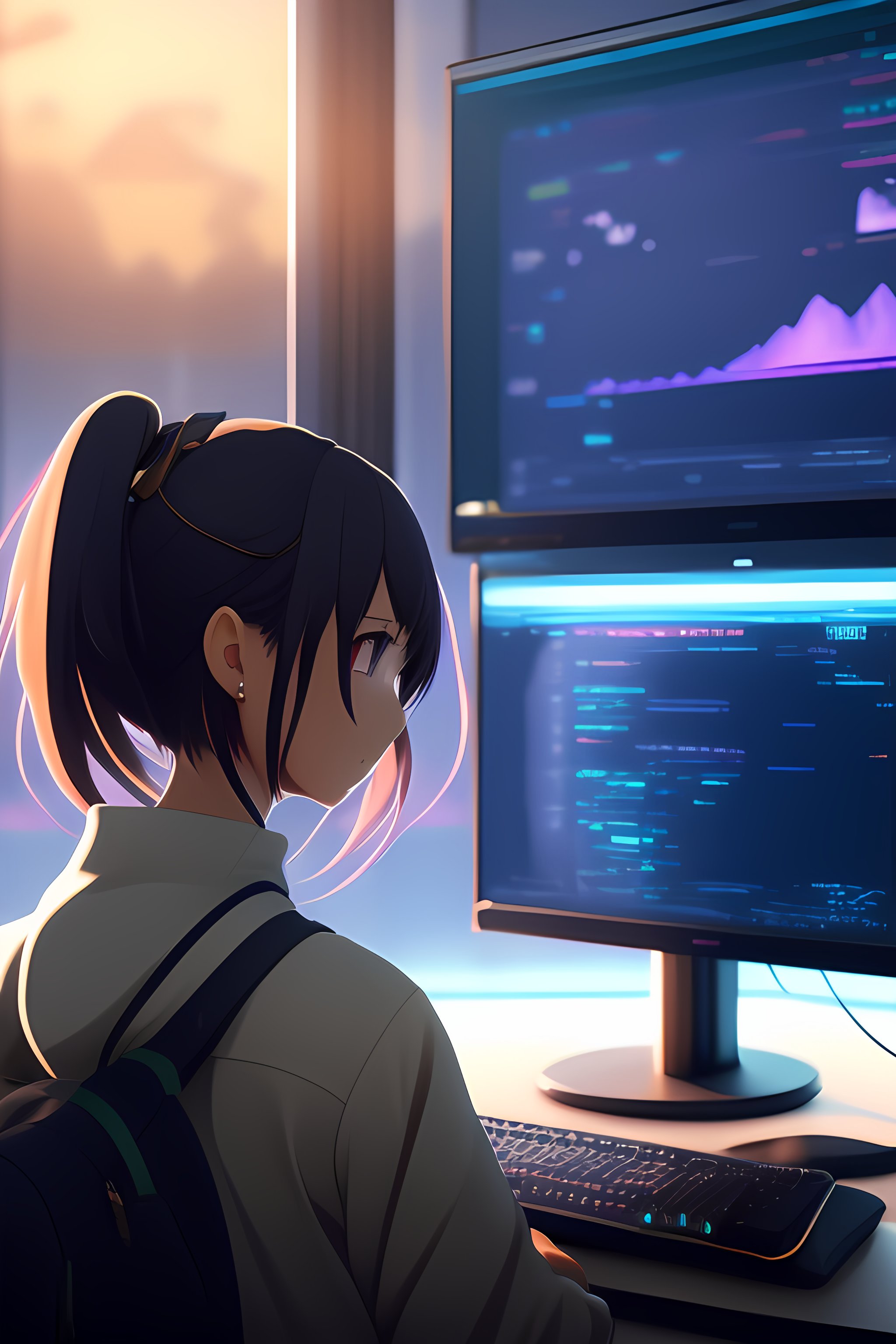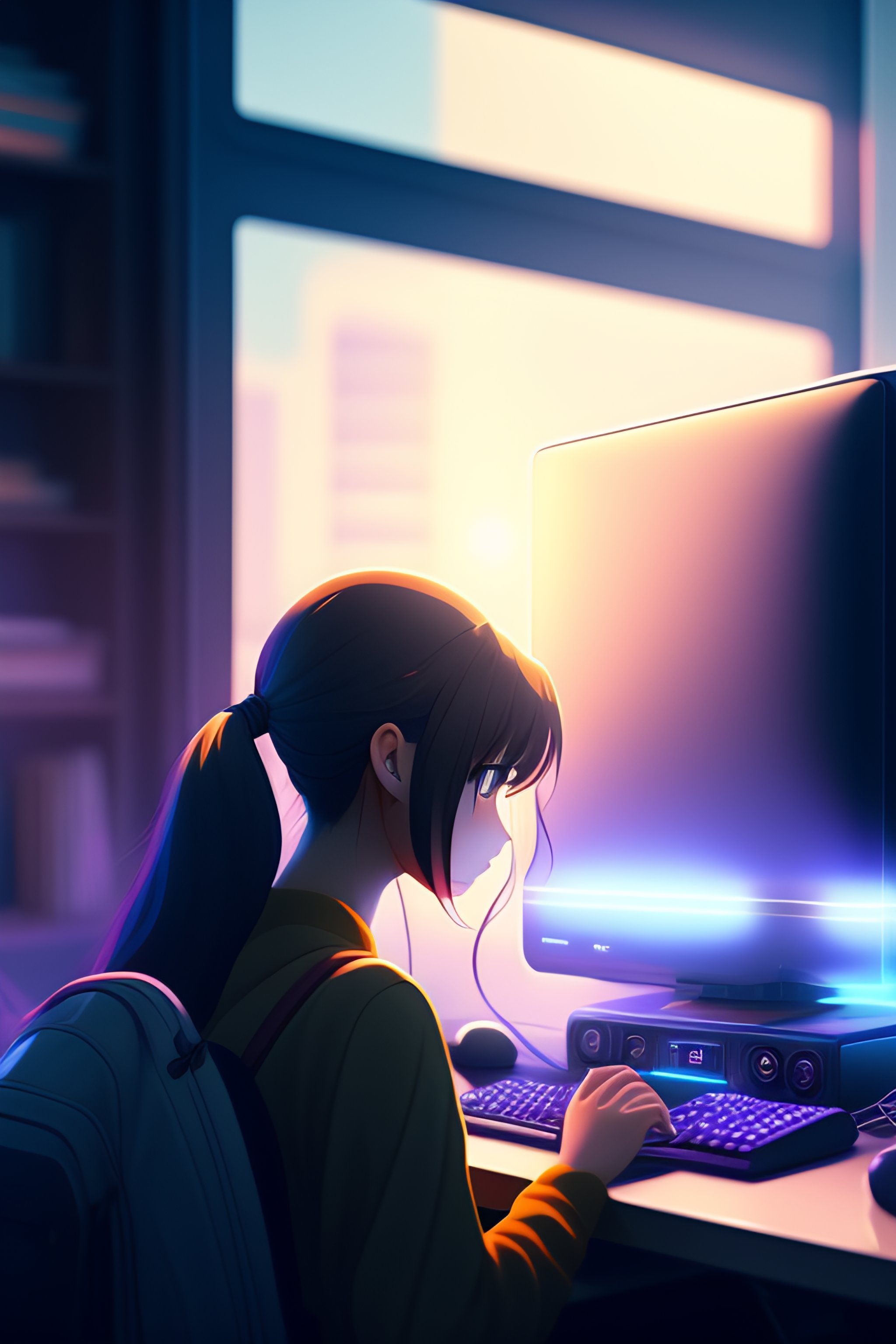 Create a high resolution artwork of anime girl is programming at a computer in a room full of gadgets, web developer, by makoto shinkai and ghibli studio, outlined silhouettes, dramatic lighting, highly detailed, incredible quality, trending on artstation, masterpiece, 8k