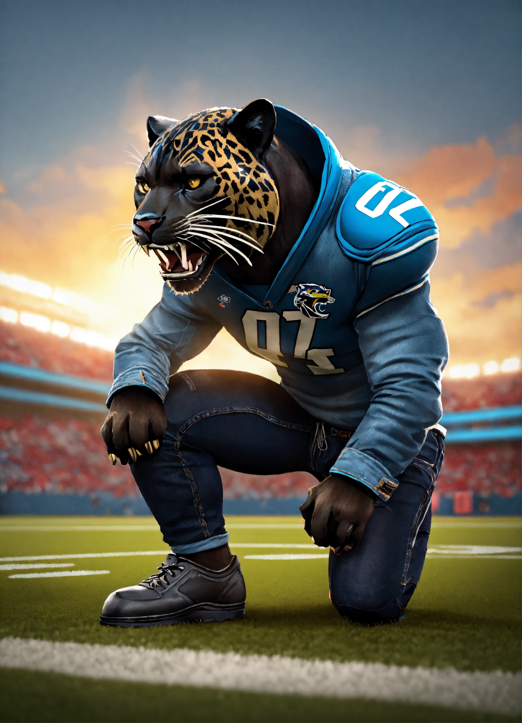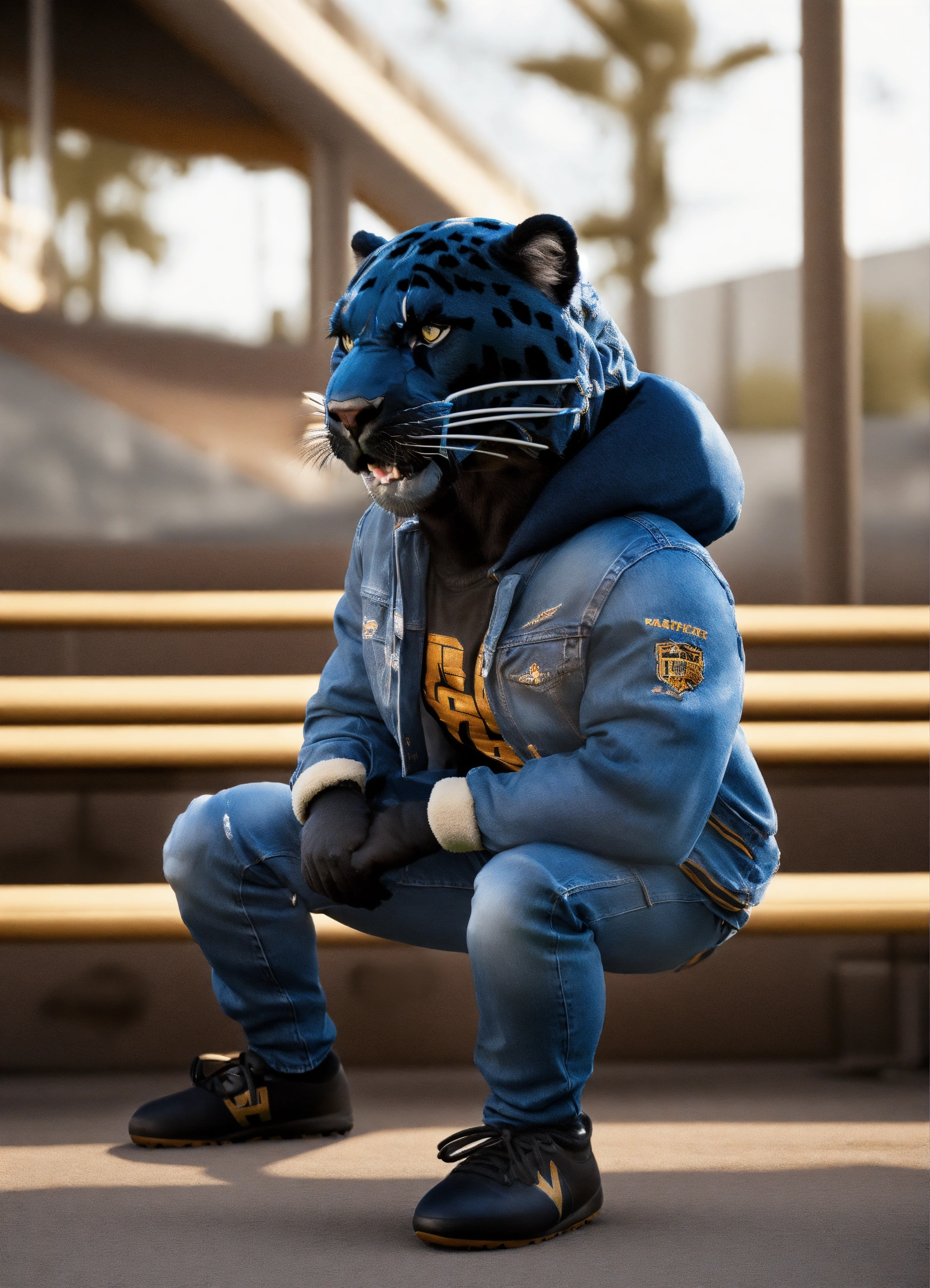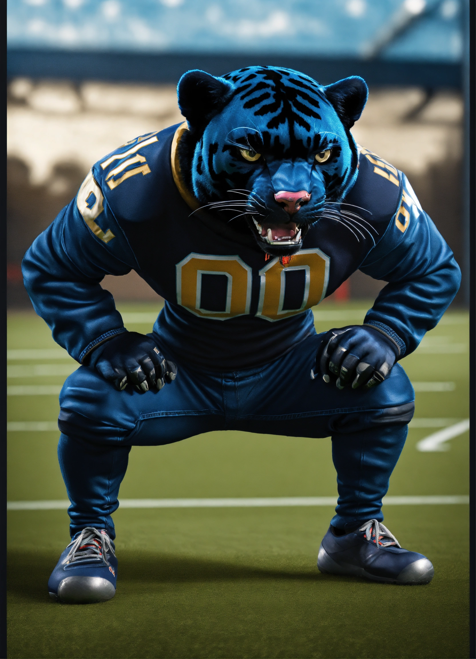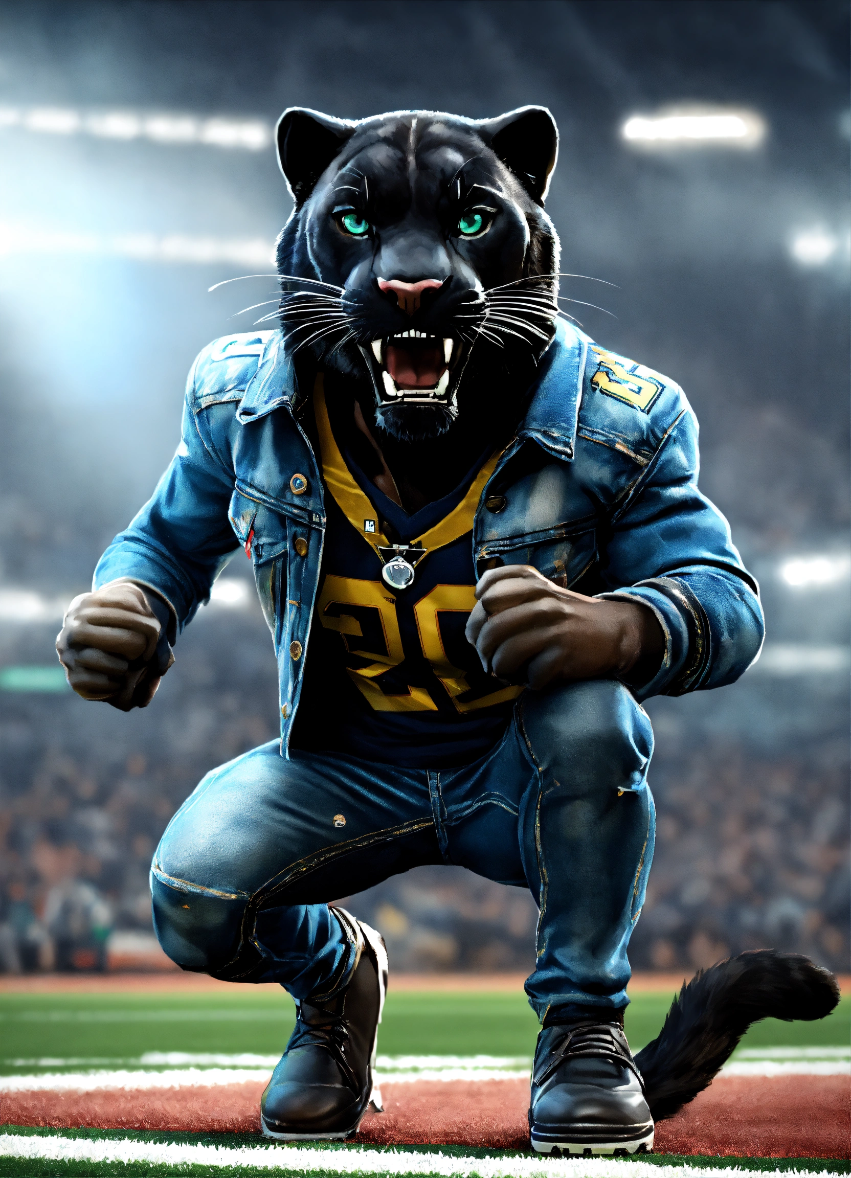 Cute aggressive panther football mascot wearing jean jacket full body squatting down hd realistic 8k