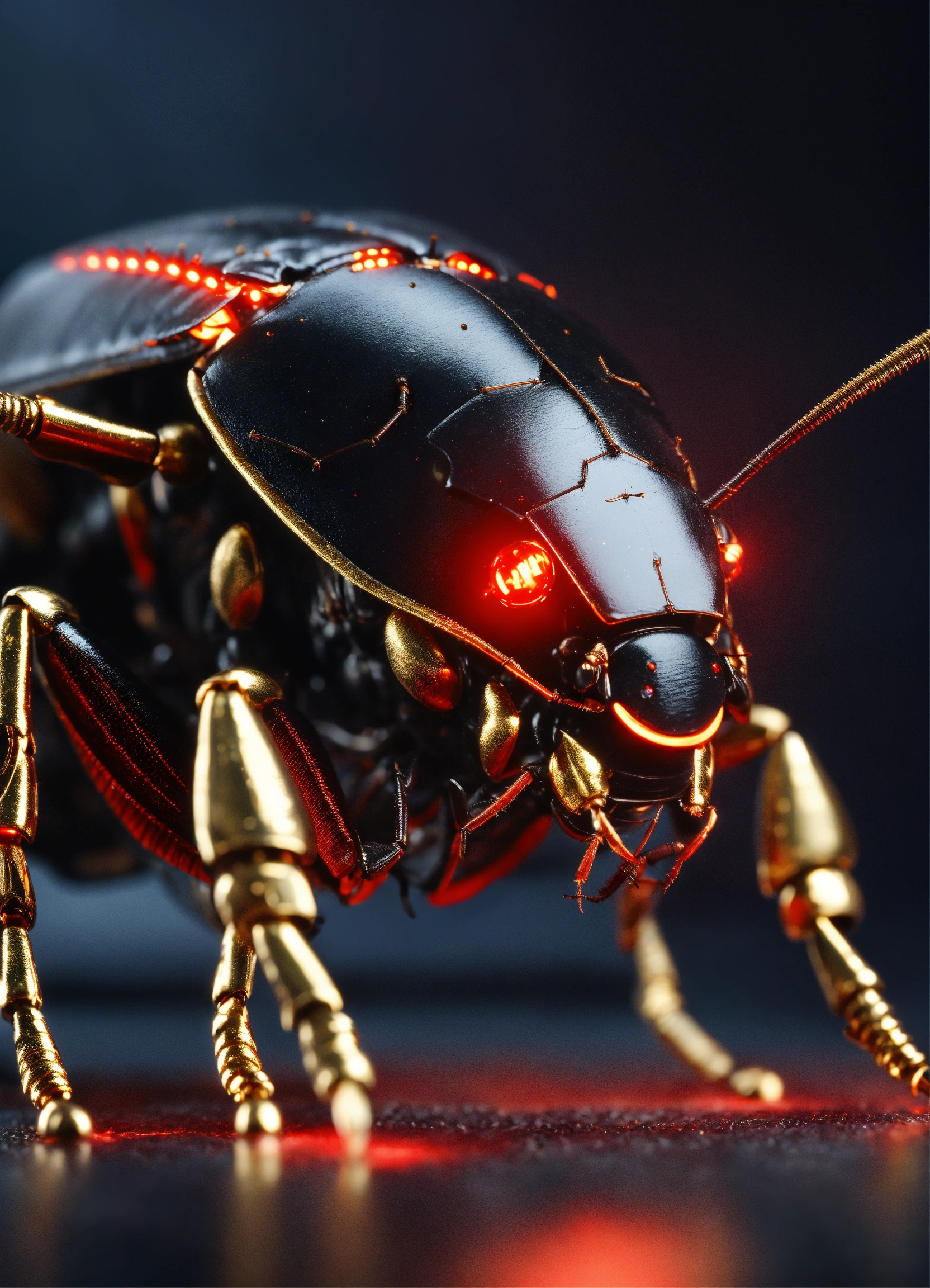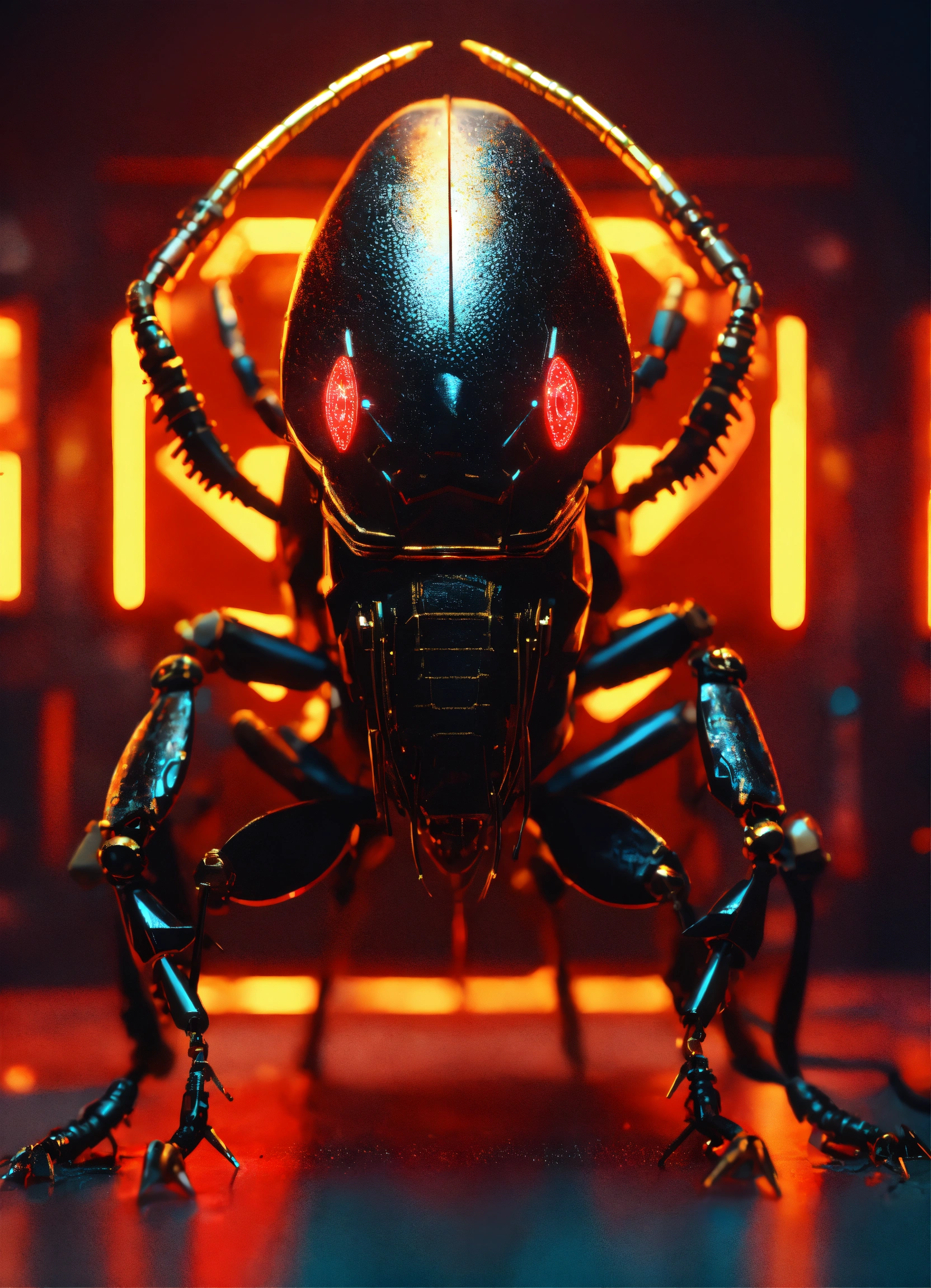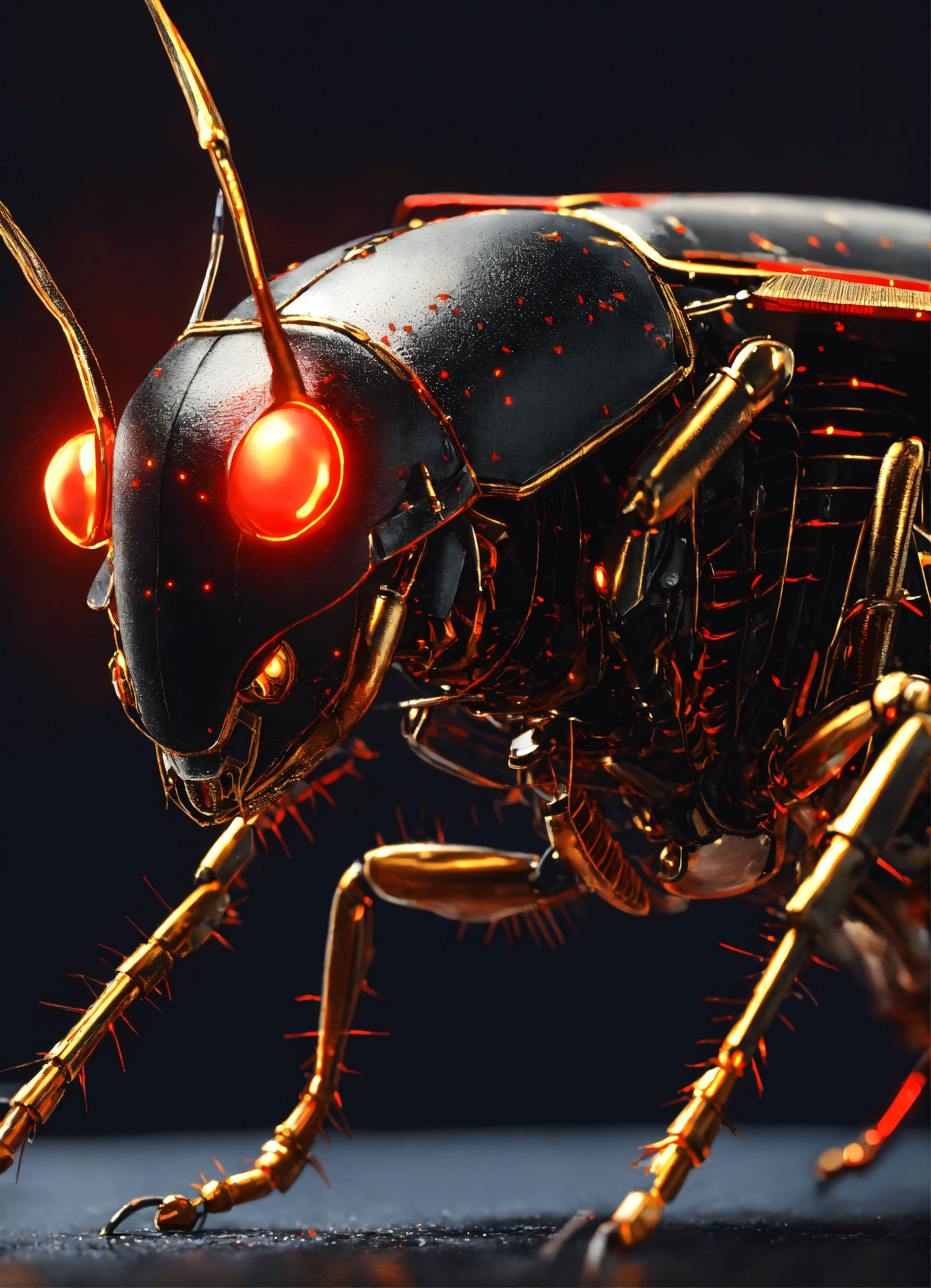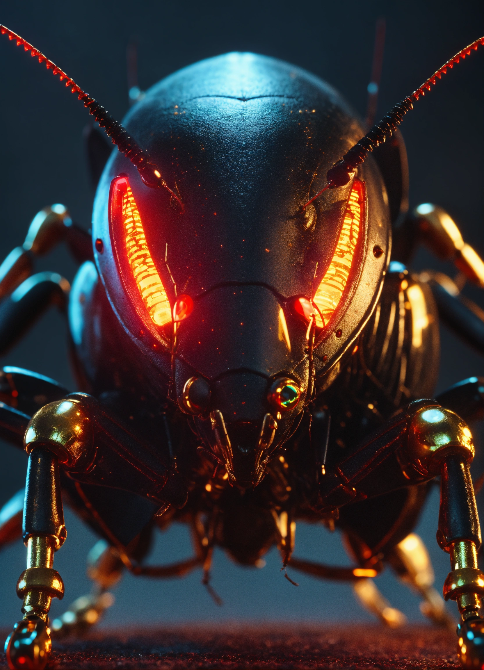 Zoom out of black cockroach faced humanoid with red glowing eyes, gold circuitry. shooting electricity from his powerful antenna attacking, realistic, 8k