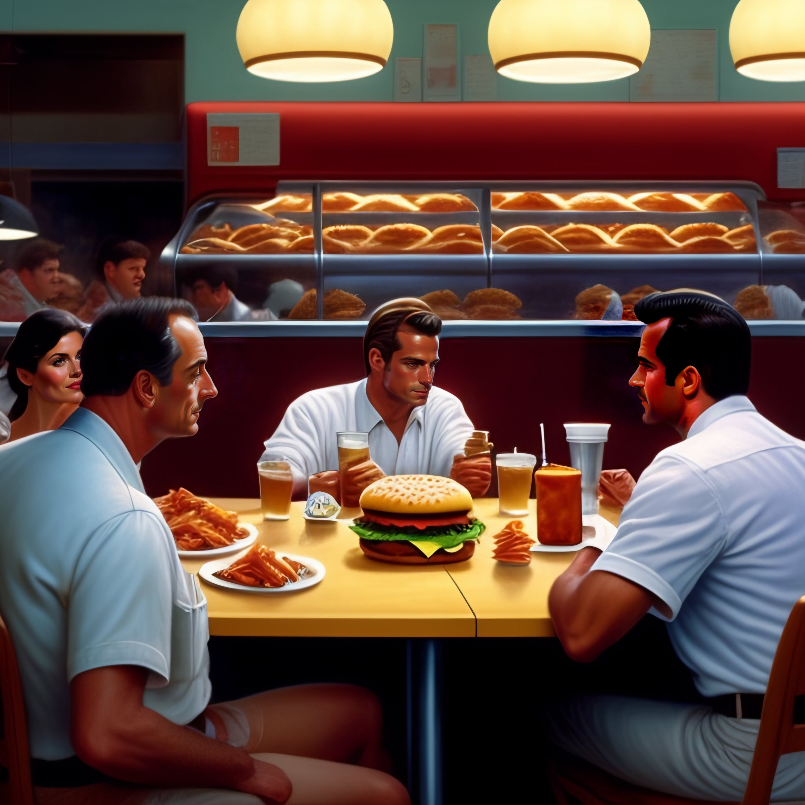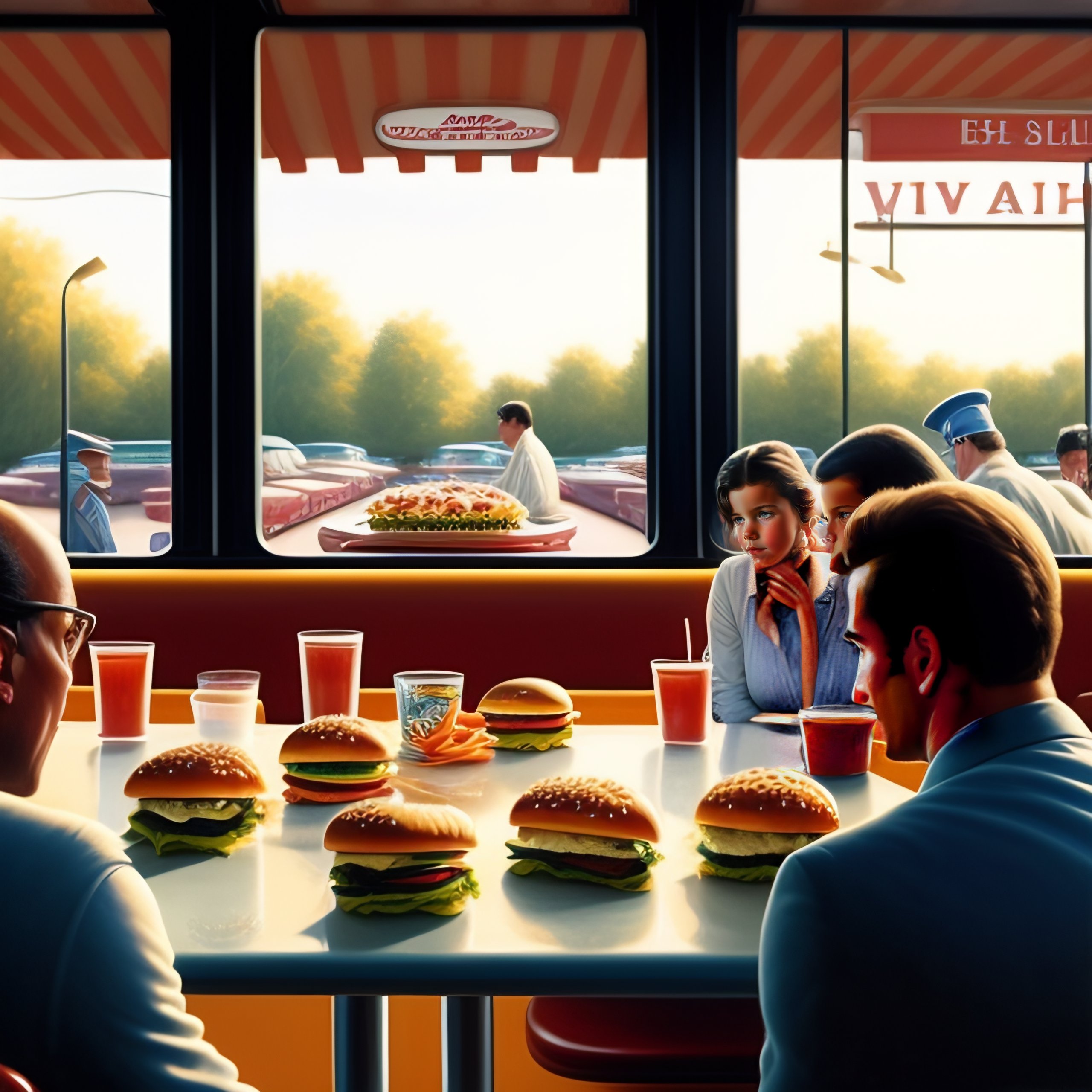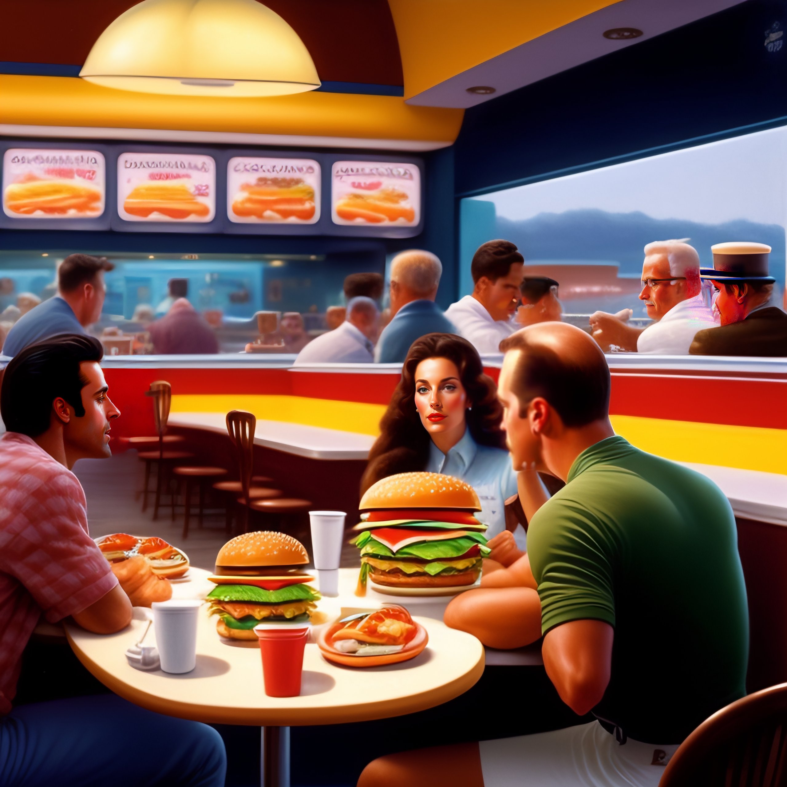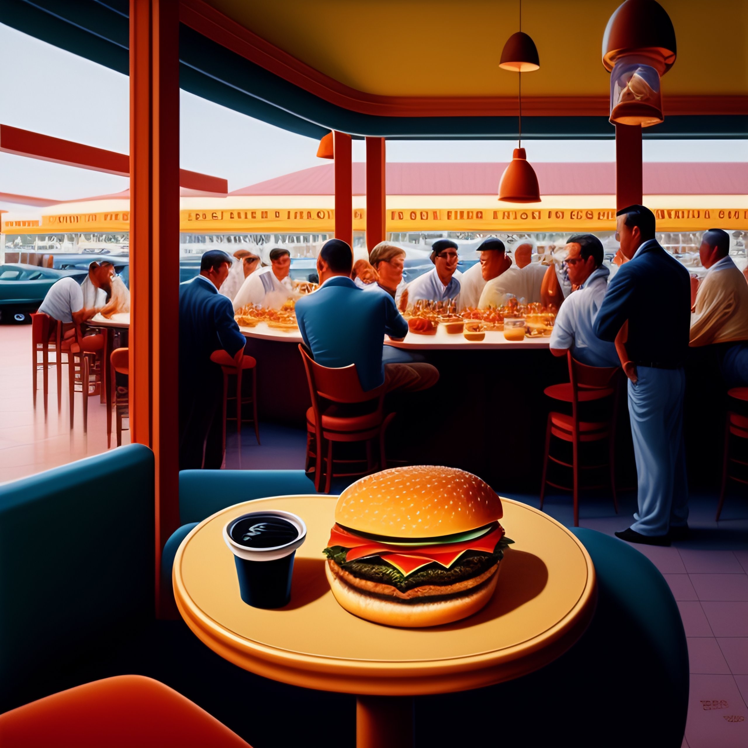 A realistic view inside of a fast food restaurant, with people eating burgers, french fries at the table and others placing an order while standing up in style of wayne thiebaud and bosch