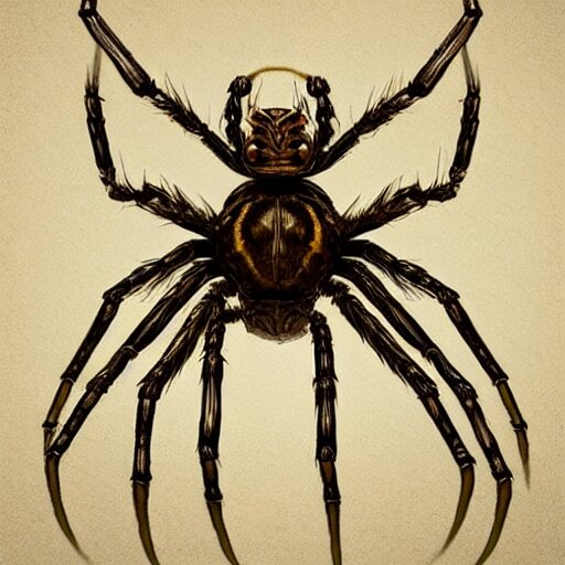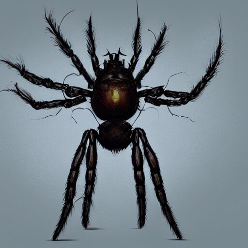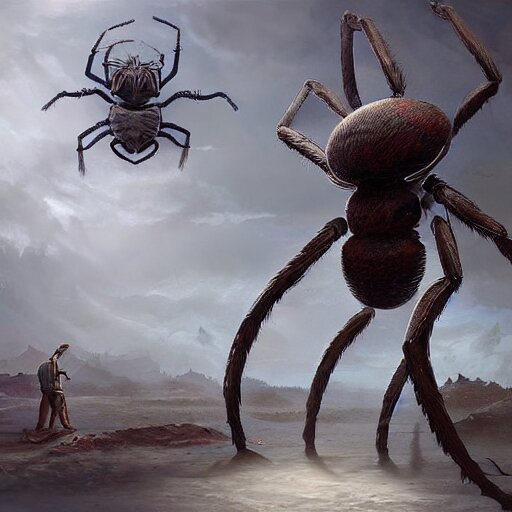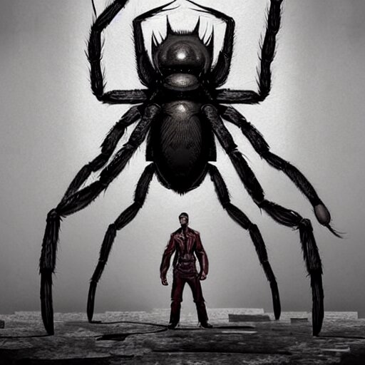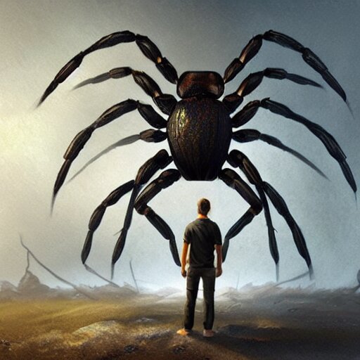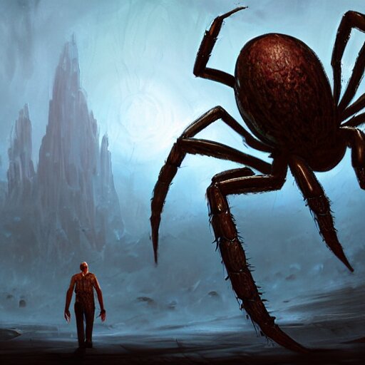 A man standing in front of a giant spider, concept art by jason a. engle, cgsociety, fantasy art, concept art, lovecraftian, apocalypse art.