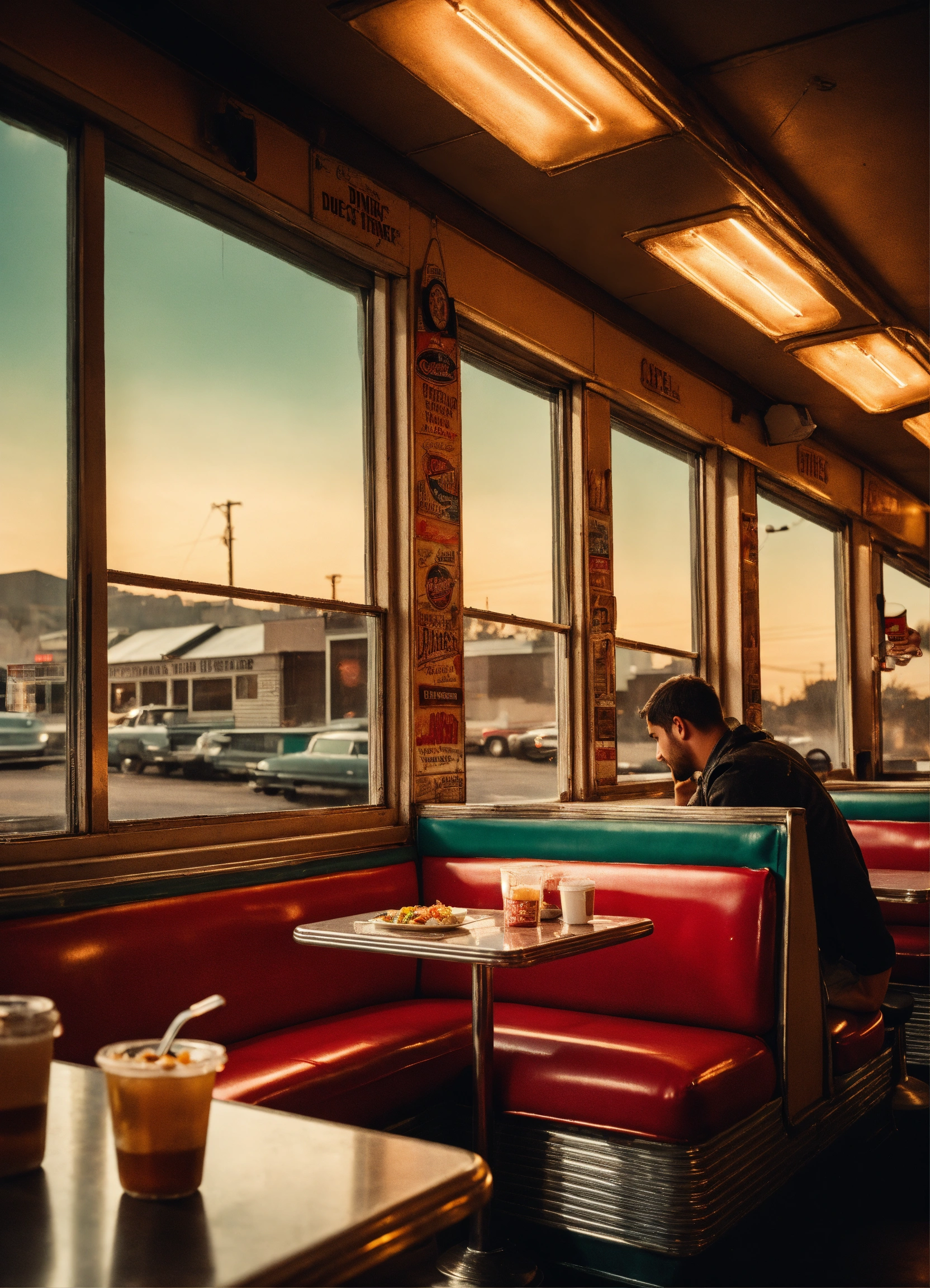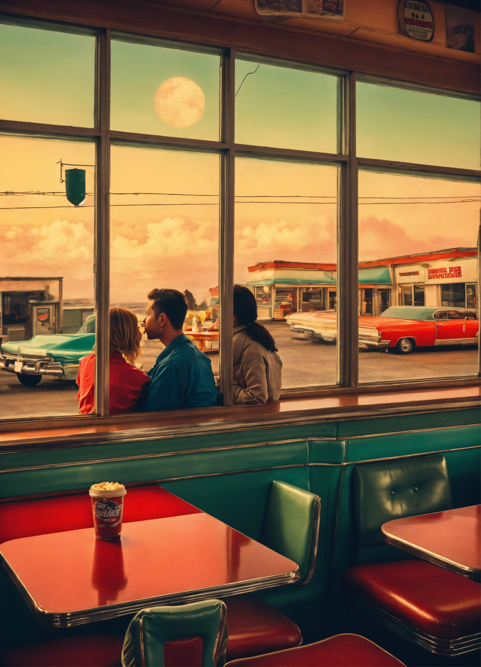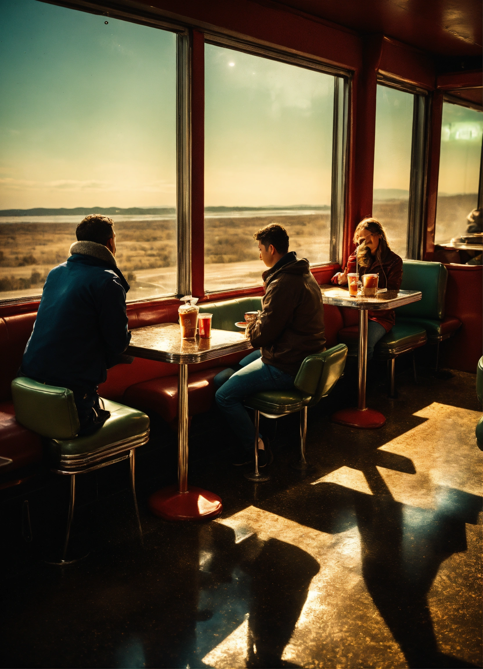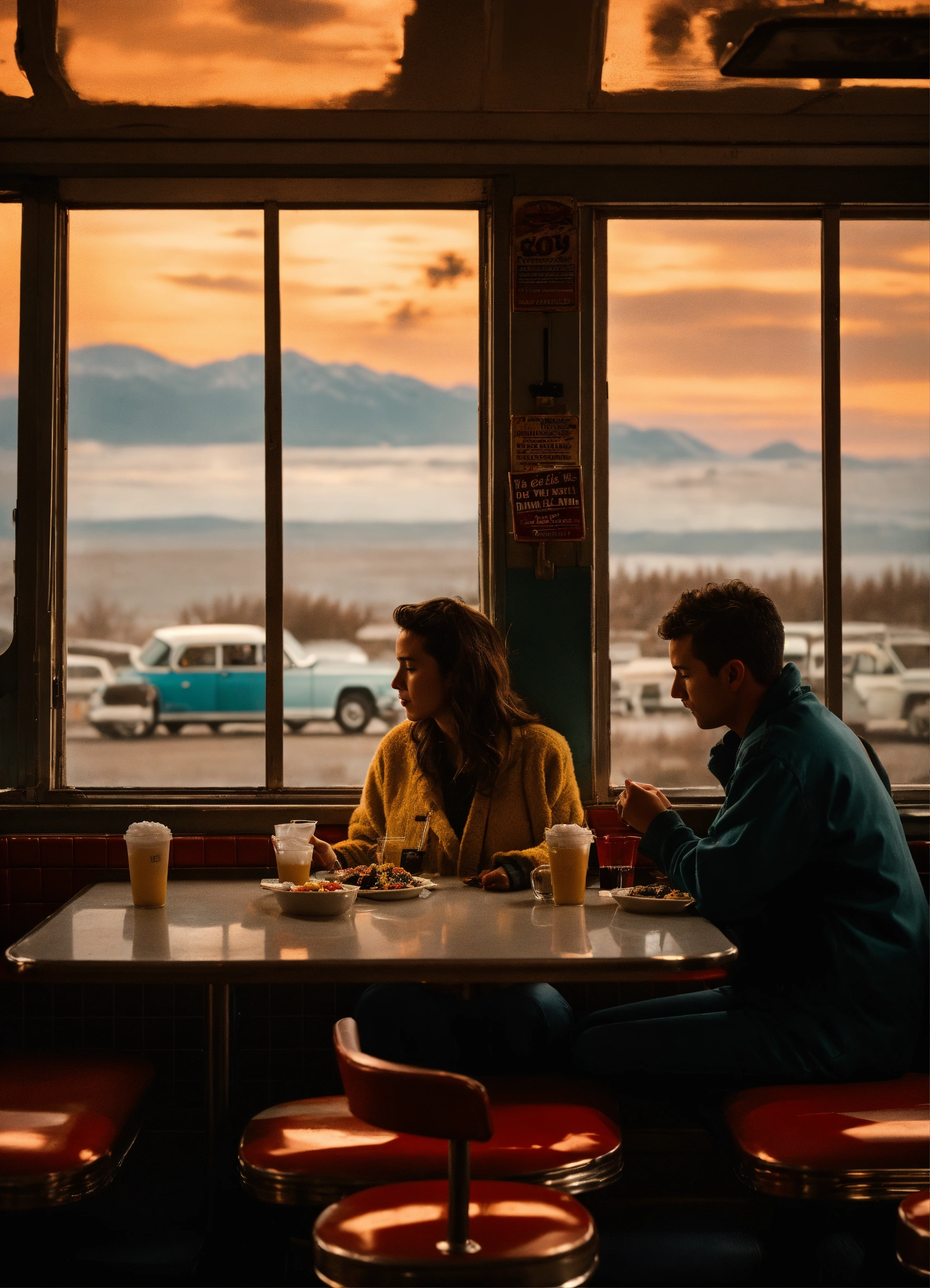 Two people eating at a nostalgic diner looking out the window at the end of the world
