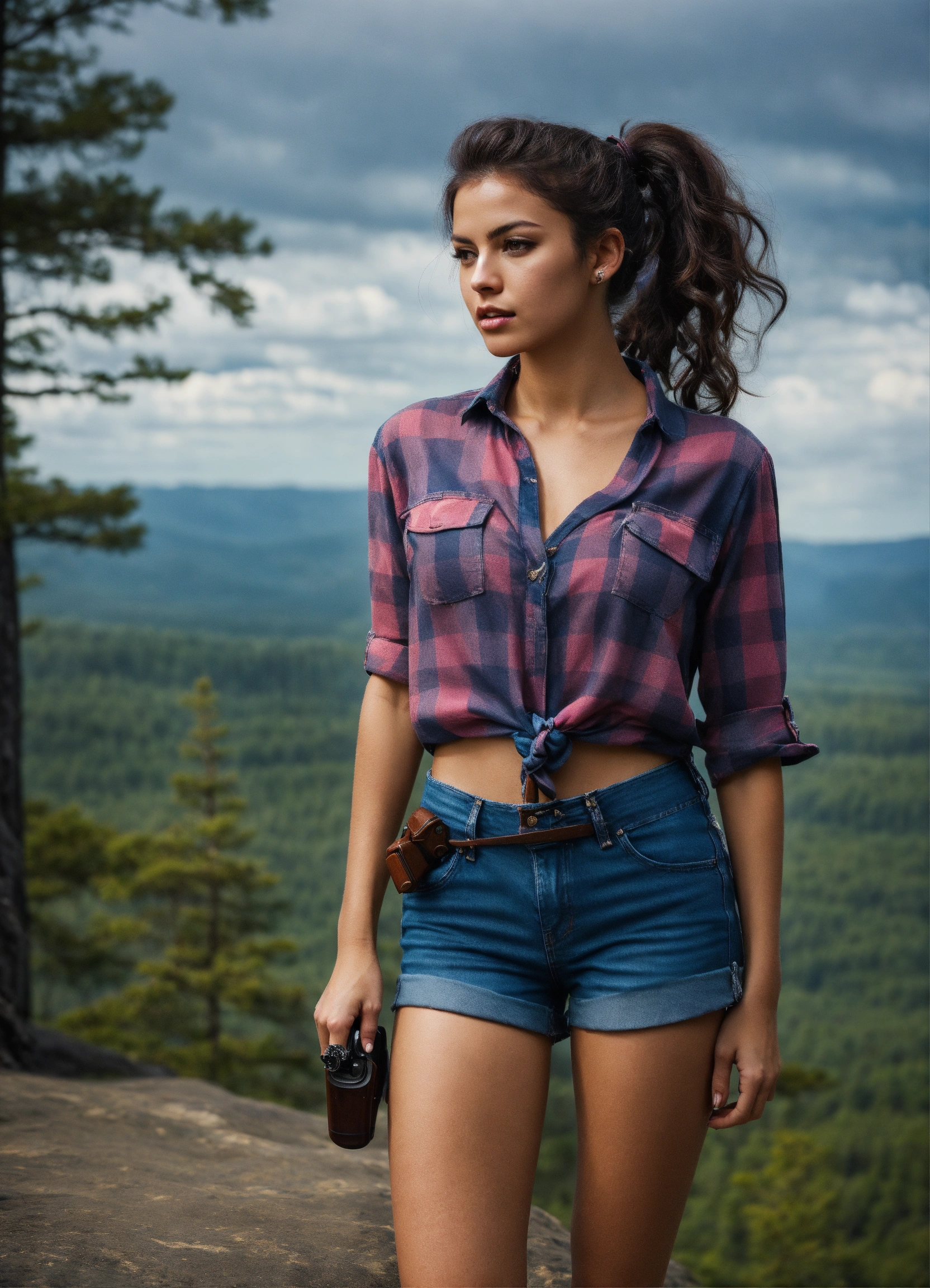 Beautiful hot woman with a ponytail, with dark curly hair, with brown eyes, in a checkered shirt tied under the chest with rolled up sleeves, in short denim shorts on the edge of an abyss above the forest on a cliff with a pistol aiming