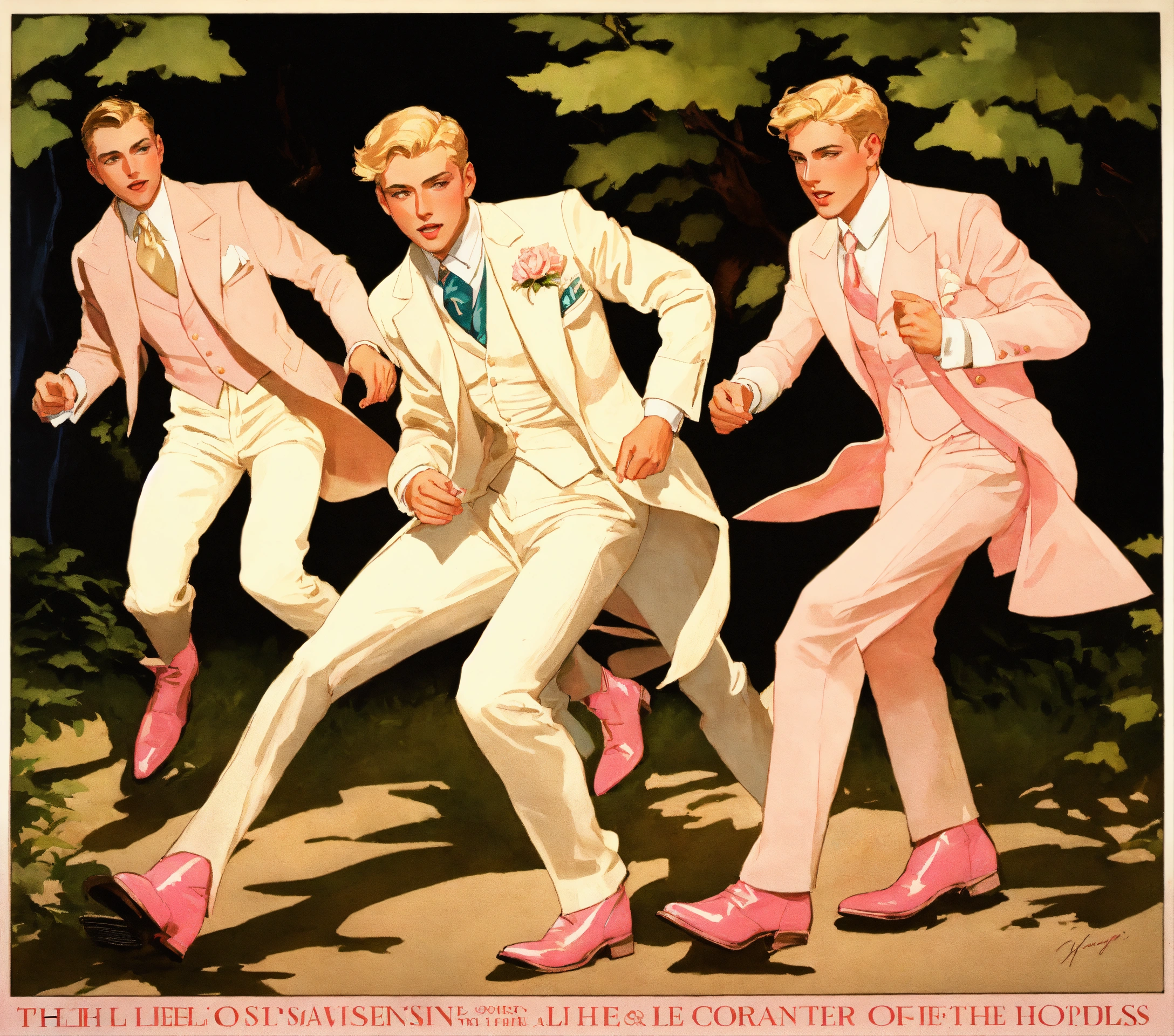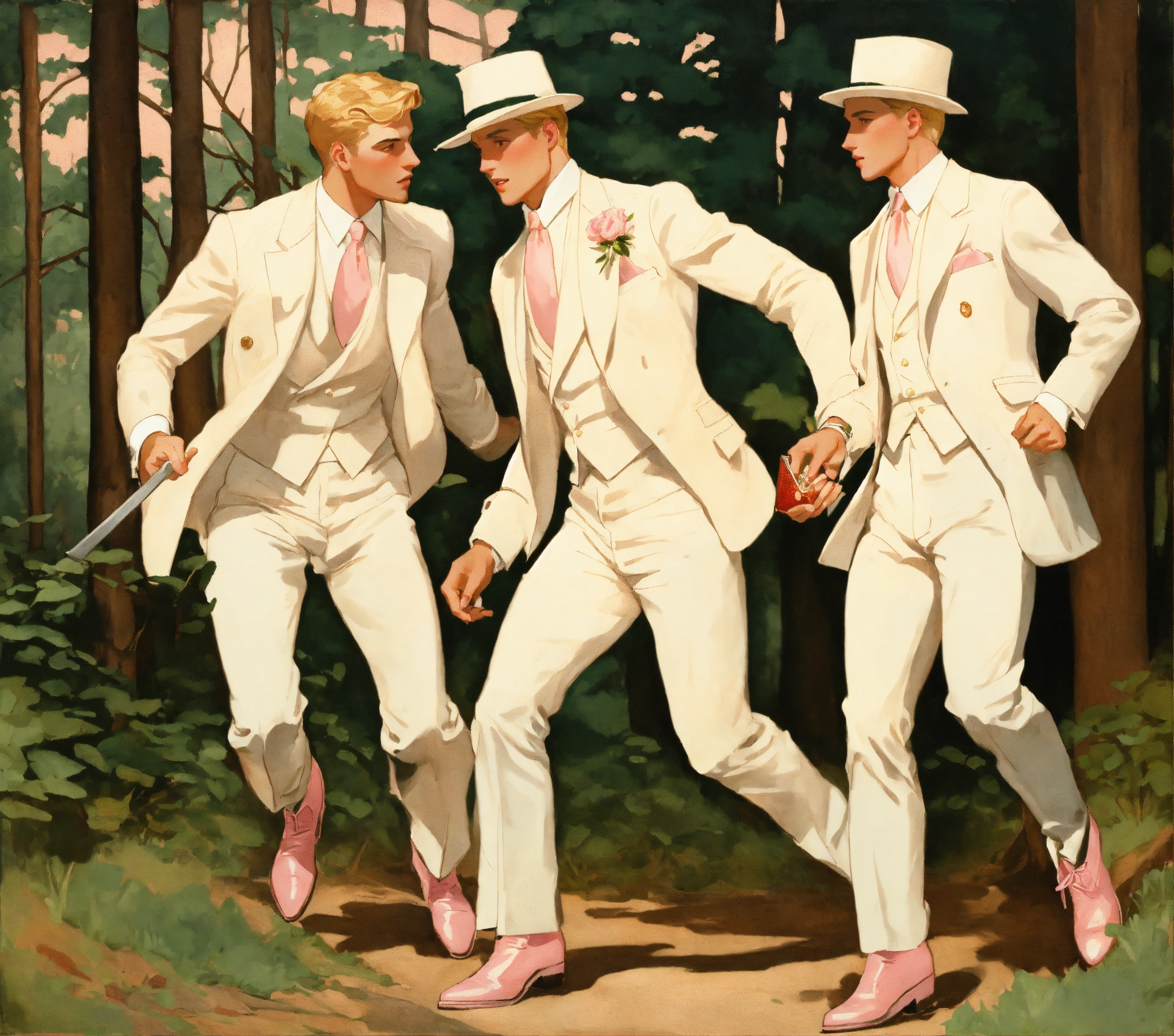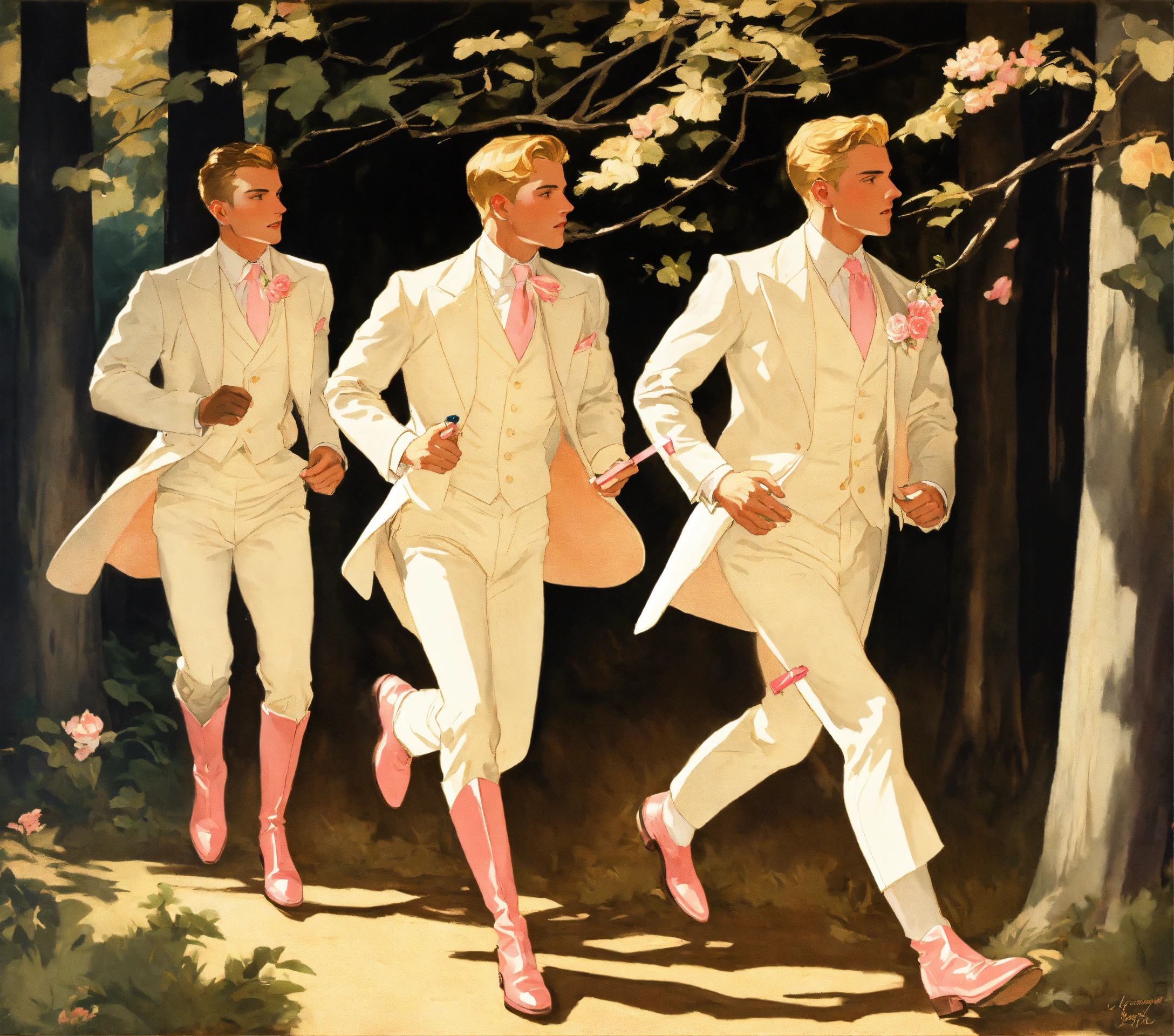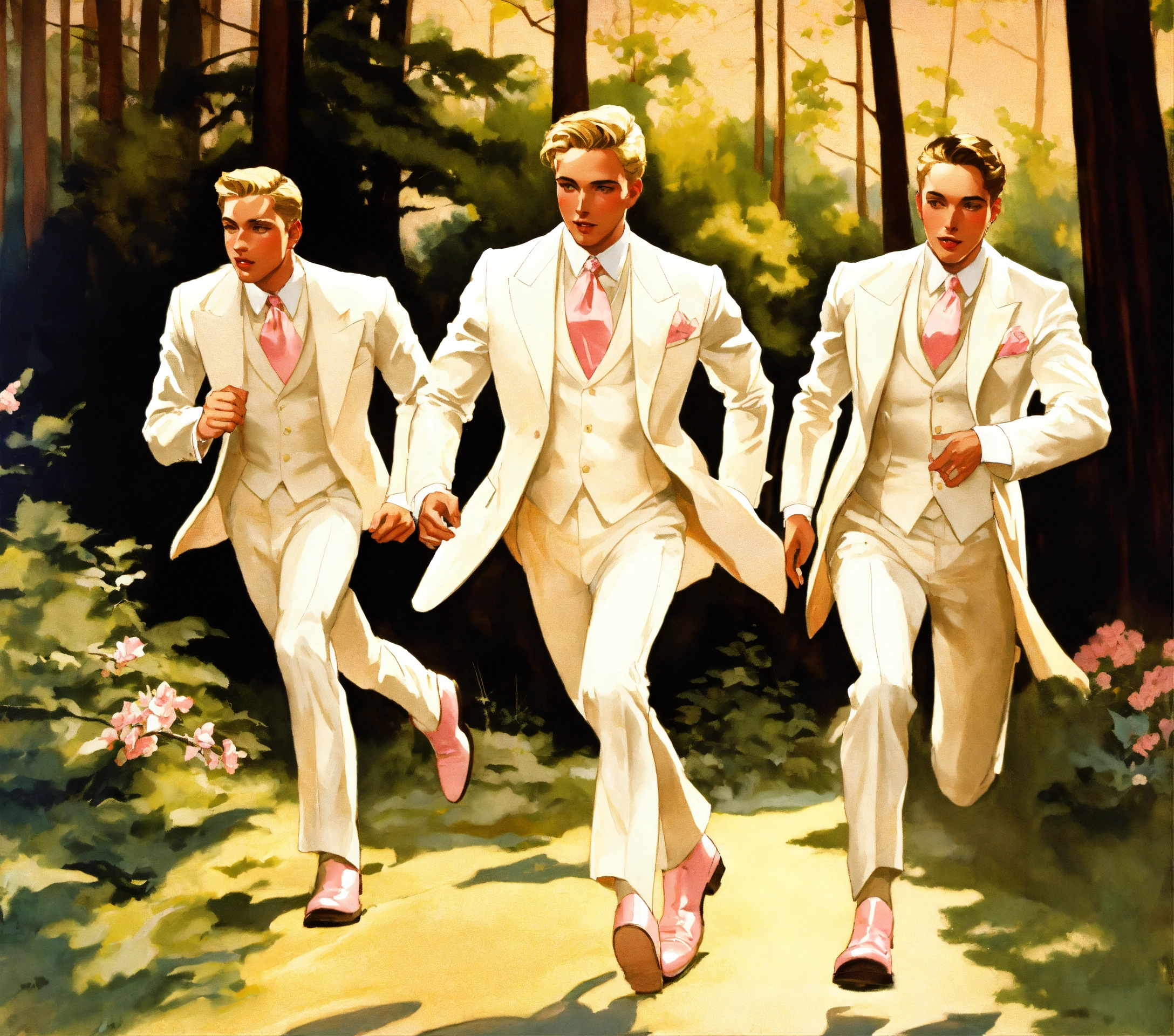 Three blonde gentlemen in white suit, pink tie and light peach leather boots chasing a dear in the forest, leyendecker style