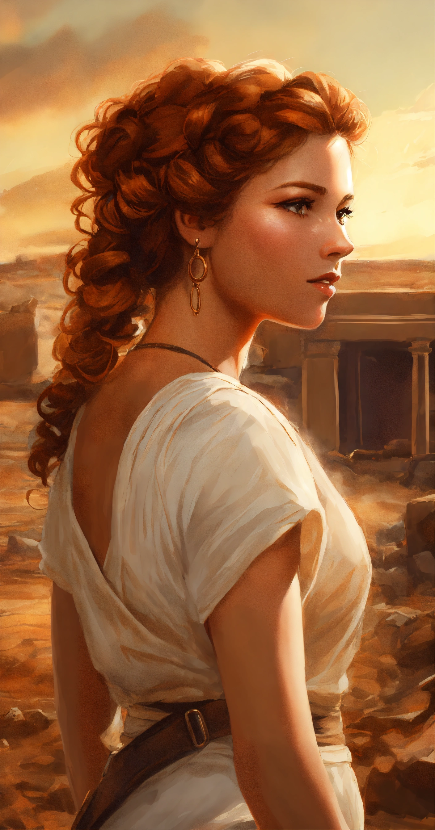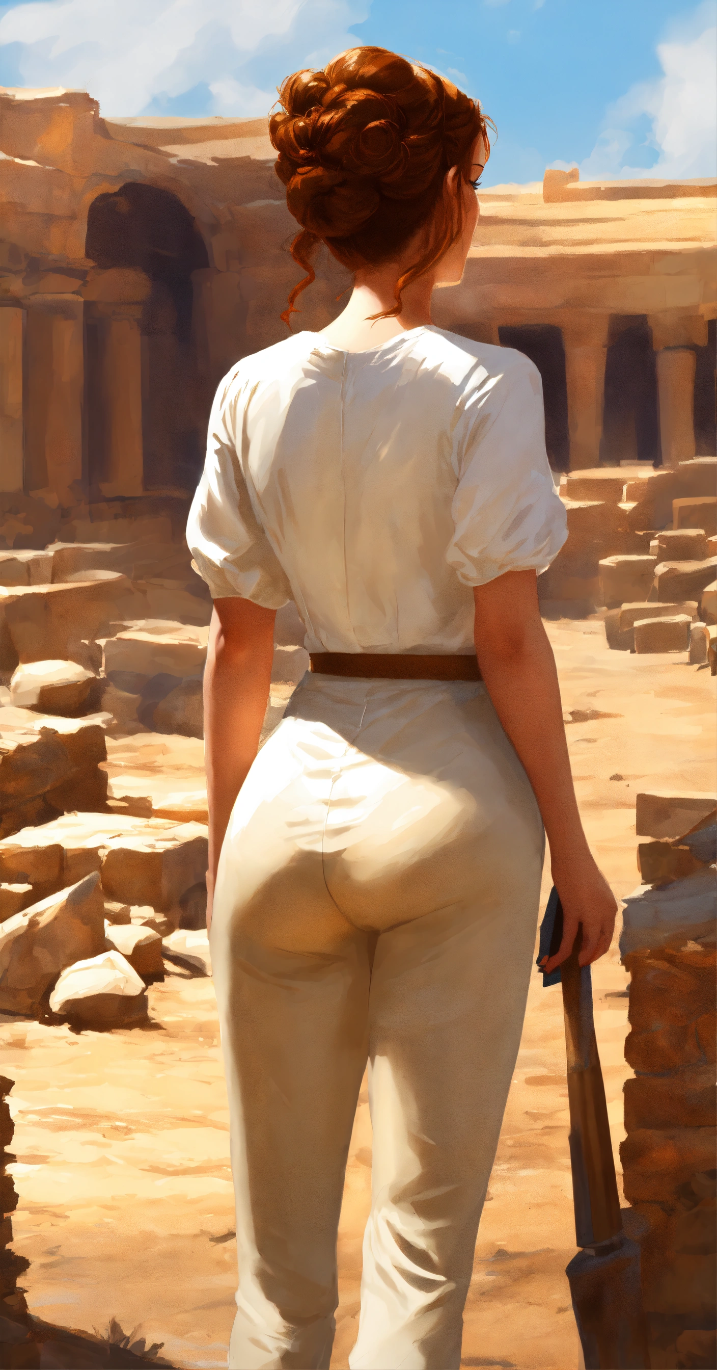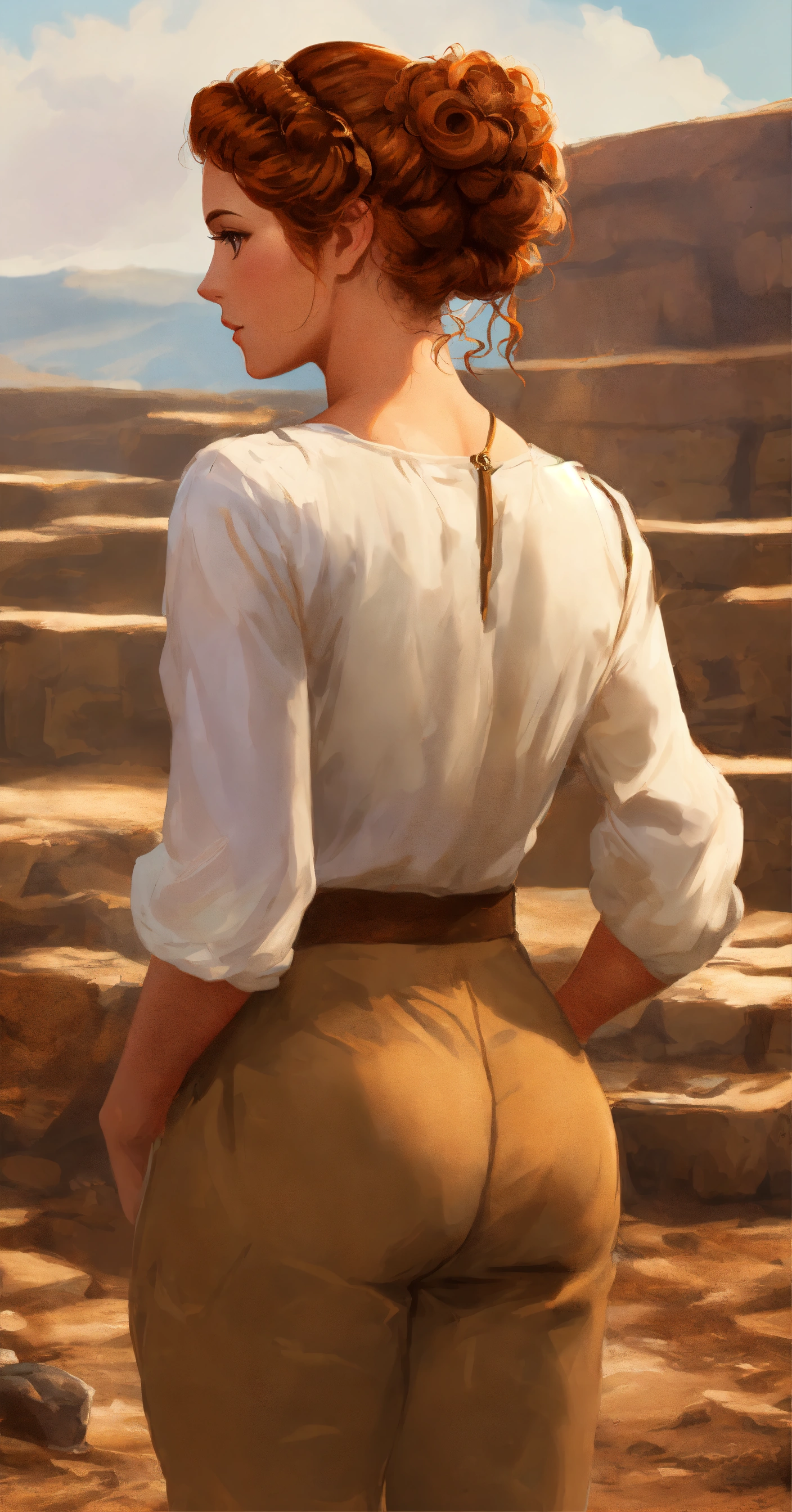 Digital art portrait rear view of a beautiful, rich british aristocrat woman with ringlet copper hair in an updo, wearing a loose white top and tight tan pants, working at an archaeological dig site.