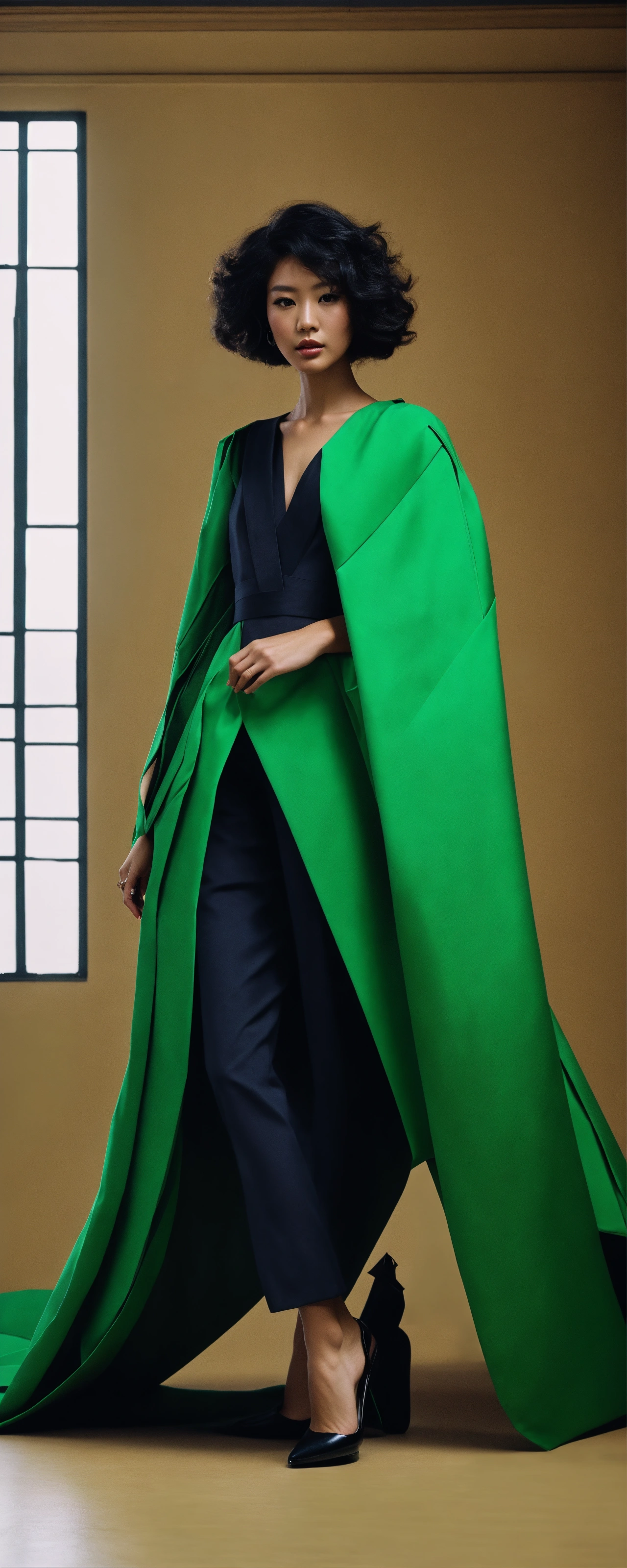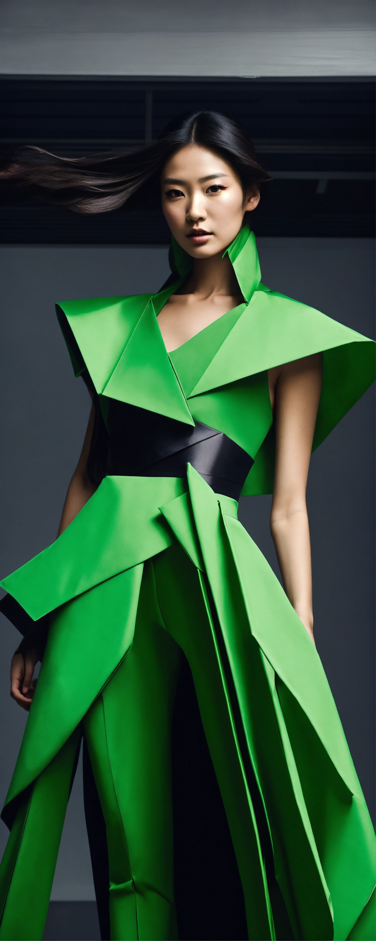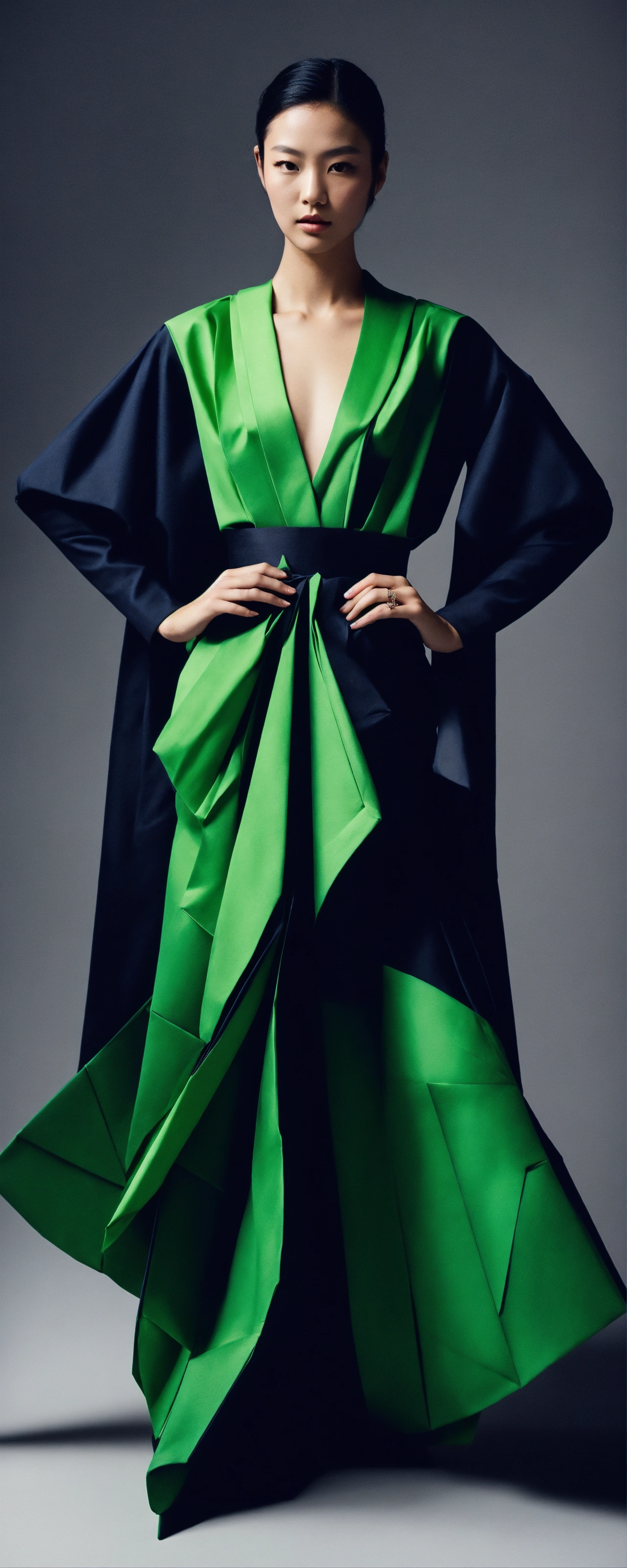Capture a striking low-angle wide shot of a japanese model donning an avant-garde ensemble. the attire, inspired by the precise folds of origami crafted from elegant black and green cotton, boasts a stylish v-neck design. it features a high-low cut that cascades gracefully in the front, culminating in an exquisite train. this high-fashion studio shot, reminiscent of the artistic vision of richard avedon, exudes a captivating allure. origami, studio shot, high-key lighting photo
