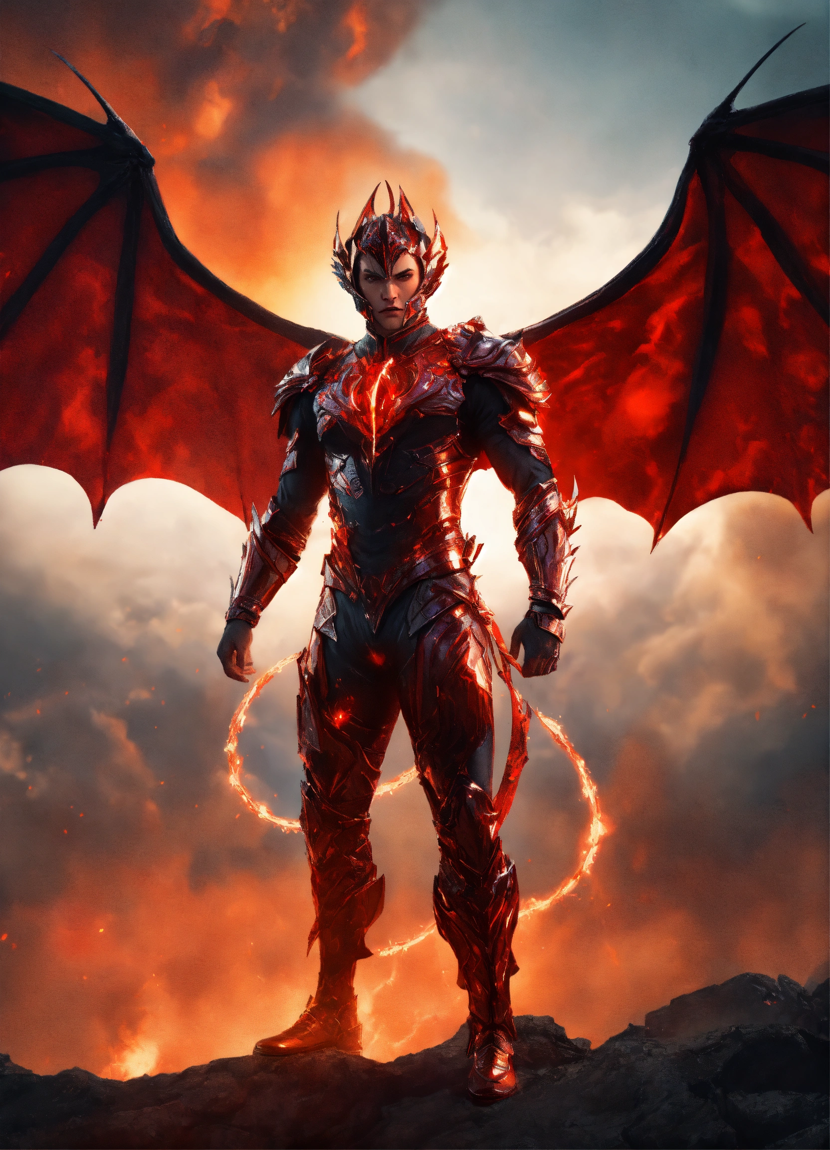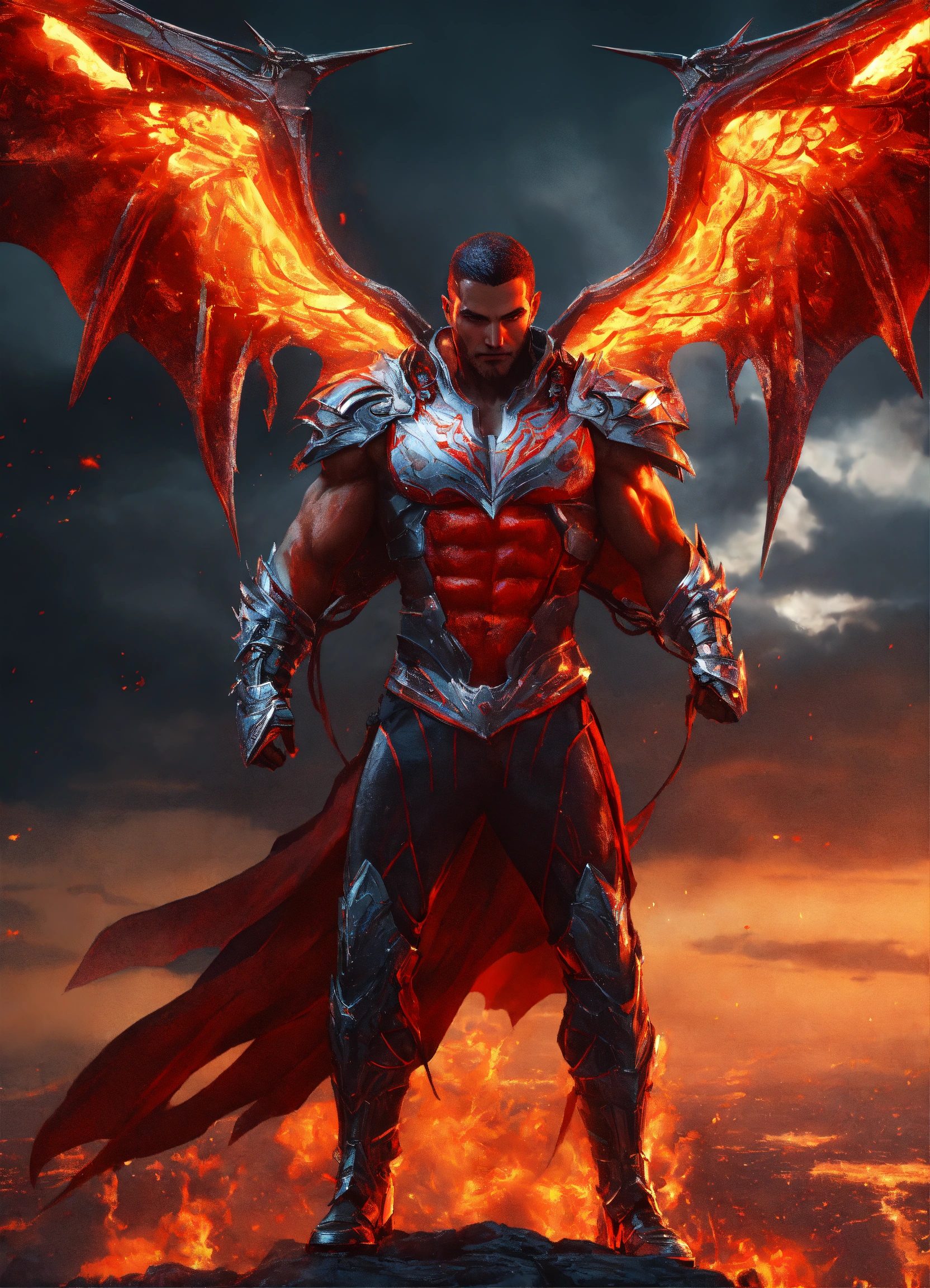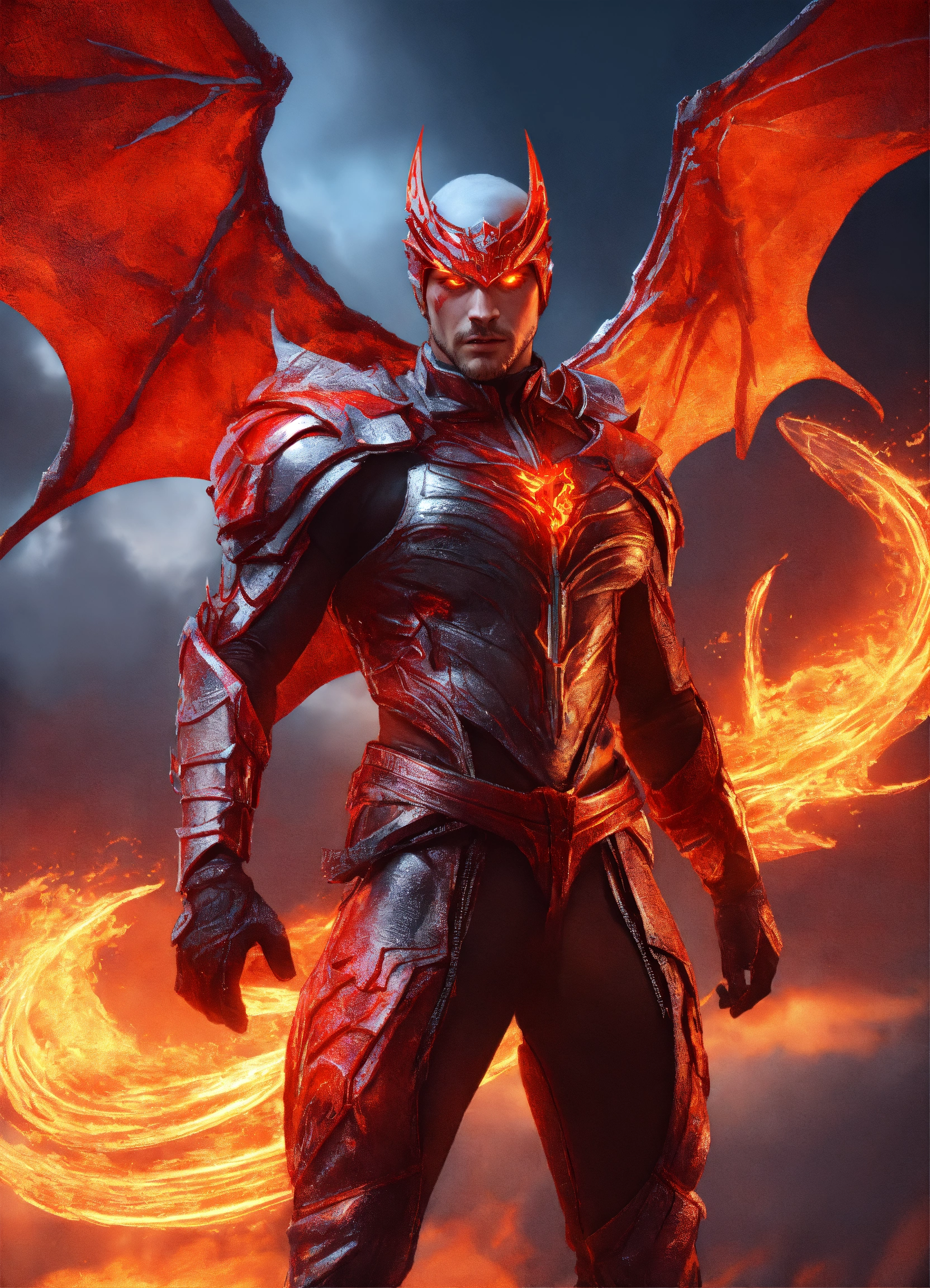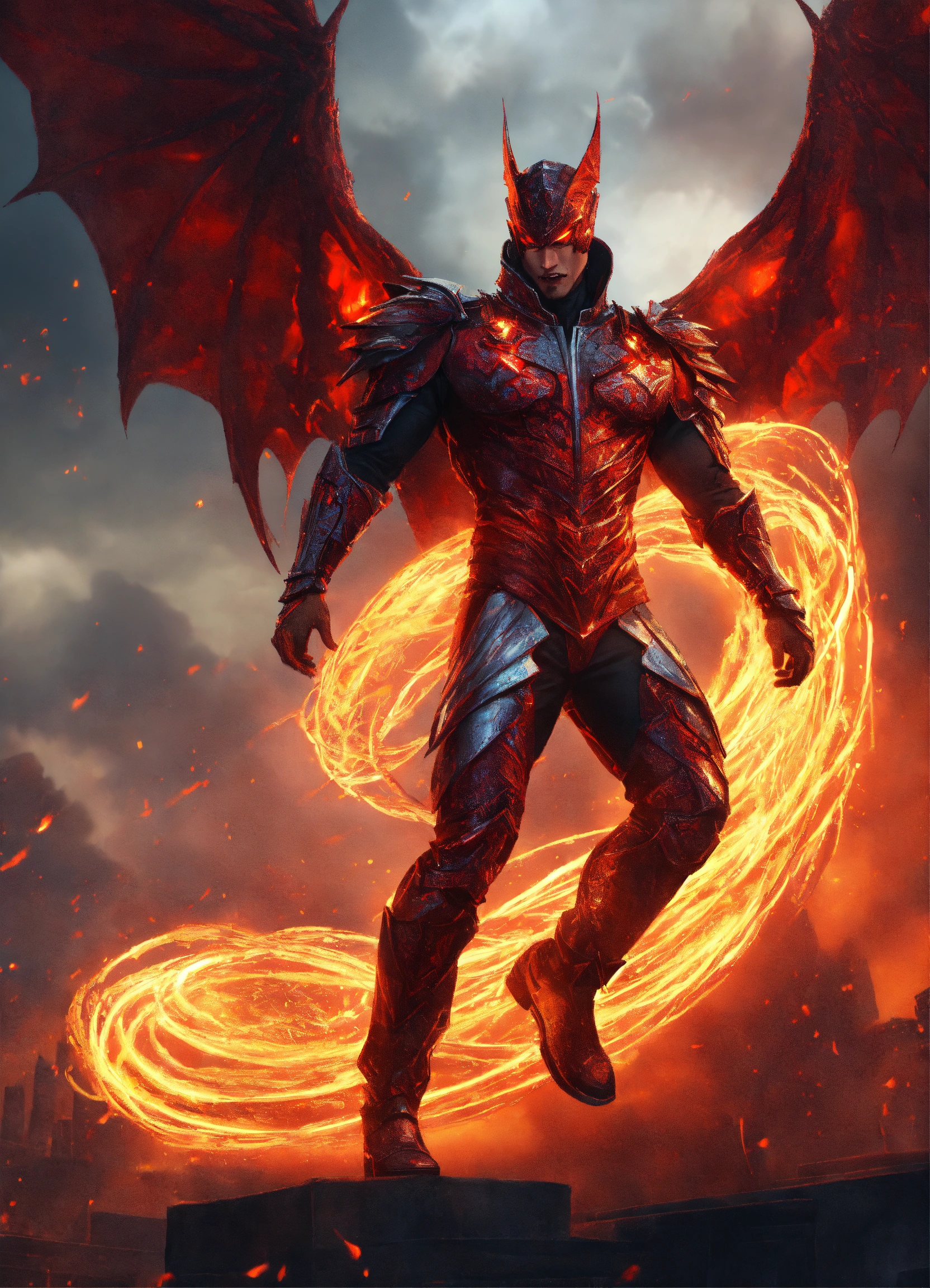 Full body strong muscular evil futuristic vampire man entangled in a red fiery spiral, attractive evil futuristic vampire man with bat wings entangled in a fiery spiral, fully clothed wearing silver warrior armor, floating in the sky, fantasy, high detail, realistic photo, high detail, digital painting, cinematic, stunning, hyper-realistic, sharp focus, high resolution 8k, insanely detailed
