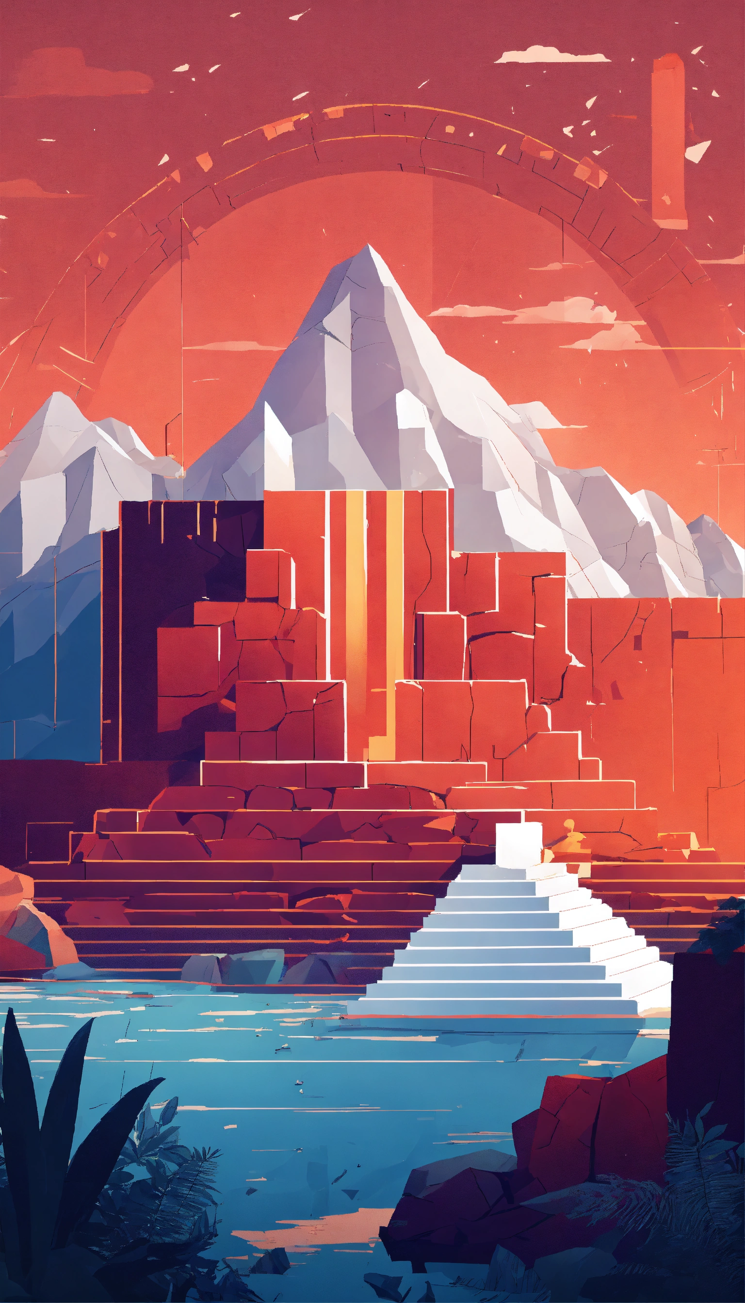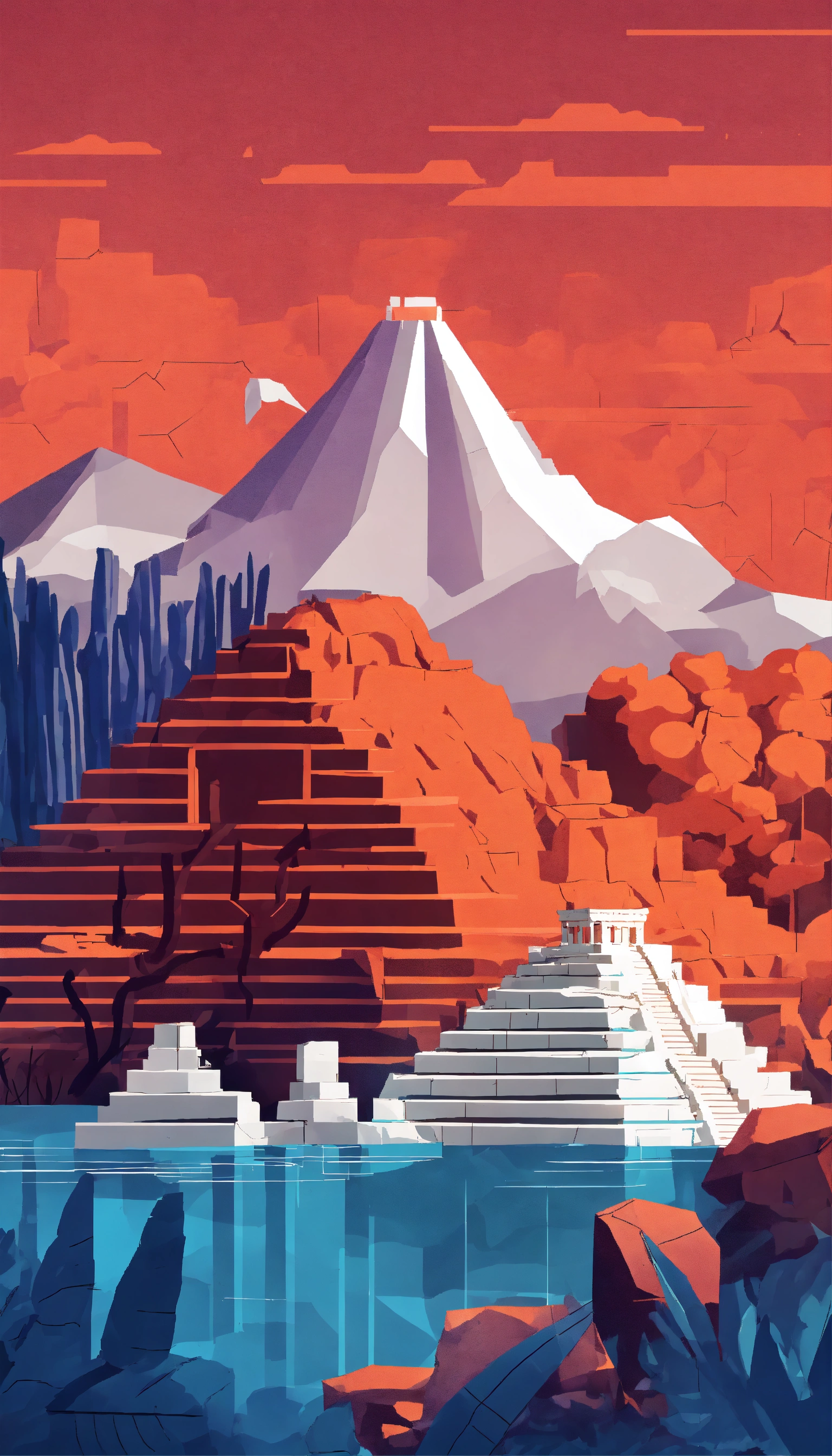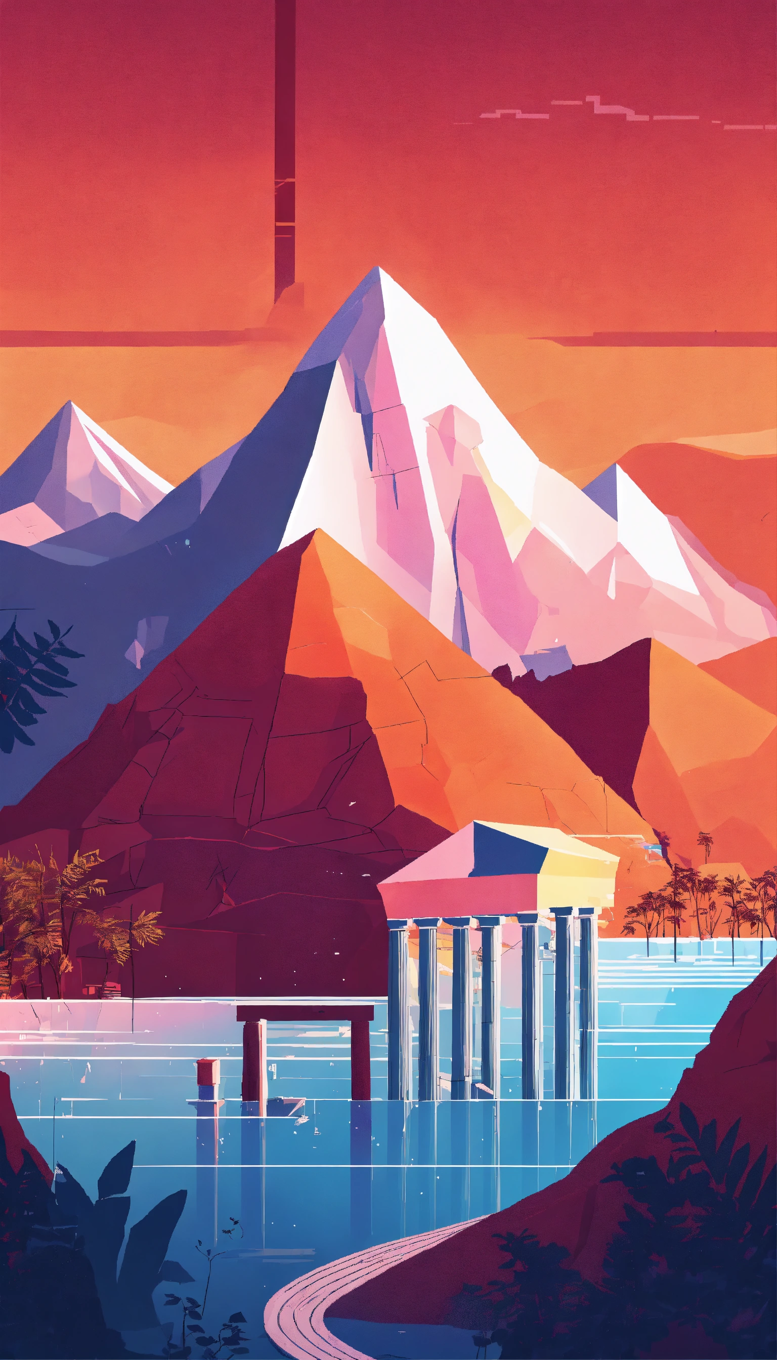 Data and technology destroyed greek temple in the jungle with graphs and histograms, minimalist illustration
