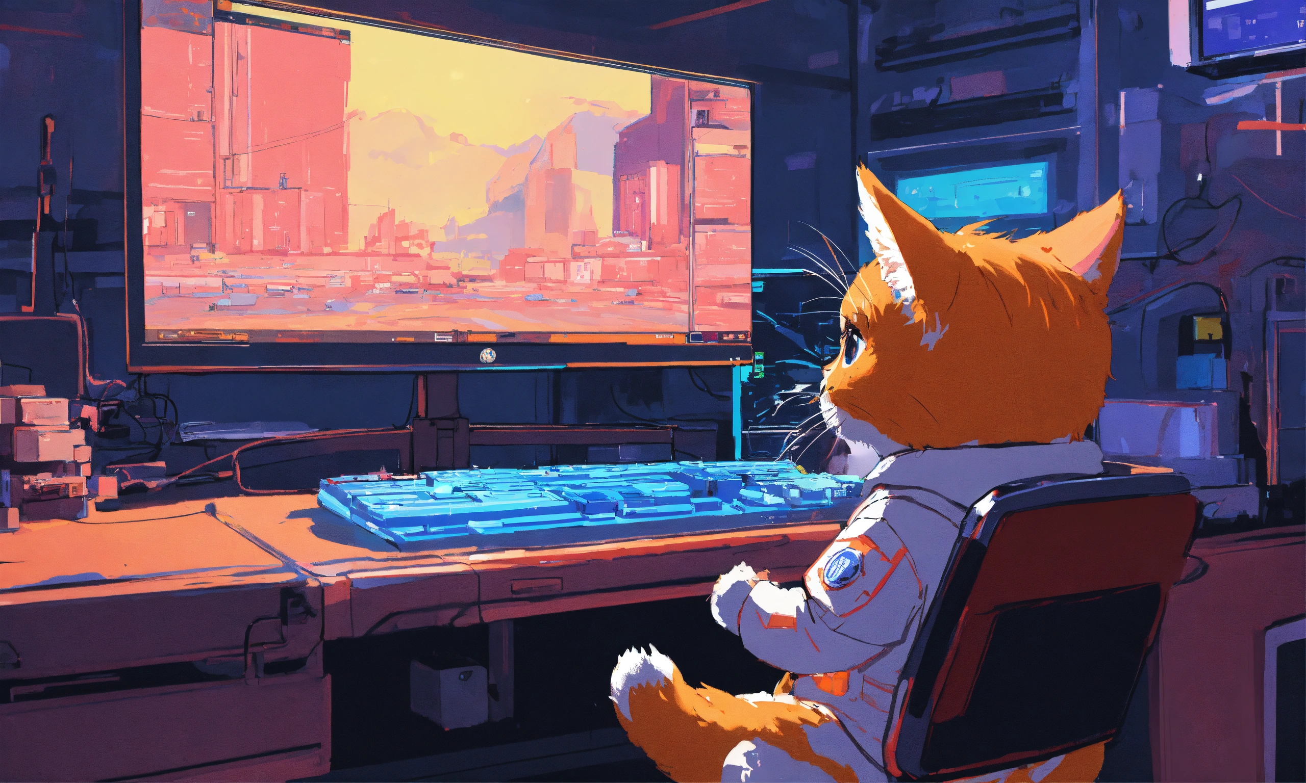 Digital art of a baby cat in computer screen, ai robot is supportin the operation at supercomputer room, style of laurie greasley, studio ghibli, akira toriyama, james gilleard, genshin impact, trending pixiv fanbox, acrylic palette knife, 4k, vibrant colors, devinart, trending on artstation, low details #gamecard frame