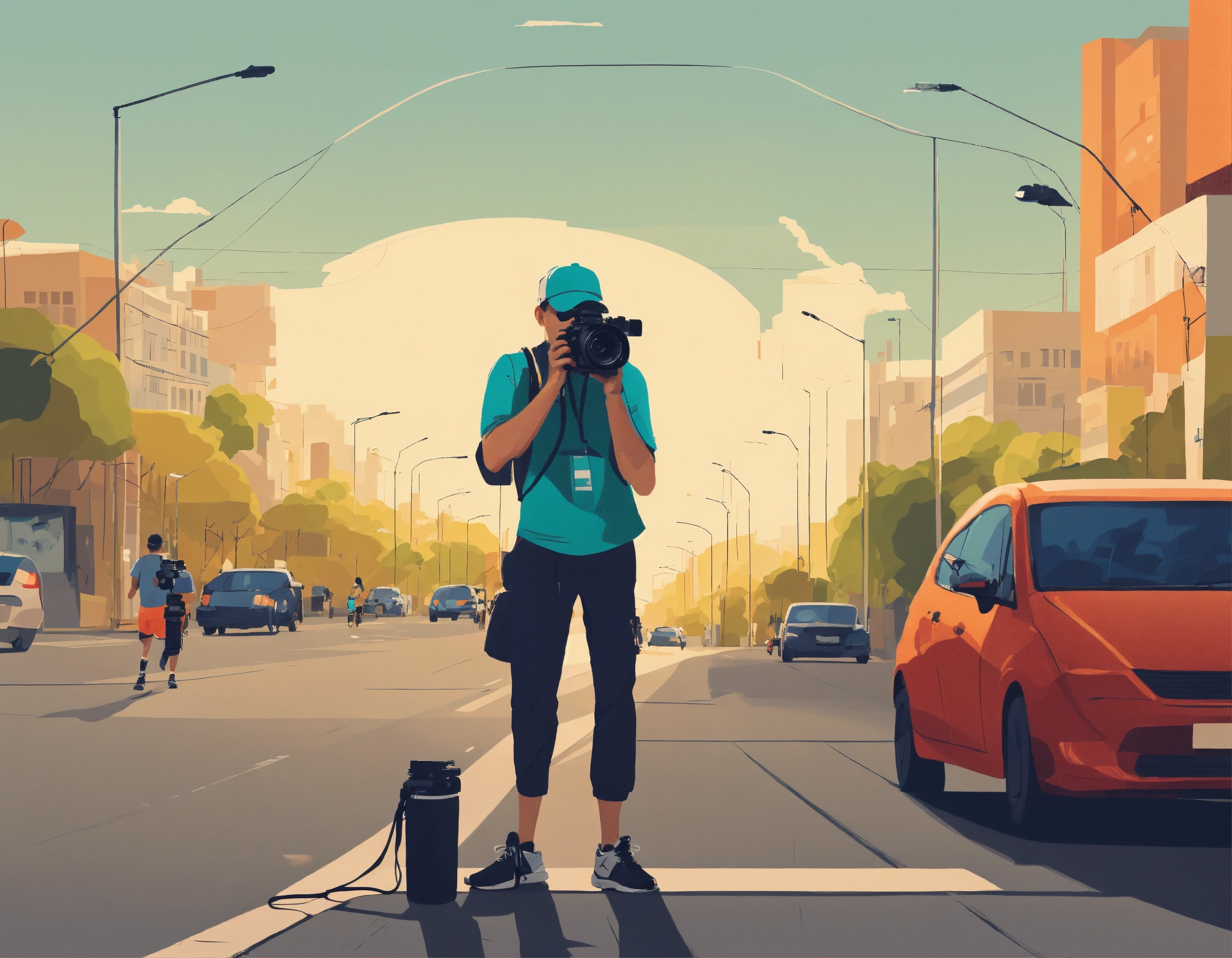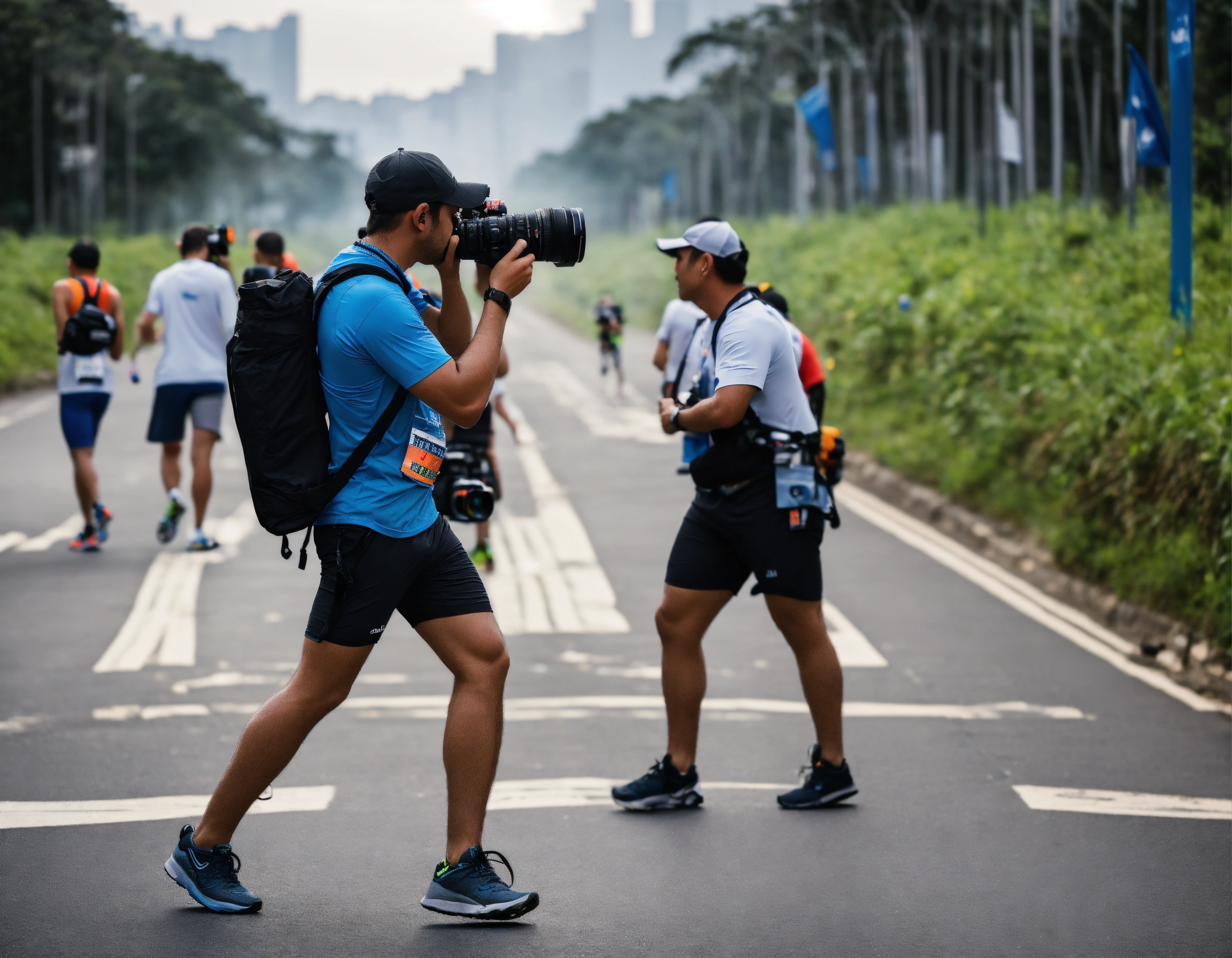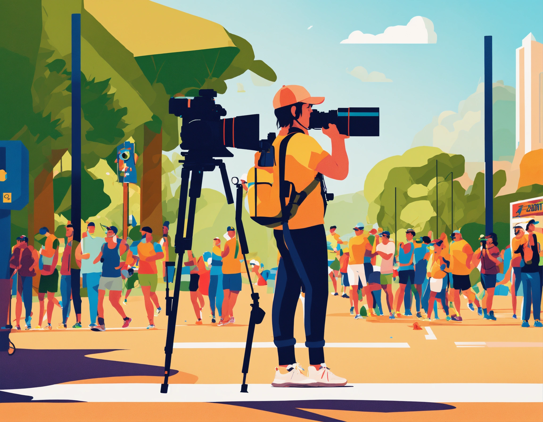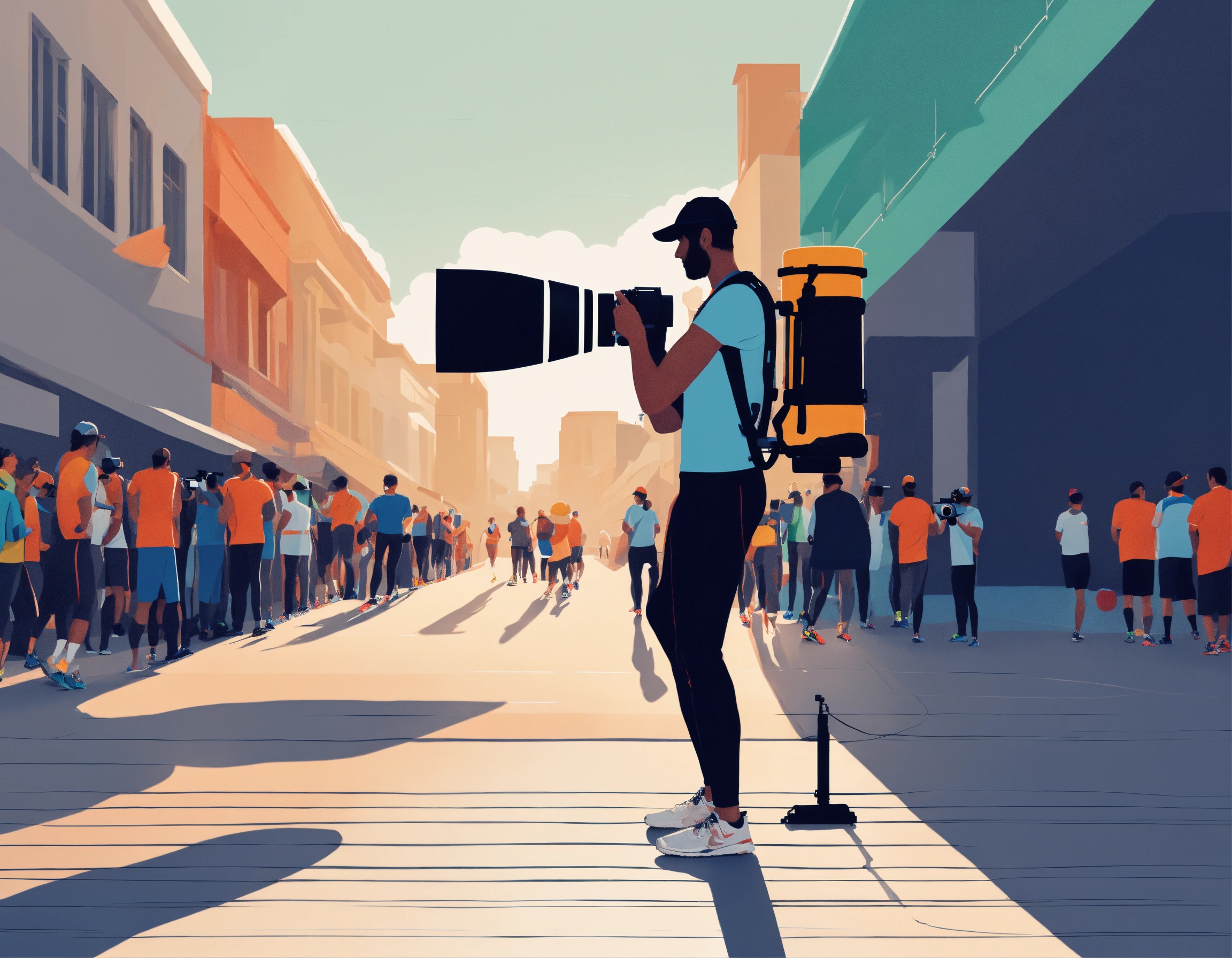 Photographer with a camera and giant telephoto lens, disproportionate lens. Minimalist illustration. Sports event photographer covering a marathon in Brazil. Photographer wearing light, summer, sports clothes, T-shirt, pants and sneakers. Cinematic, Photoshoot, Shot on 16mm Lens, Depth of Field, Blur Tilt Angle, Shutter Speed 1 /1000, F/22, White Balance, 32k, Super resolution, Pro Photo RGB, Partial Backlight, Backlight, Dramatic Light, Incandescent, Soft Light, Volumetric, Conte-Jour, Global Illumination, Screen Space Global Illumination, Scatter, Shadows, Harsh, Shimmer, Lumen reflections, Screen space reflections, Diffraction gradation, Chromatic aberration, GB offset, Sweep lines, Ambient occlusion, Anti-aliasing, FKAA, TXAA, RTX, SSAO, OpenGL-Shader's, Post Processing, Post Production, Cell Shading, Tone Mapping, CGI, VFX, SFX, incredibly detailed and intricate, hyper realistic, elegant, dynamic pose, photography, volumetric, ultra-detailed, full details scratched