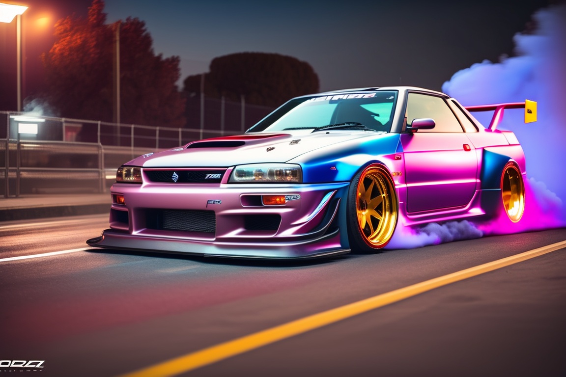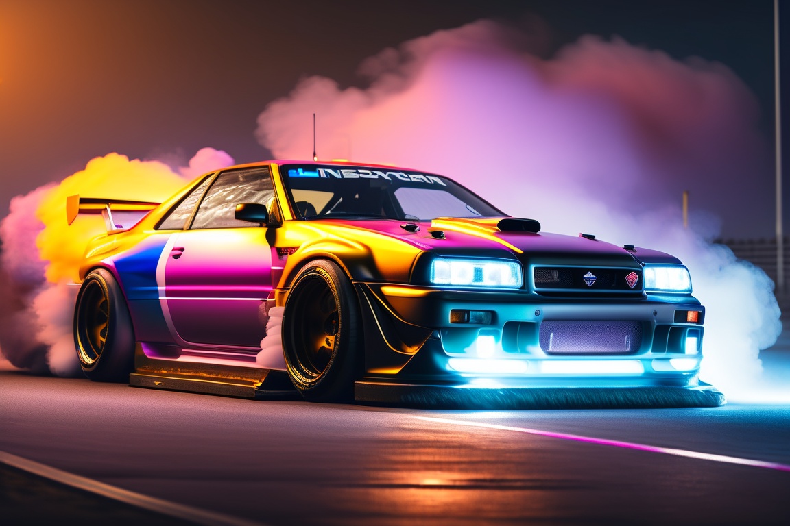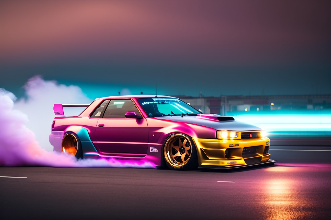 Nissan skyline, frozen track, at night, couch, dummies, dice, front dope cinematic photo forza, corsa 5, tunned, street racing. full car, car in focus, half sideways, drifting, in smoke, smoke from under the wheels, fire from under the wheels, bottom illumination, wheel illumination, ground illumination, pink and blue glare, one car in the frame, bright juicy gold chrome