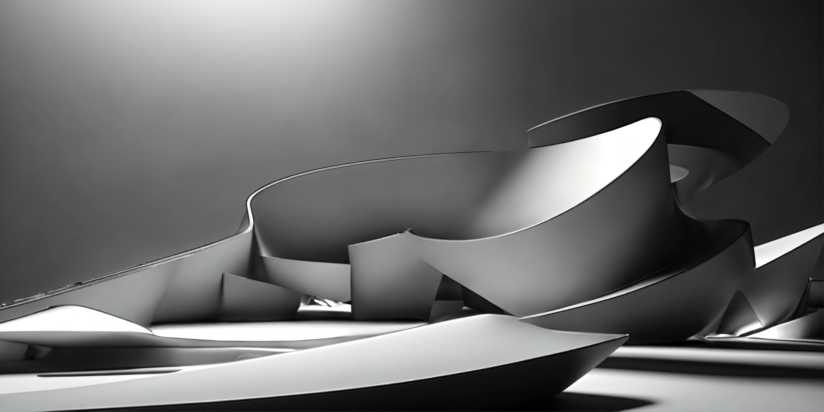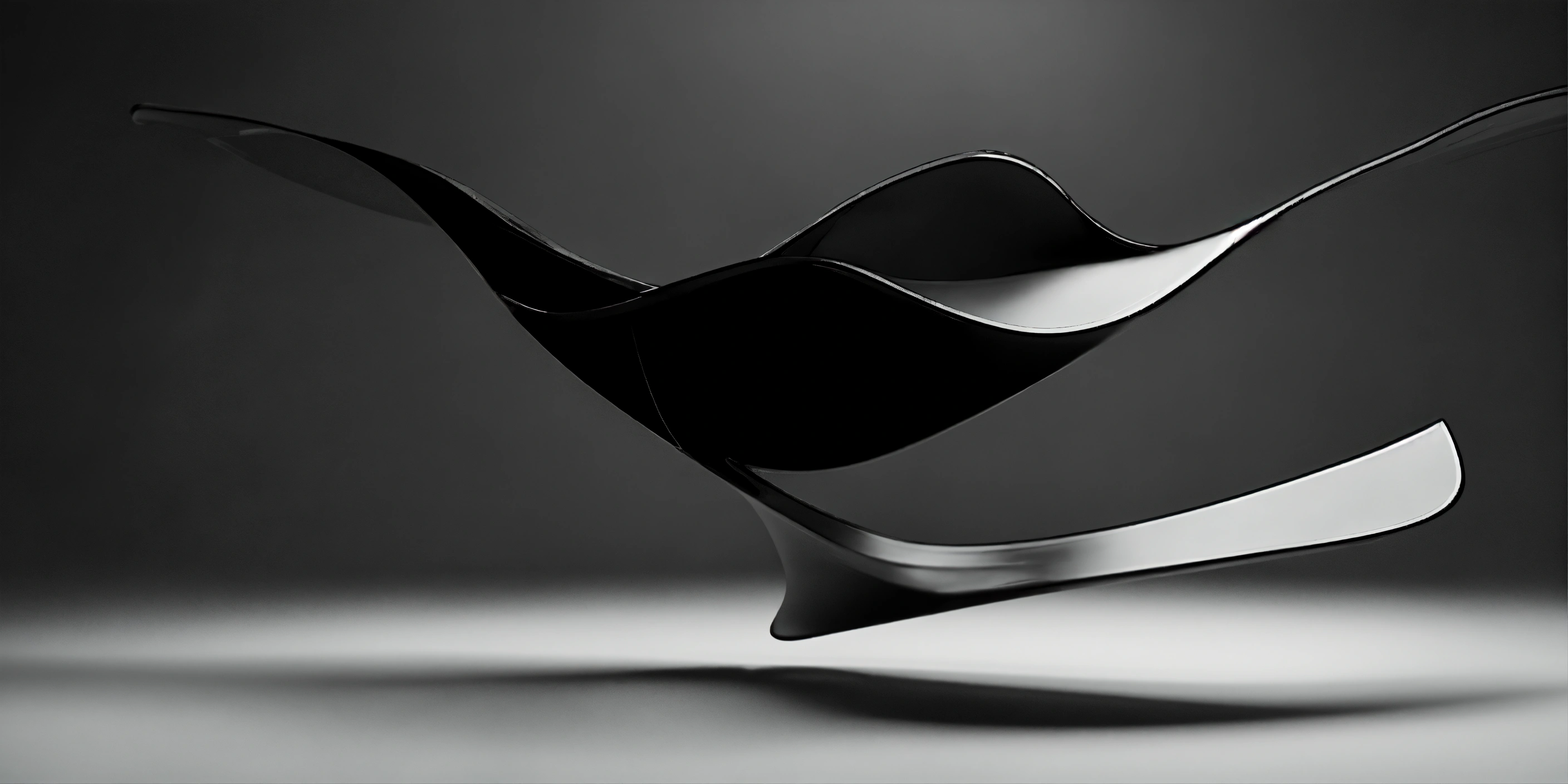 Abstract shape or object flying, 3d render, room, dark, black white, no background, minimal, pak, graphic design.