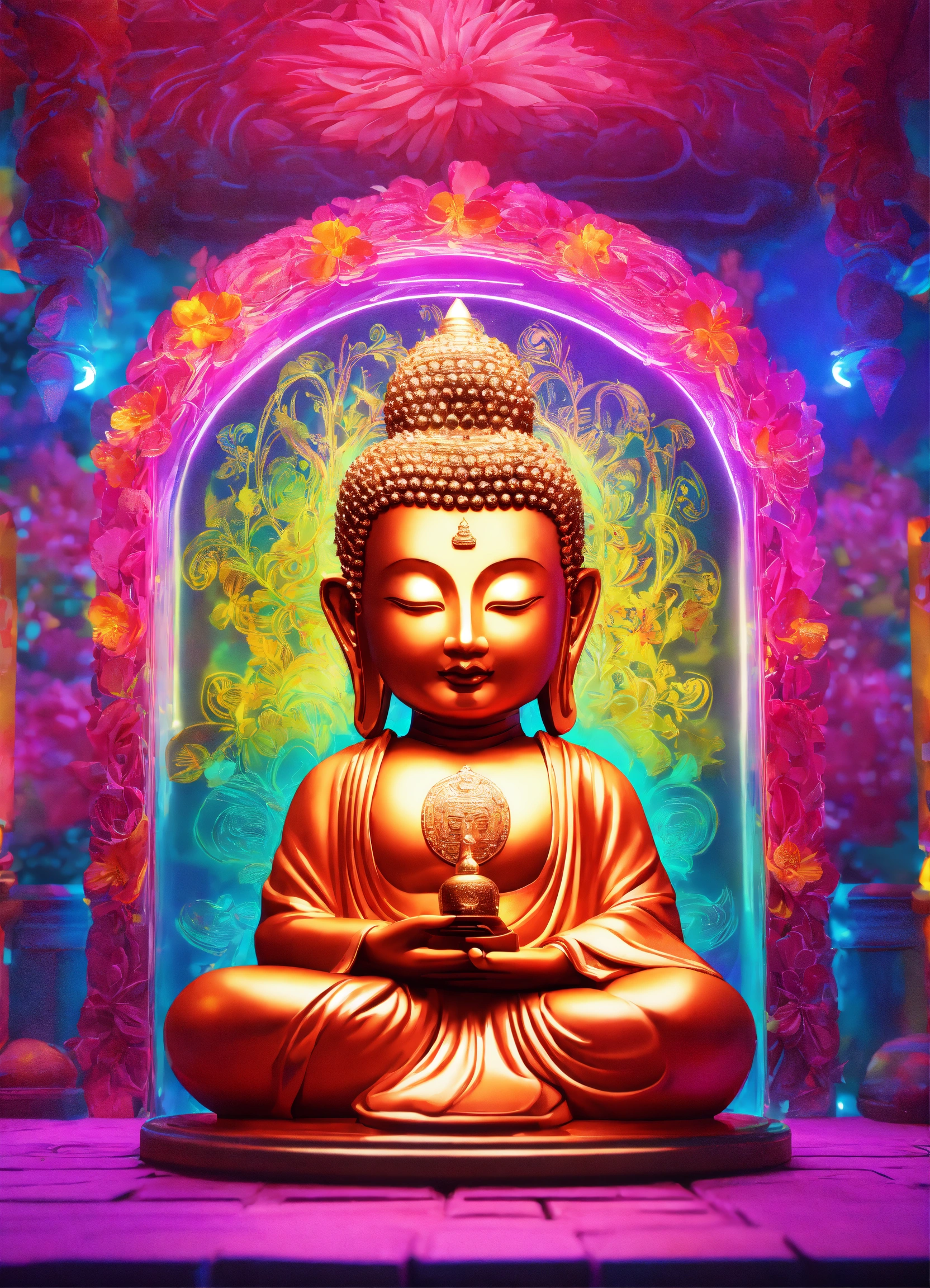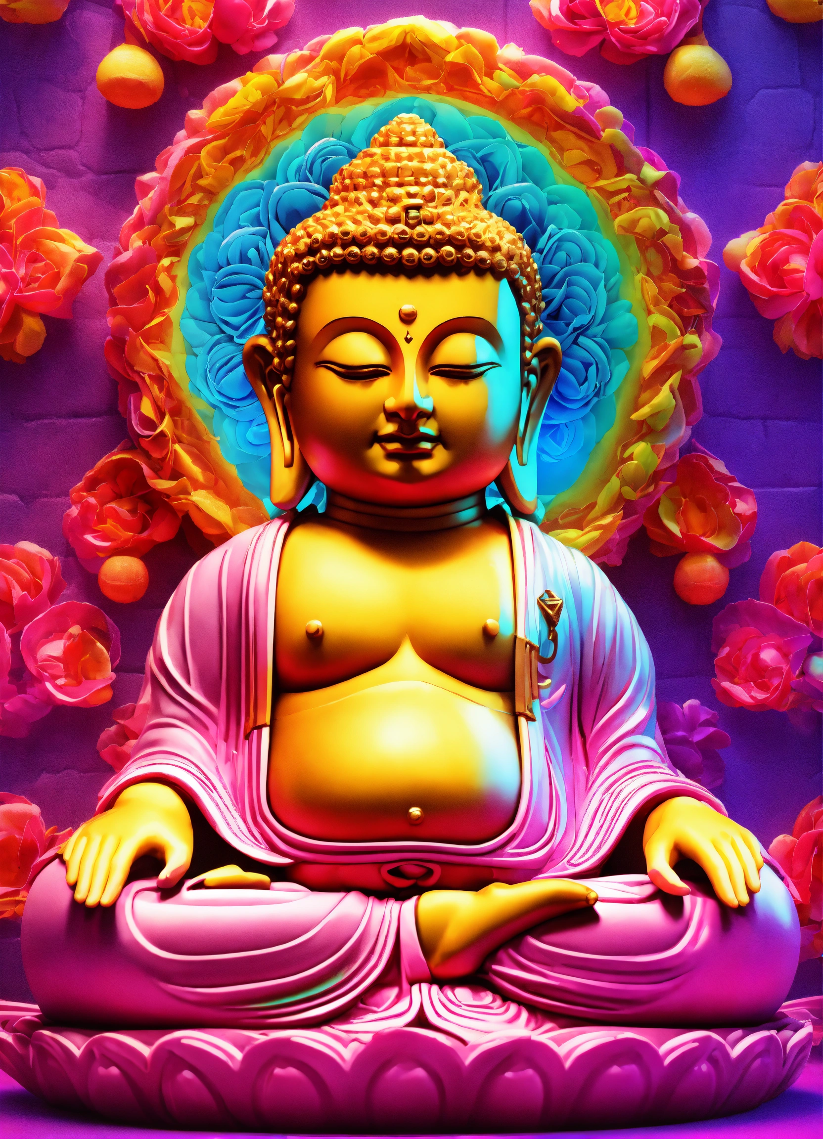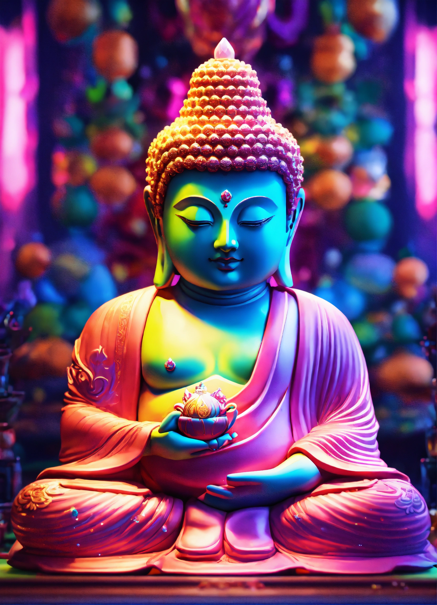 Gelly cute adorable buddha, neon glow colours, highly intricate details, 3d, cgi, realistic light, facing camera, portrait, global illumination, glass like, repeatable pattern unicorns on background on a wall