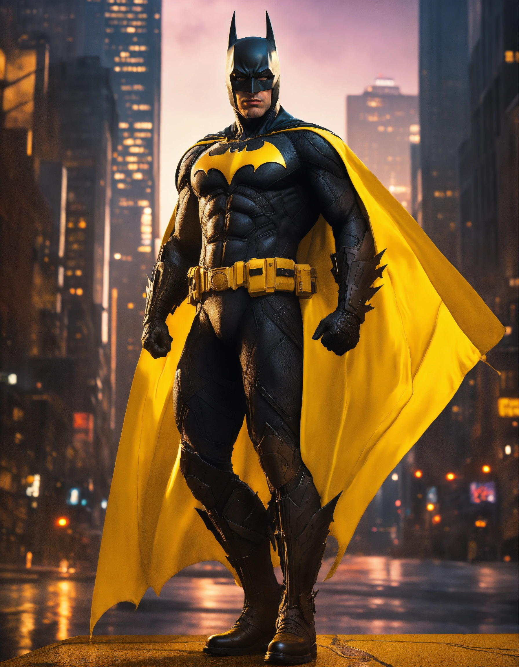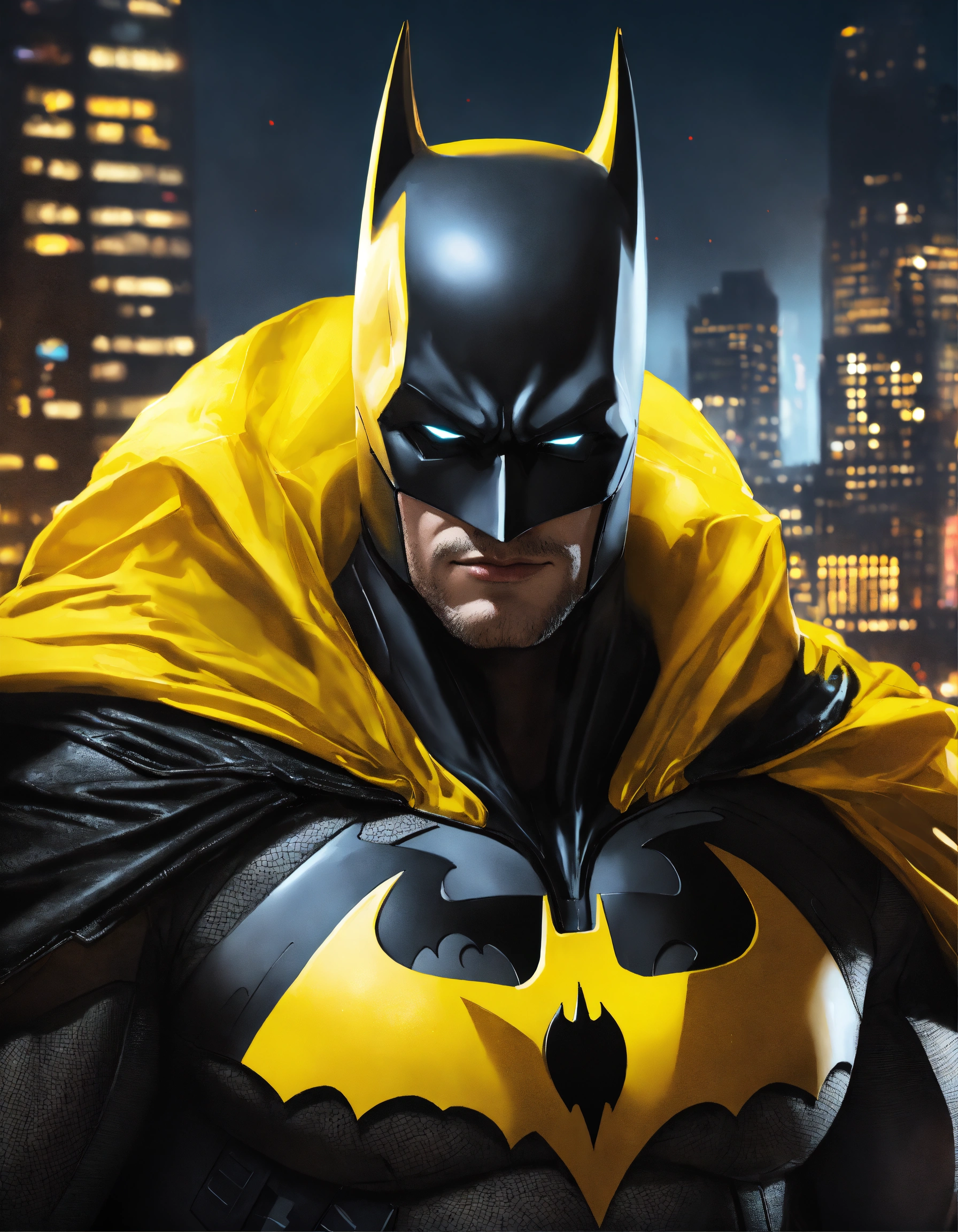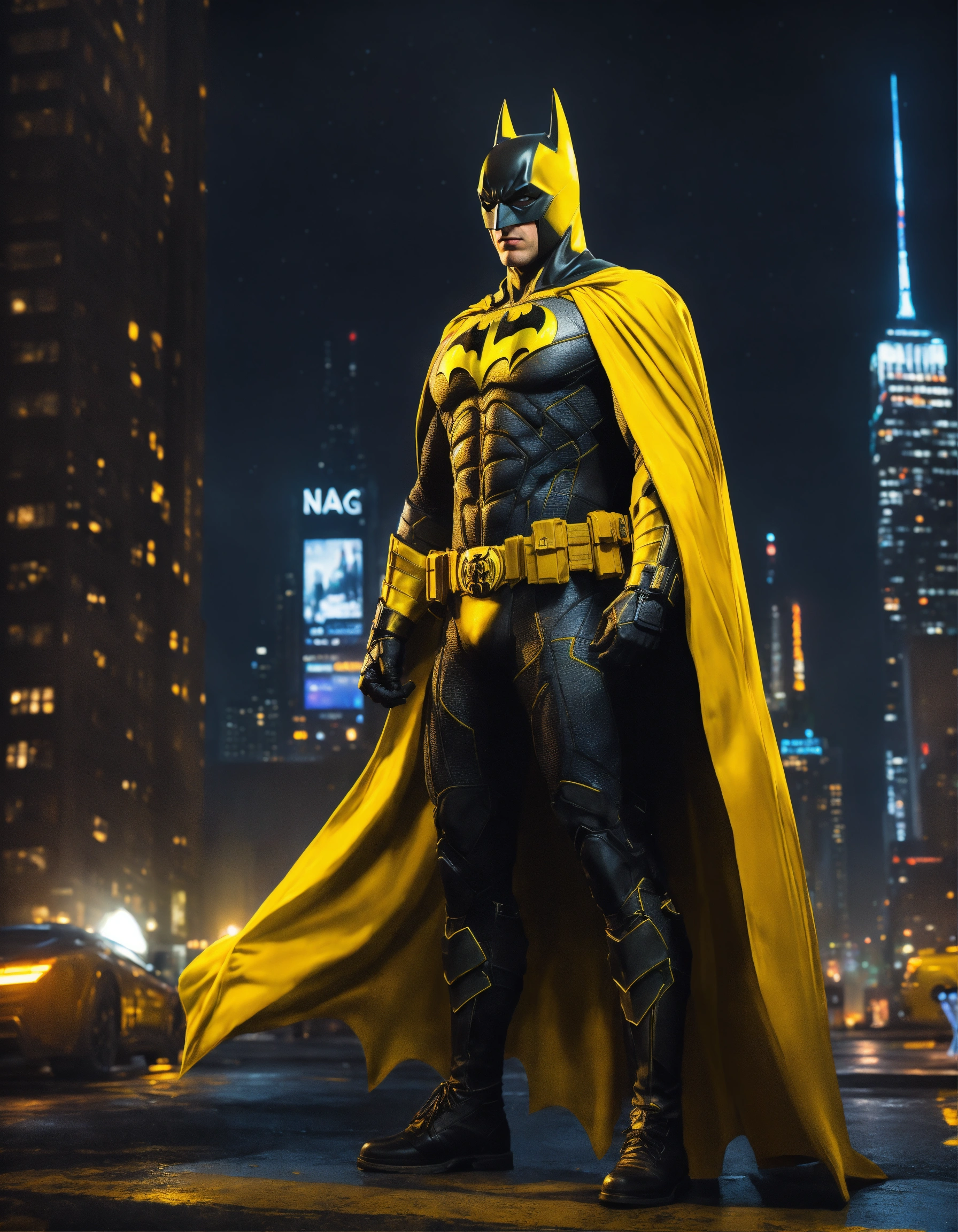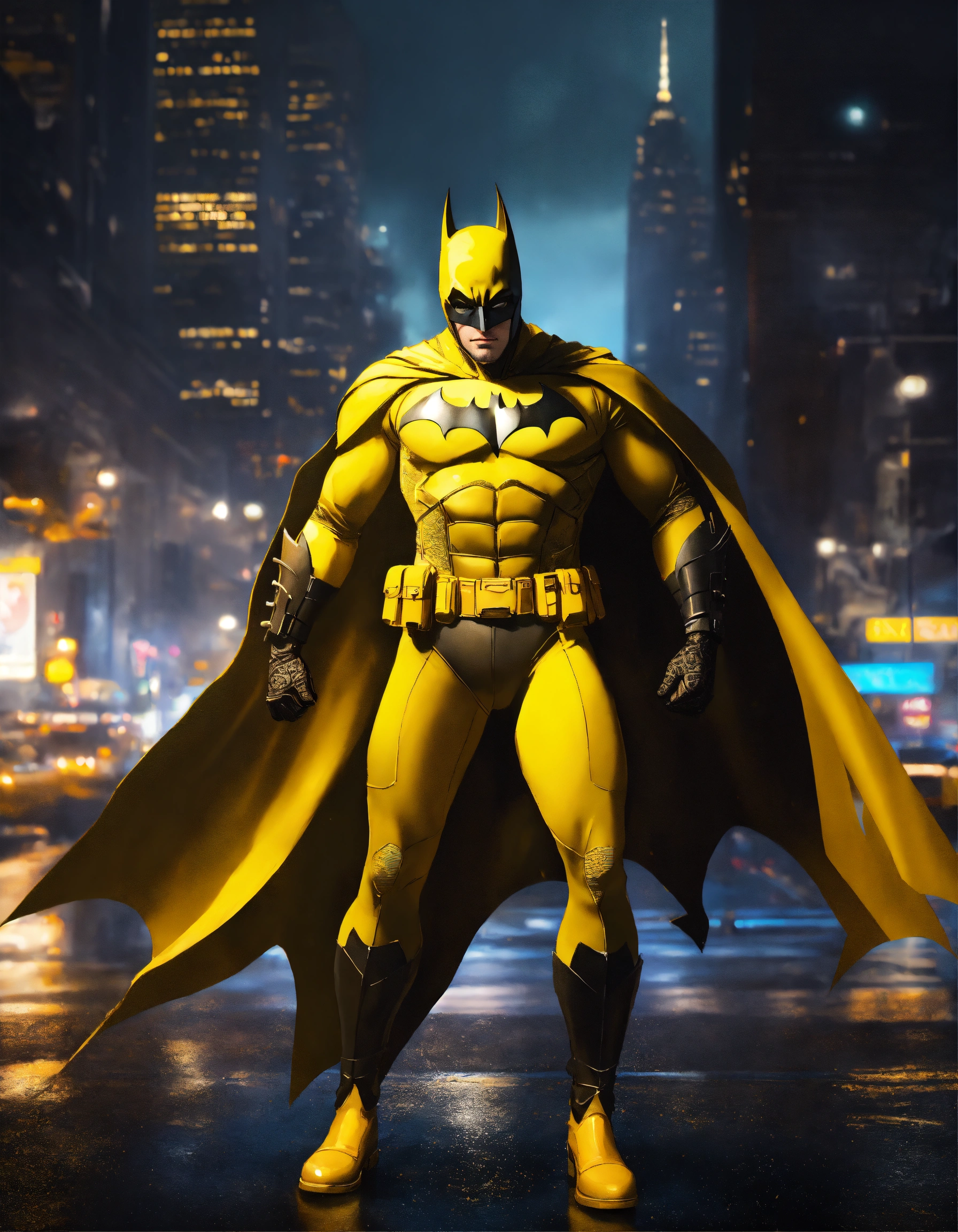 Portrait painting of batman wearing a (stunning yellow and black suit), ultra realistic, concept art, intricate details, eerie, highly detailed, photorealistic, octane render, 8k, unreal engine. art by artgerm and dexter soy nyc in the background, full body, night time