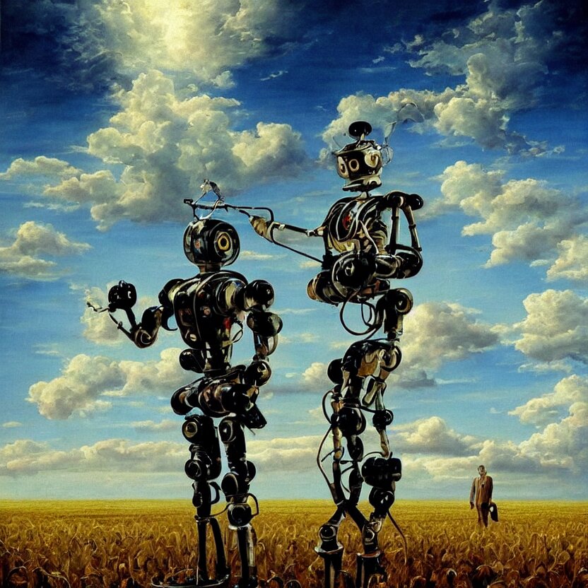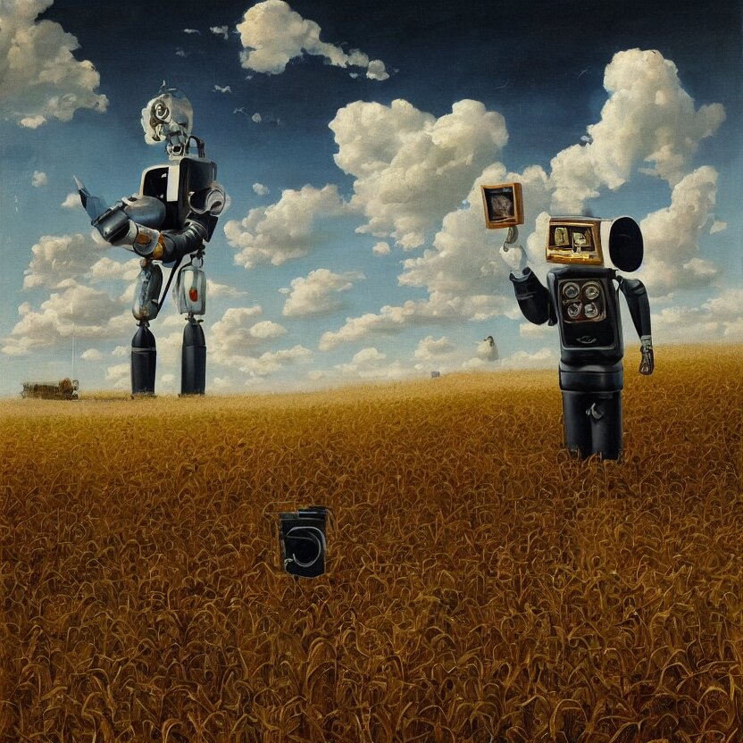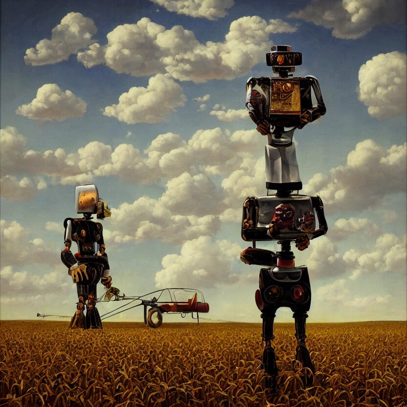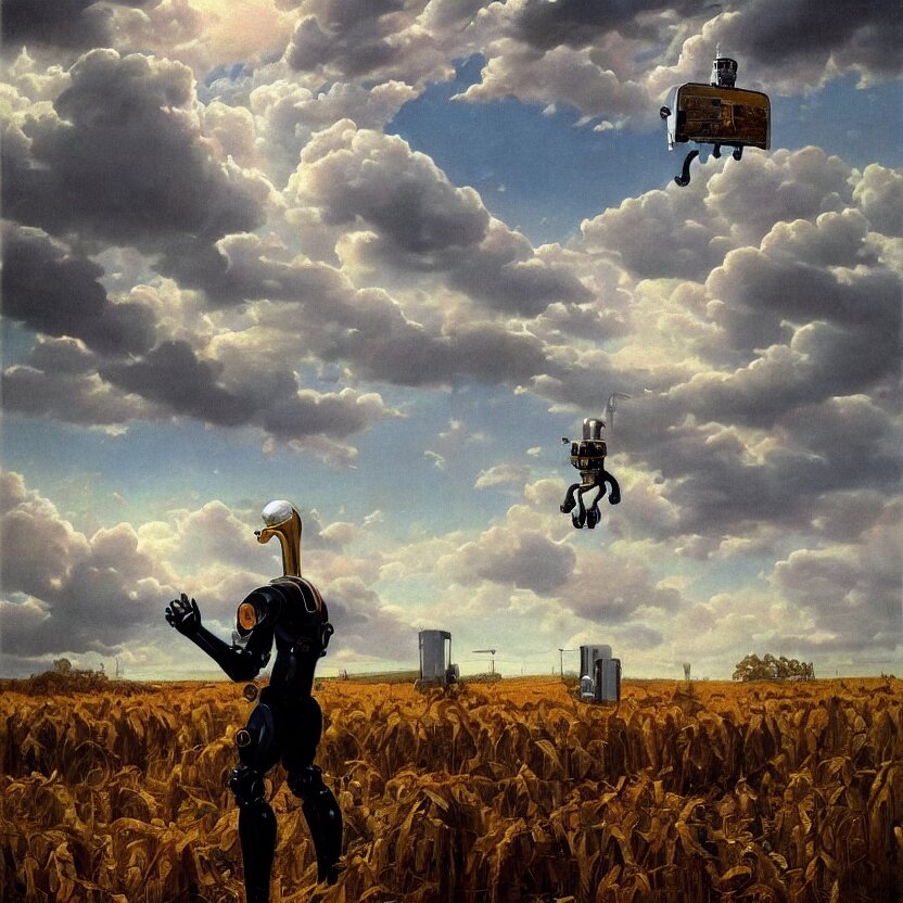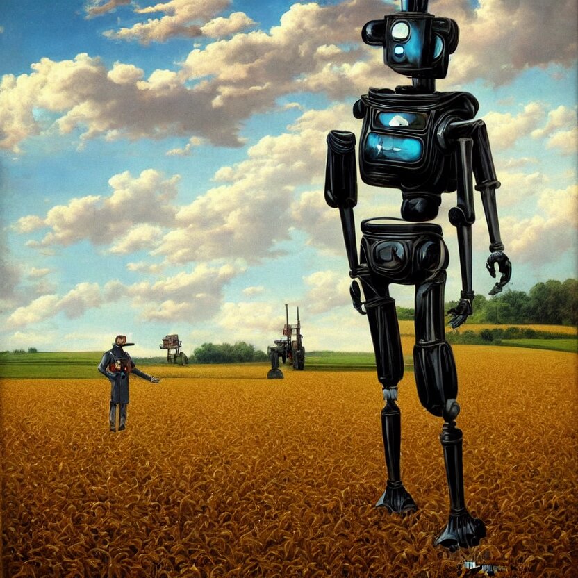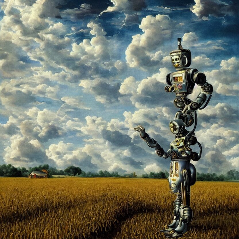 An ornately framed portrait painting of a robot farmer standing in front of rolling cornfields and beautiful clouds. pulp sci - fi art for omni magazine. high contrast. dark background. baroque period, oil on canvas. renaissance masterpiece. trending on artstation. retrofuturism.