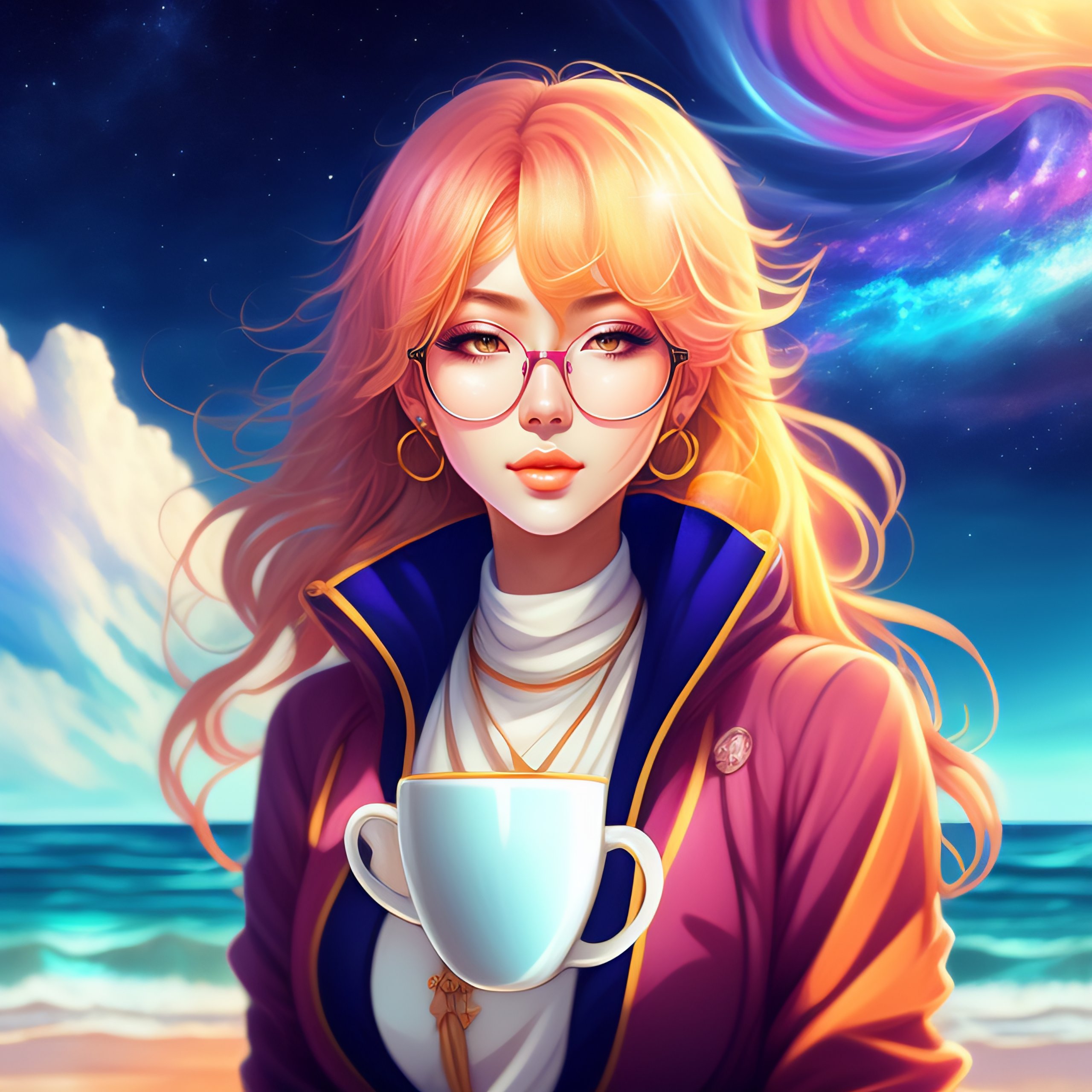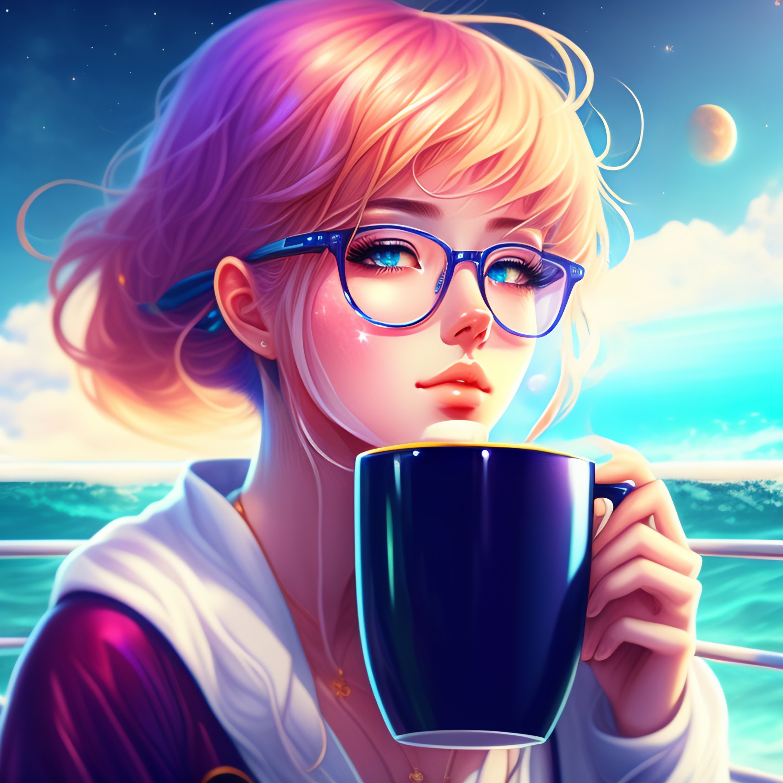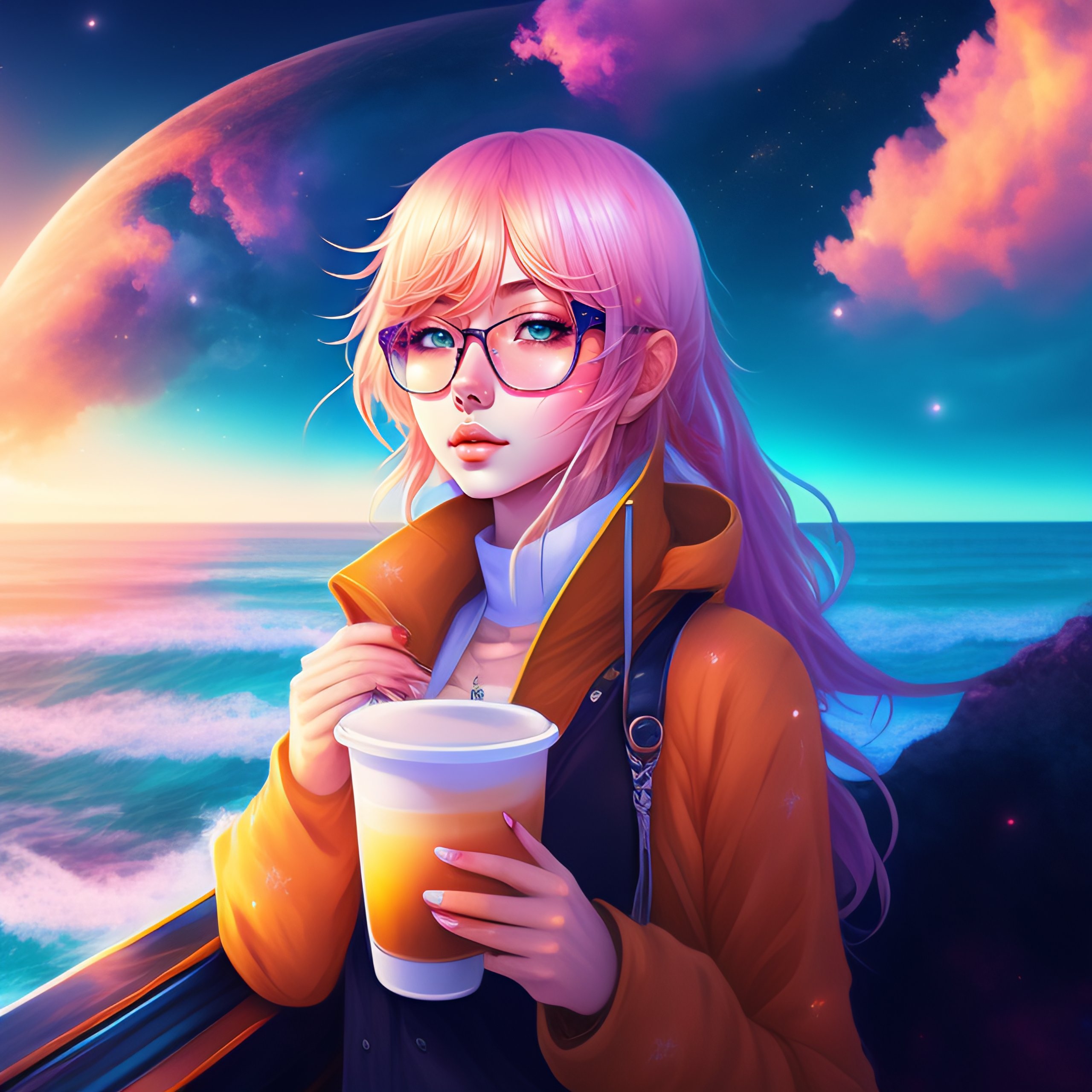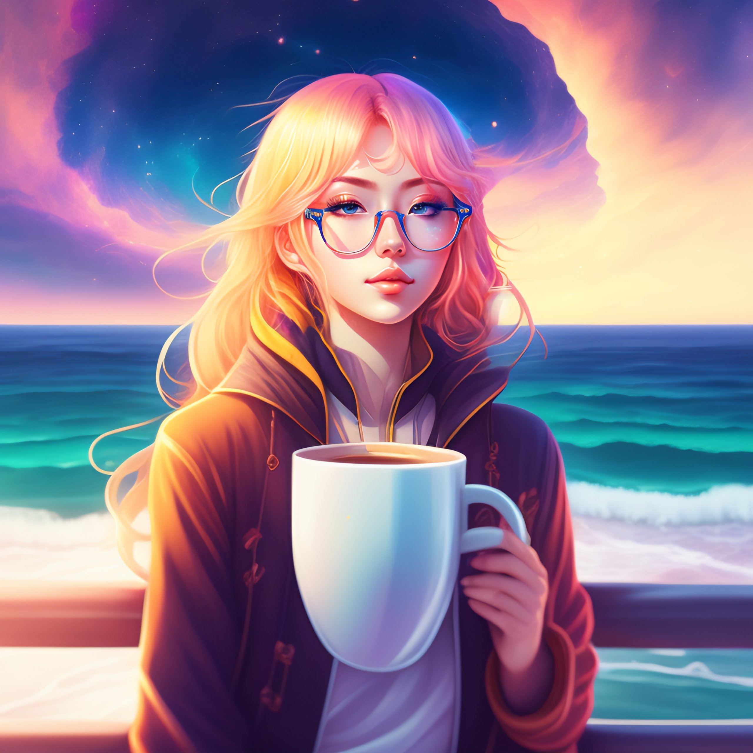 Beautiful anime girl, drinking coffee at the edge of the universe sea, colorfull, nebulae, higres, 4k, masterpiece, blond hair, glasses, sitting