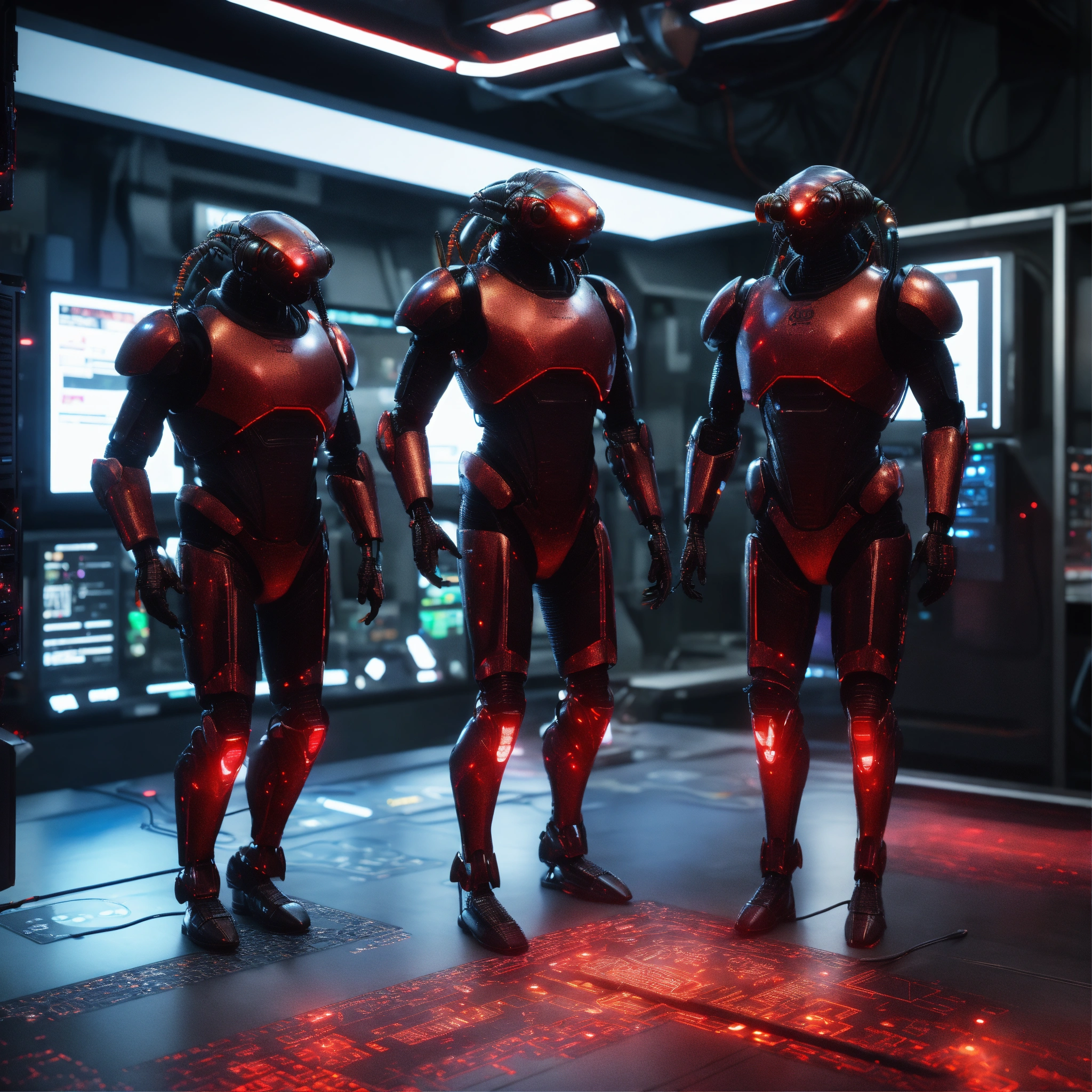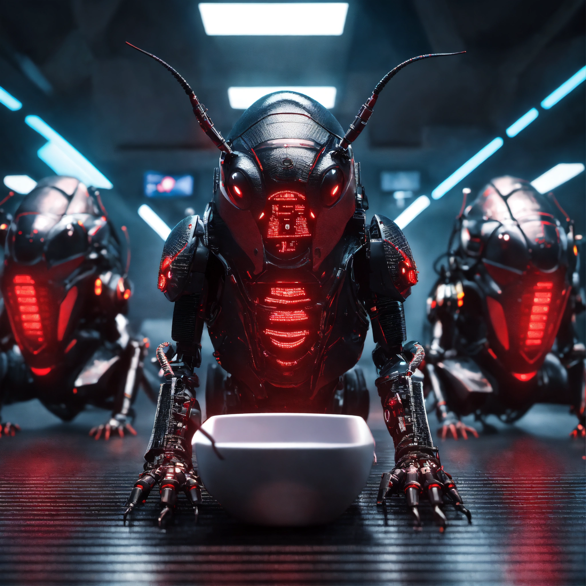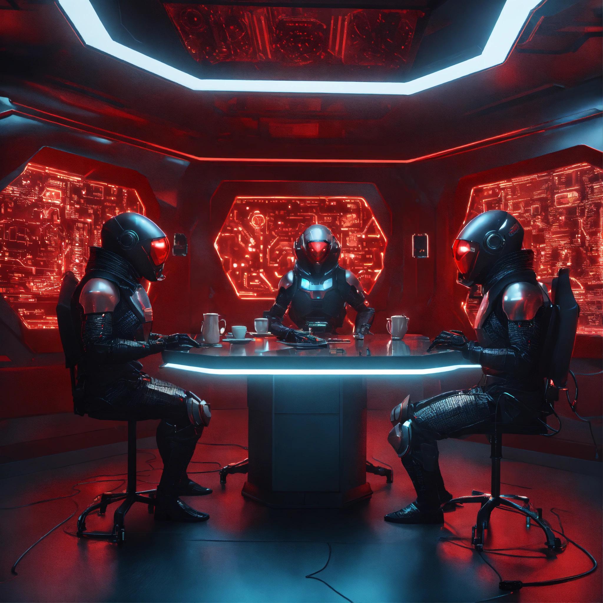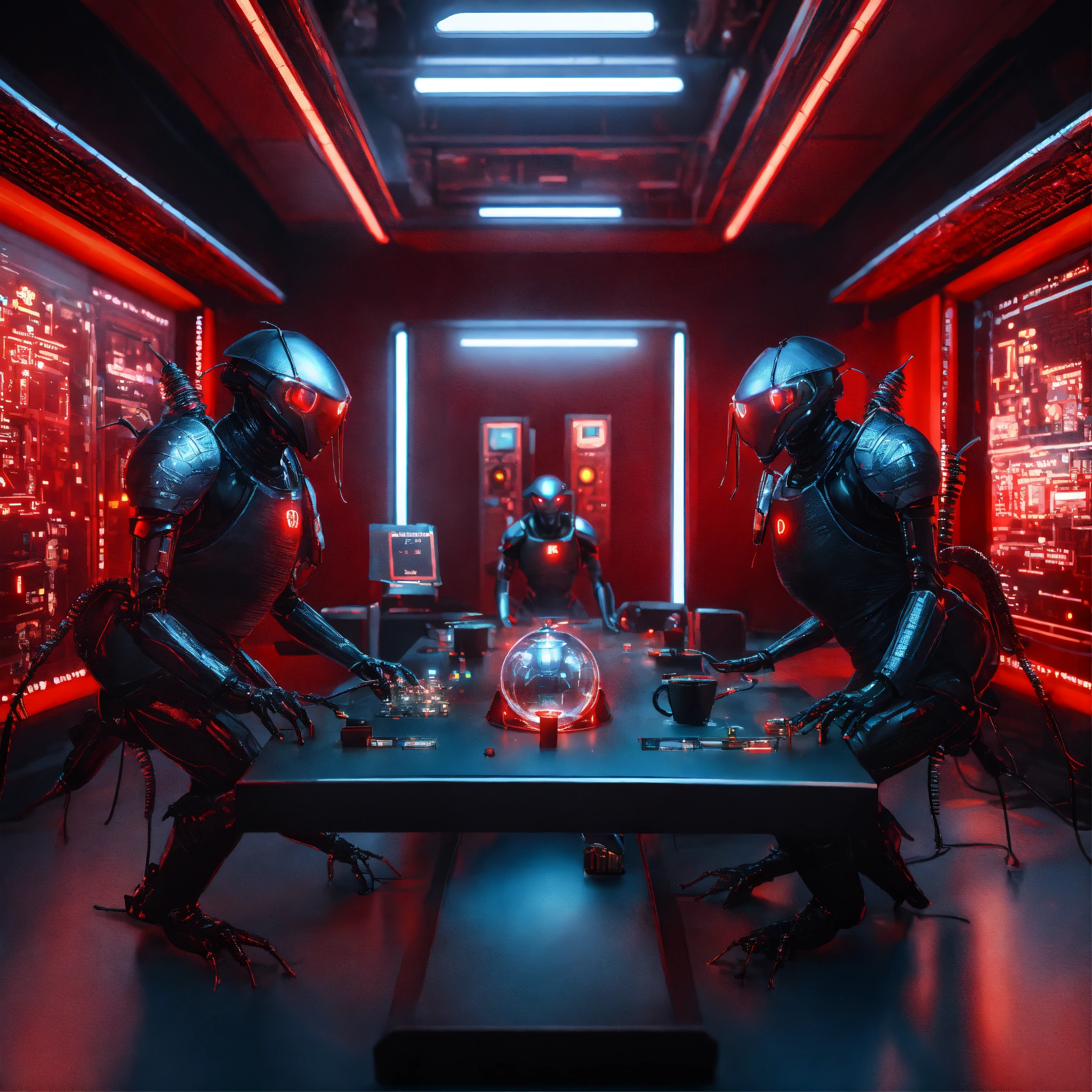 3 black cockroach faced humanoids with red eyes and detailed circuitry markings, having english tea in a hi tech alien holographic control room, realistic, 8k, unreal engine, pixar