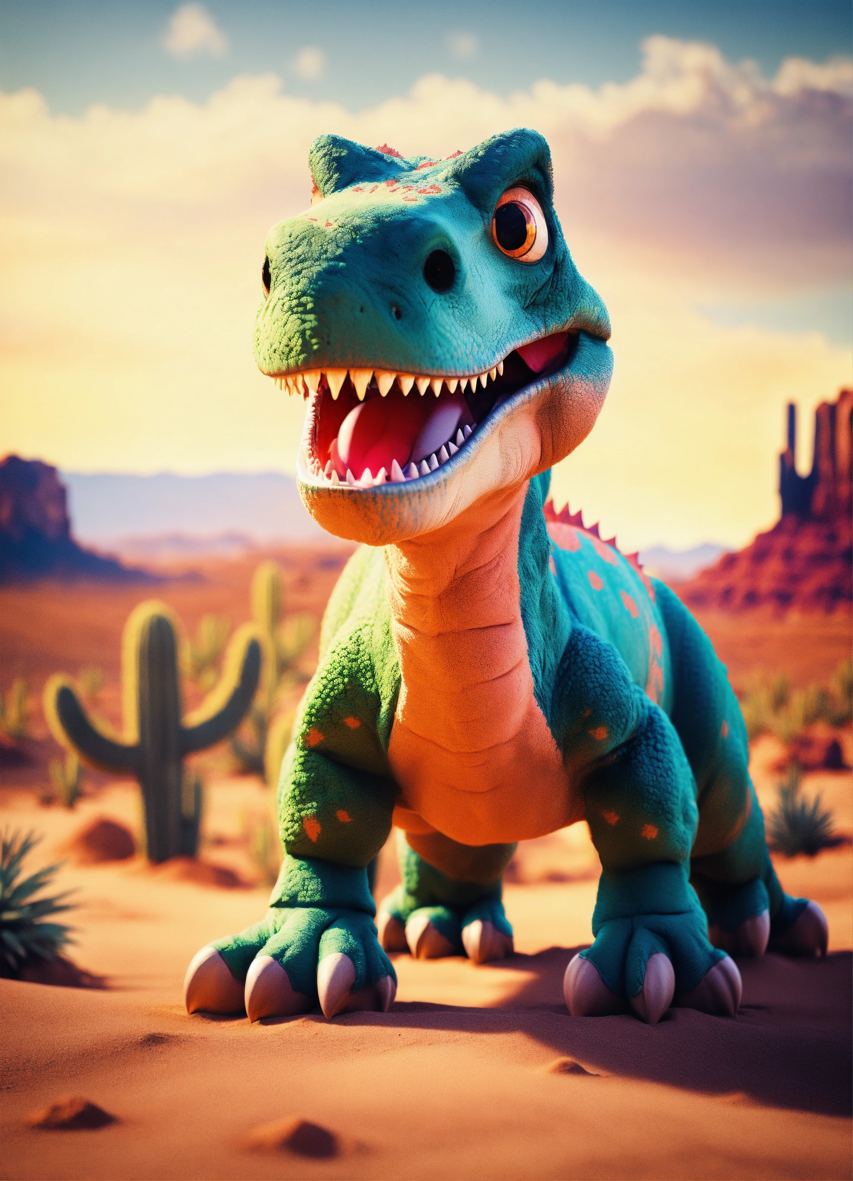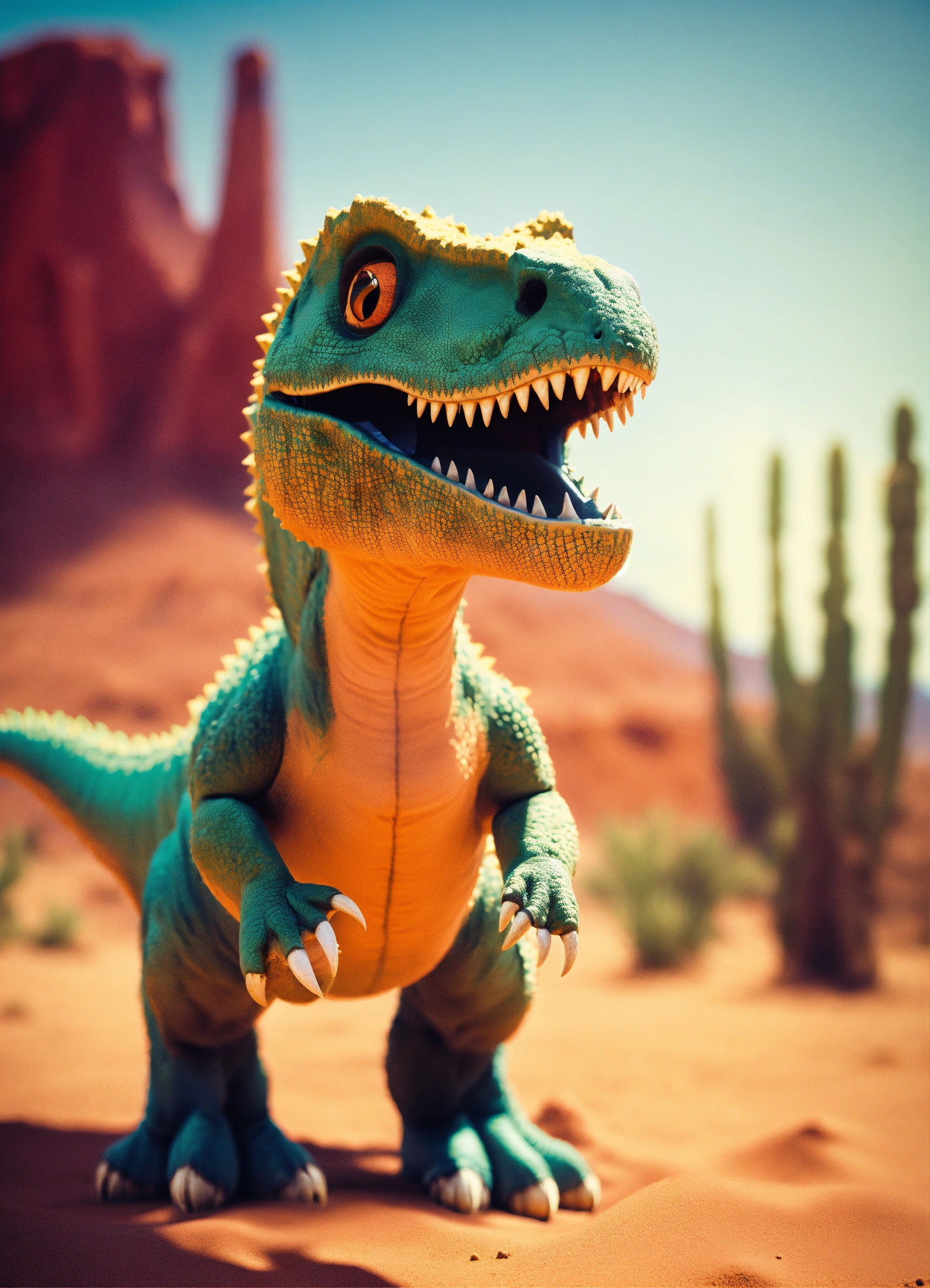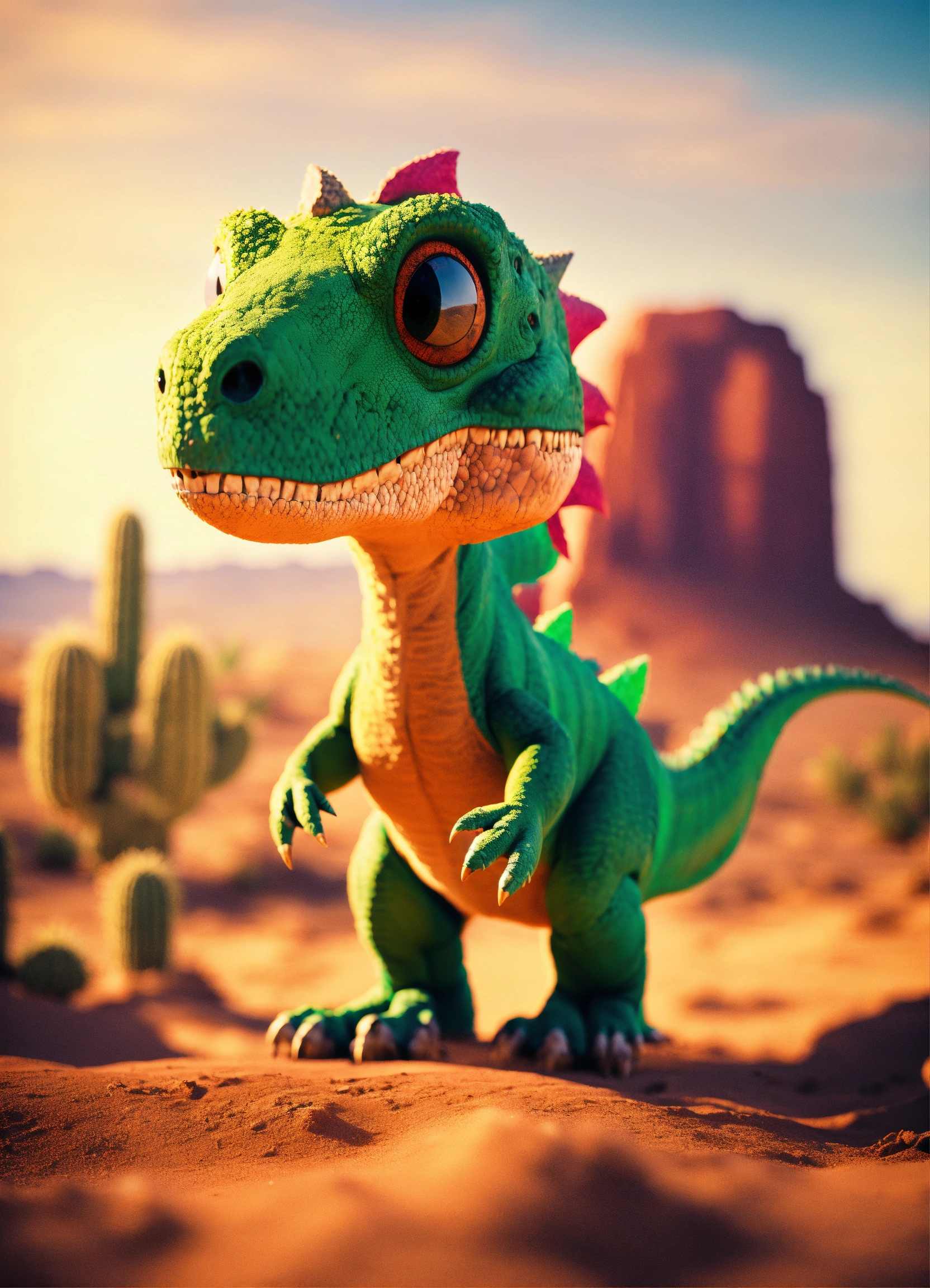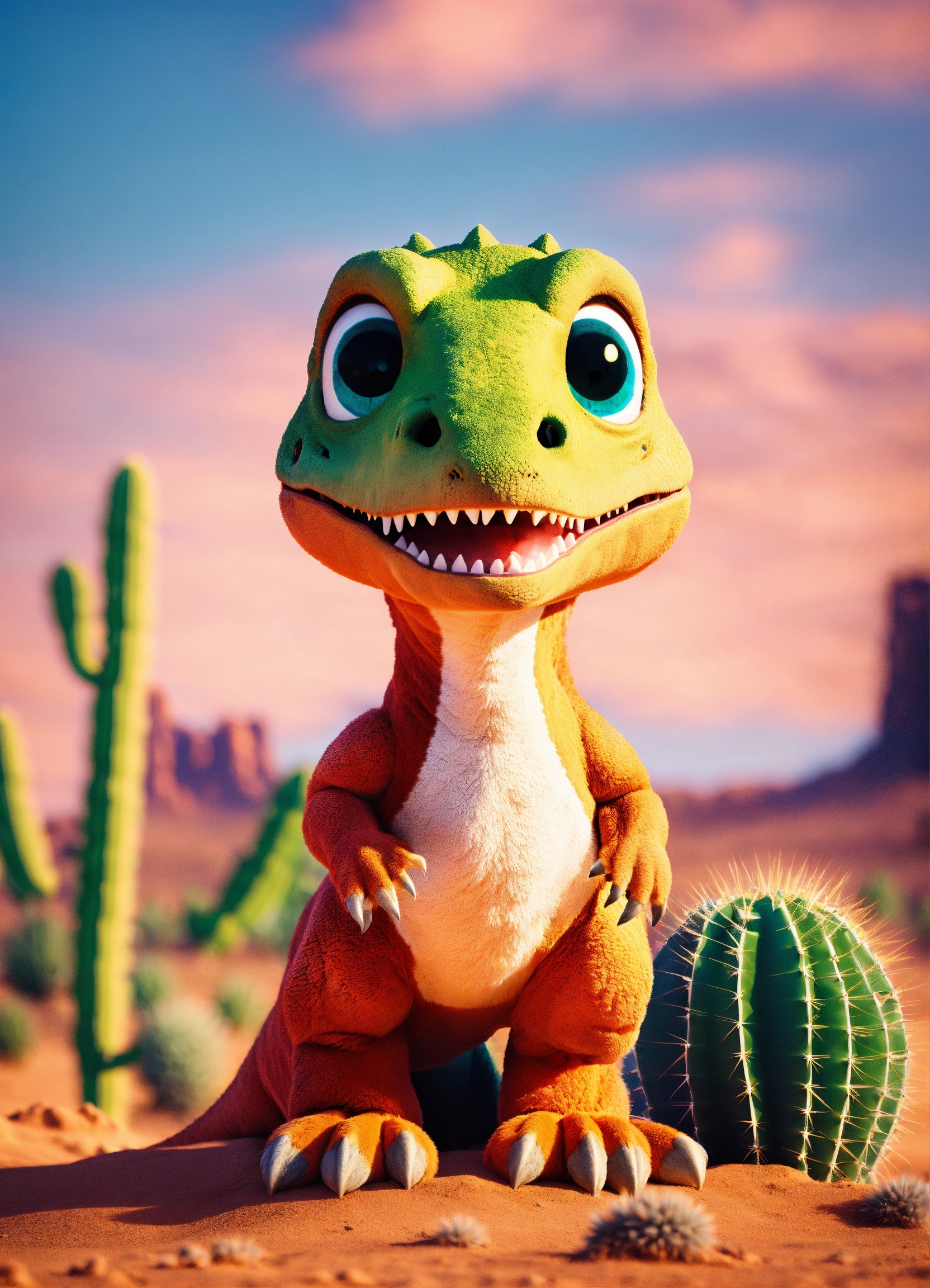 An adorable and fluffy t-rex dinosaur with big colored eyes, in the desert, cactus, sunny, monument valley, with blur background, high quality, 8k