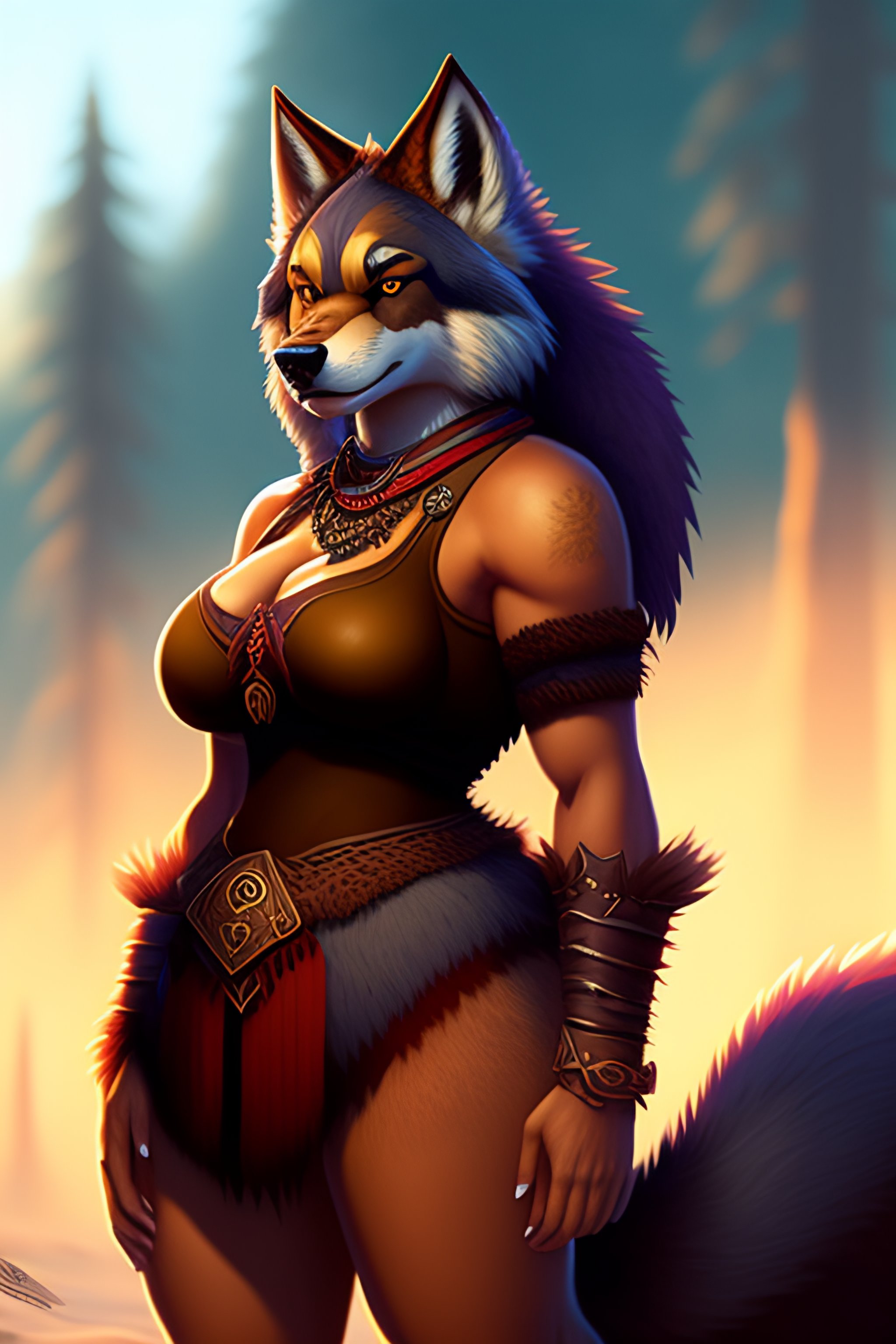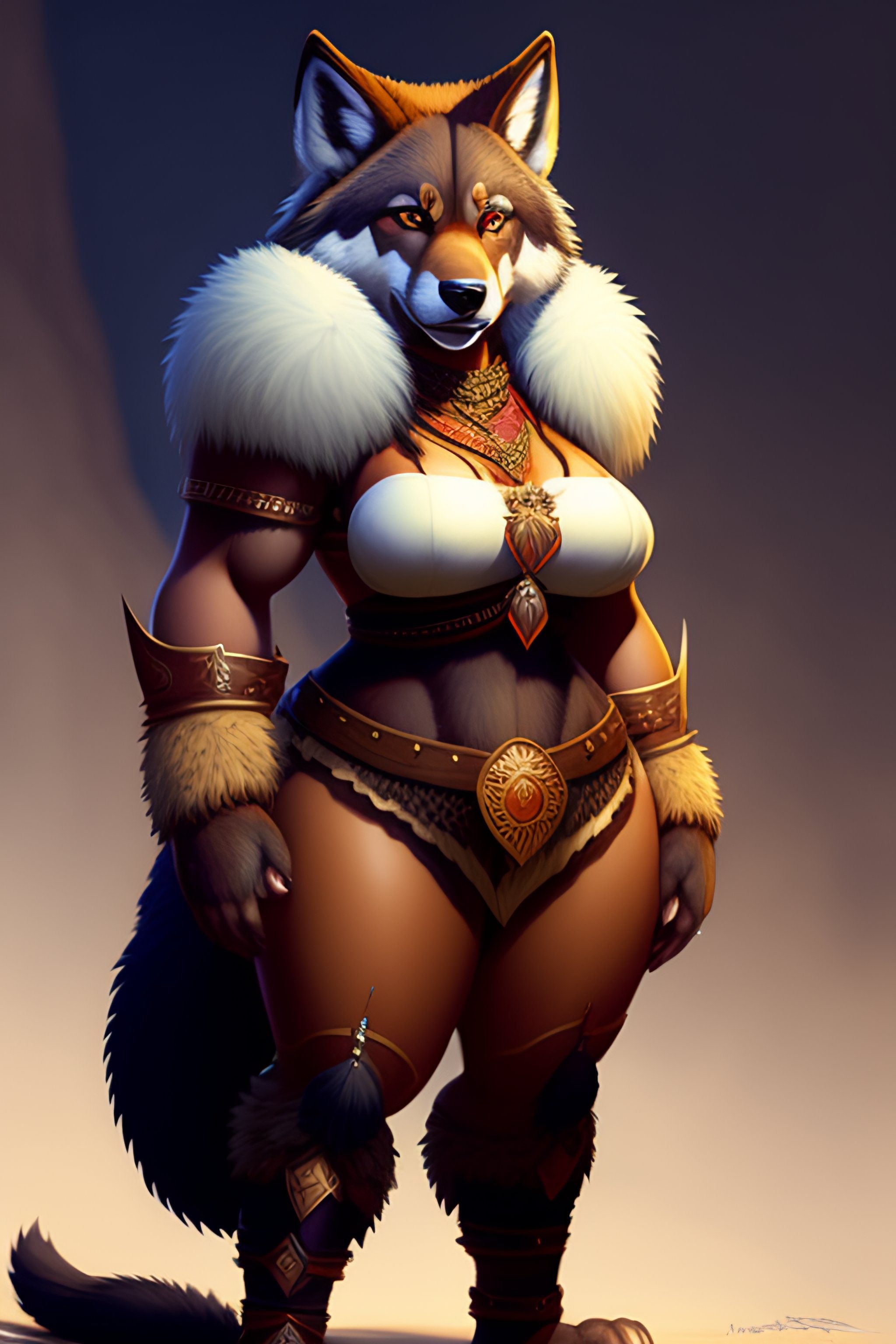 Female anthro wolf fursona, werewolf, worgen, furry, cute, beautiful, plus size, wide hips, covered entirely in fur, wolf female tribal warrior, character design, fluffy, concept art, painted in the style of artists james gurney, chuck jones, balto