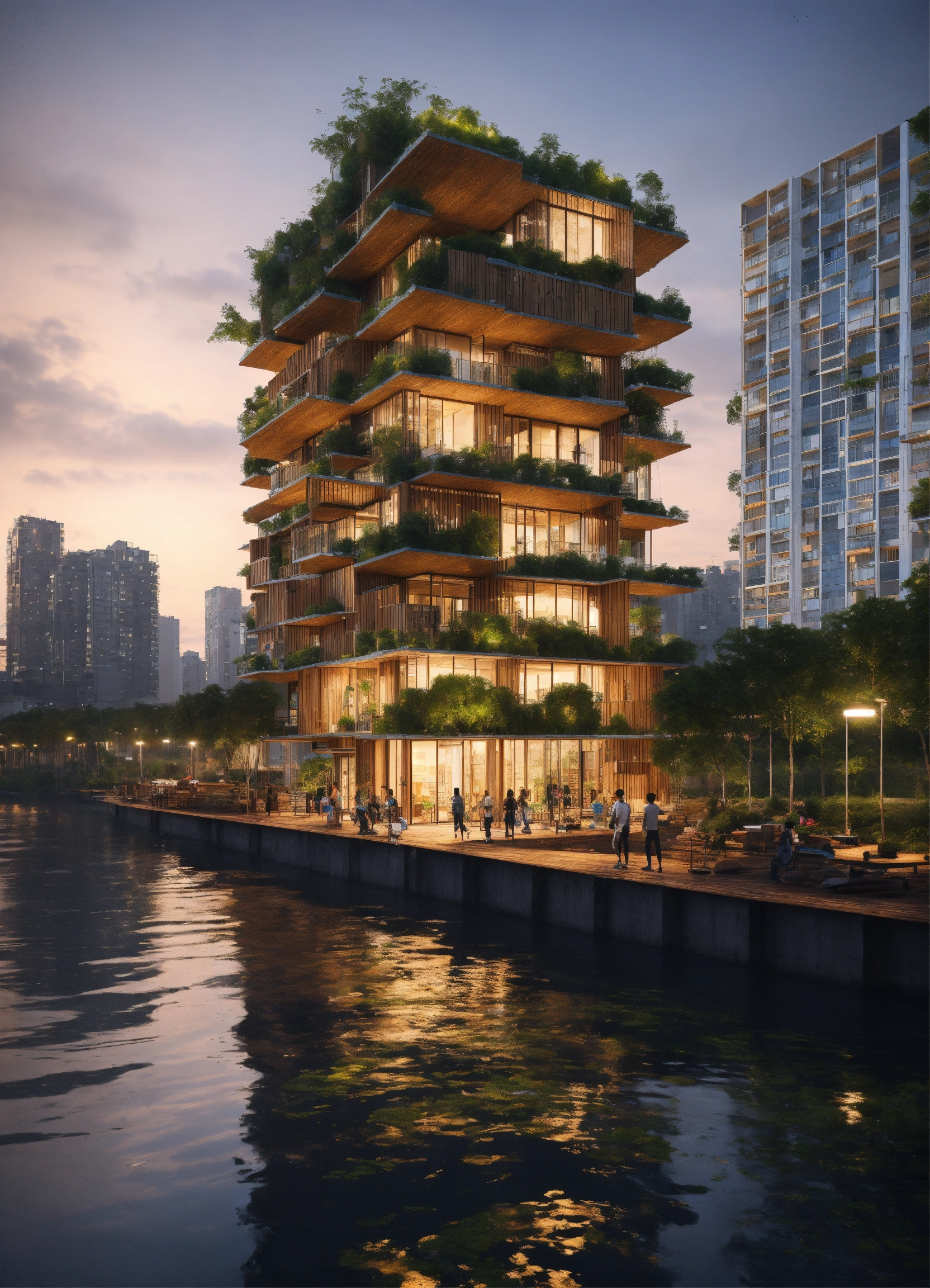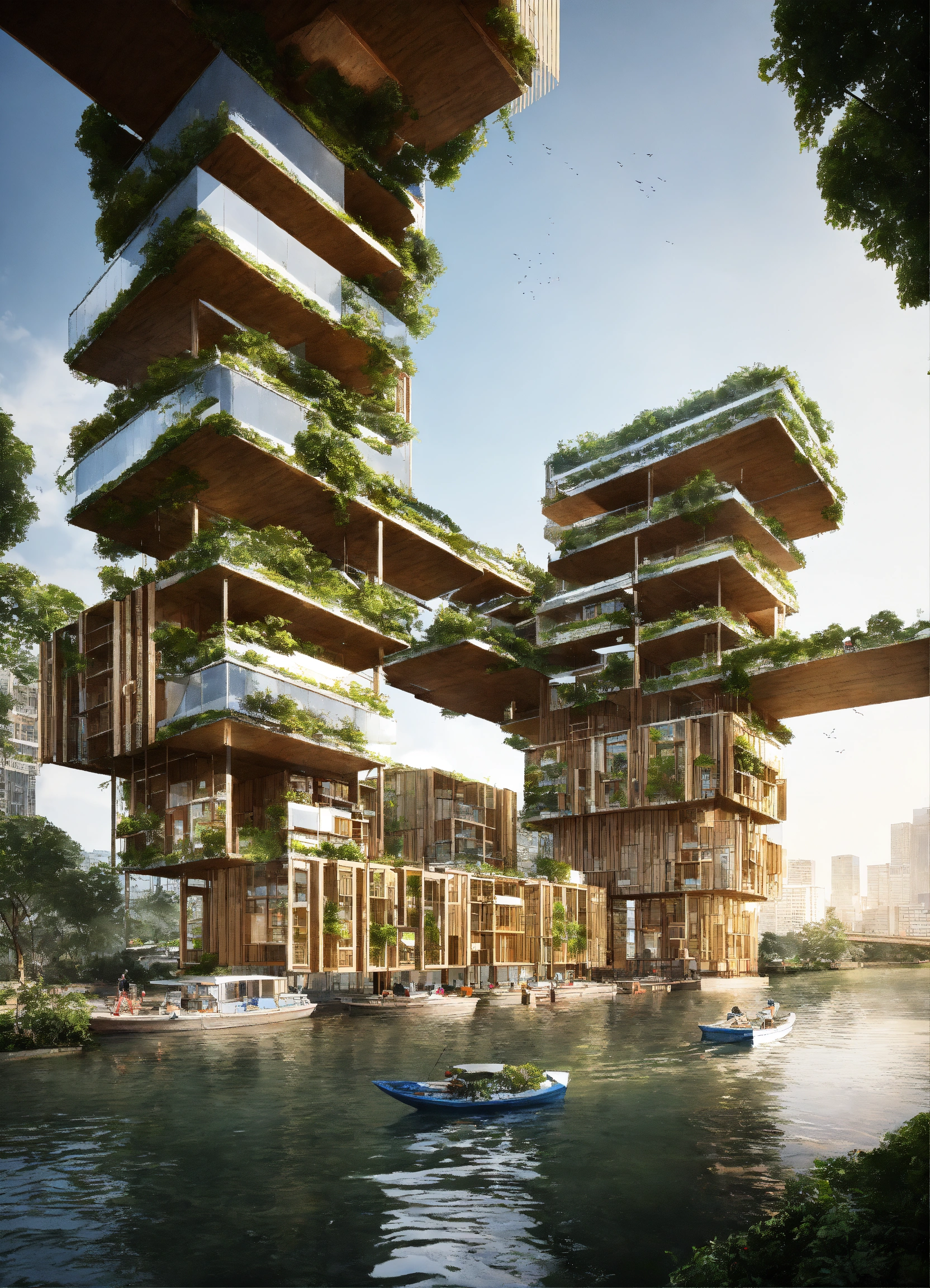 On a large scale, imagine a cluster of floating organic modules as vertical complexes in saigon in 2050 connected to each other into complexes of floating modules above the river tackle the circumstance of affordable housing shortage. the networks would be situated on the thu thiem vacant land alongside the riverside of saigon river, economic centers. these are located throughout the city, providing a safe and supportive environment near entrepreneurship. the designs of these cities draw inspiration from the essence of modern architecture. the energy systems use renewable energy such as passive solar design to address the problem of global warming. it uses natural materials such as bamboo, wood to promote a sense of connection with nature and mindfulness while utilizing metal and concrete to amplify the modernity. the project utilizes innovative design approach such as modular design, parametric design, pre-fabricated.