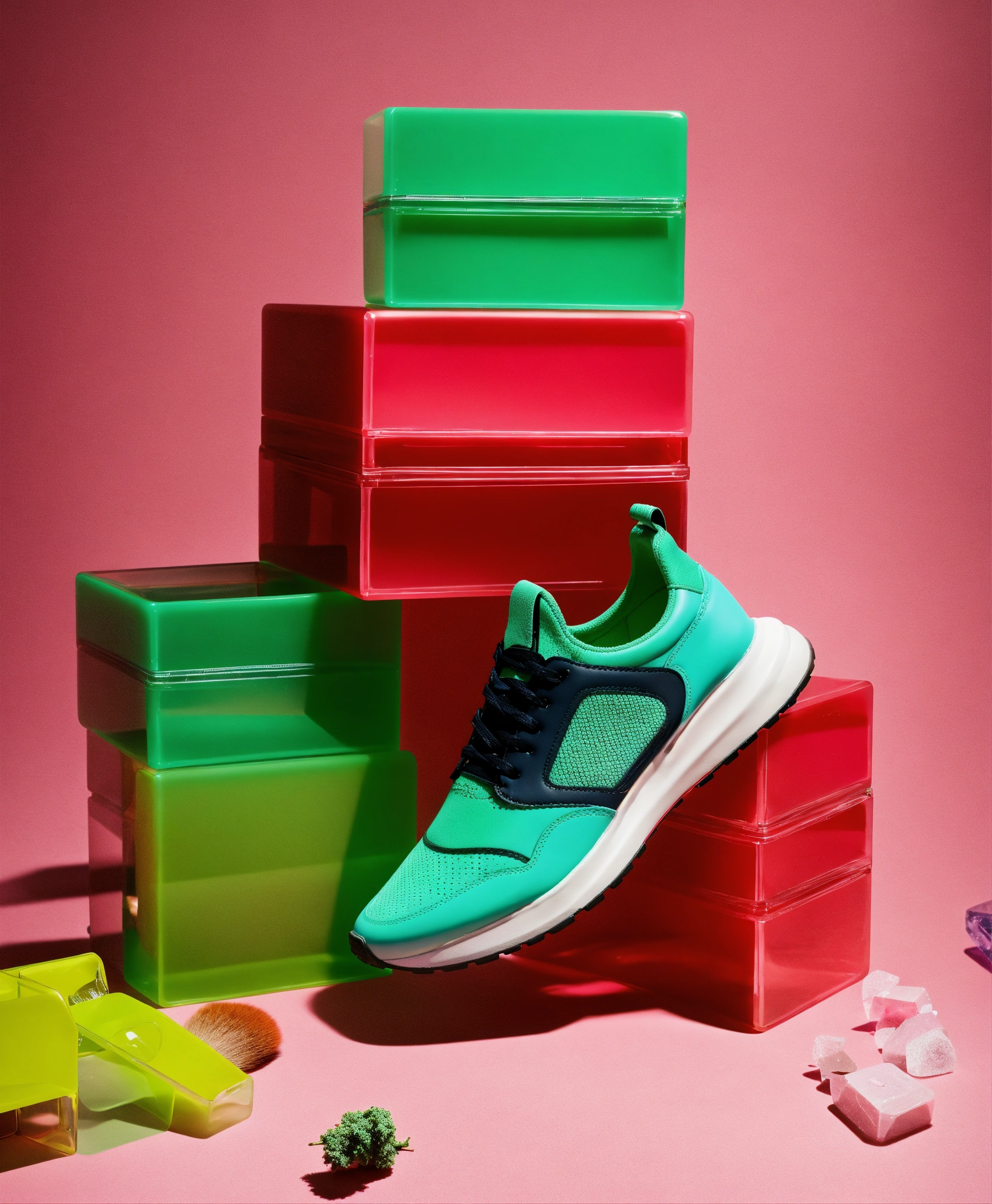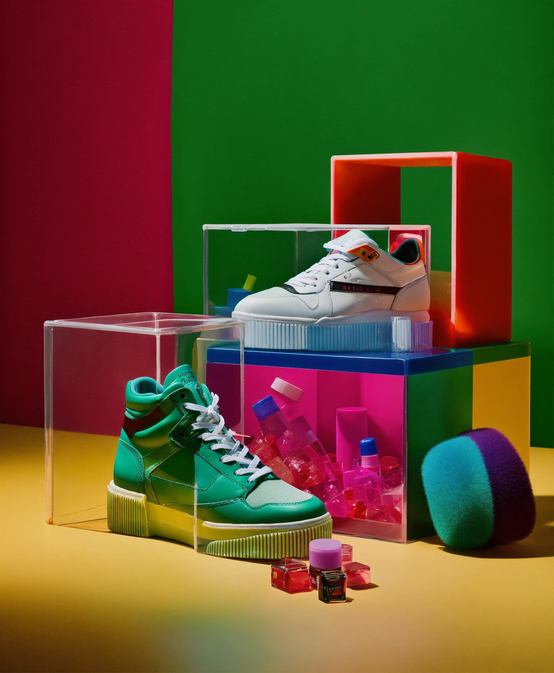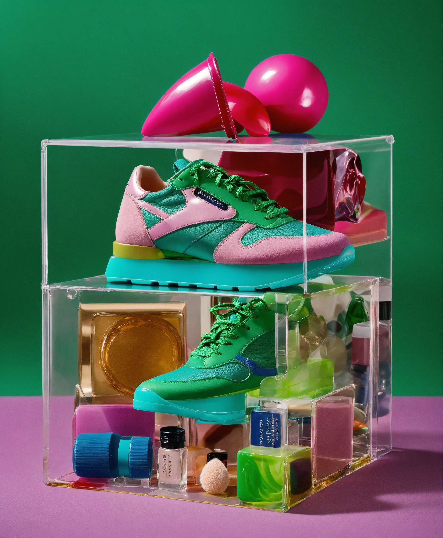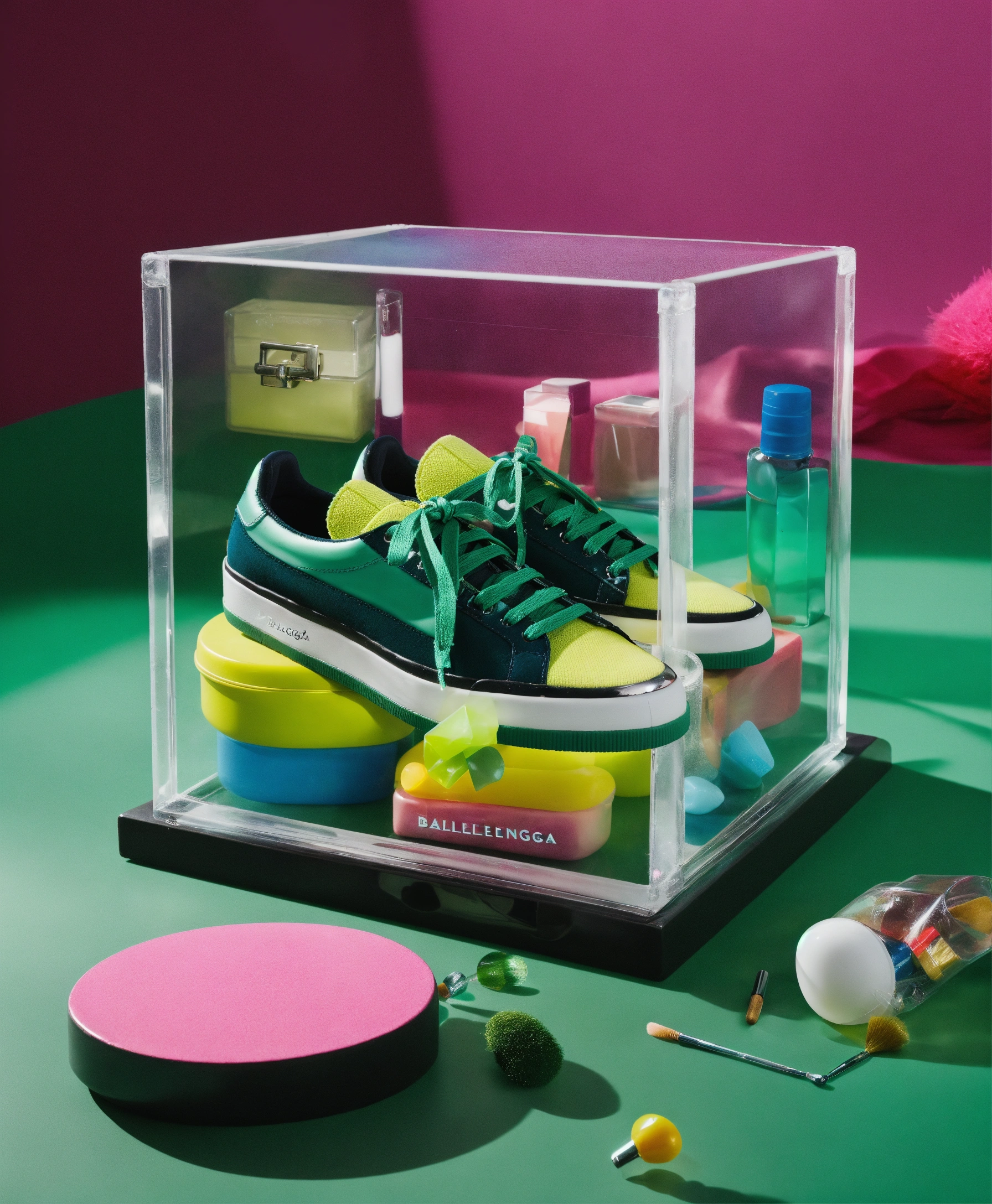 Clear plastic cube full of colorful recognizable found objects such as balenciaga sneakers, makeup. studio photography, e-comm, some green accent color, 4k, solid color background! table top photography! realistic!