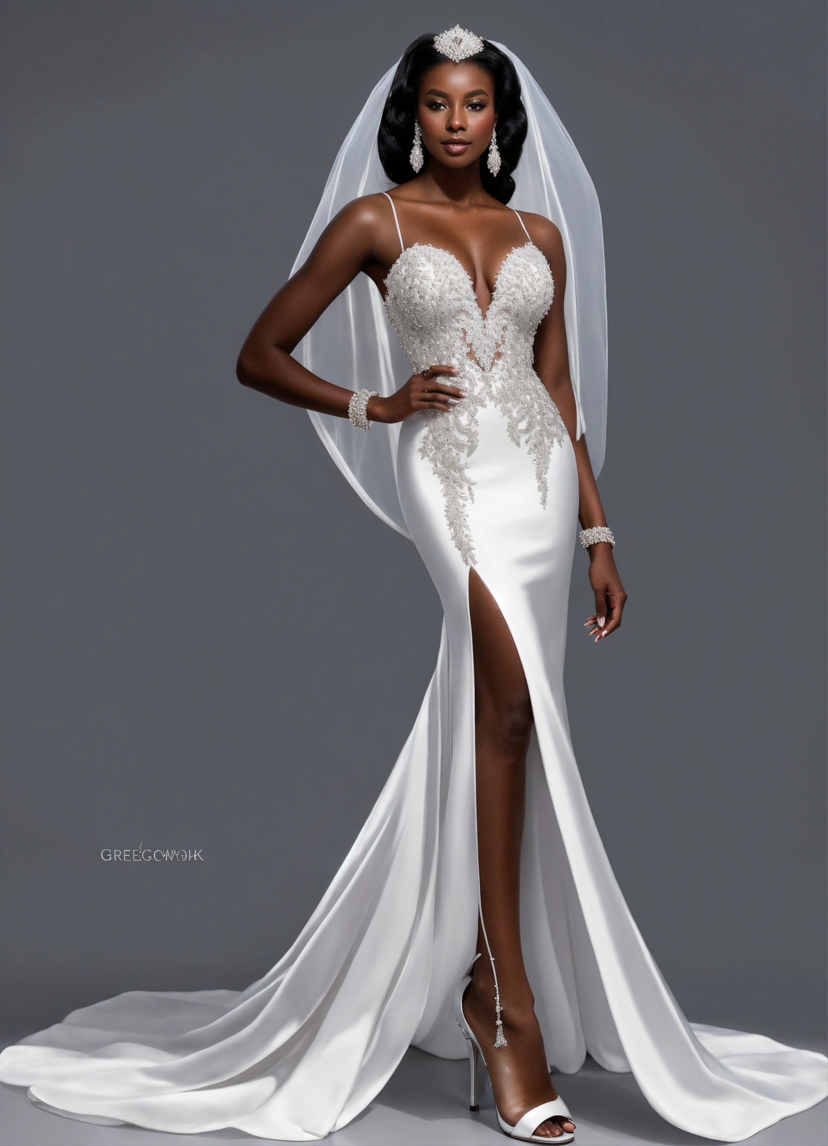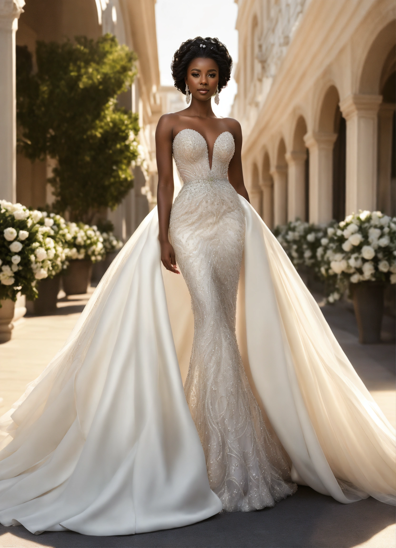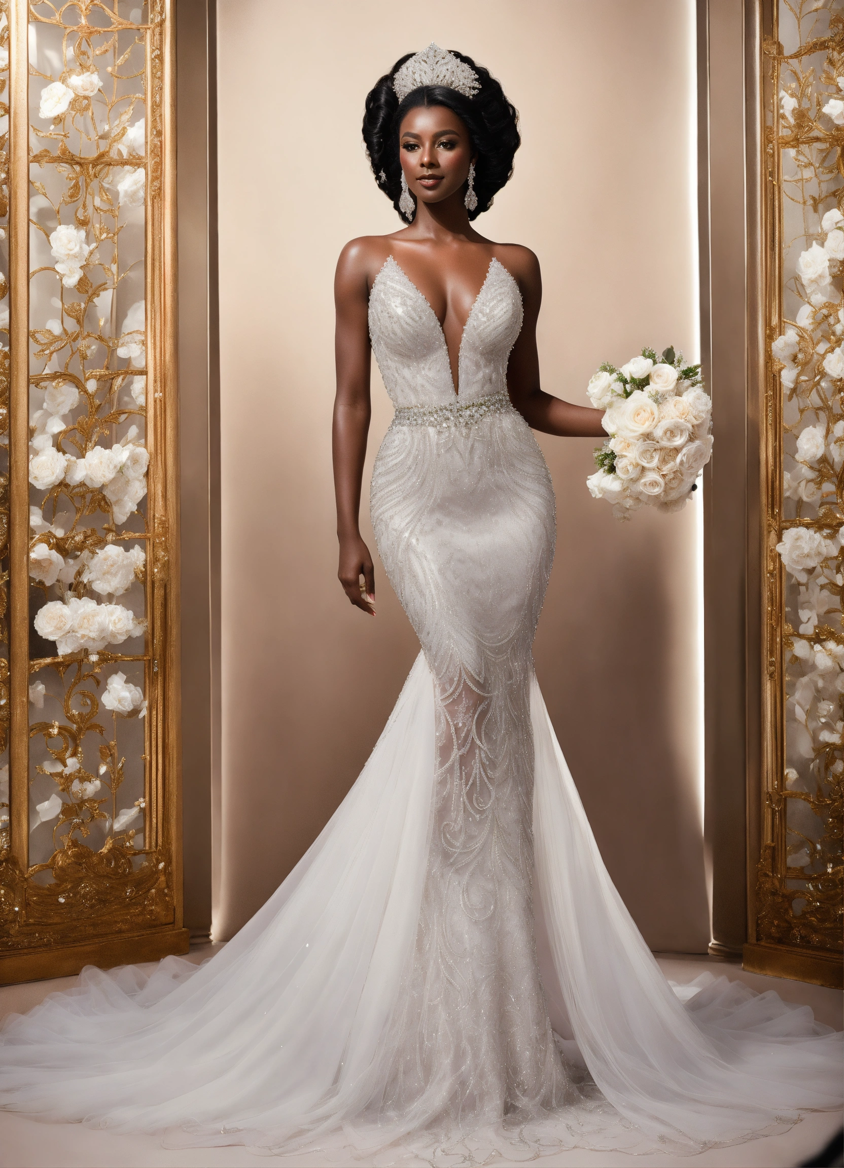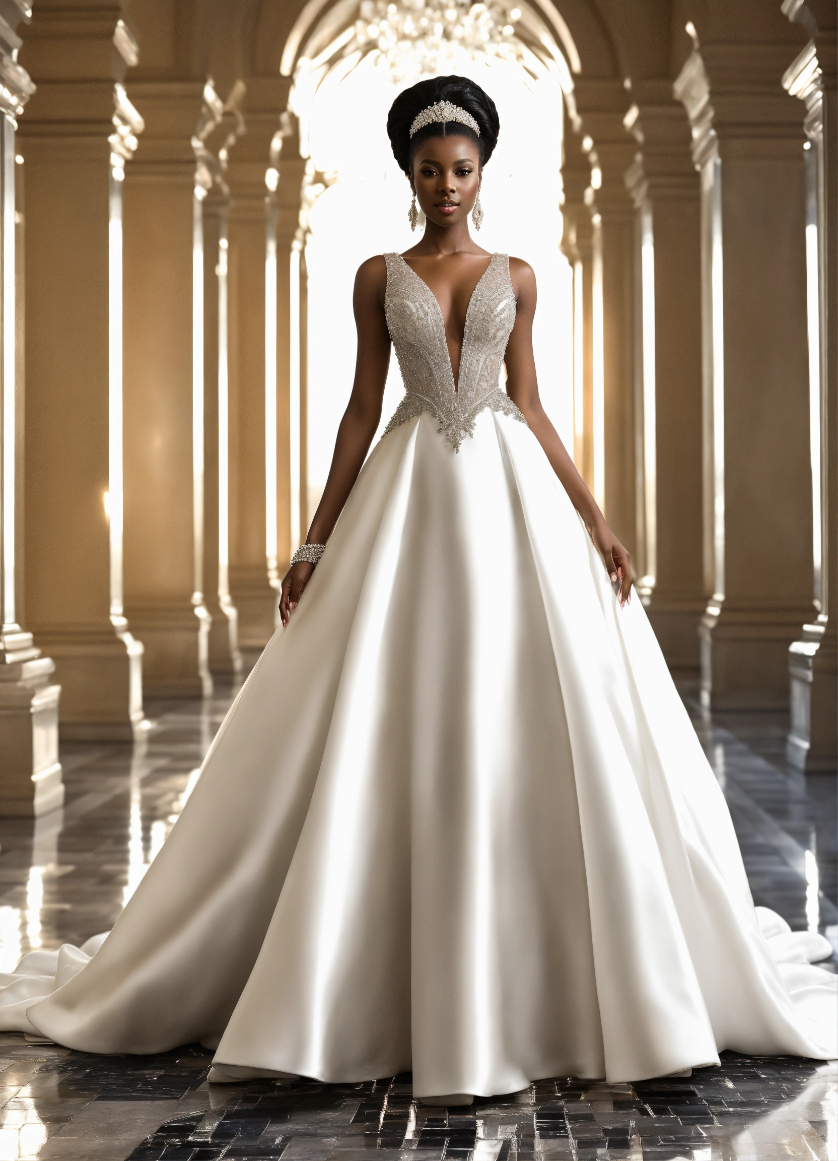 Beautiful dark skin black rich business woman wearing stylish haute couture breathtaking bridal gown with sheer swarovski crystal beading top, ball gown skirt, outfit white clothes for millionaire wedding, silver stiletto heels, detailed line art, fine details, no background, full body view, top of hair, top of head to toe, center, solid white background, greg rutkowski