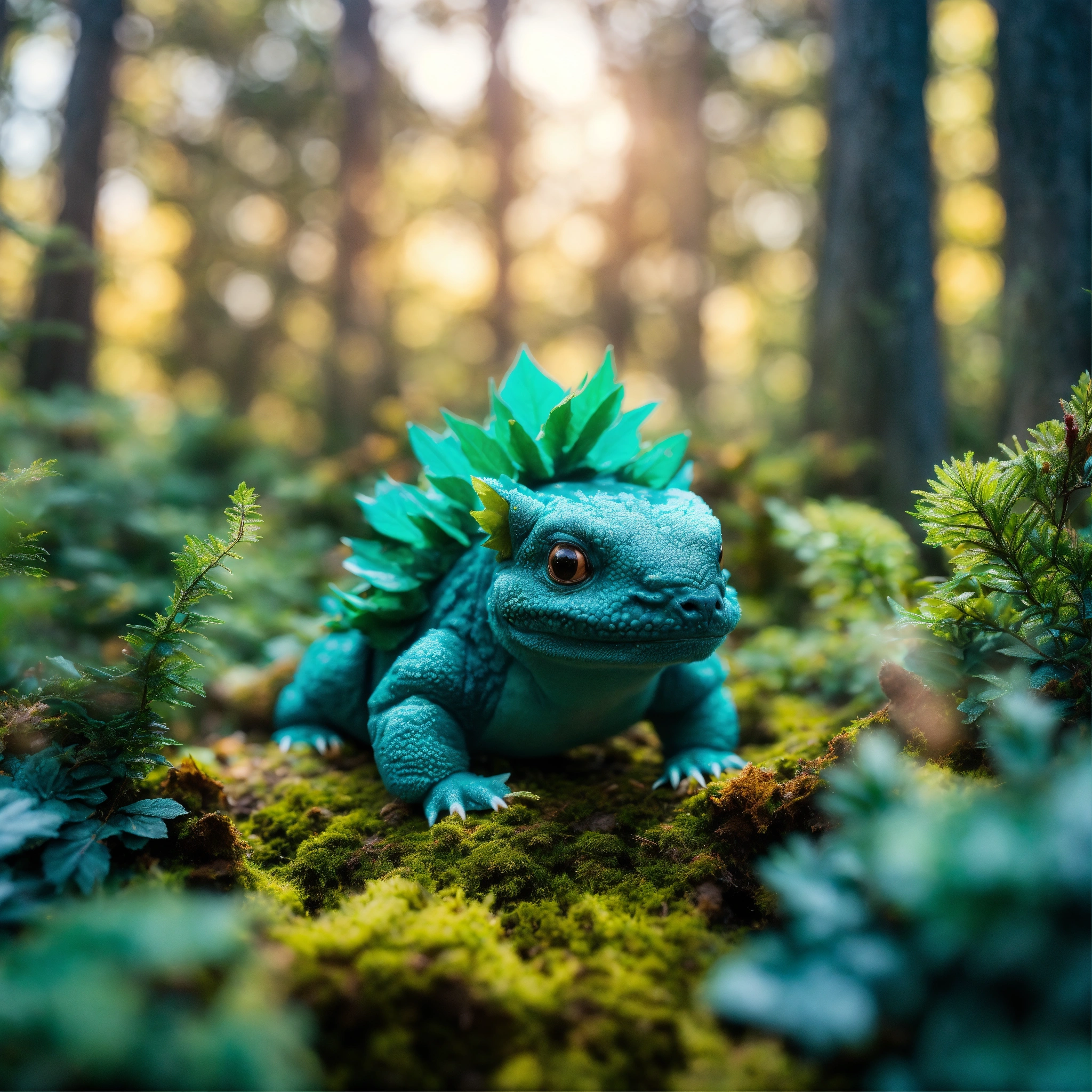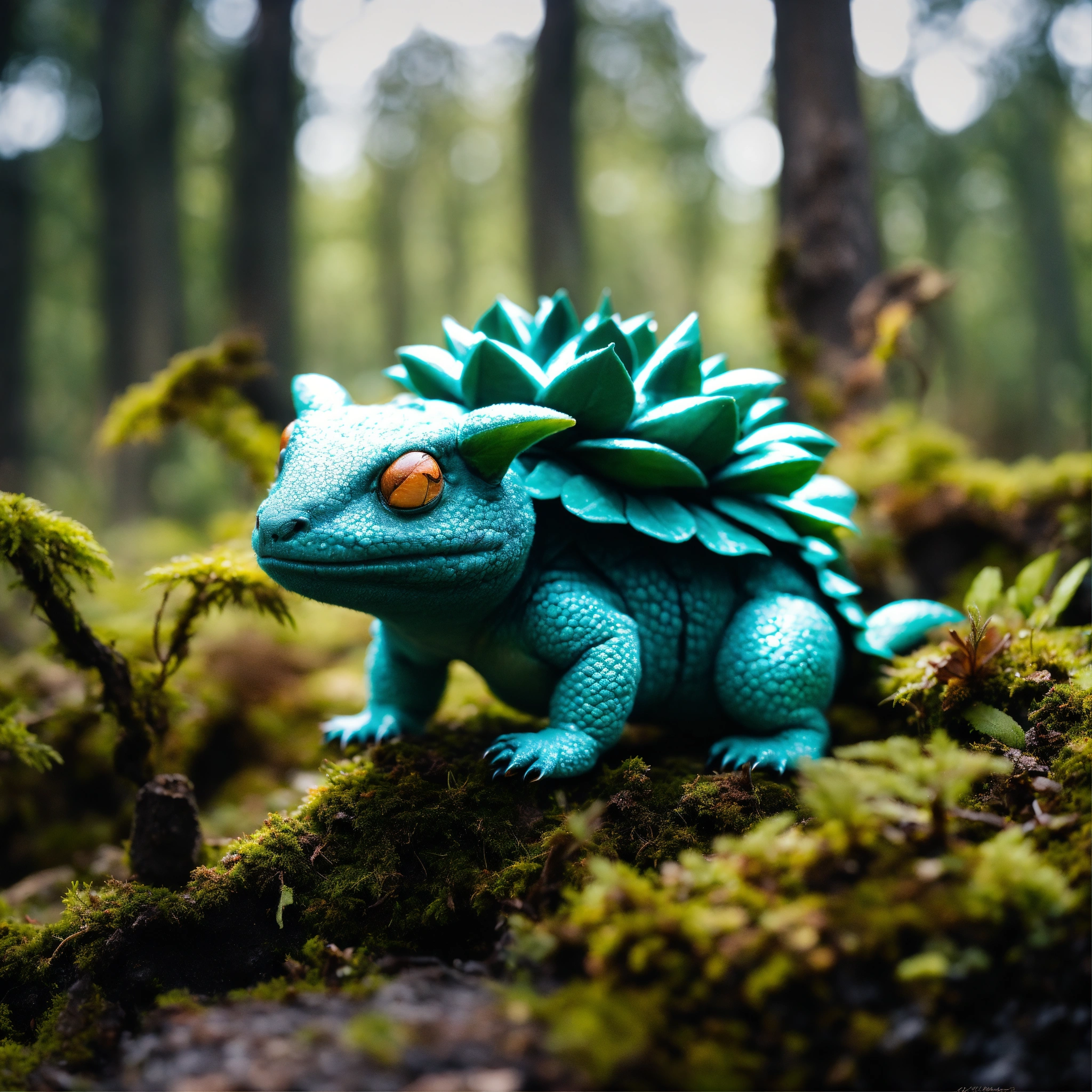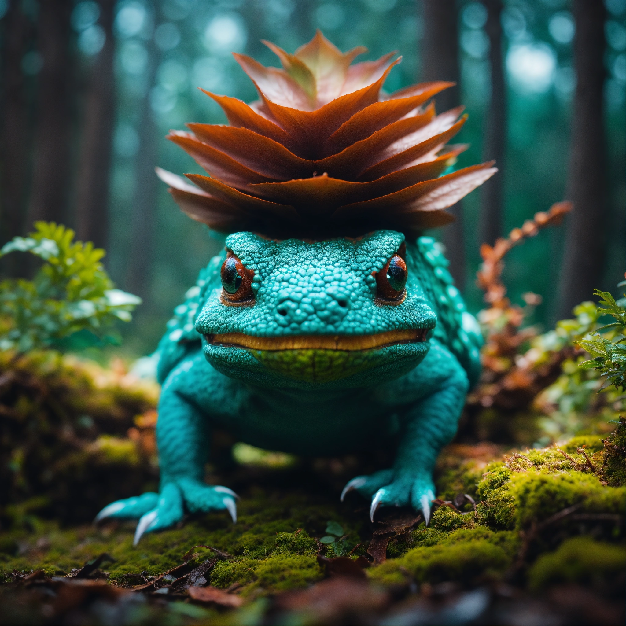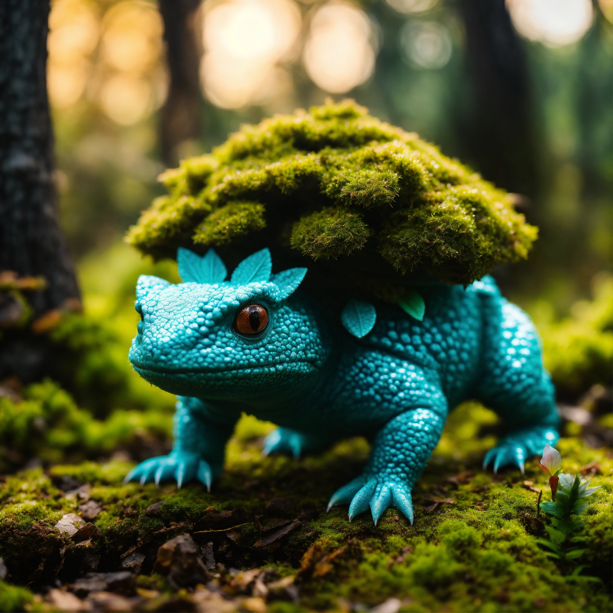 A realistic venusaur animal among the trees, forest lake, moss, cold weather, dark teal and amber, sony a7 iv