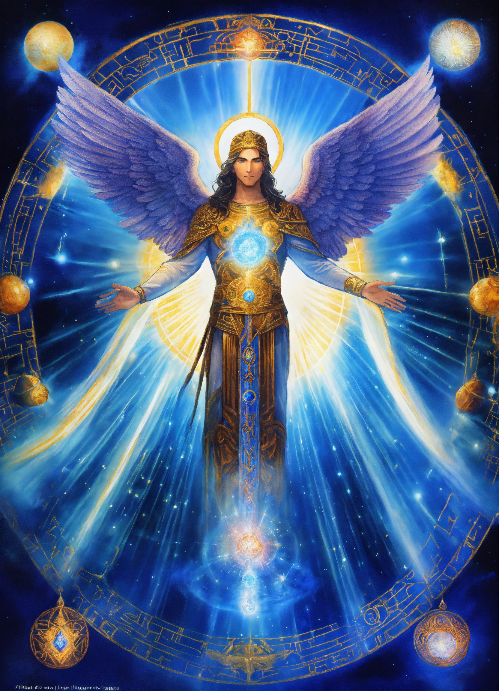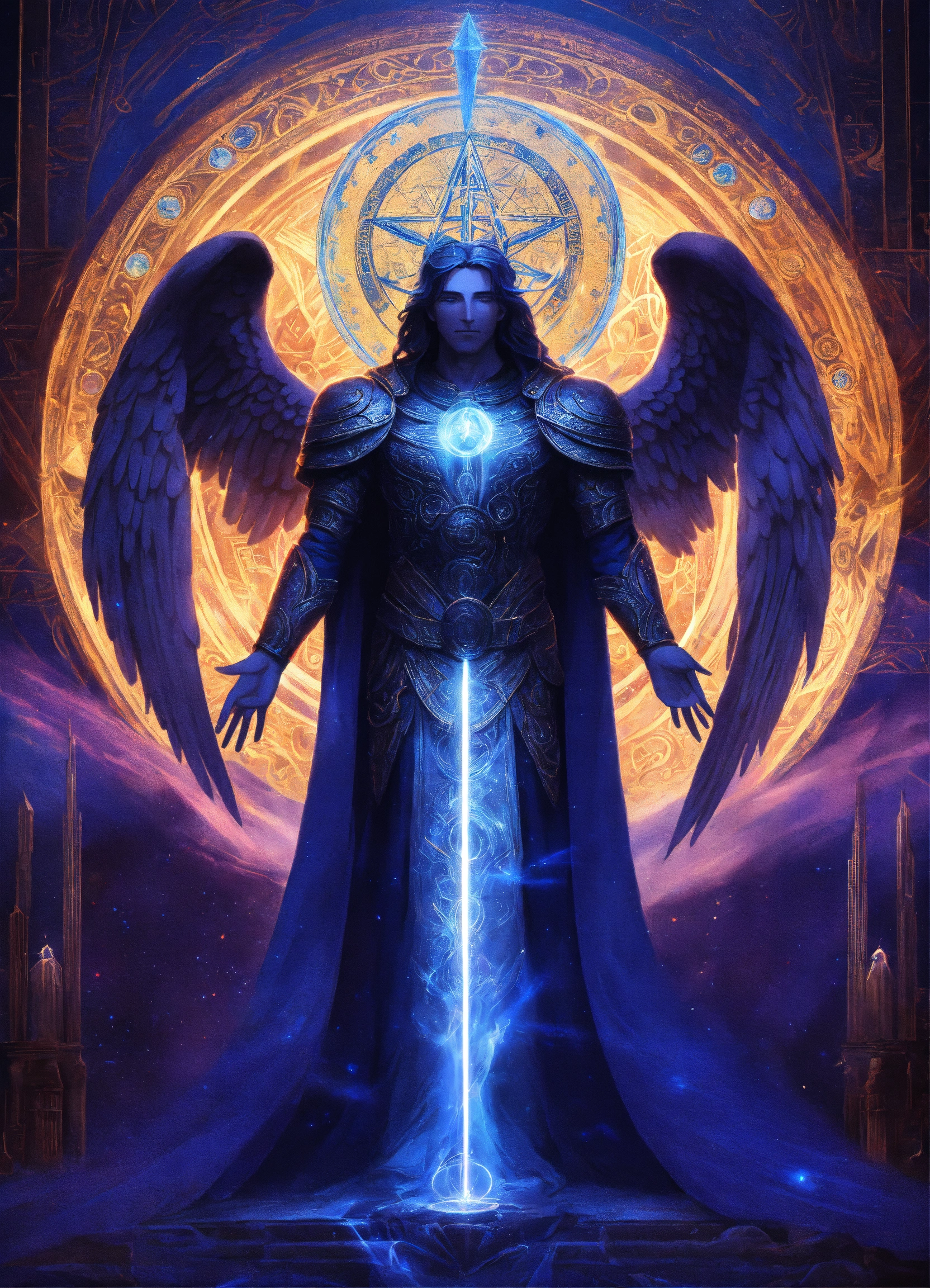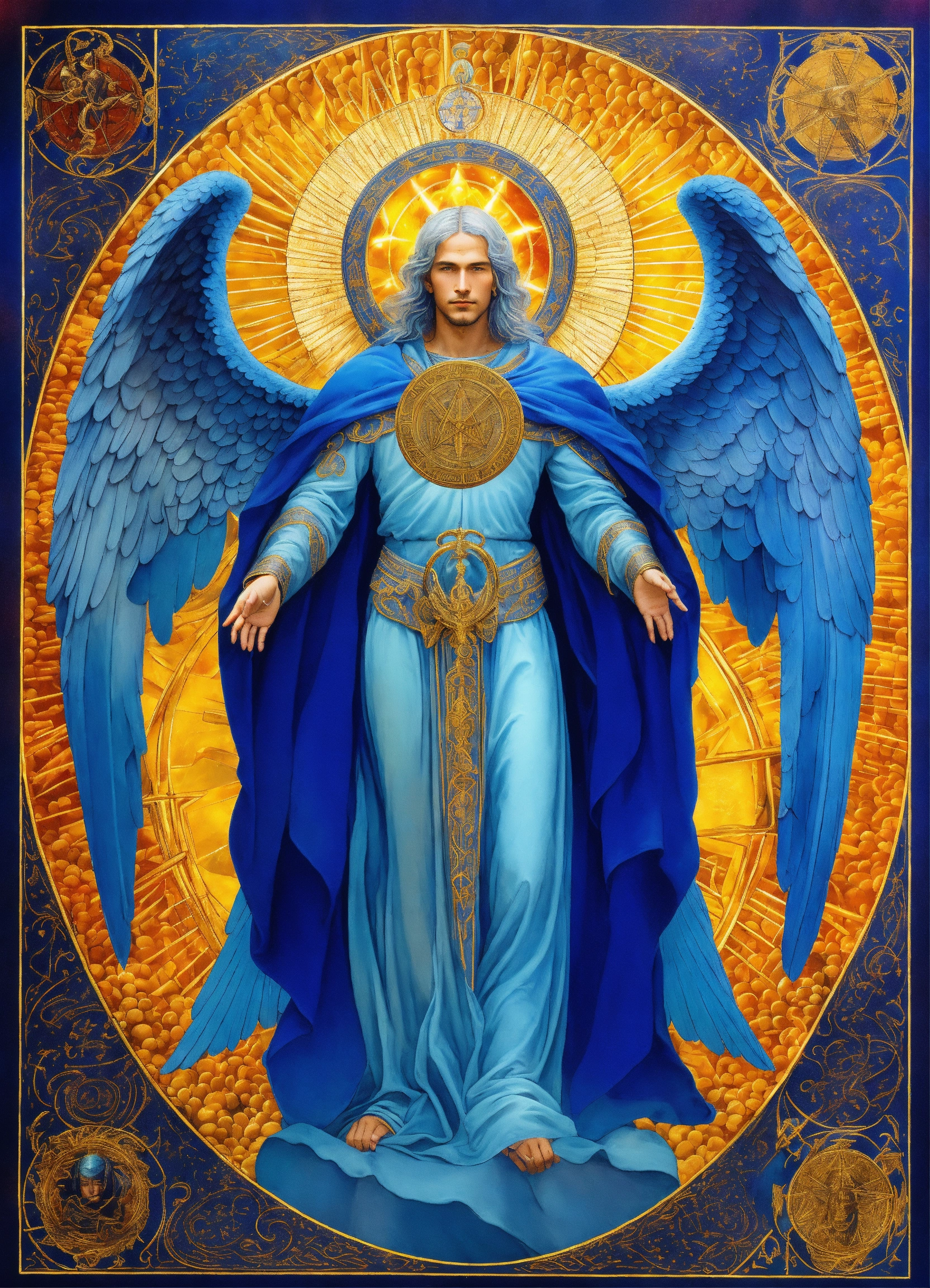 Archangel michael with an elderly visage, mystic emblem presence, prismatic aurora lights, blue beams, surrounded by divine messengers, saphir an indigo blue beams of light, lightballs, mystic emblem, esoteric sigil, strong presence, enigmatic glyph