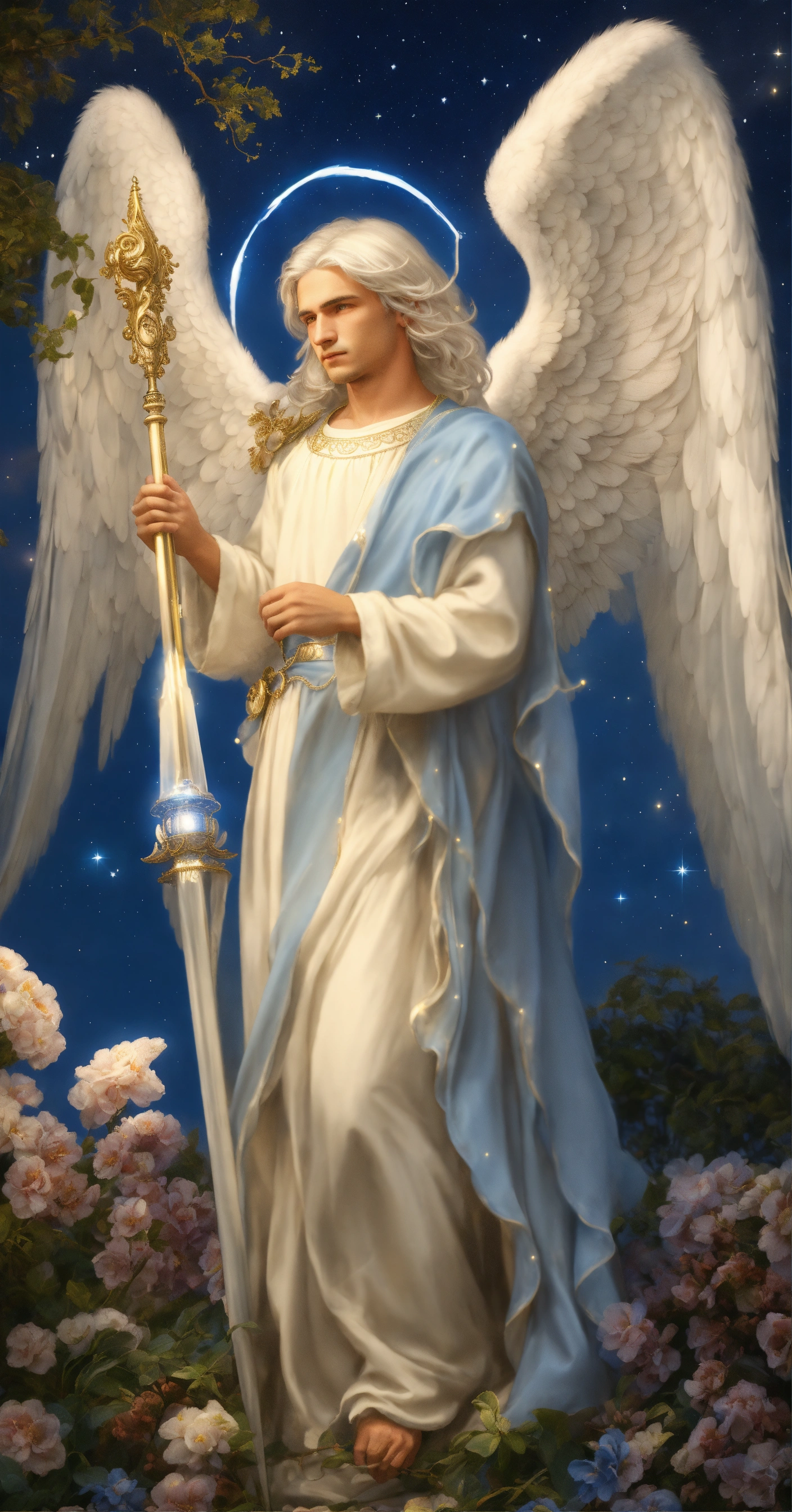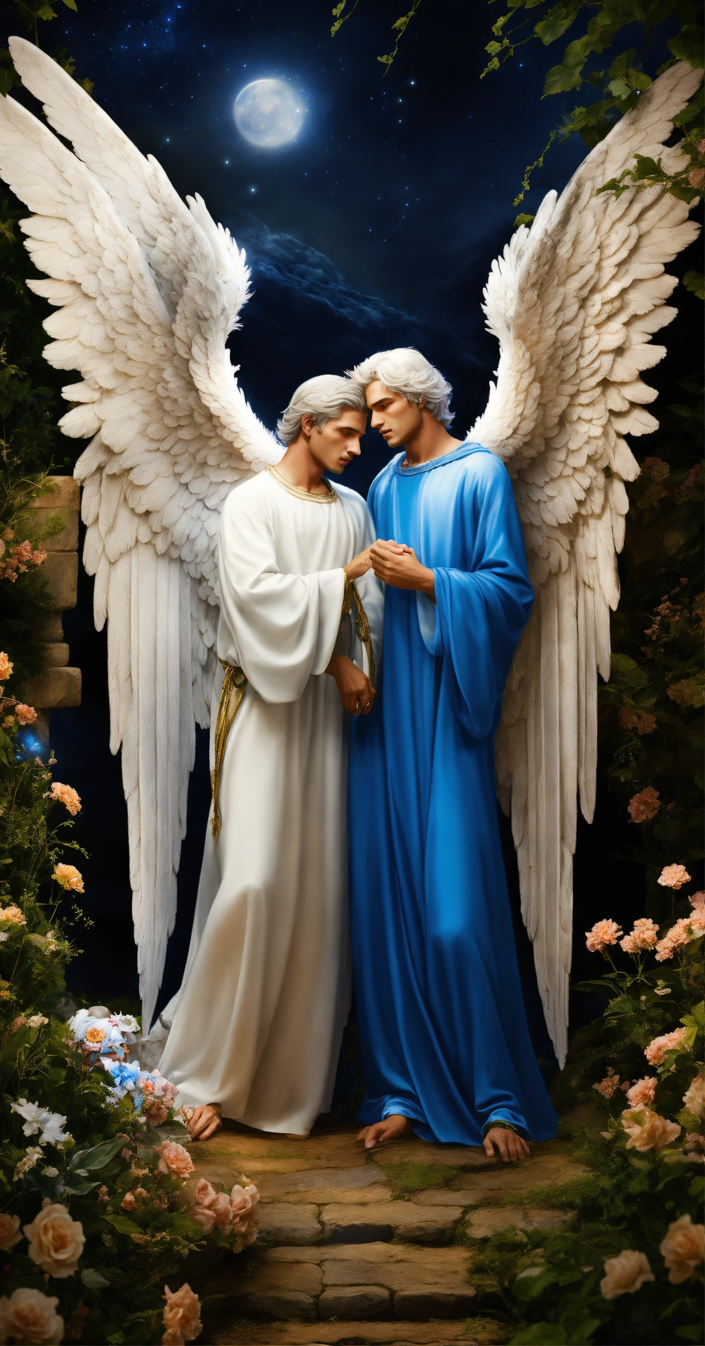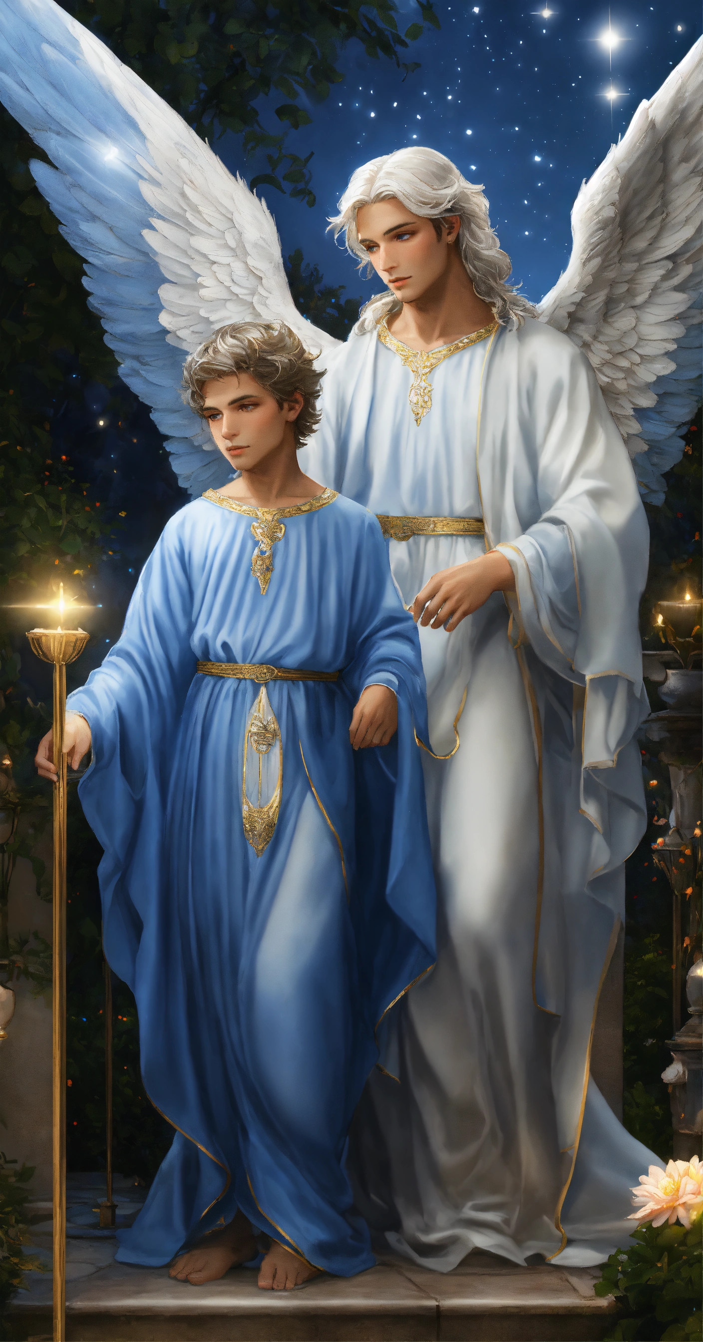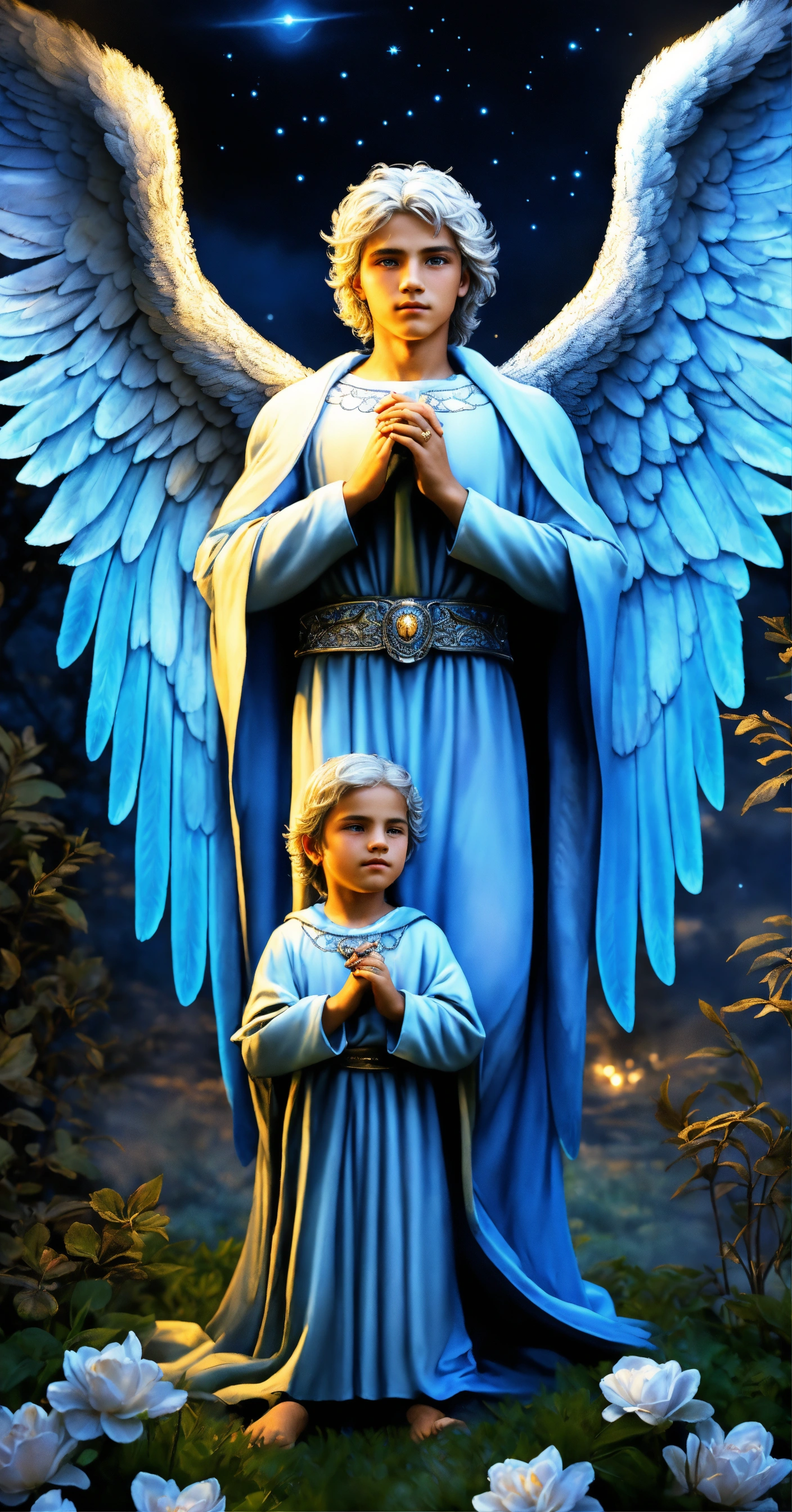 2 male guardian angels with detailed and luminous blue angel wings. 1 30-year-old male angel protecting a 9-year-old male angel child. the 2 male angels have large, uniform luminous blue wings. their faces beautiful and detailed. very clear eyes that open with a deep and penetrating look. detailed and manly short white hair. blue tunic-type dresses with many silver details. they are in a beautiful, detailed garden with a night sky. hyper-detailed, hyper-realistic illustration. realism. masterpiece. digital art, hd, high quality. high definition, high definition. 8k.
