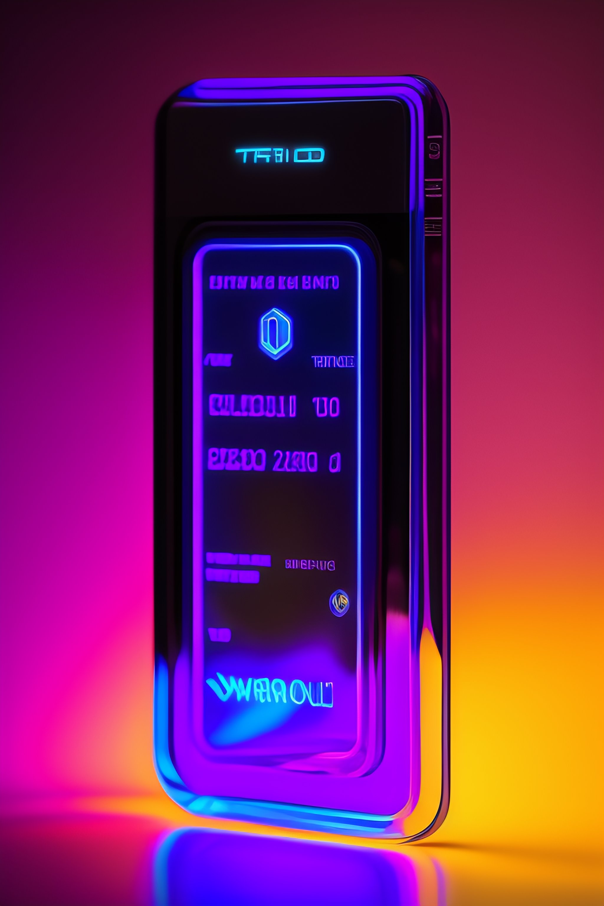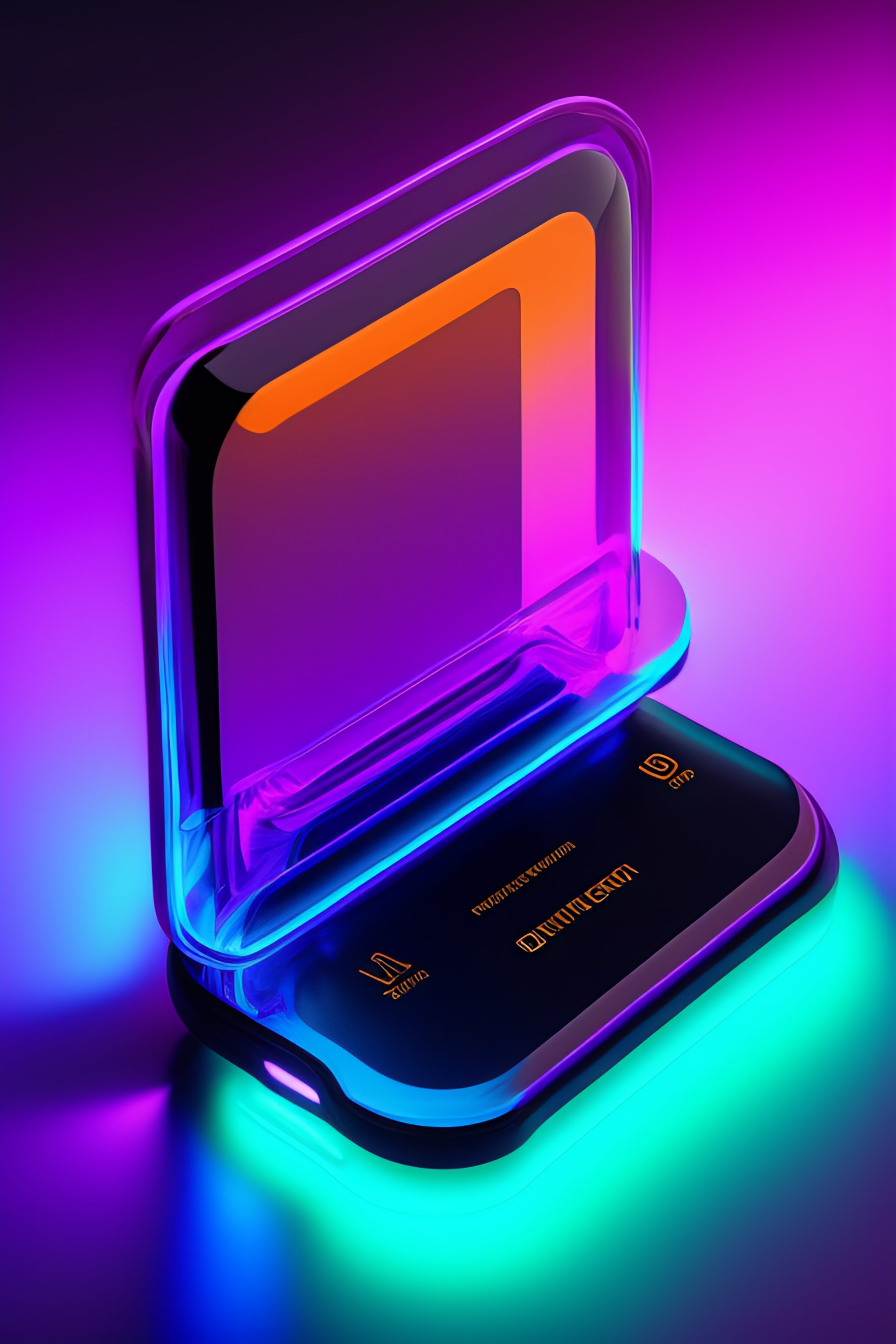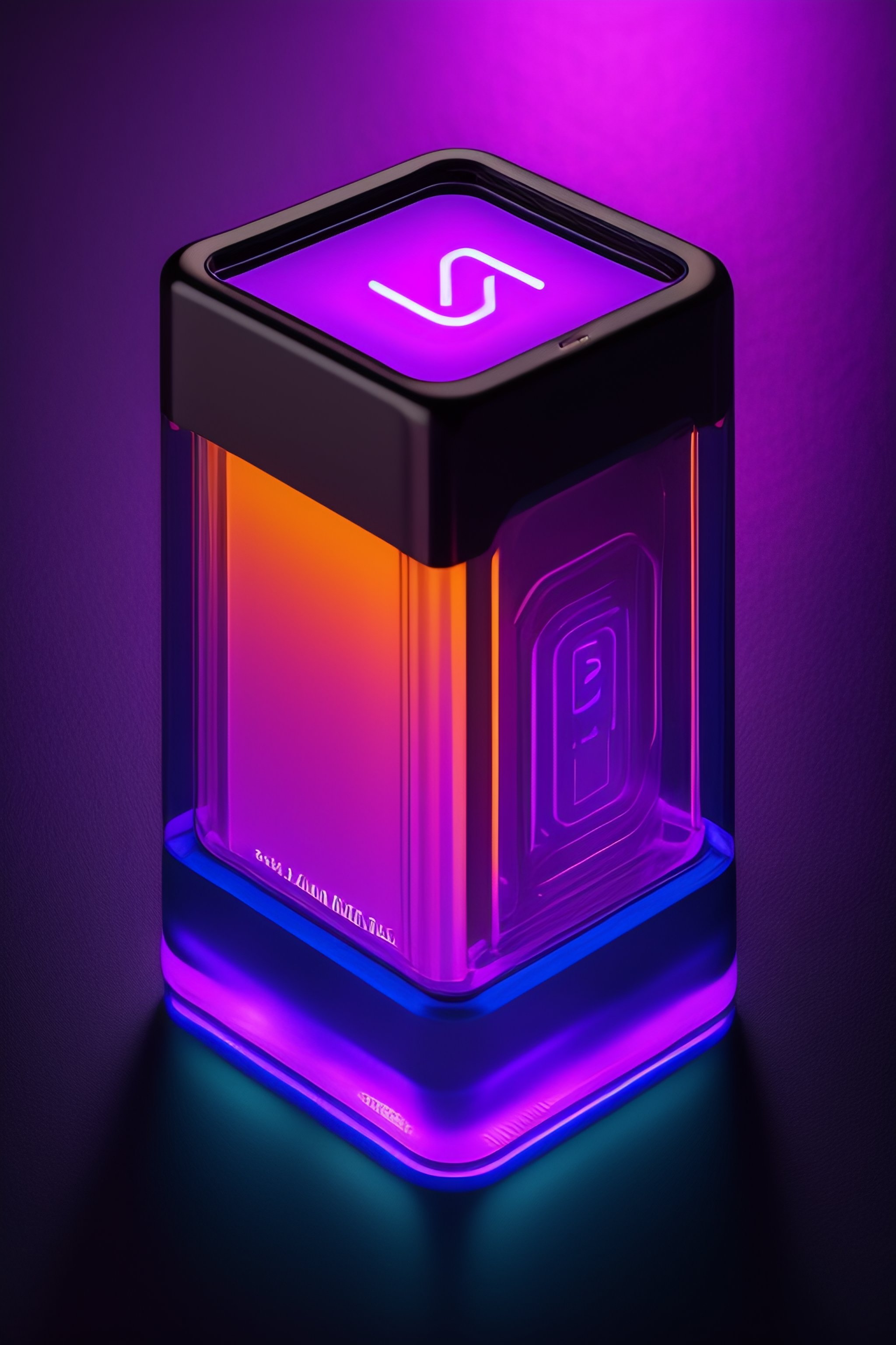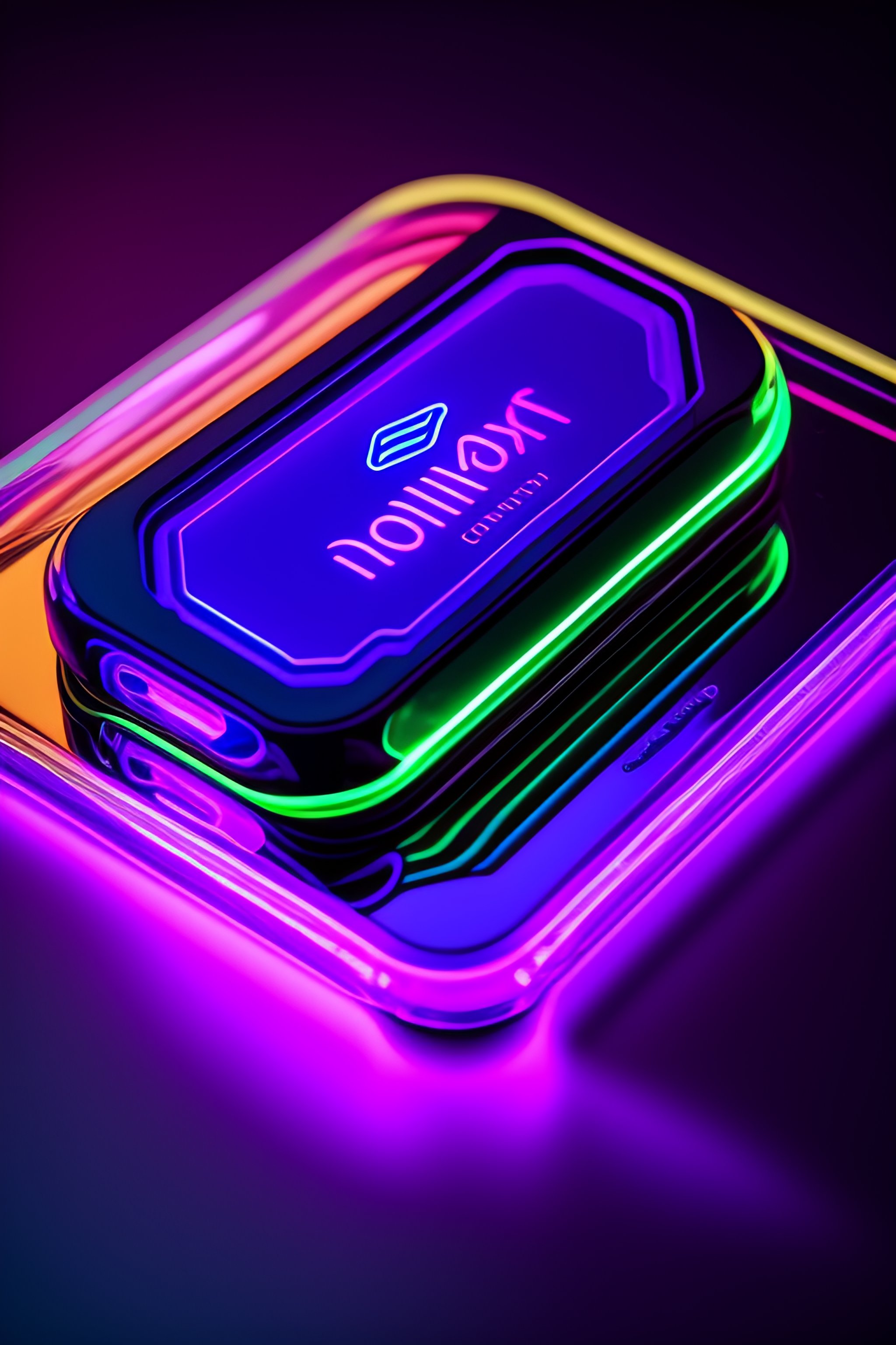 Floating and rotating access card made of neon purple glass floating with a dark cyberpunk background