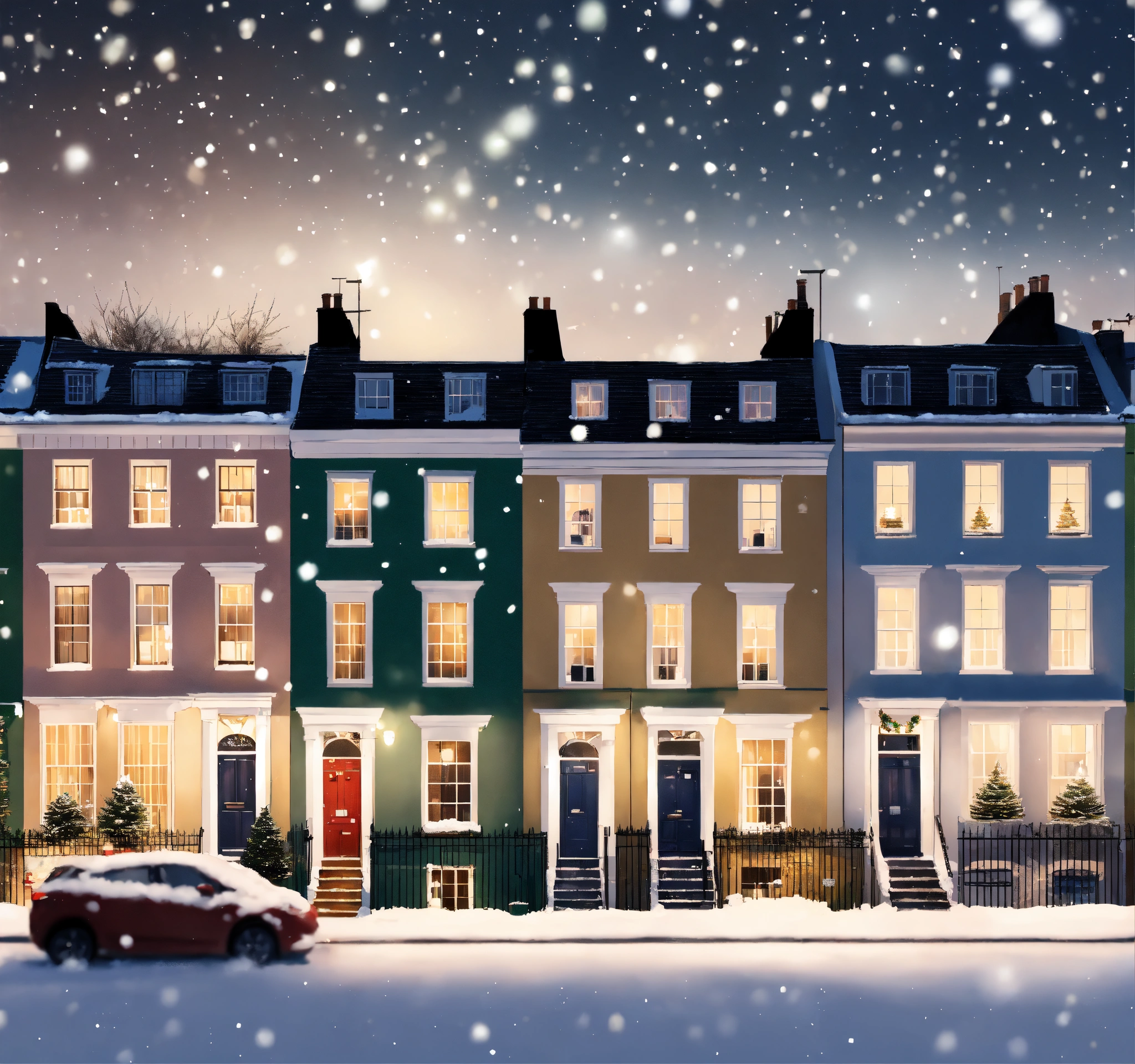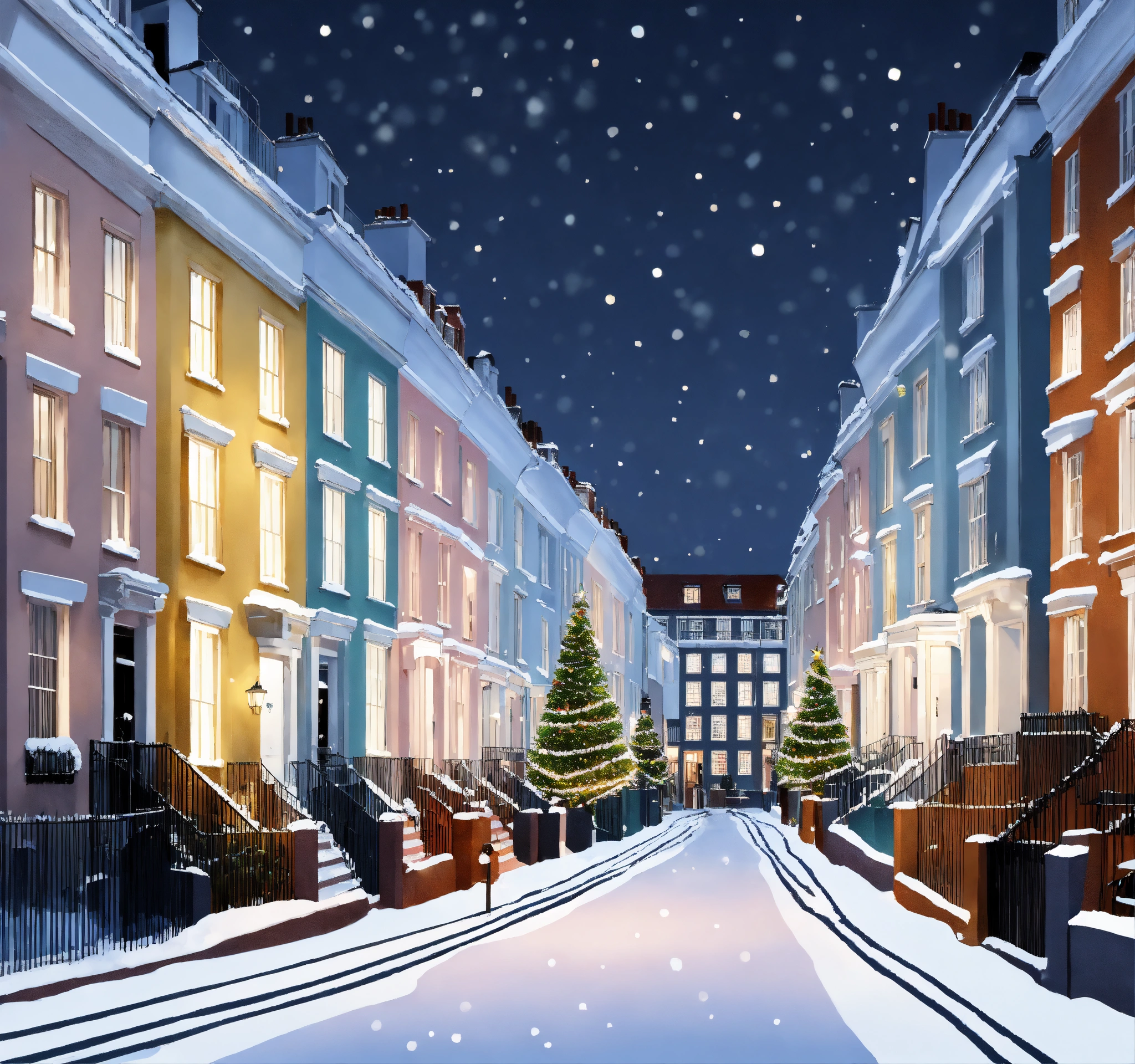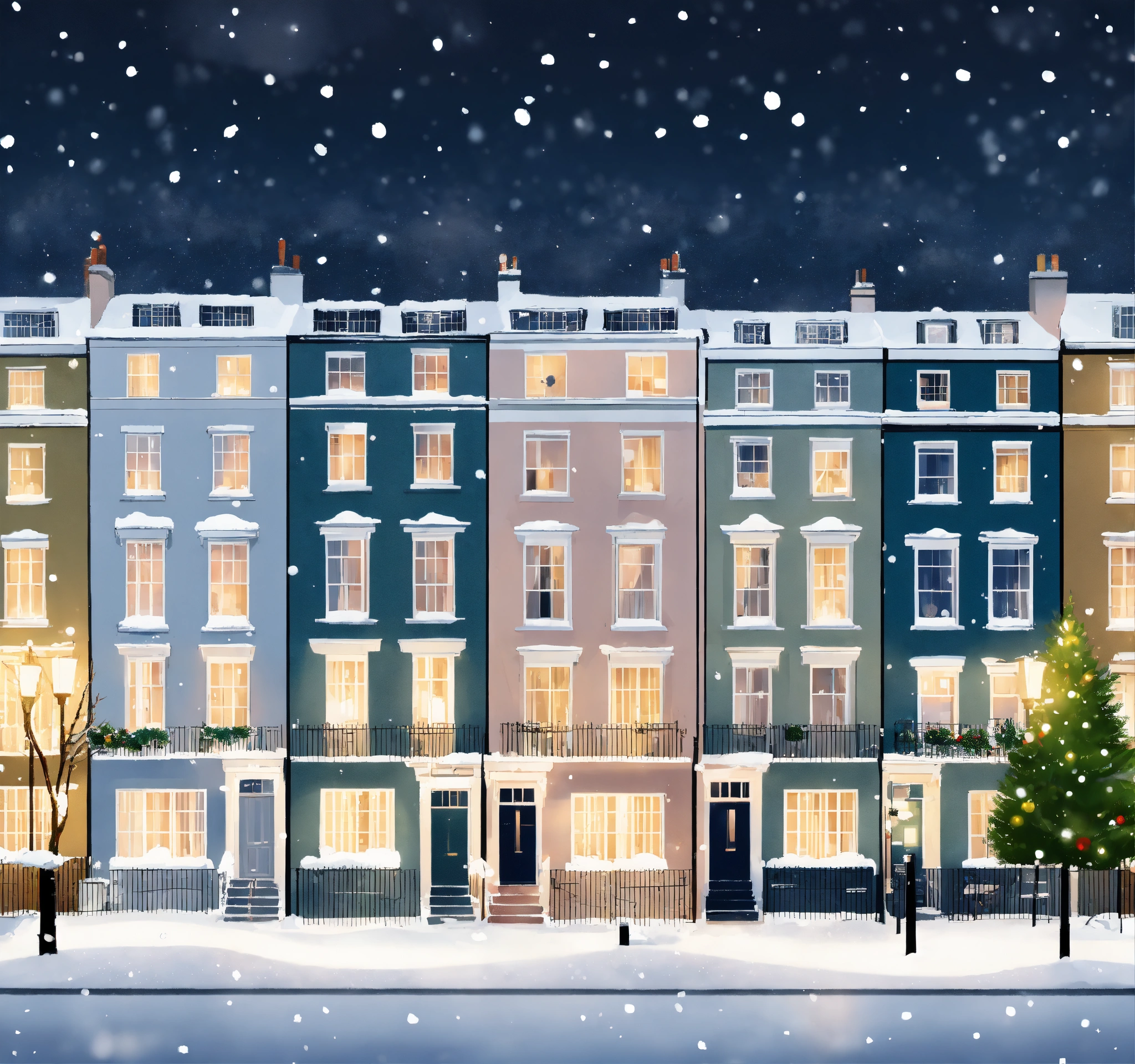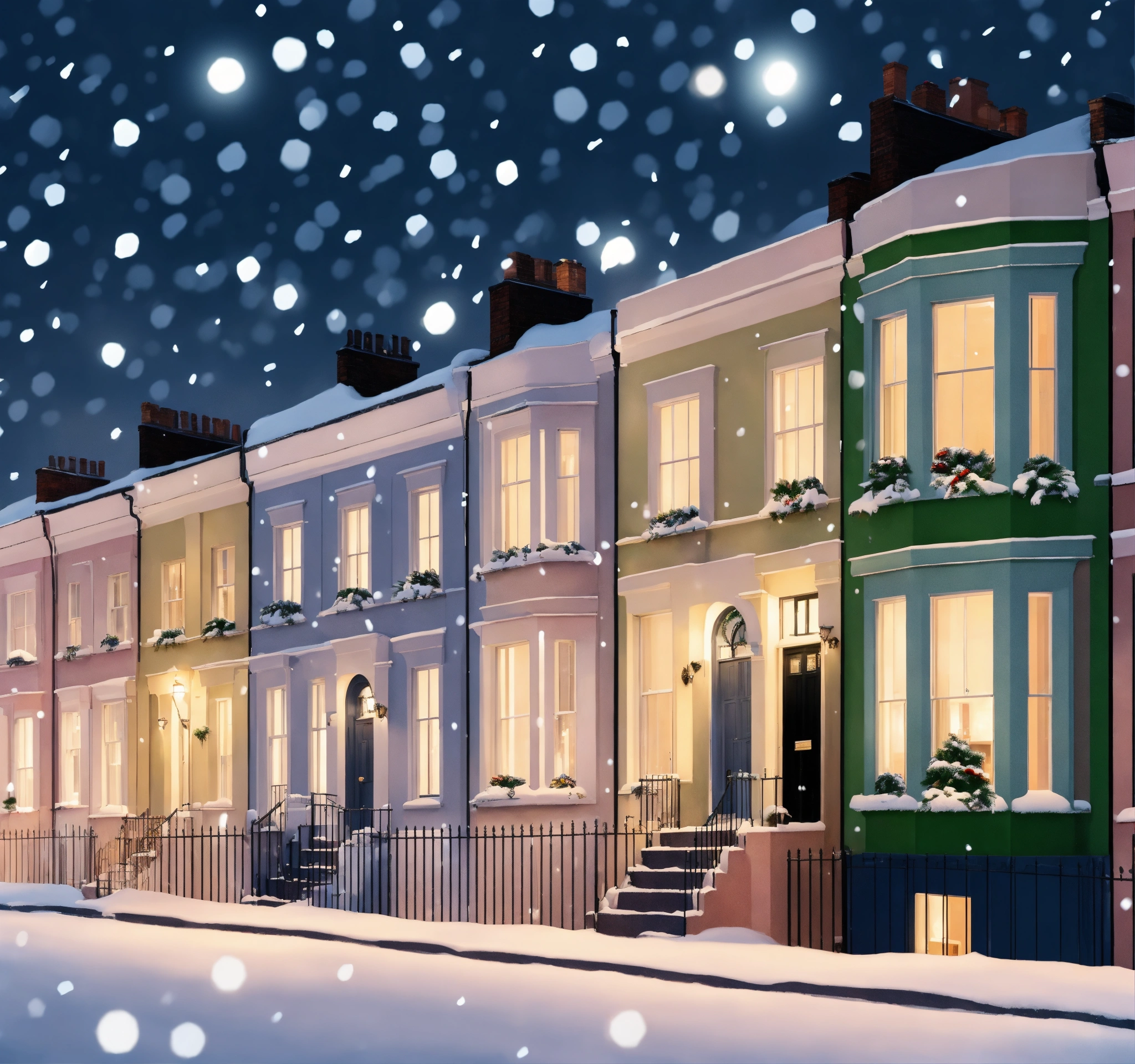 Realistic illustration of five houses on a notting hill type street in light colors on a snowy christmas night. all the houses look complete. no cars. there is bokeh. all the houses are seen from the front, and completever detalles