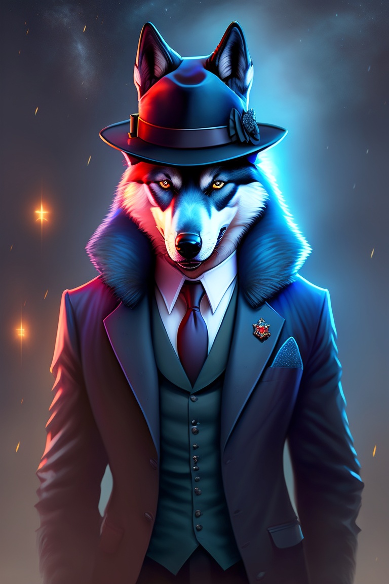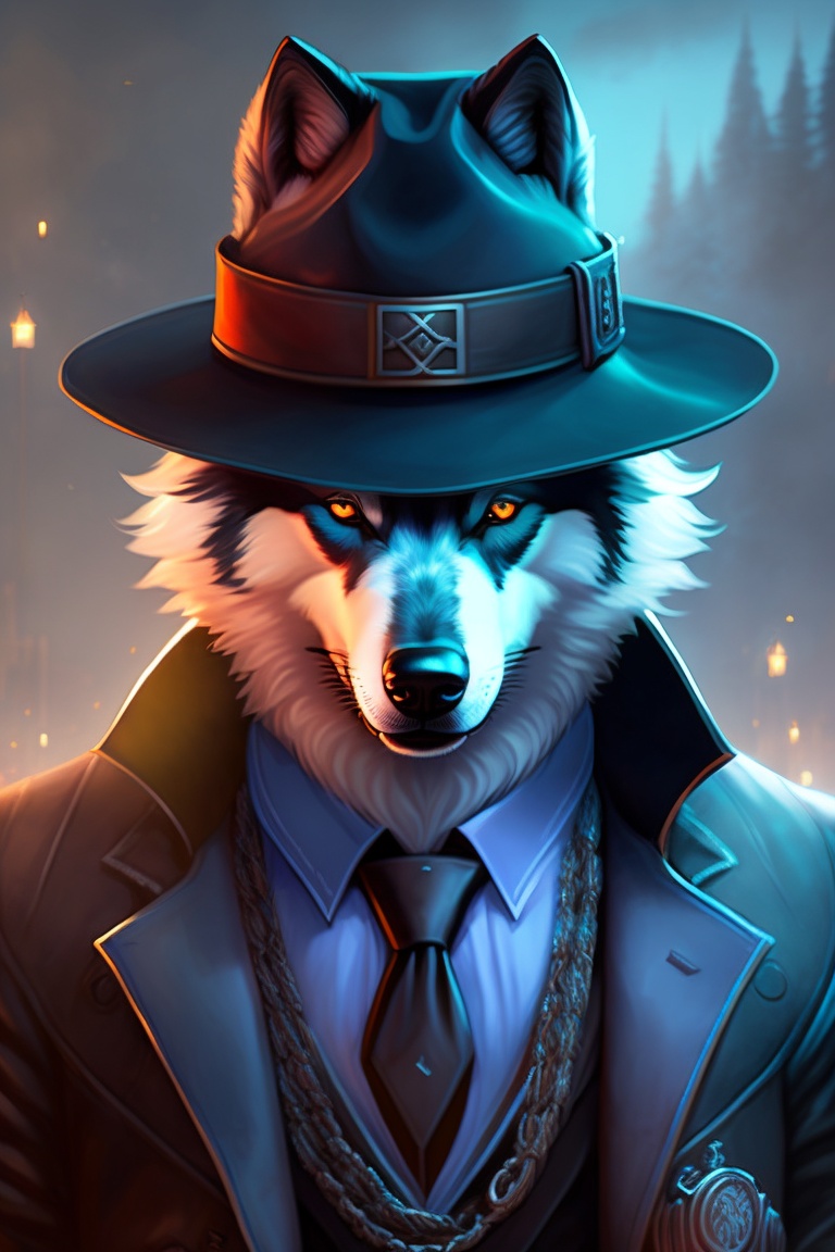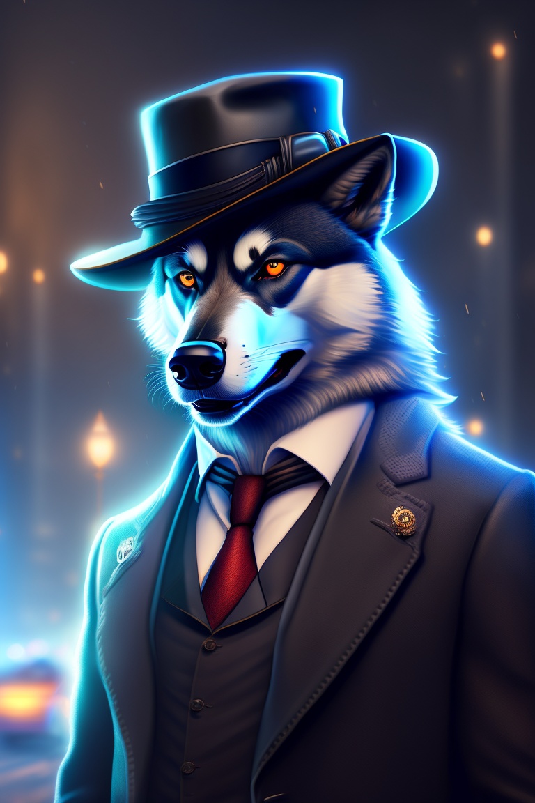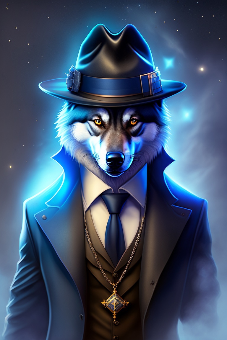 A tall scary wolf at night who is furious and angry, wearing gloves and bleeding from his mouth and hands has blue eyes and is wearing a black coat with a black tie and wearing a fedora hat with a cross necklace
