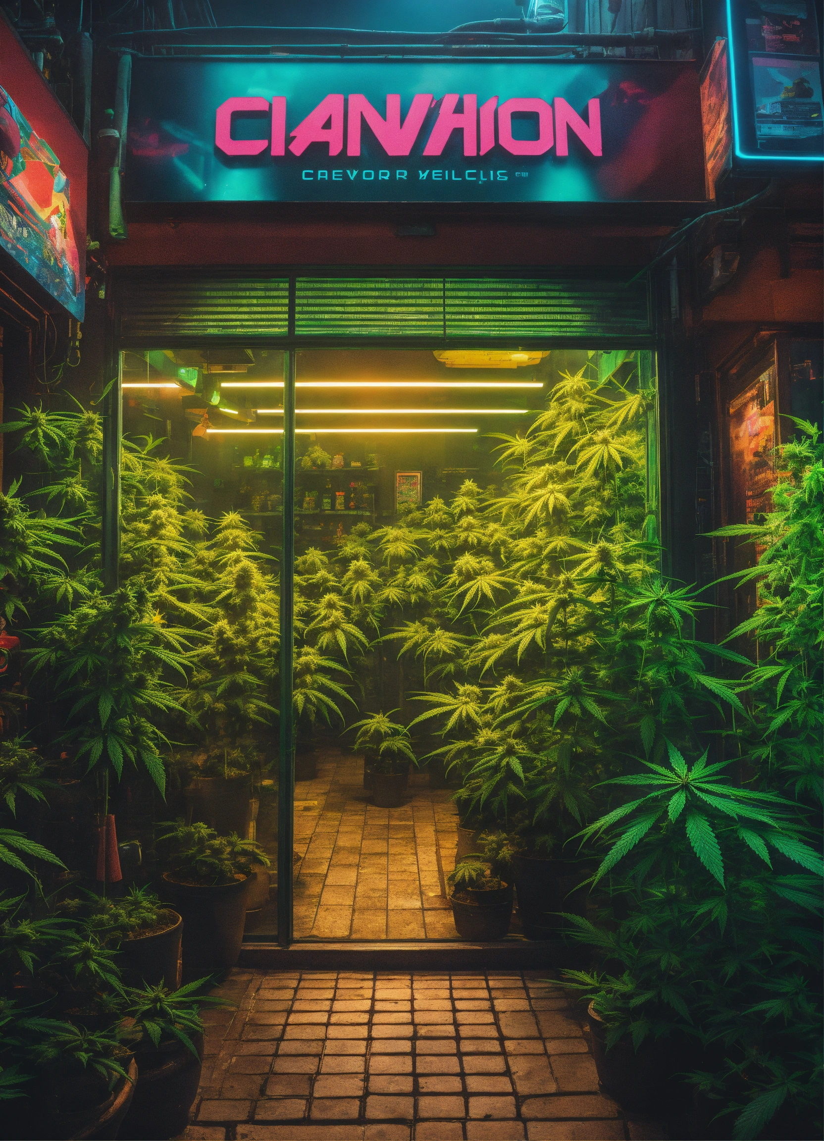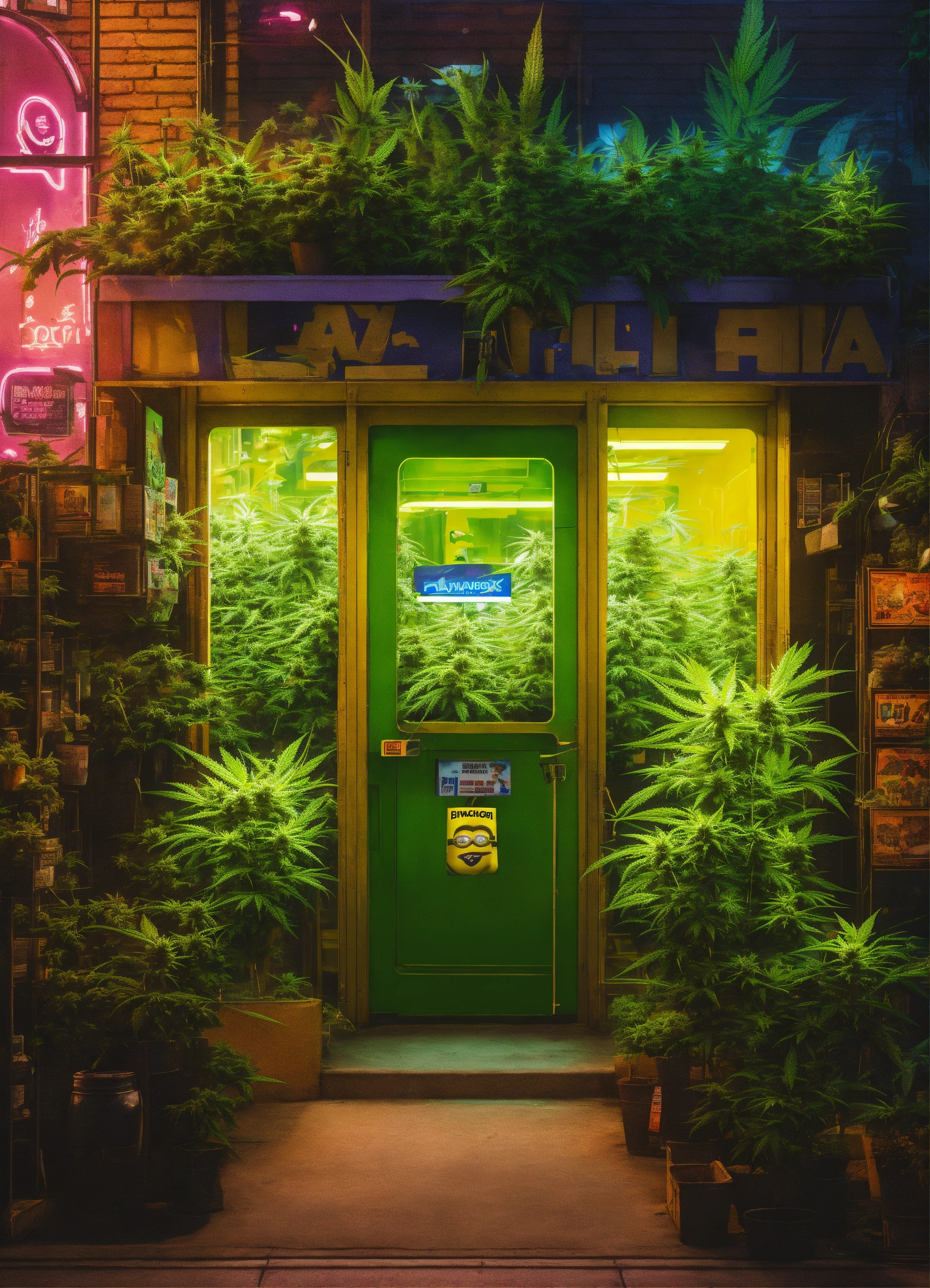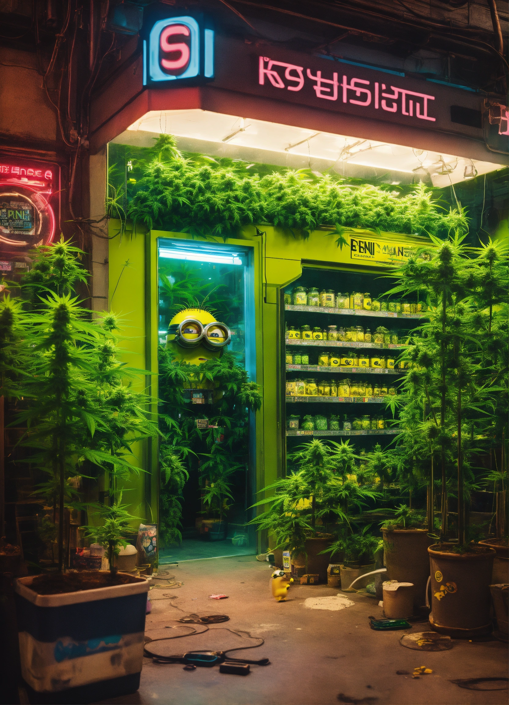 Cyberpunk advertising poster of store surrounded by cannabis plants and minion inside