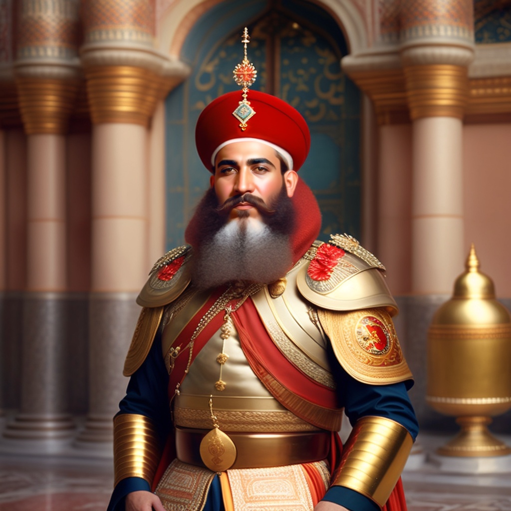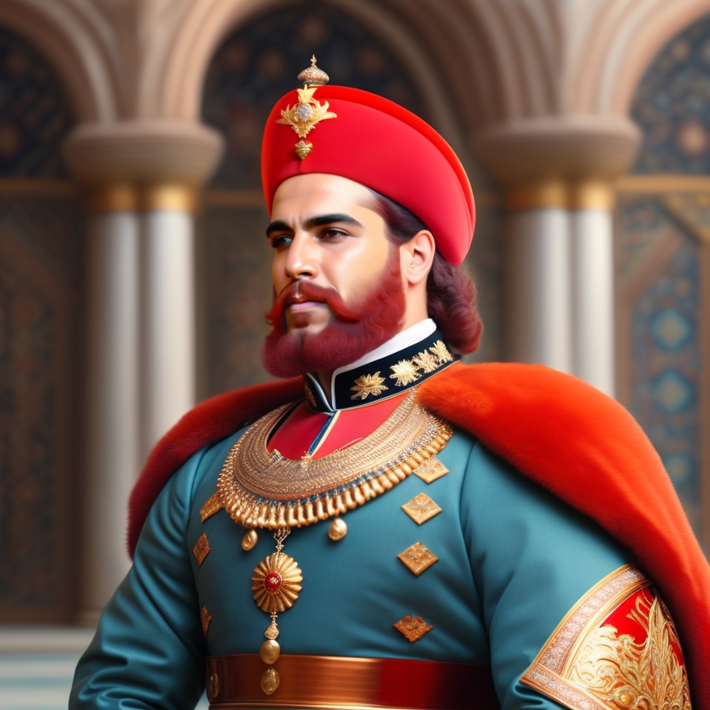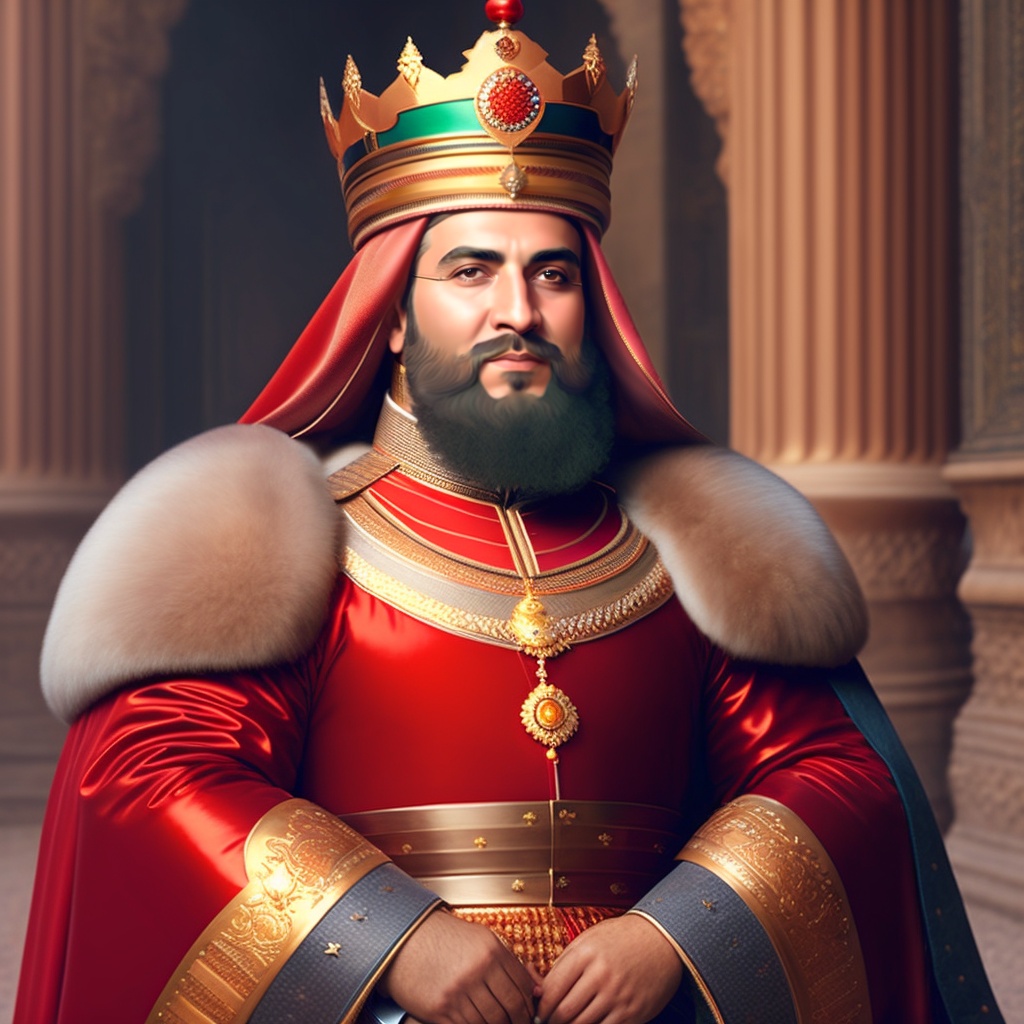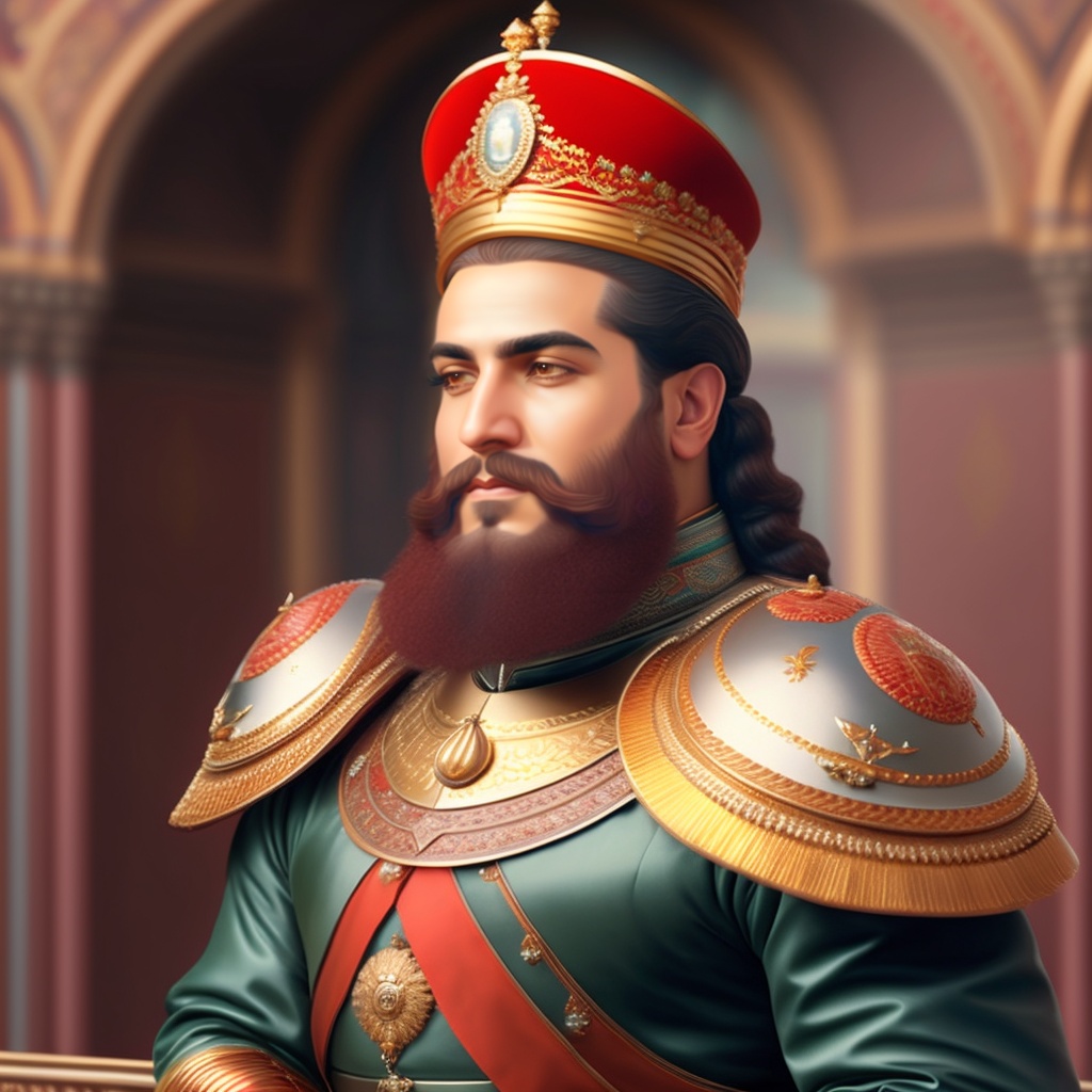 Shah ismail, middle east, king of iran, 40 year old, red hair, with "king's armor and ", "in the middle of his palace"