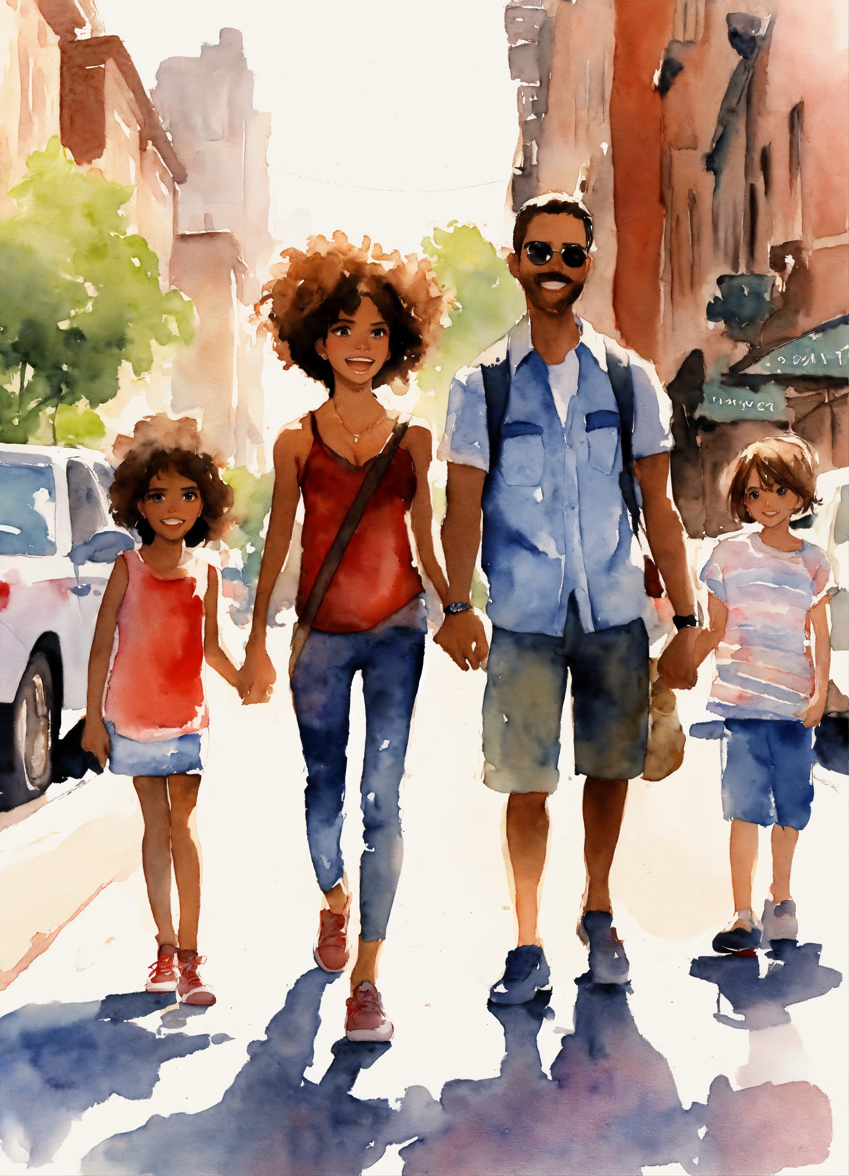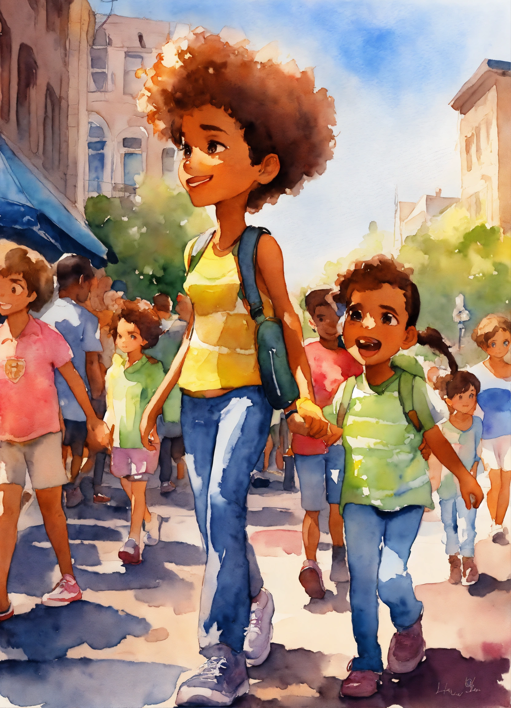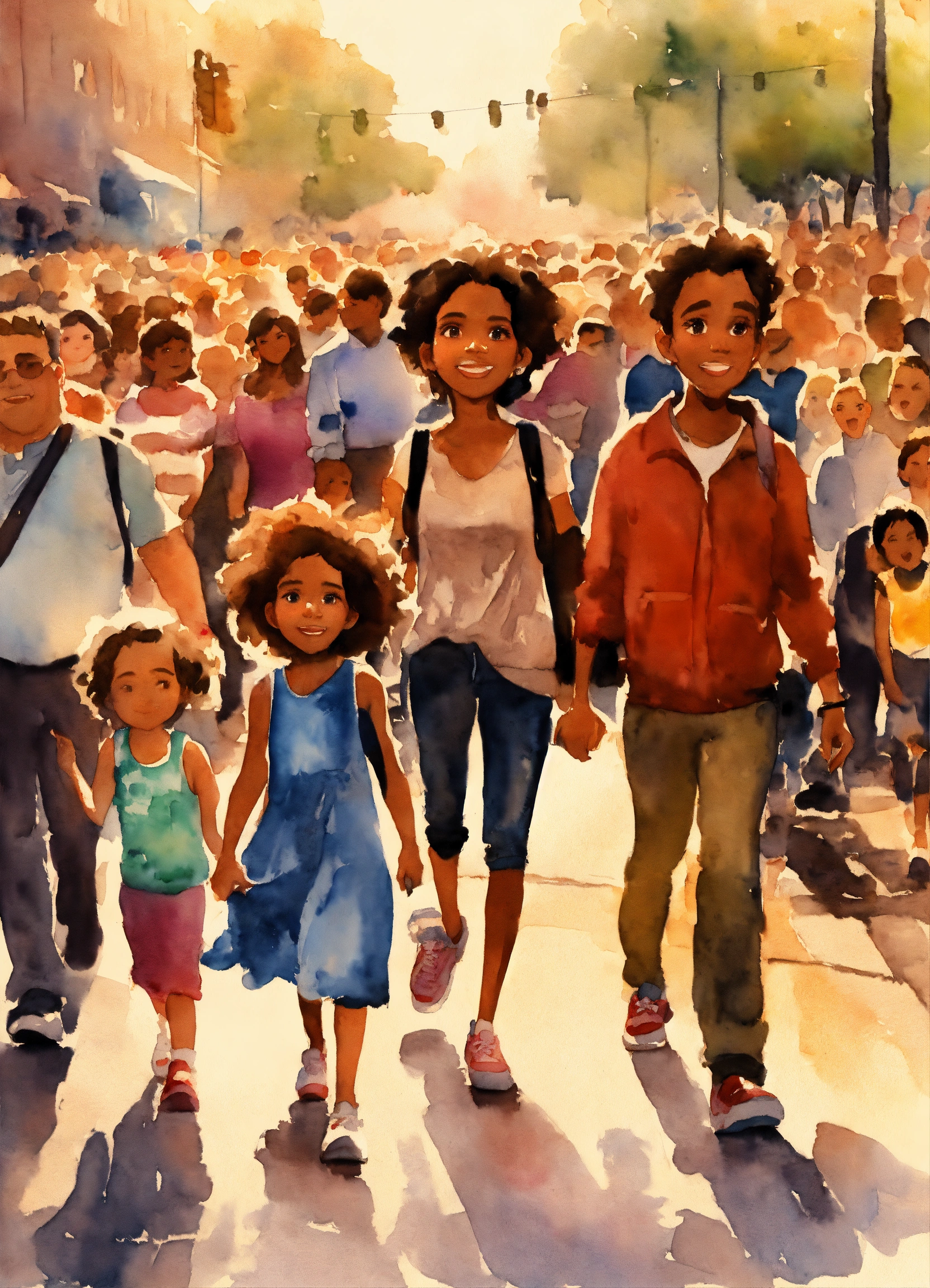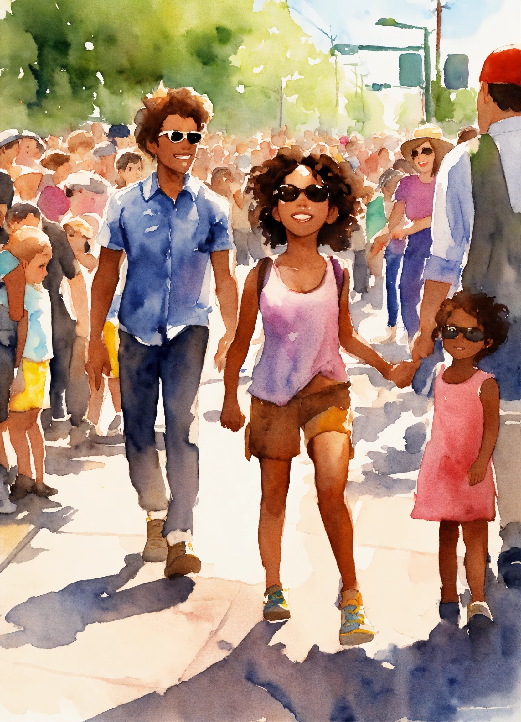 Watercolor pixar painting of 8 year old halle berry and her family ensuring everyone in the crowd is ready for the walk, watercolor pixar style cartoon